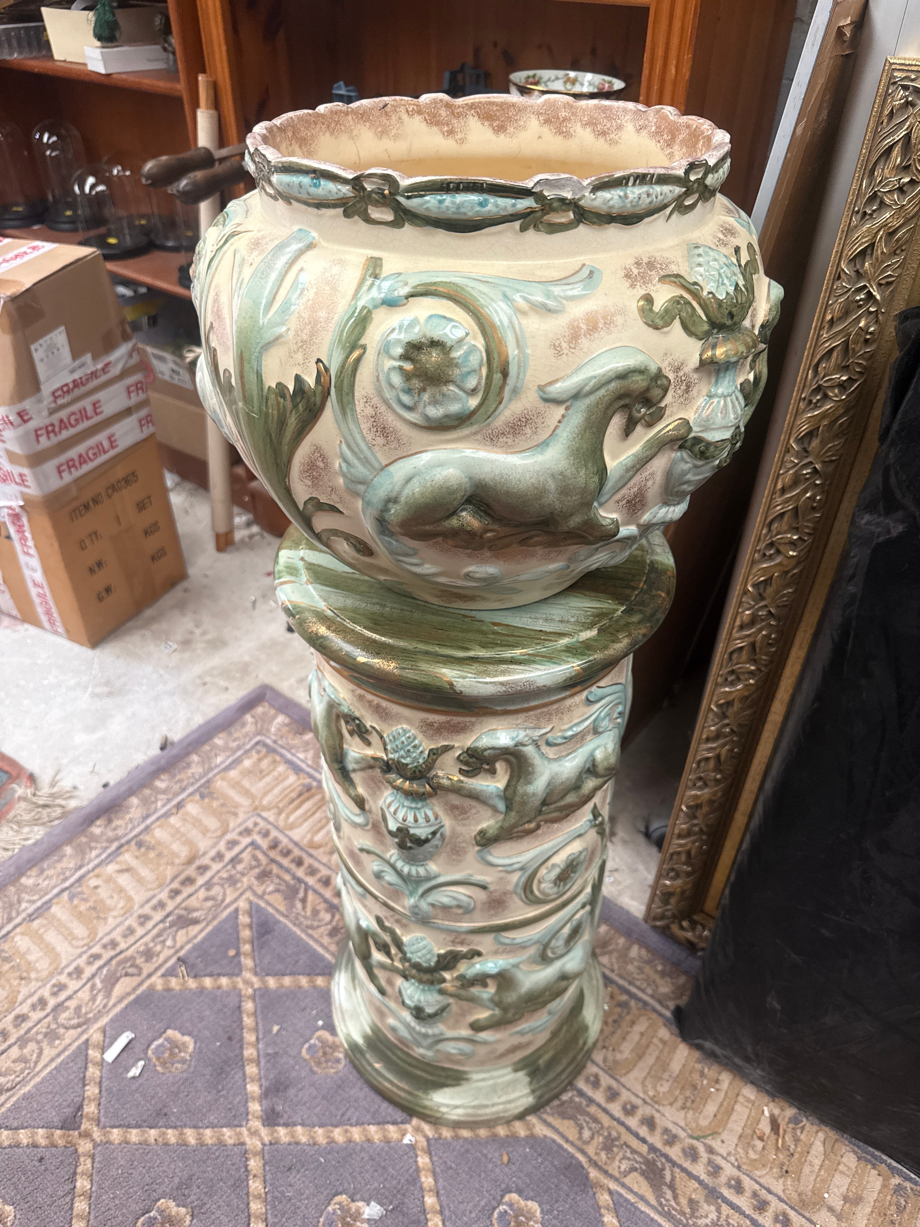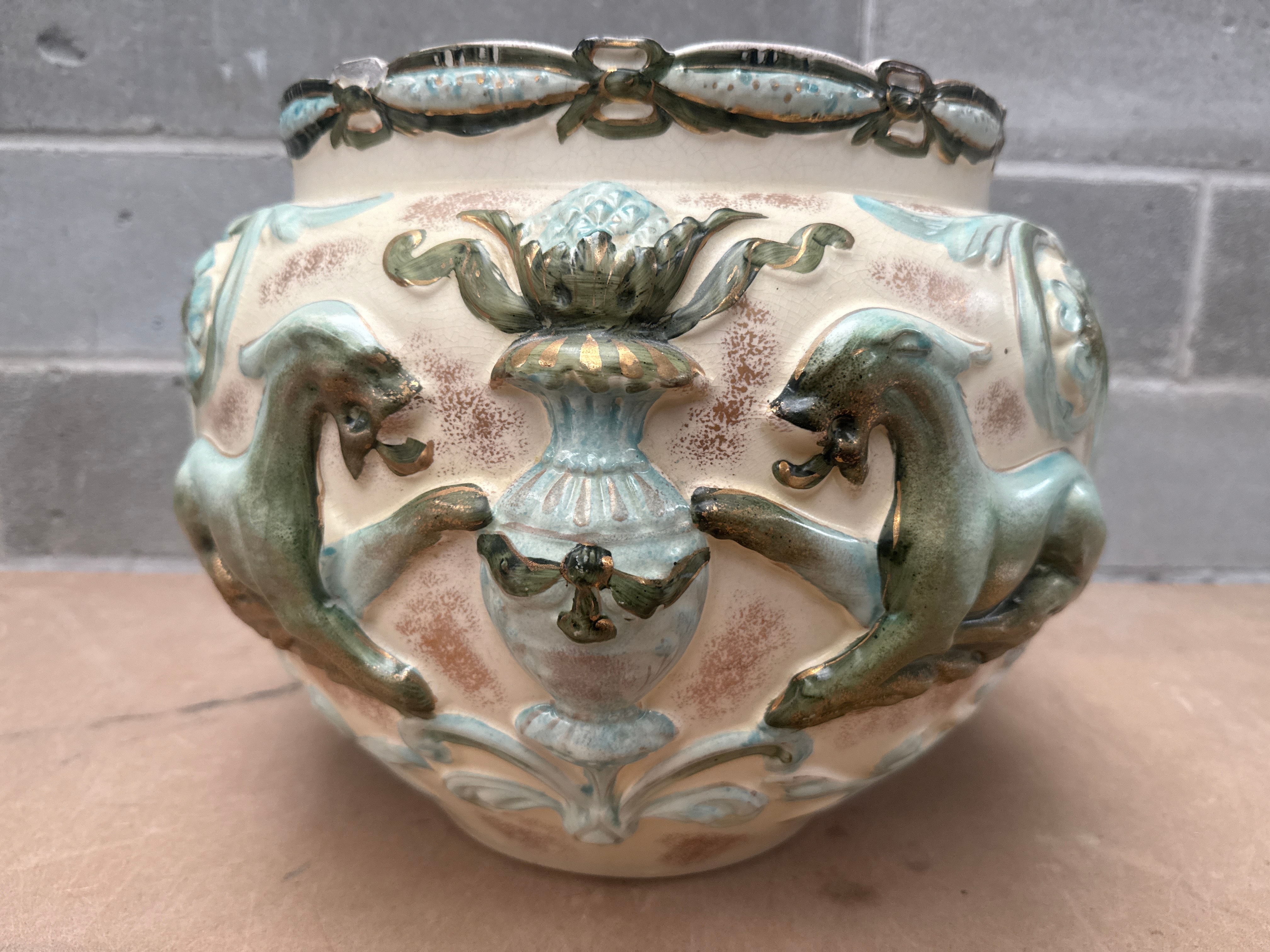 A Staffordshire pottery jardinière and stand of glazed ceramic, featuring extensive relief molding. The design depicts stylized mythical creatures resembling dragons or griffins, flanking classical urn motifs and interspersed with foliate designs. The piece is decorated in a palette of cream, green, and light blue, with gilt and bronze accents against a mottled background.