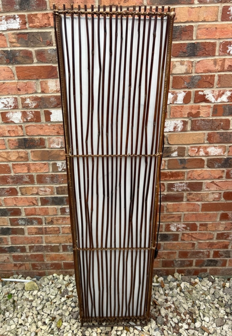 An Exclusive Thai Decor Hand Made Teak Wood Floor Lamp from Northern Thailand. This tall, rectangular floor lamp features a rustic or organic modern style. It is constructed from numerous dark, slender natural branches or twigs, vertically aligned, which frame a translucent white diffuser, likely paper or fabric. The branches are secured by woven natural fibers, appearing at the top, bottom, and around the middle as a decorative and structural band. A black electrical cord is visible on the right side.