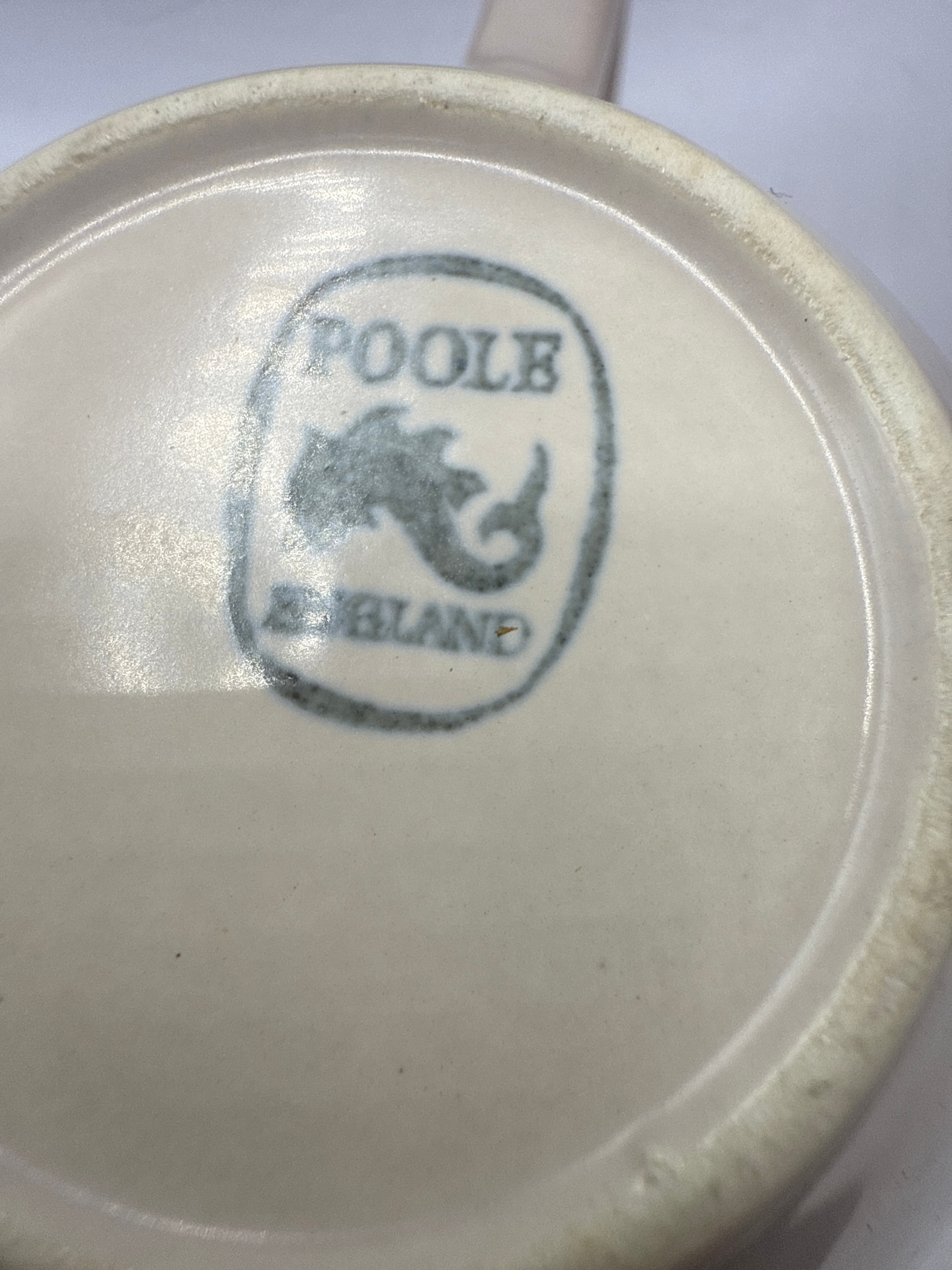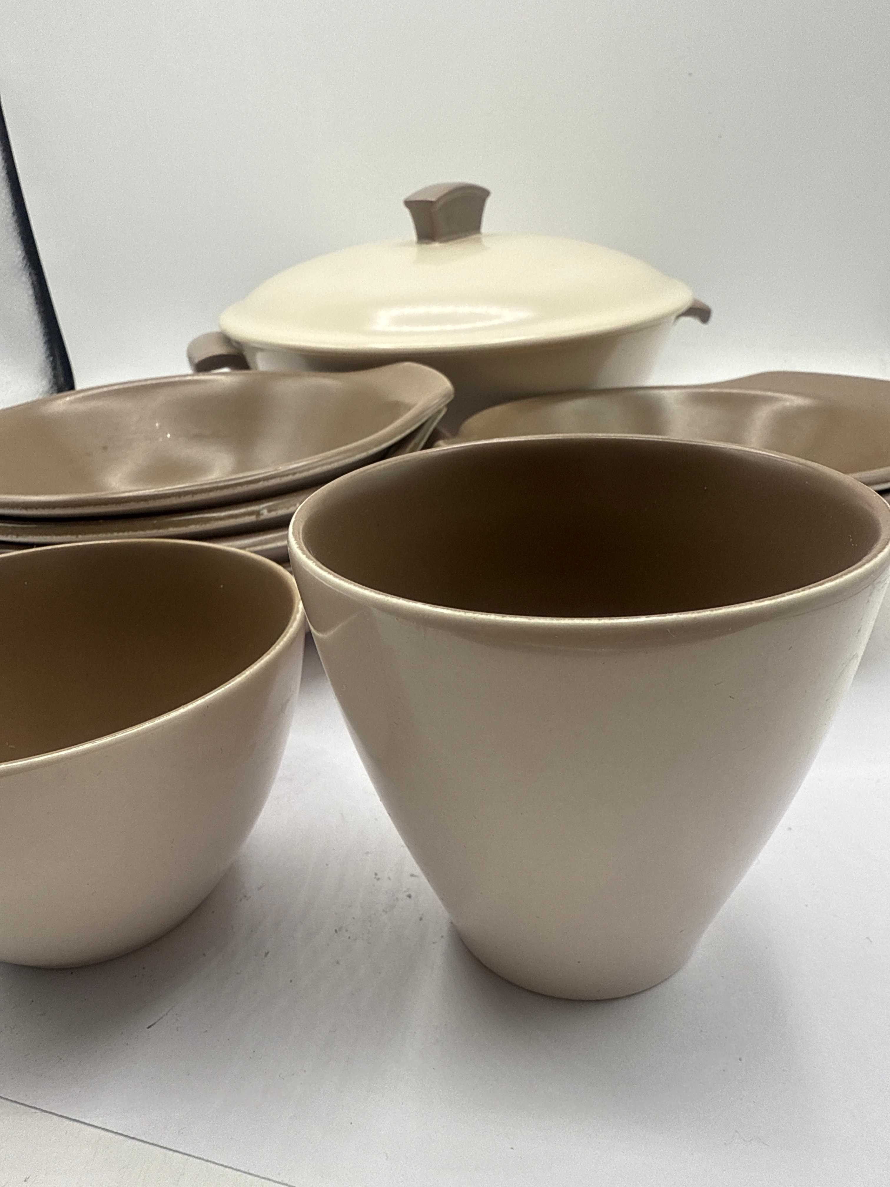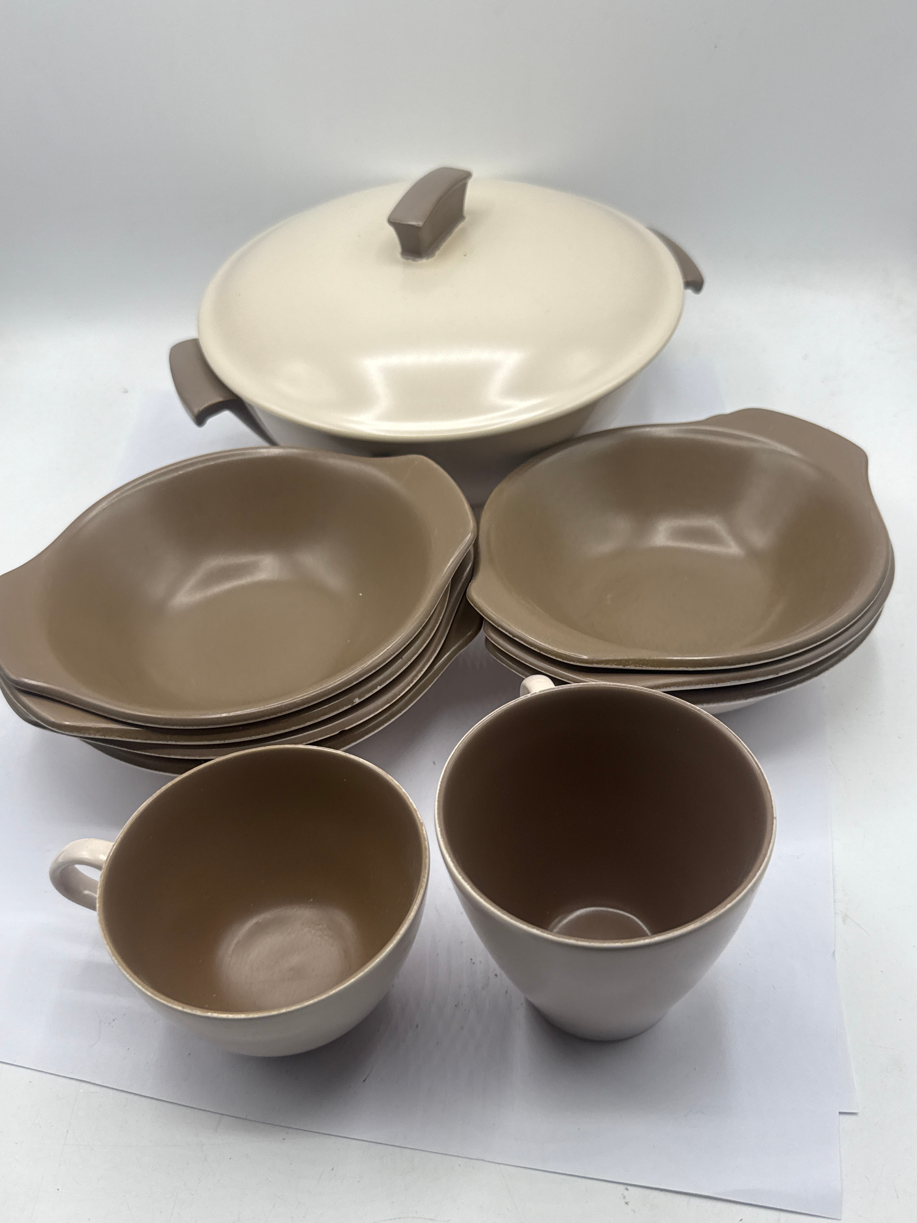 A 10-piece collection of Poole Pottery Twintone ‘Mushroom & Sepia’ dinnerware and serving pieces, dating to the 1960s. The lot comprises one covered casserole dish with a cream-colored body and contrasting brown handles and knob, five oval serving dishes with brown interiors and lighter exteriors, and two cups with cream exteriors and brown interiors. The pieces exhibit a modernist aesthetic, characterized by their two-tone ceramic construction. A clear maker’s mark on the base of one cup reads “POOLE” above a stylized fish or dolphin emblem, with “ENGLAND” below.