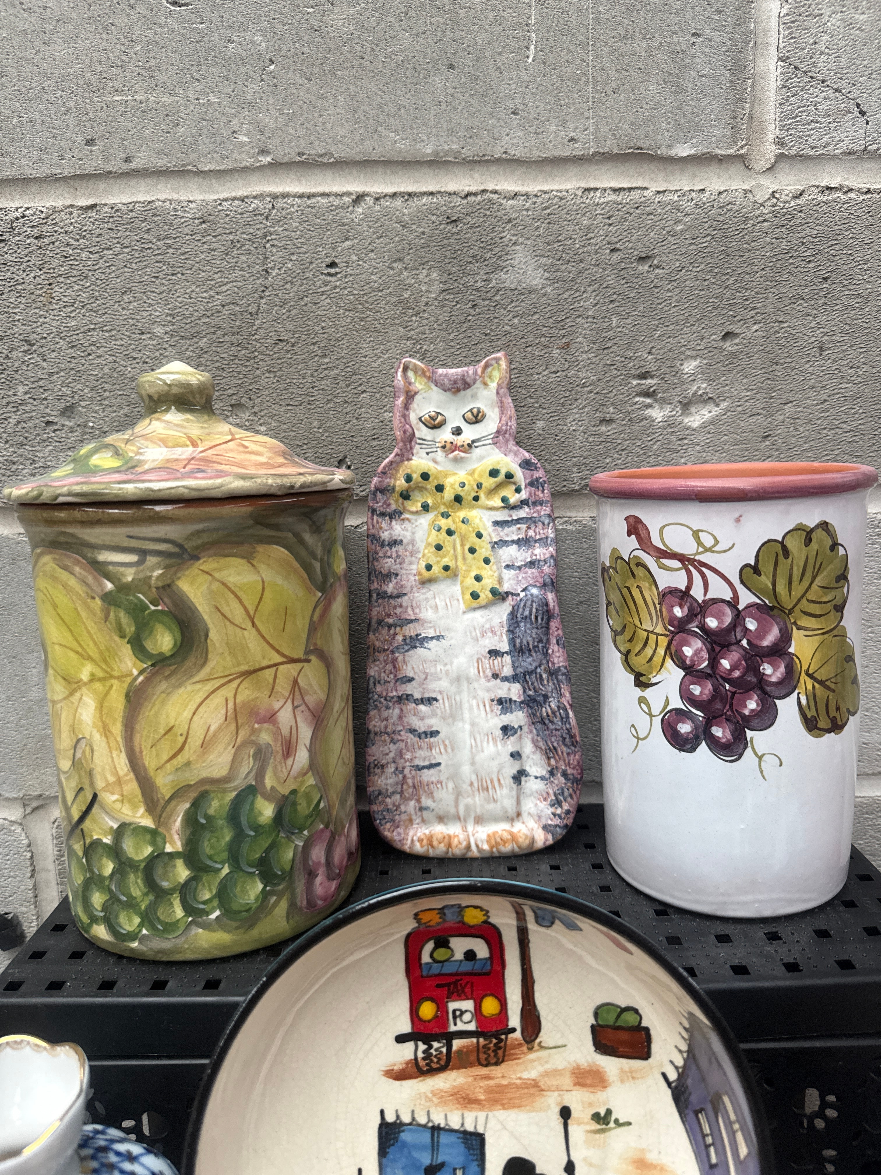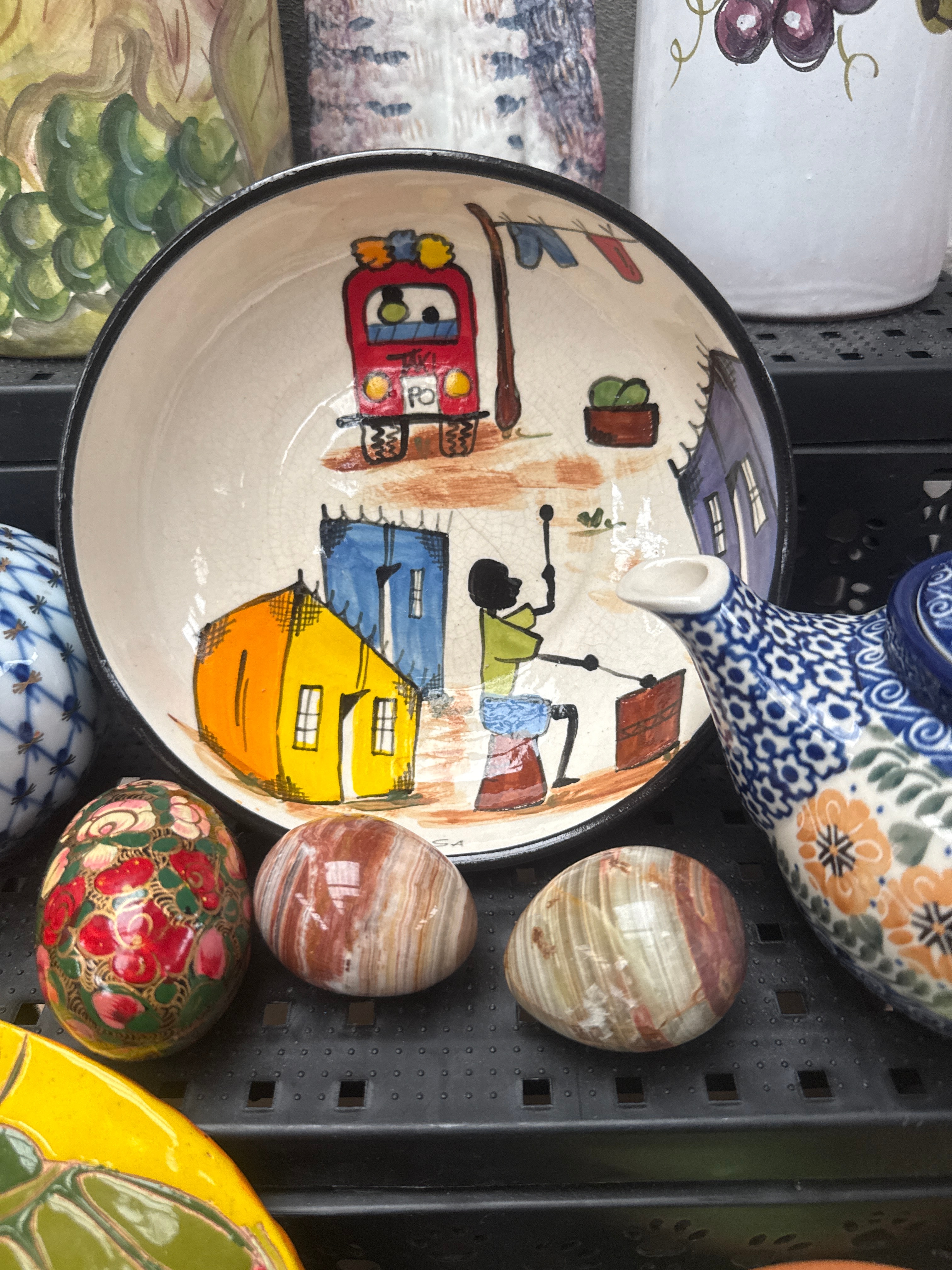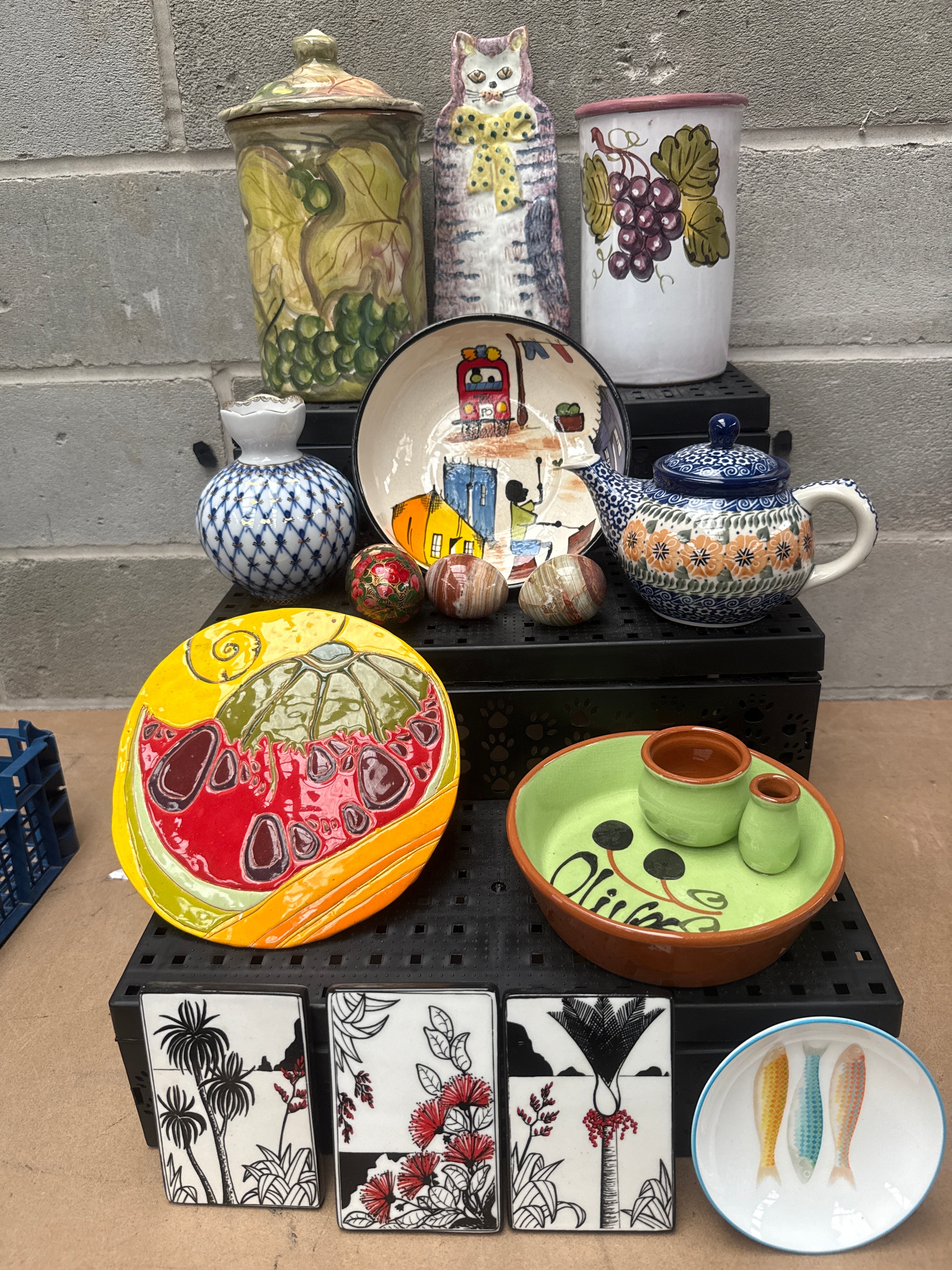A John Derian crackle-glazed ceramic bowl, decorated with a colorful naive folk art scene including a red bus marked “TAXI”. The collection further comprises two larger lidded and cylindrical glazed ceramic vessels adorned with grape and leaf motifs; a whimsical cat figurine; a blue and white geometric-patterned ginger jar; and a blue and orange floral-patterned teapot, suggestive of Polish pottery. Additional ceramics include a vibrant, abstractly painted plate; a terracotta-style bowl with a green-glazed interior inscribed “Oliwa” (Polish for Olive), accompanied by two small matching cups; three black and white illustrated ceramic tiles (one with red floral accents); and a small white dish with three painted fish. Also included are three polished natural stone ovoids and a single painted decorative egg, likely wood or ceramic.
