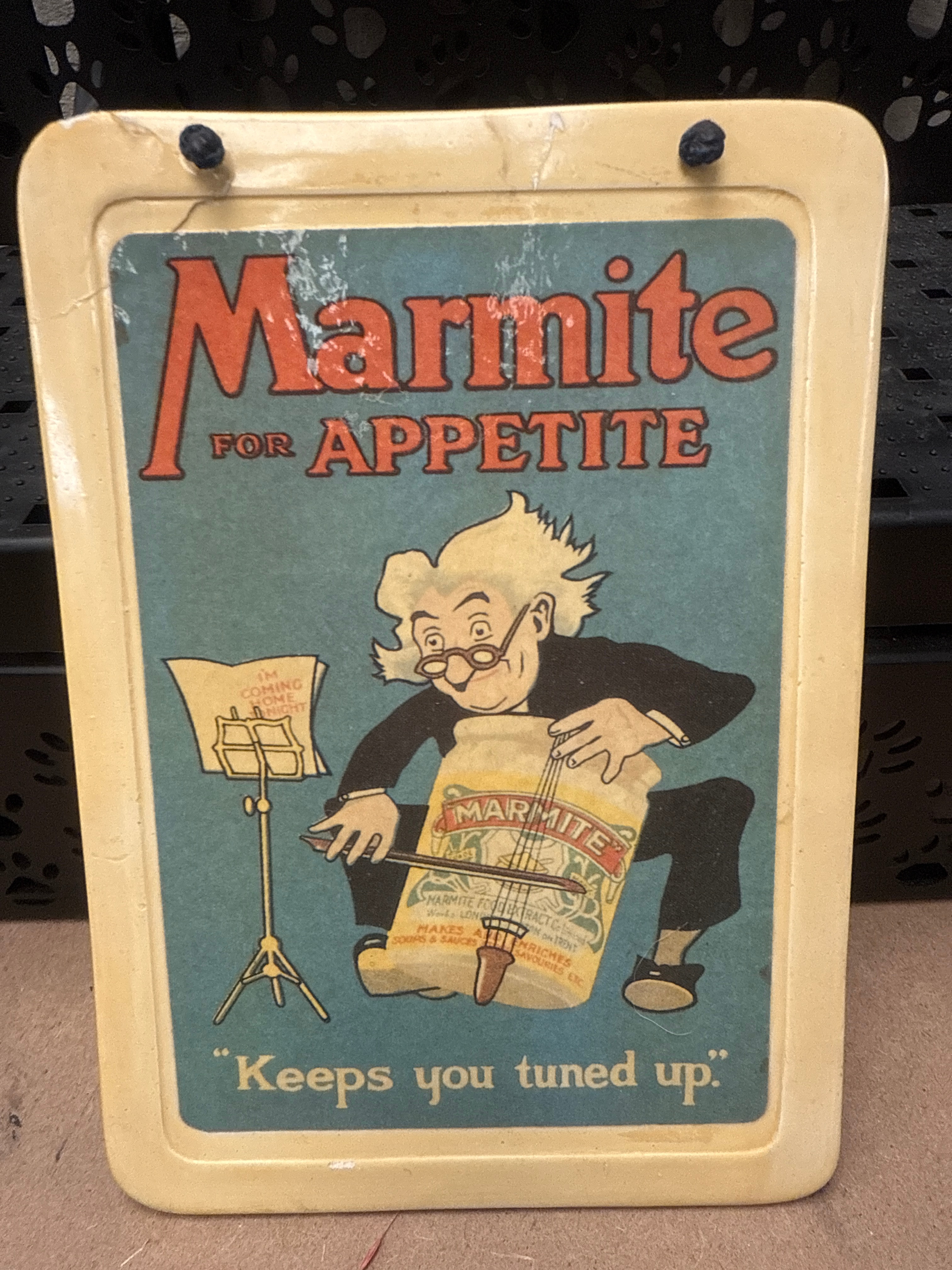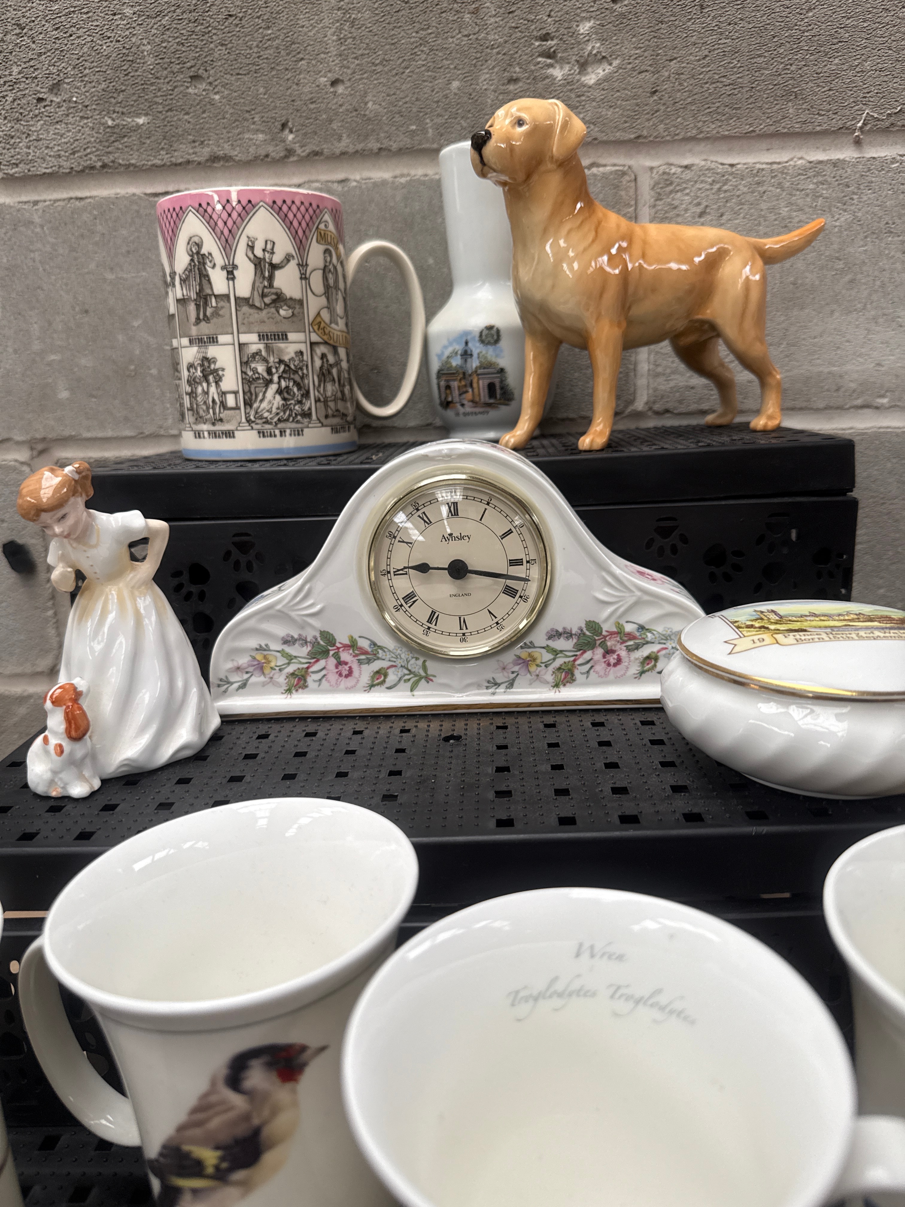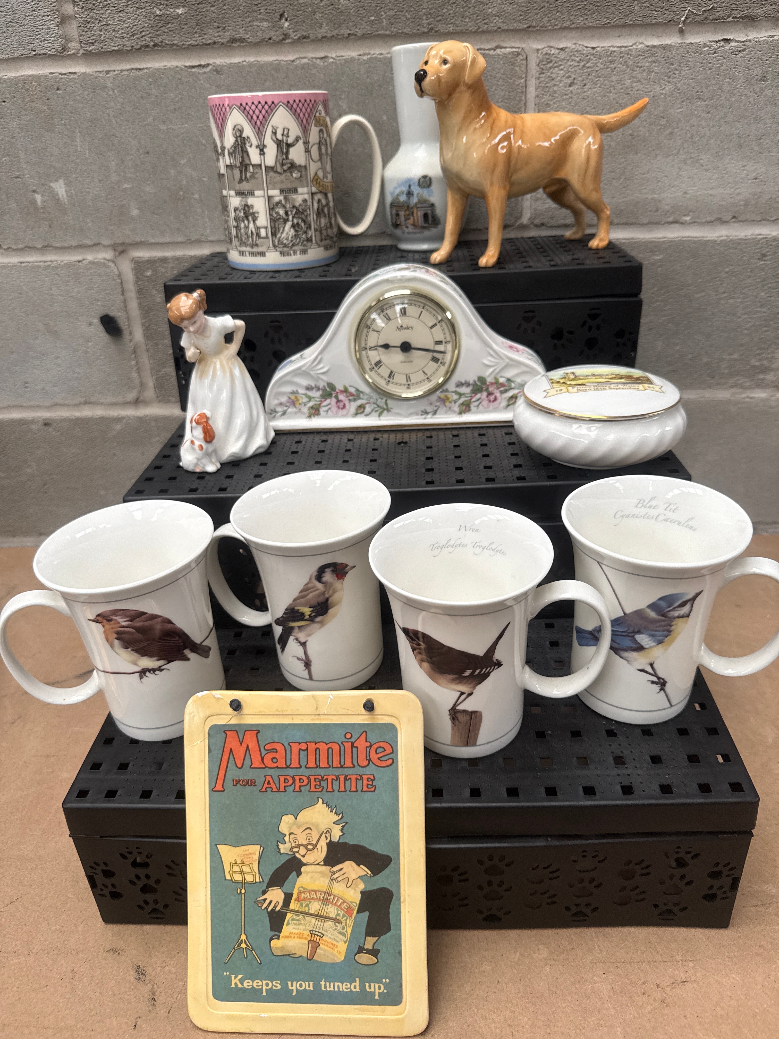 A diverse collection of decorative and functional items, primarily ceramic, dating from the mid to late 20th century. This group includes a pink ceramic mug decorated with detailed historical or religious scenes, a small white ceramic vase depicting a building, and a tan ceramic or resin figurine of a Labrador dog. Also present is a white ceramic mantel clock, marked “Ashley ENGLAND,” featuring floral decoration and a brass-toned face. Alongside these are a white ceramic figurine of a woman with a small dog, and a small, round lidded ceramic trinket box adorned with a landscape scene. A set of four white ceramic mugs are decorated with realistic bird illustrations, identified as “Wren / Troglodyytes troglodytes,” “Blue Tit / Cyanistes caeruleus,” a Robin, and a Goldfinch. Completing the collection is a rectangular vintage advertising plaque, likely composite board or plastic, for “Marmite FOR APPETITE,” depicting a character playing a cello made from a Marmite jar, with text including “Keeps you tuned up.” and further product details.
