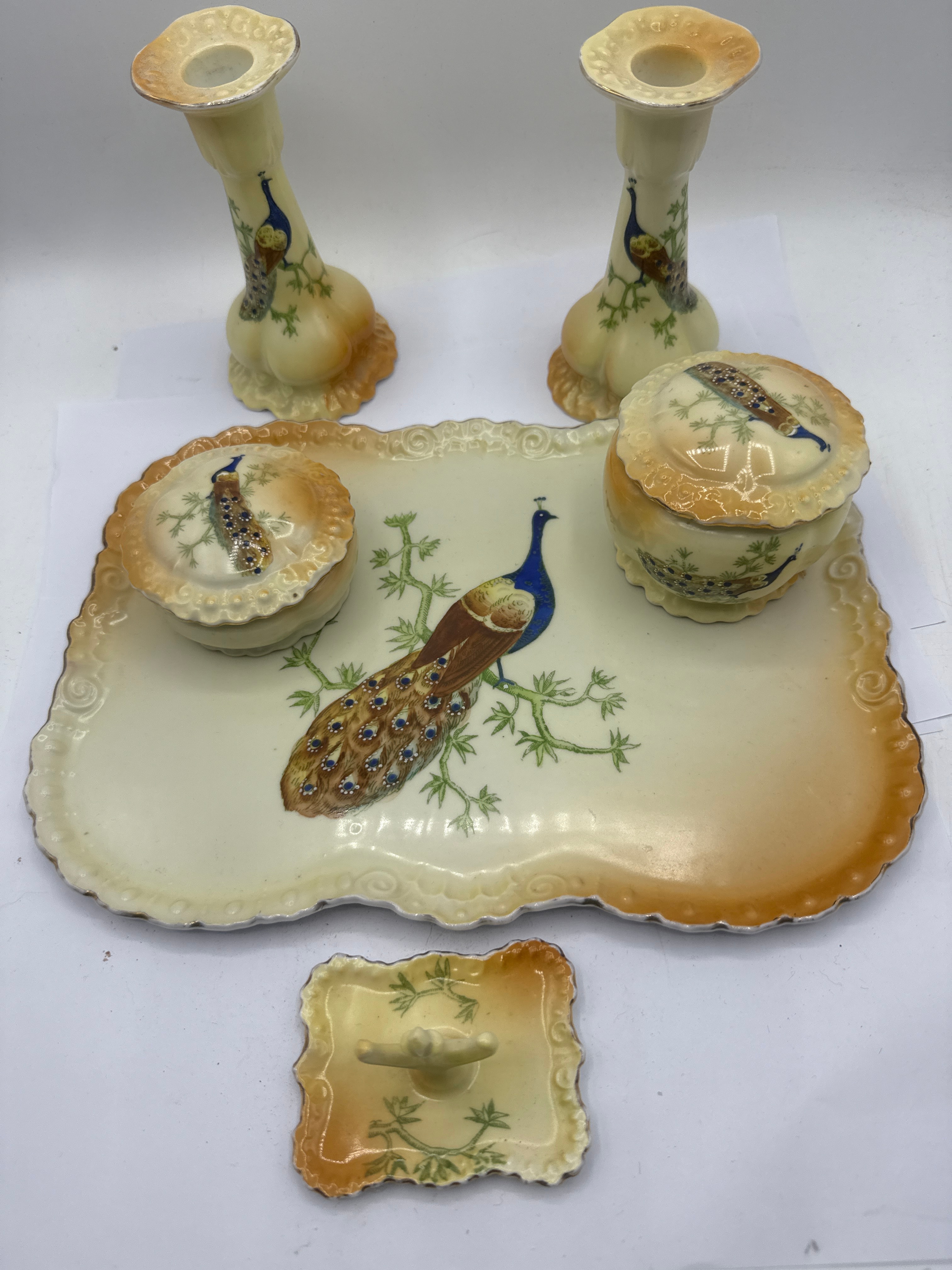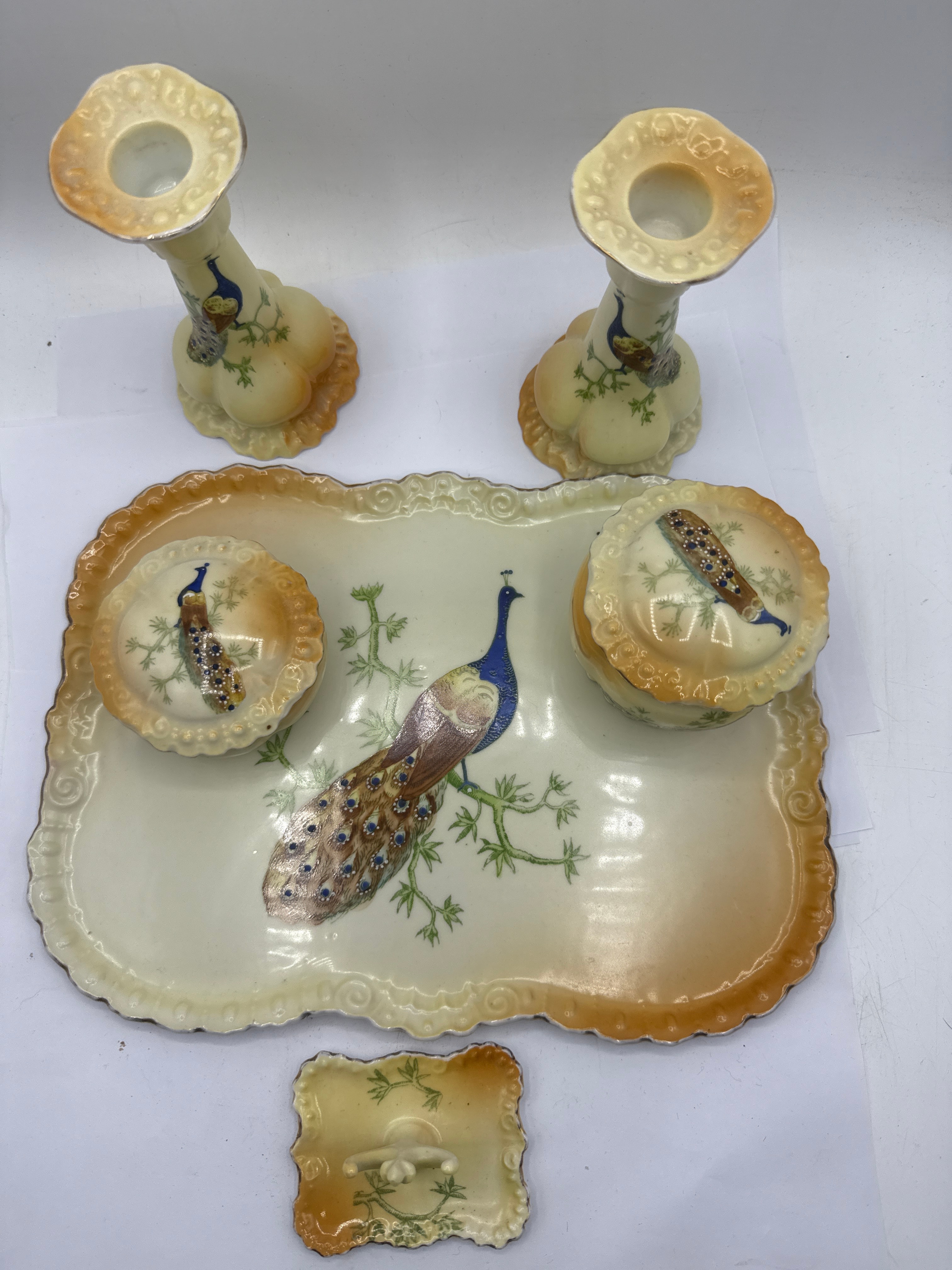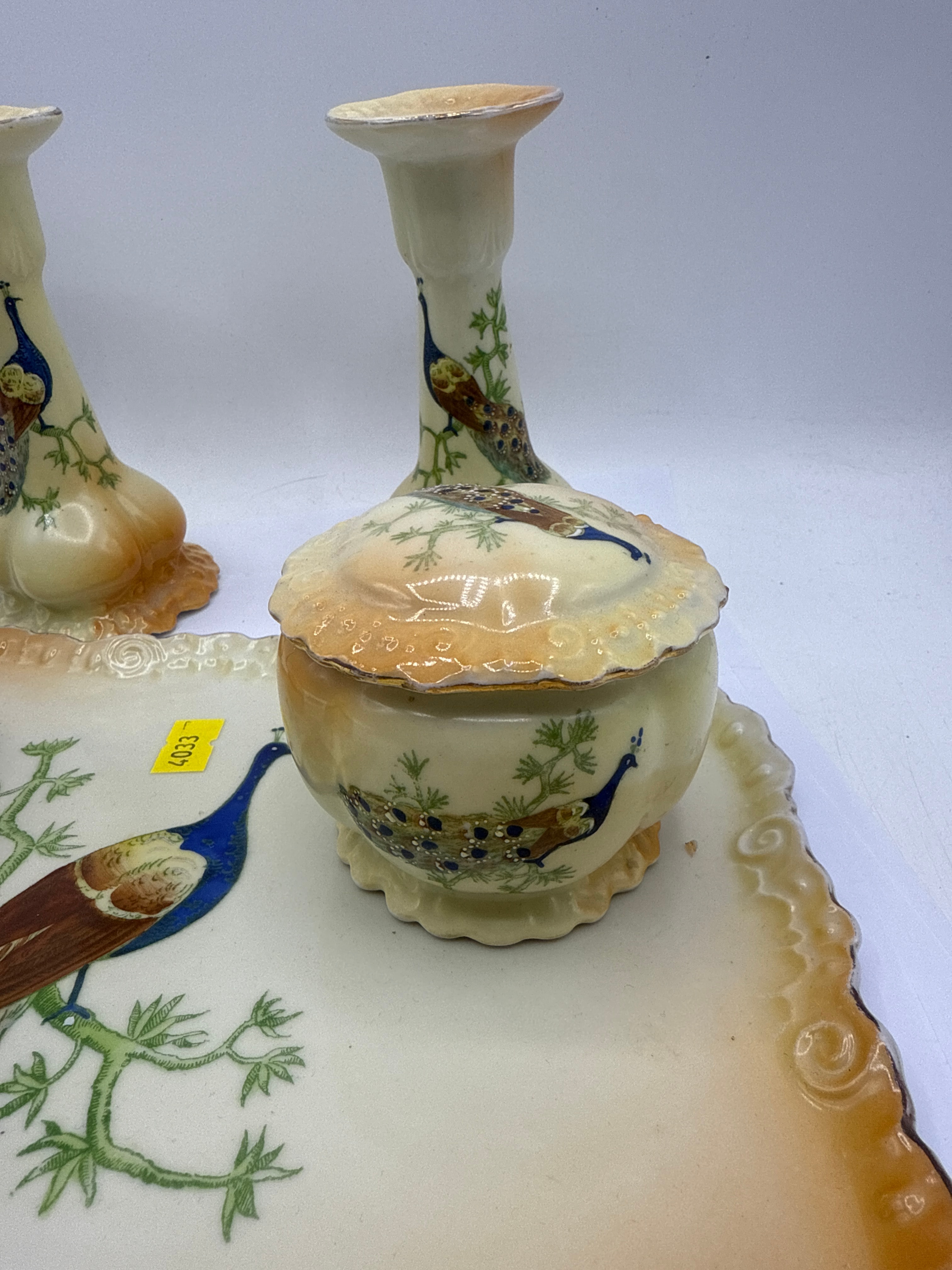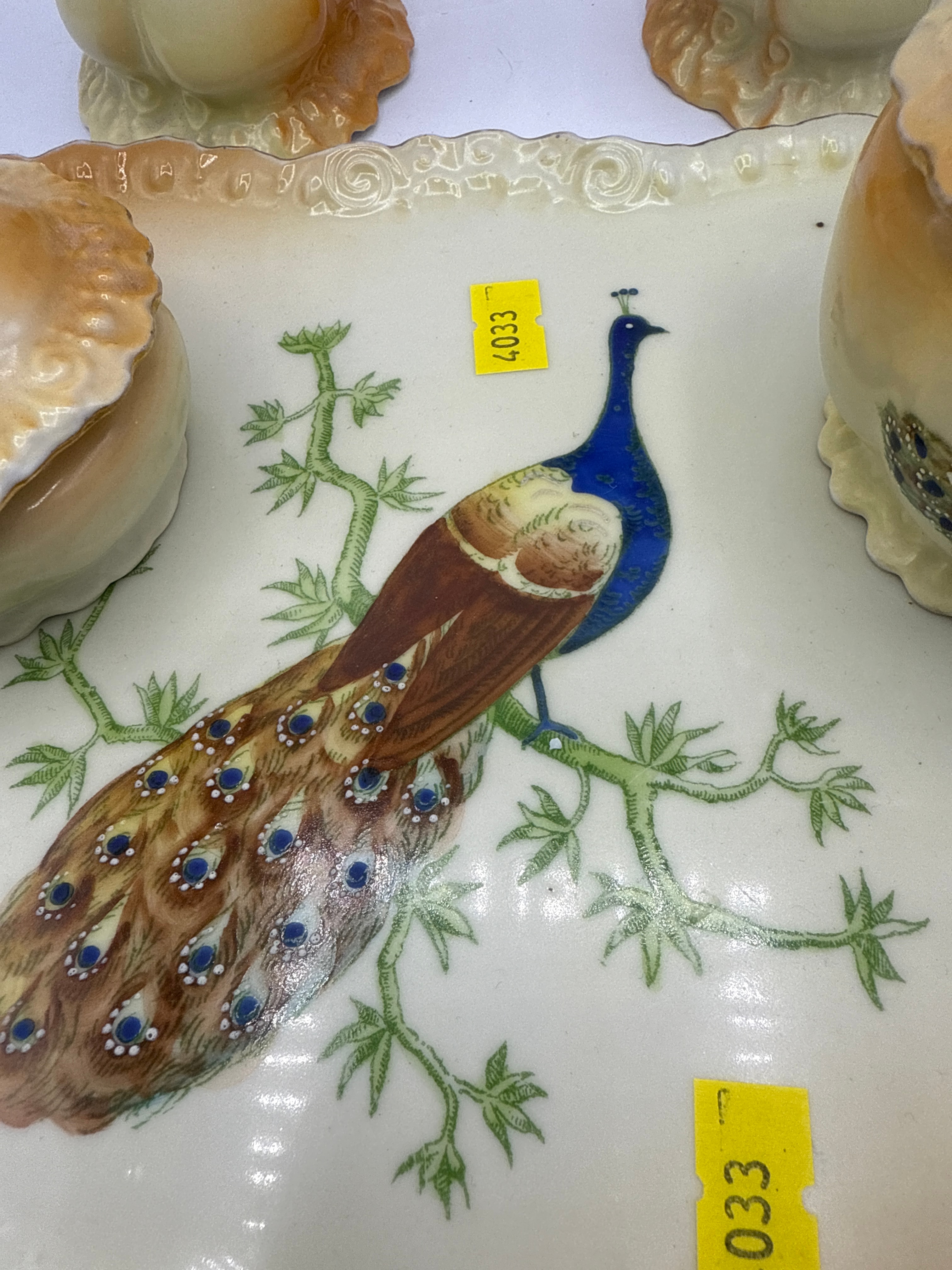 A seven-piece Czech glazed ceramic vanity set, likely dating from the Art Nouveau or Victorian period, featuring a peacock motif. The set comprises a rectangular tray, two lidded circular pots, two candlestick holders, and a small square dish. Each piece is decorated with a vibrant peacock and stylized foliage motif on a cream ground, transitioning to an amber luster finish on their scalloped, gilt-accented edges. The peacocks’ tail eyes are rendered in painted detail, suggesting a raised enamel effect. The only visible markings are yellow inventory stickers numbered ‘4033’.