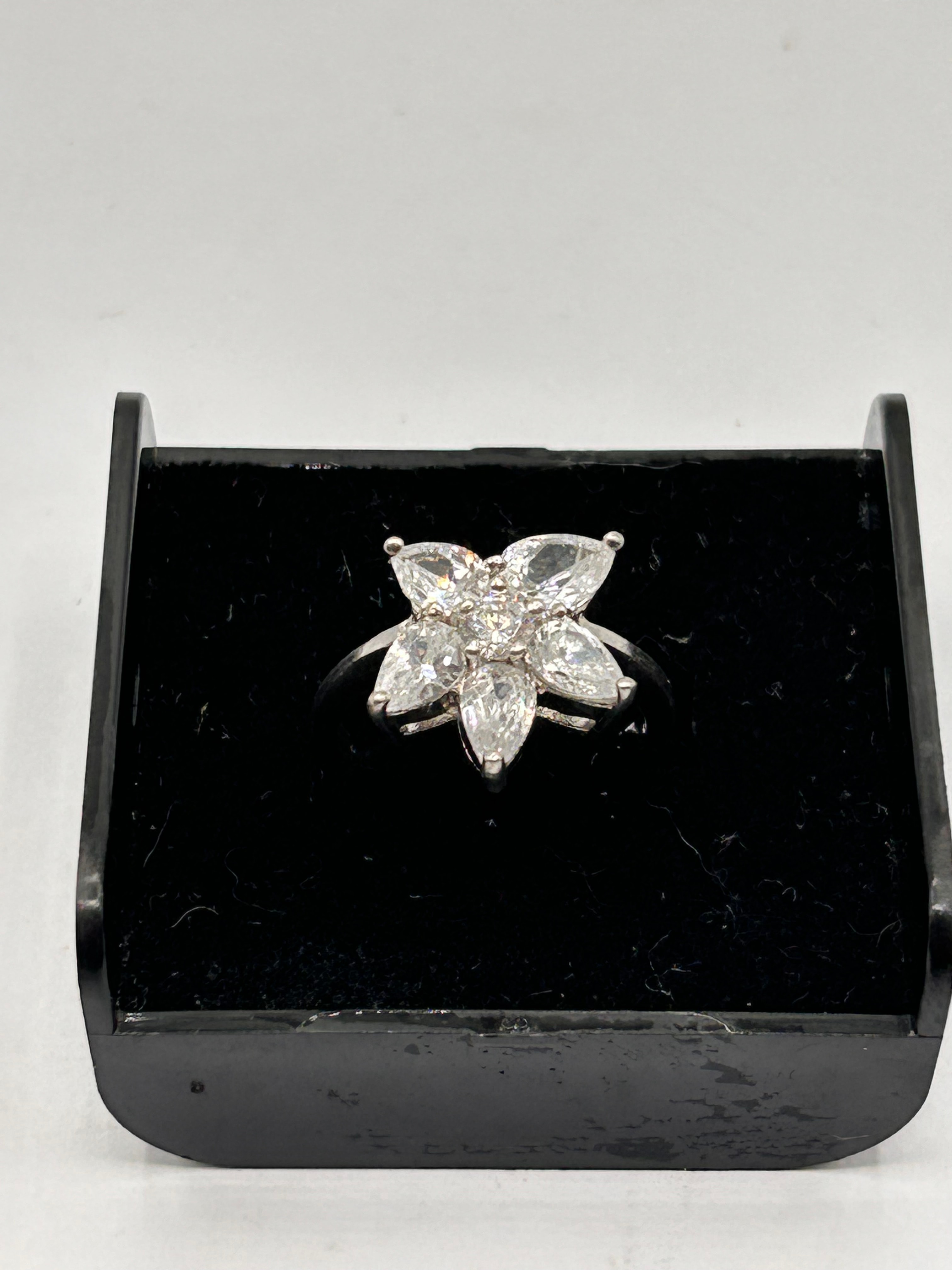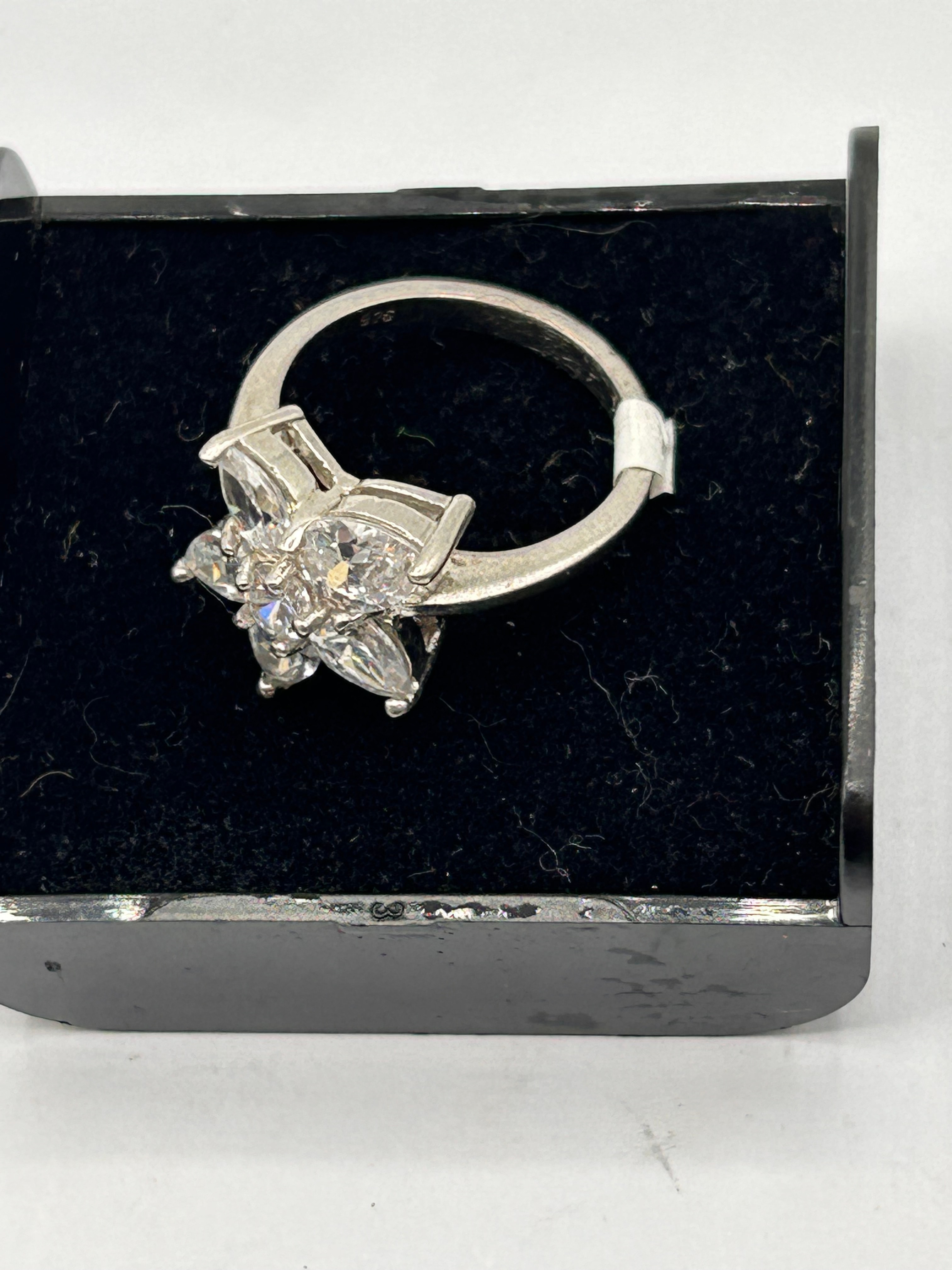 A sterling silver ring, marked ‘925’ on the inner band, featuring a central floral cluster design. The head of the ring comprises six marquise-cut, colorless stones arranged concentrically around a single smaller round-cut colorless stone, all prong-set. The band is unadorned and polished. The item is confirmed to be crafted from silver.