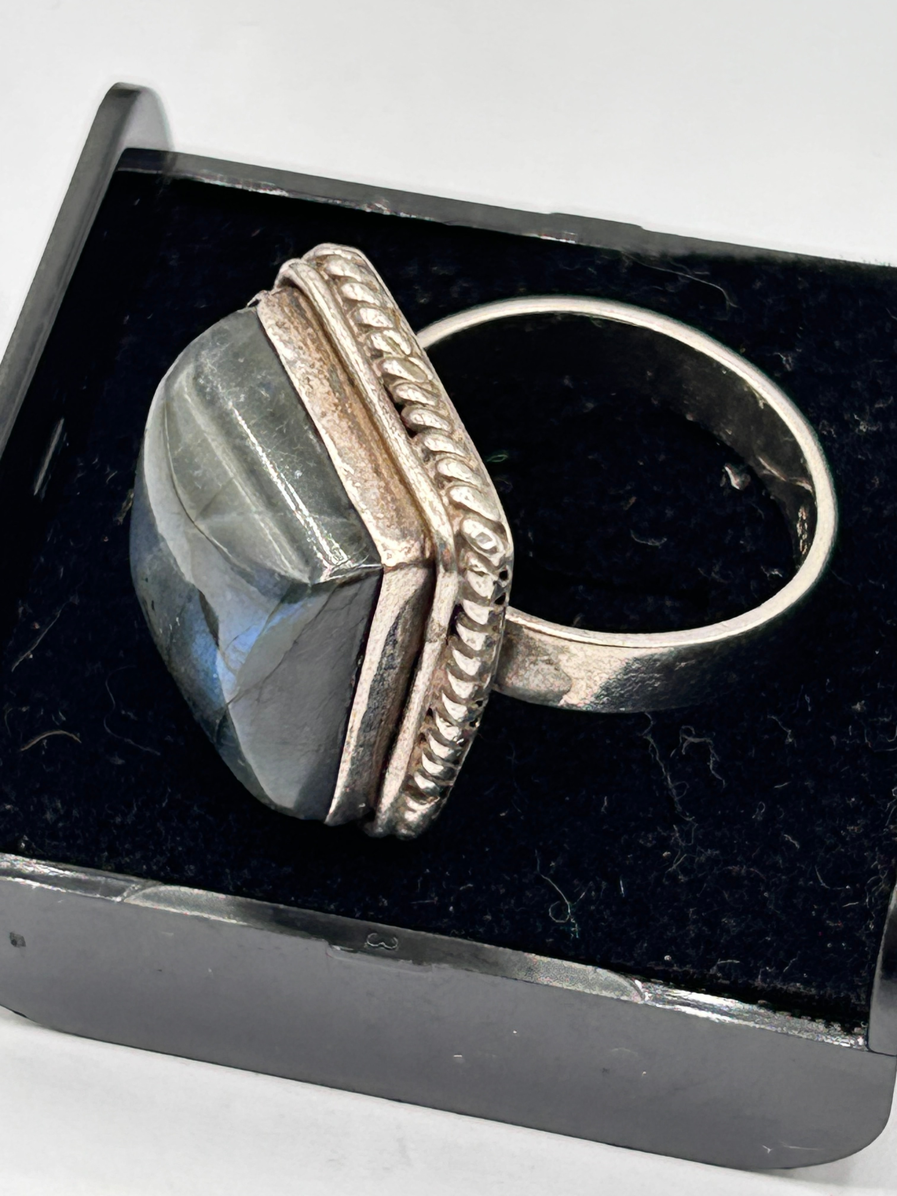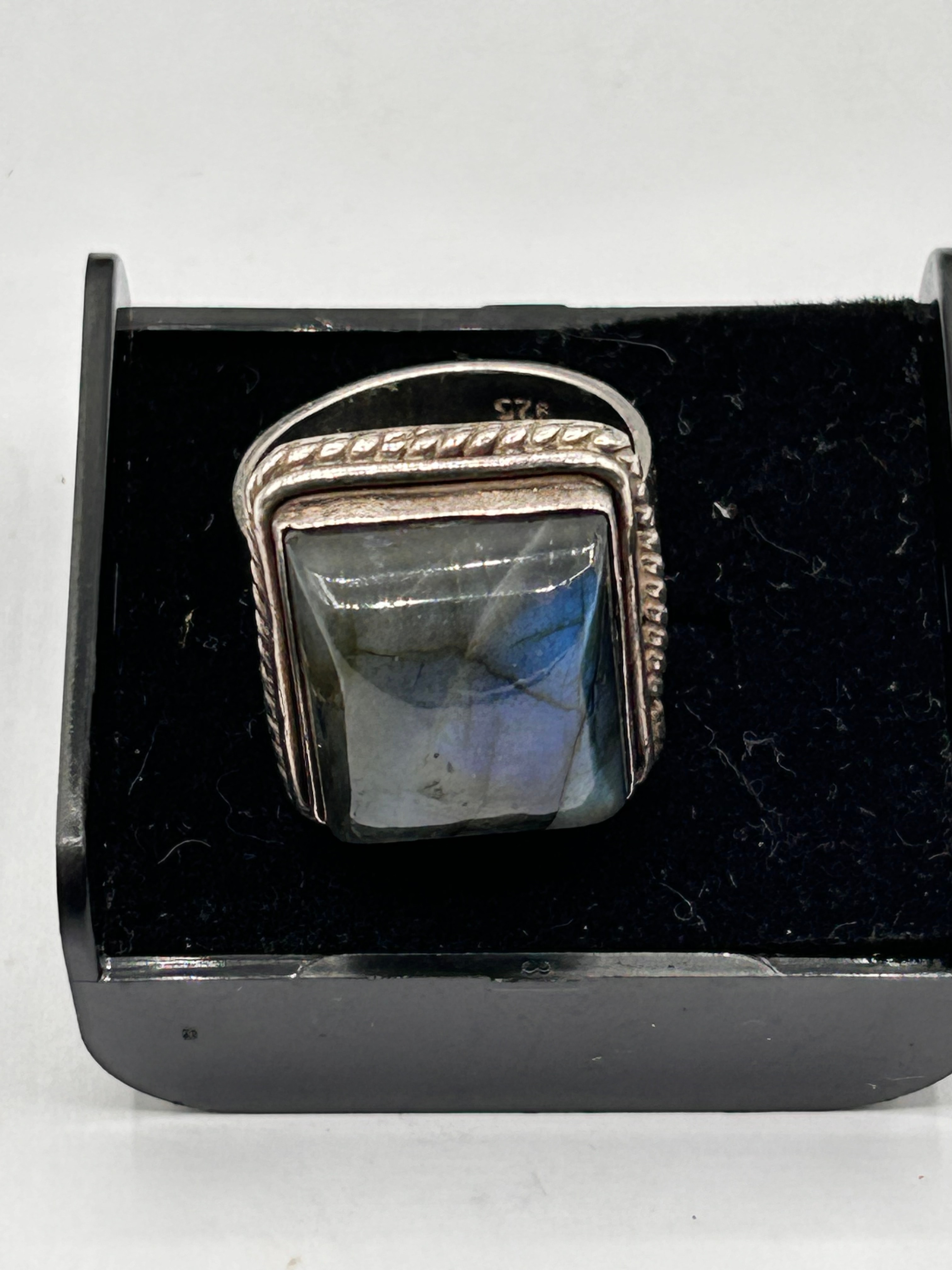 A vintage silver ring featuring a large, square-shaped labradorite cabochon stone. The stone exhibits strong iridescence (labradorescence) and is bezel-set within a silver frame detailed with a twisted wire border. A “925” hallmark, signifying sterling silver, is visible on the interior of the band.