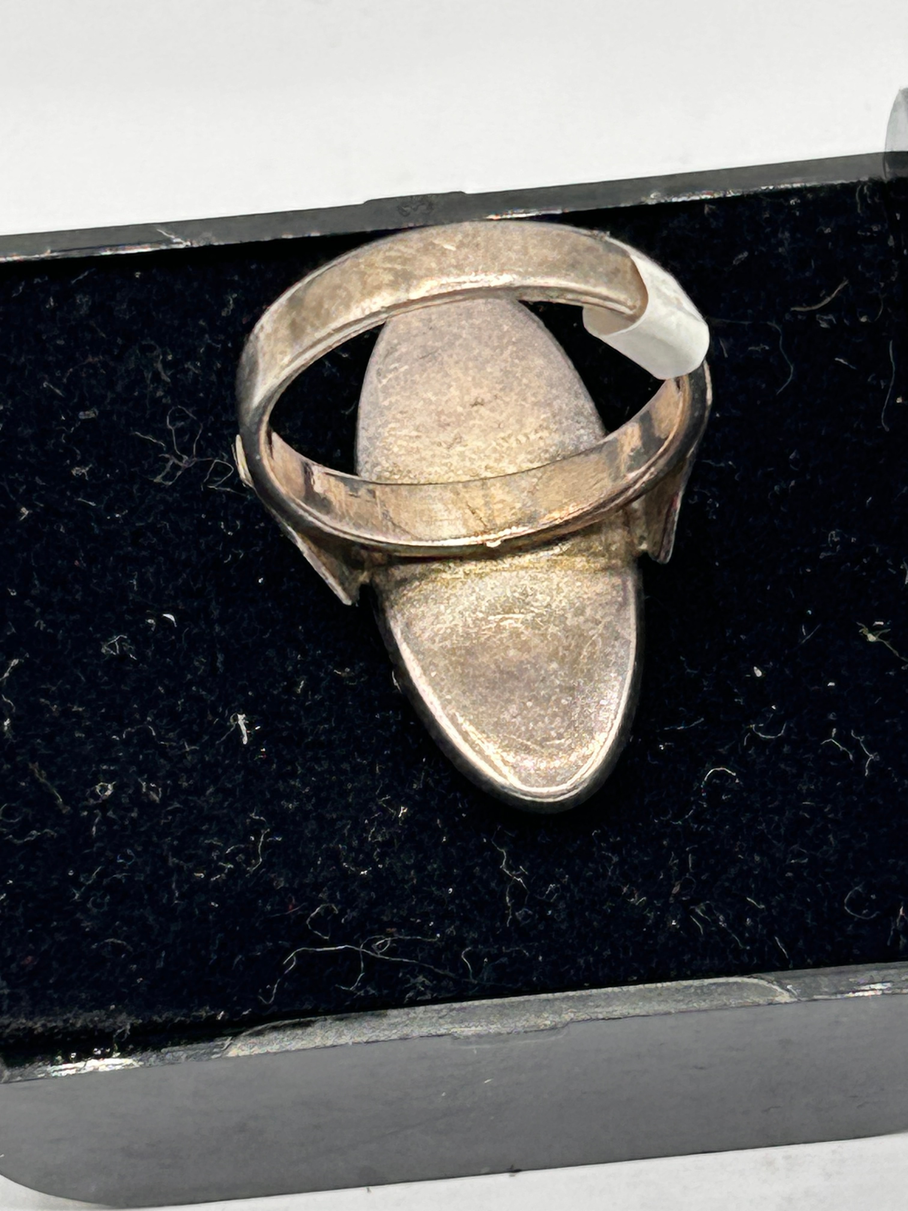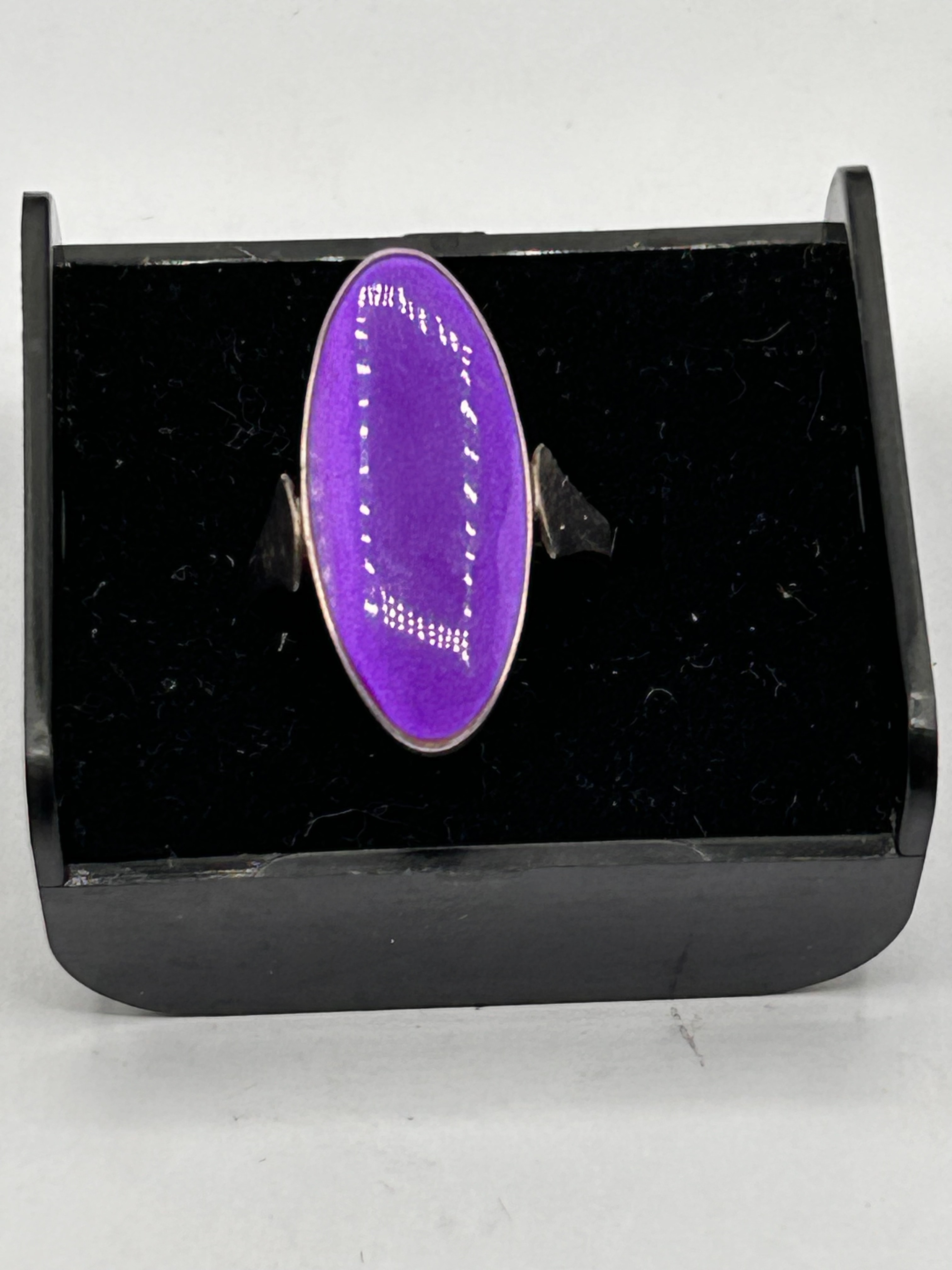 A silver ring featuring a large, oval-shaped cabochon-style top crafted from a vibrant purple material. The cabochon exhibits minor white flecks or surface reflections. The metal band and setting are present. No discernible text or hallmarks are visible.