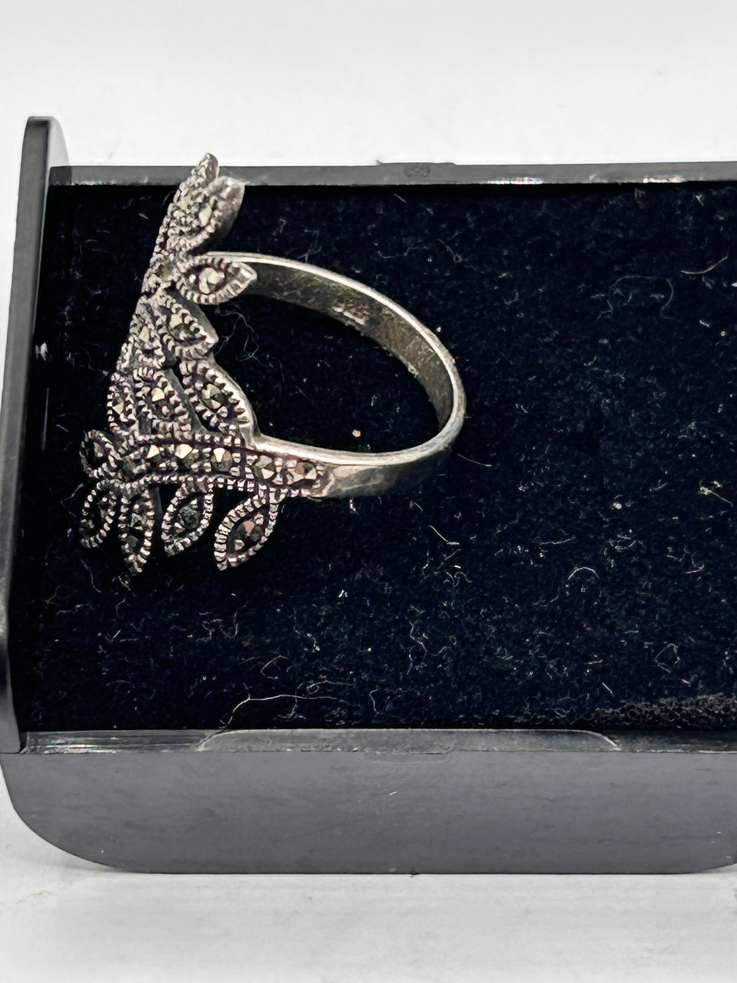 A ladies’ ring featuring an asymmetrical foliate design on the head, entirely pavé-set with numerous small, dark, faceted marcasite stones. The metal is silver, exhibiting a bright finish with some natural patina in crevices. The band is plain and smooth. The ring is presented in a black velvet-lined jewelry box.