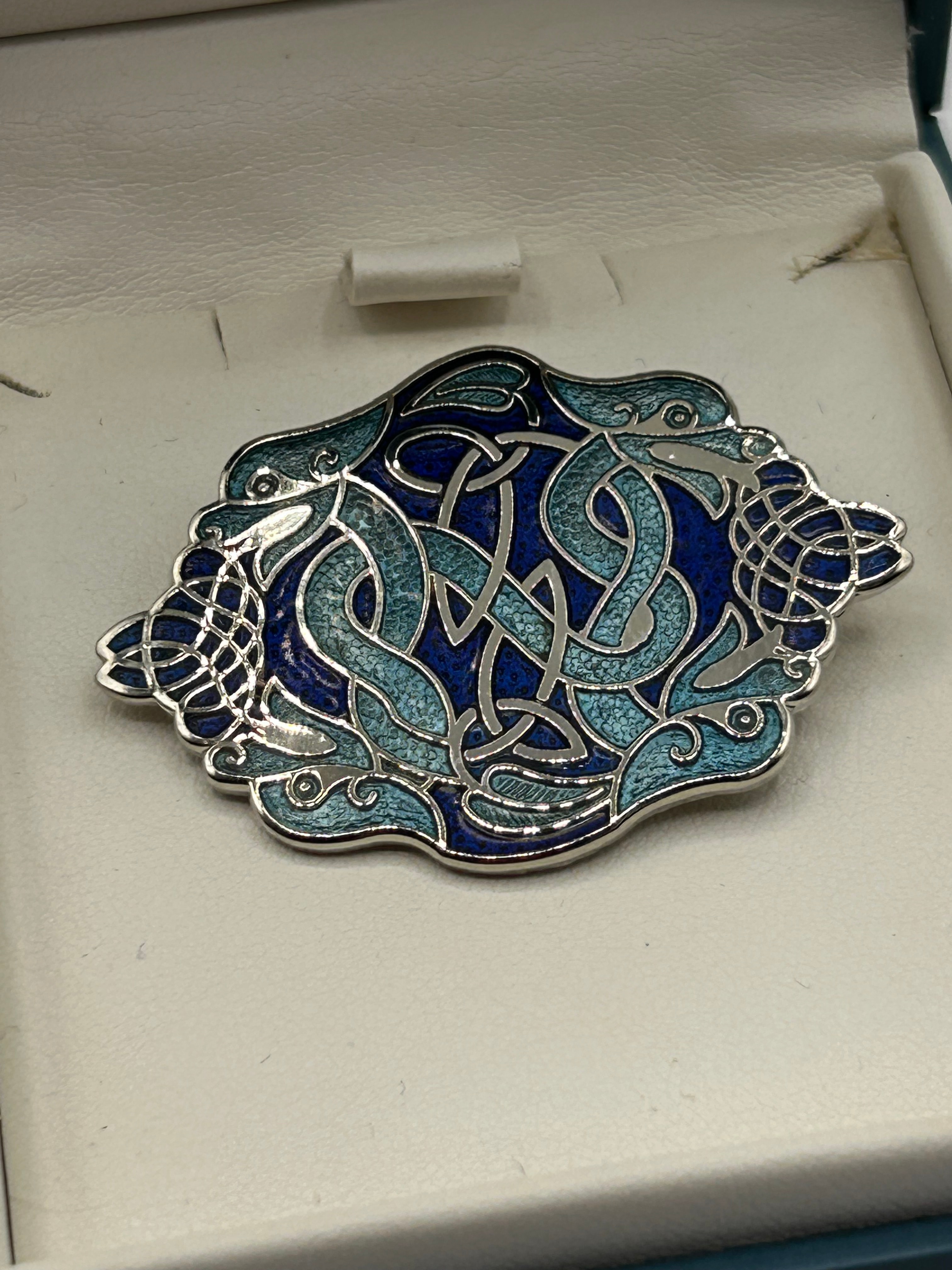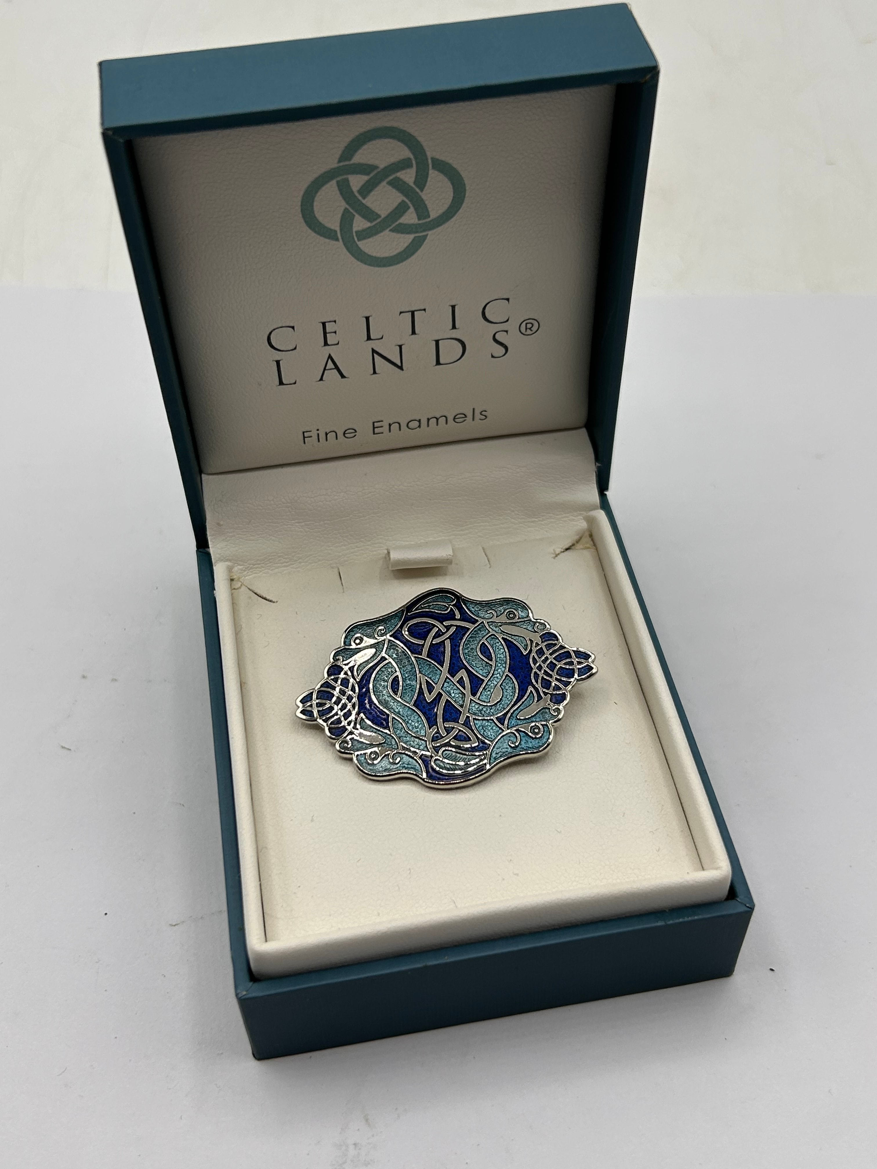 A Sea Gems Celtic Lands enamel brooch, featuring intricate Celtic knotwork designs filled with various shades of blue enamel, ranging from dark to light turquoise. The brooch is presented in its original teal-blue hinged box with a white satin and velvet interior. The box lid is marked with ‘CELTIC LANDS®’ and ‘Fine Enamels’ beneath a stylized Celtic knot logo.