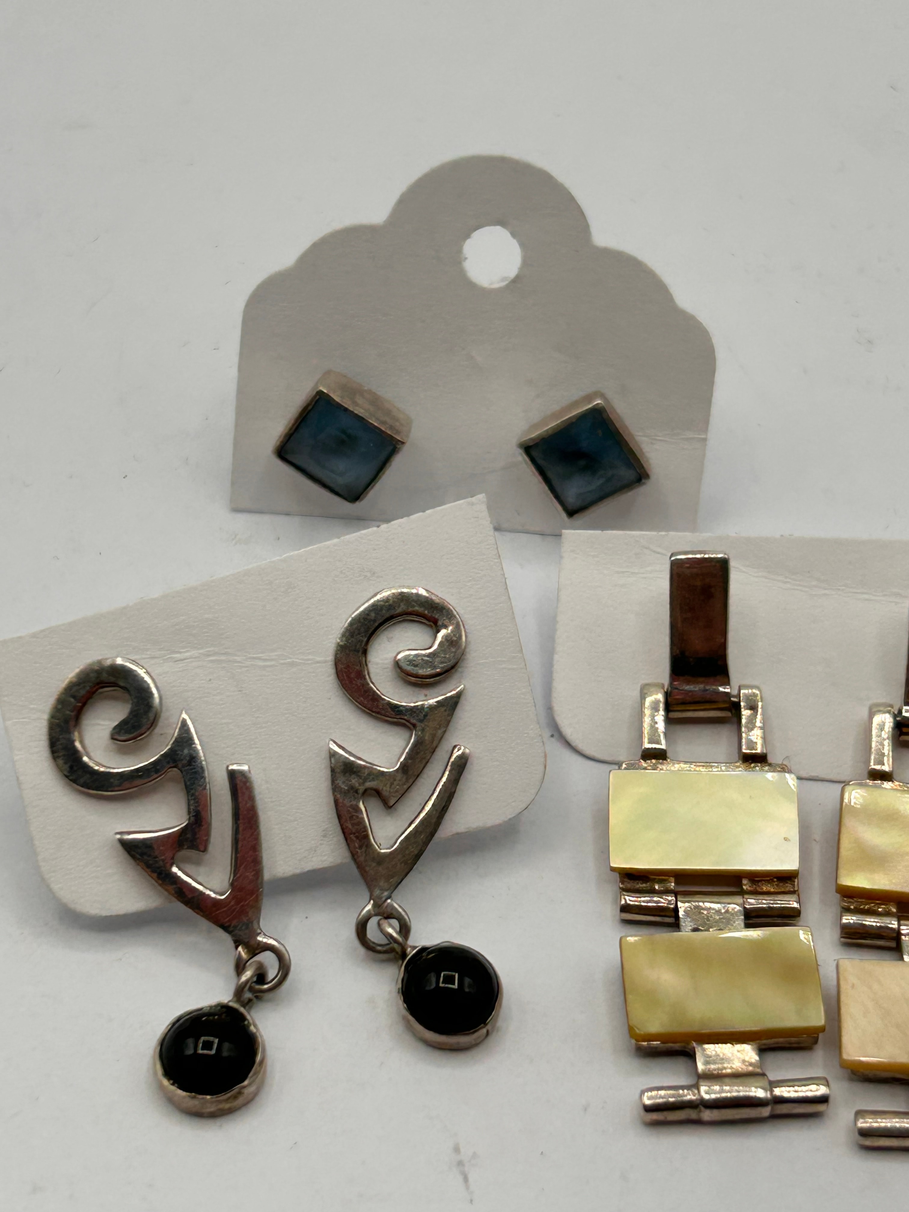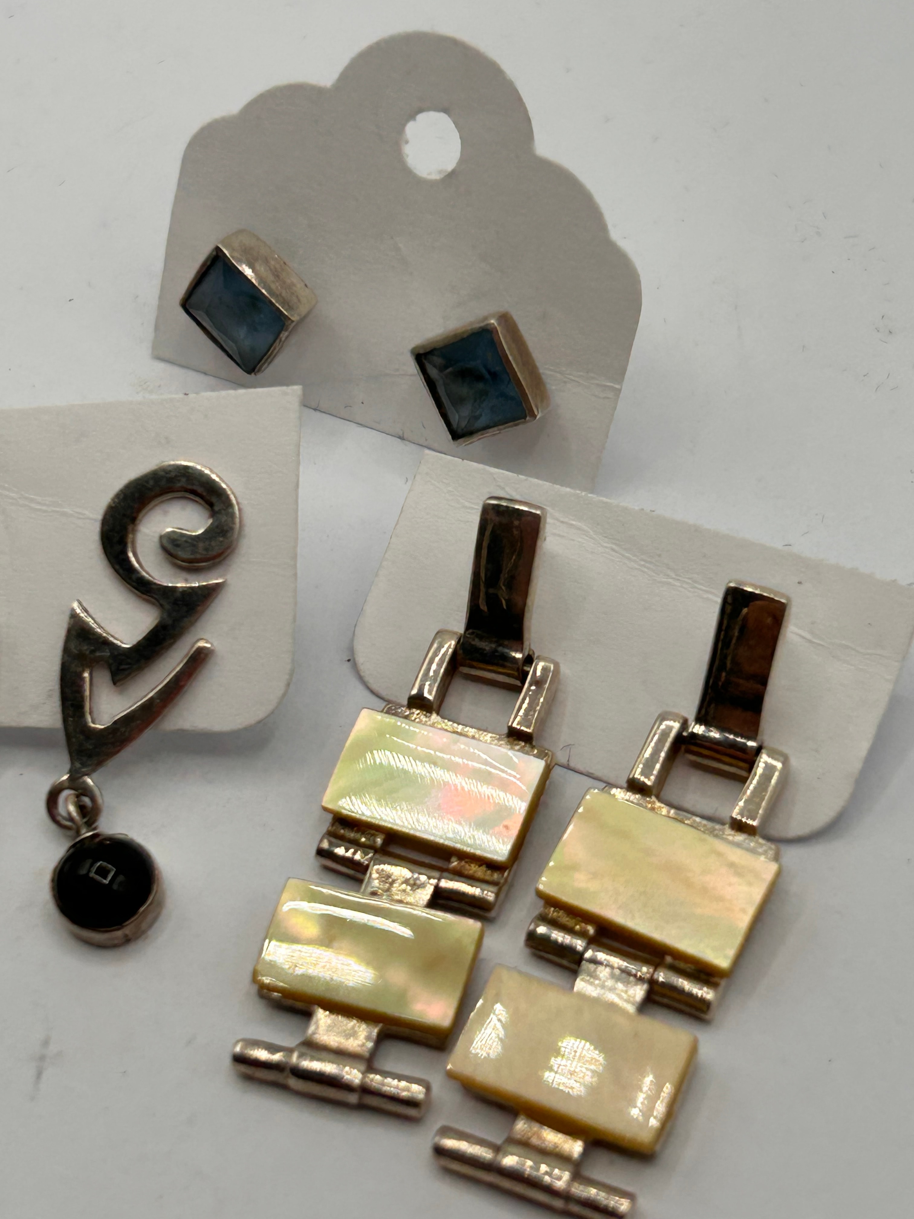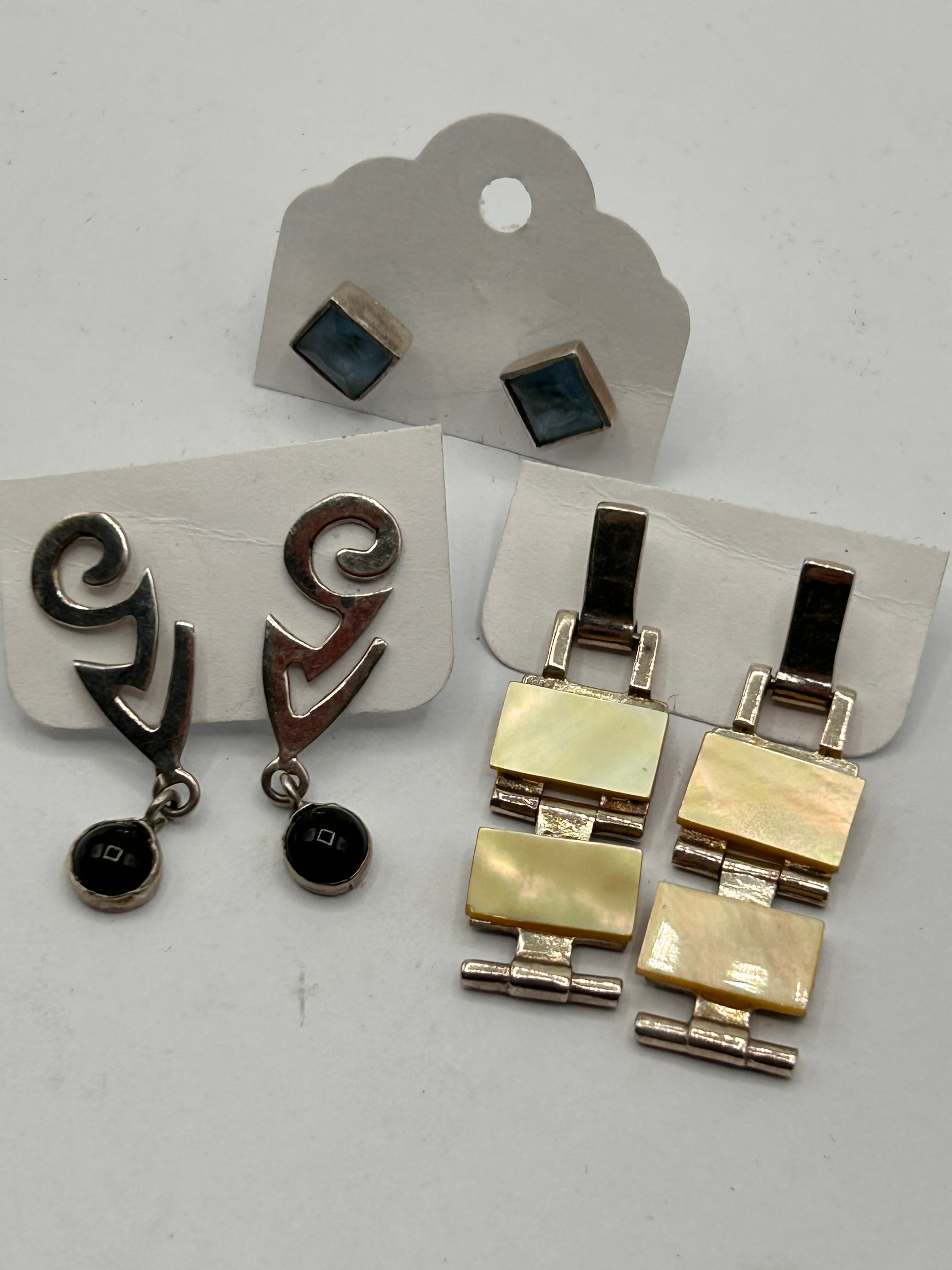 A collection of three pairs of earrings, all crafted from Silver. The first pair consists of square stud earrings, each featuring a light blue/grey cabochon stone set within a Silver bezel. The second pair comprises abstract, stylized drop earrings, also of Silver, designed with a scroll and V-shape motif, each suspending a small round black stone or inlay. The third pair are dangle earrings, constructed from articulated rectangular sections of Silver, with each segment inlaid with an iridescent, cream-colored mother-of-pearl or shell material. No specific manufacturer’s marks are visible.