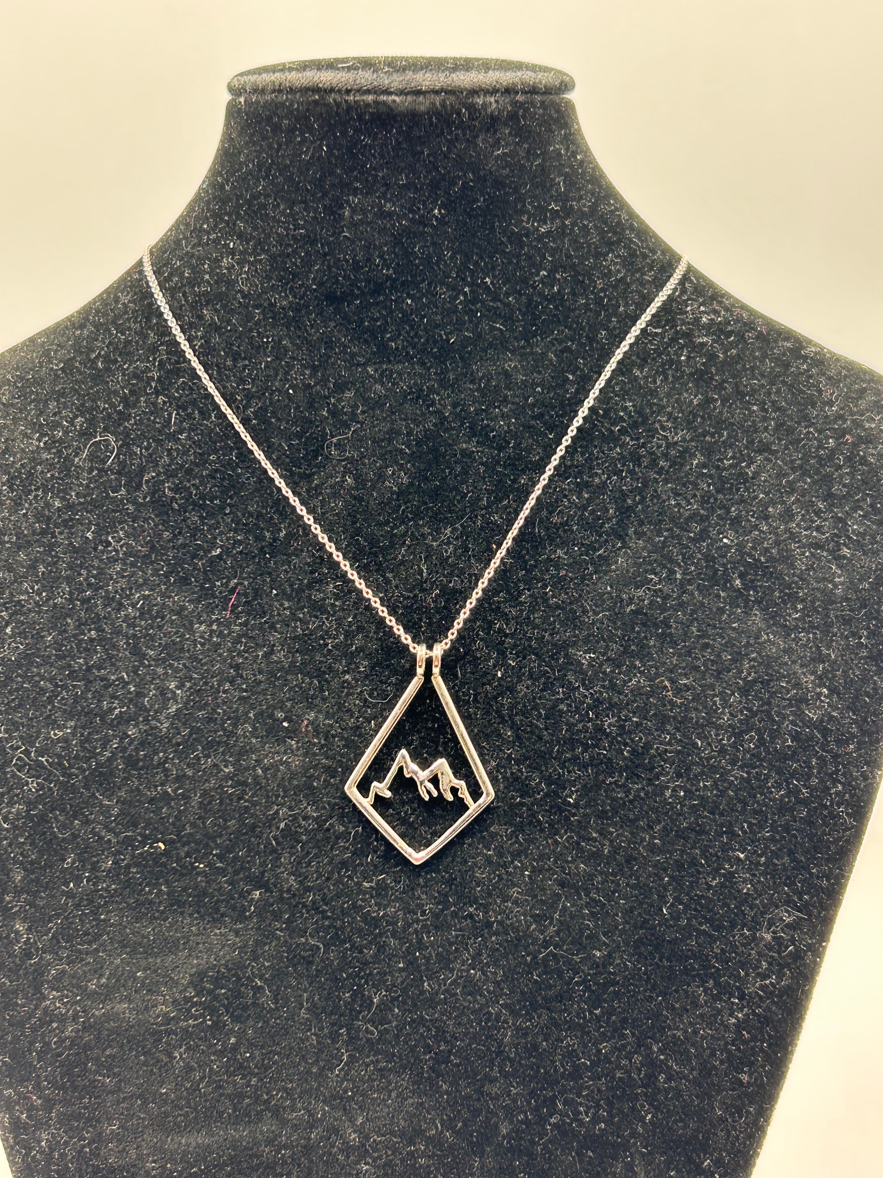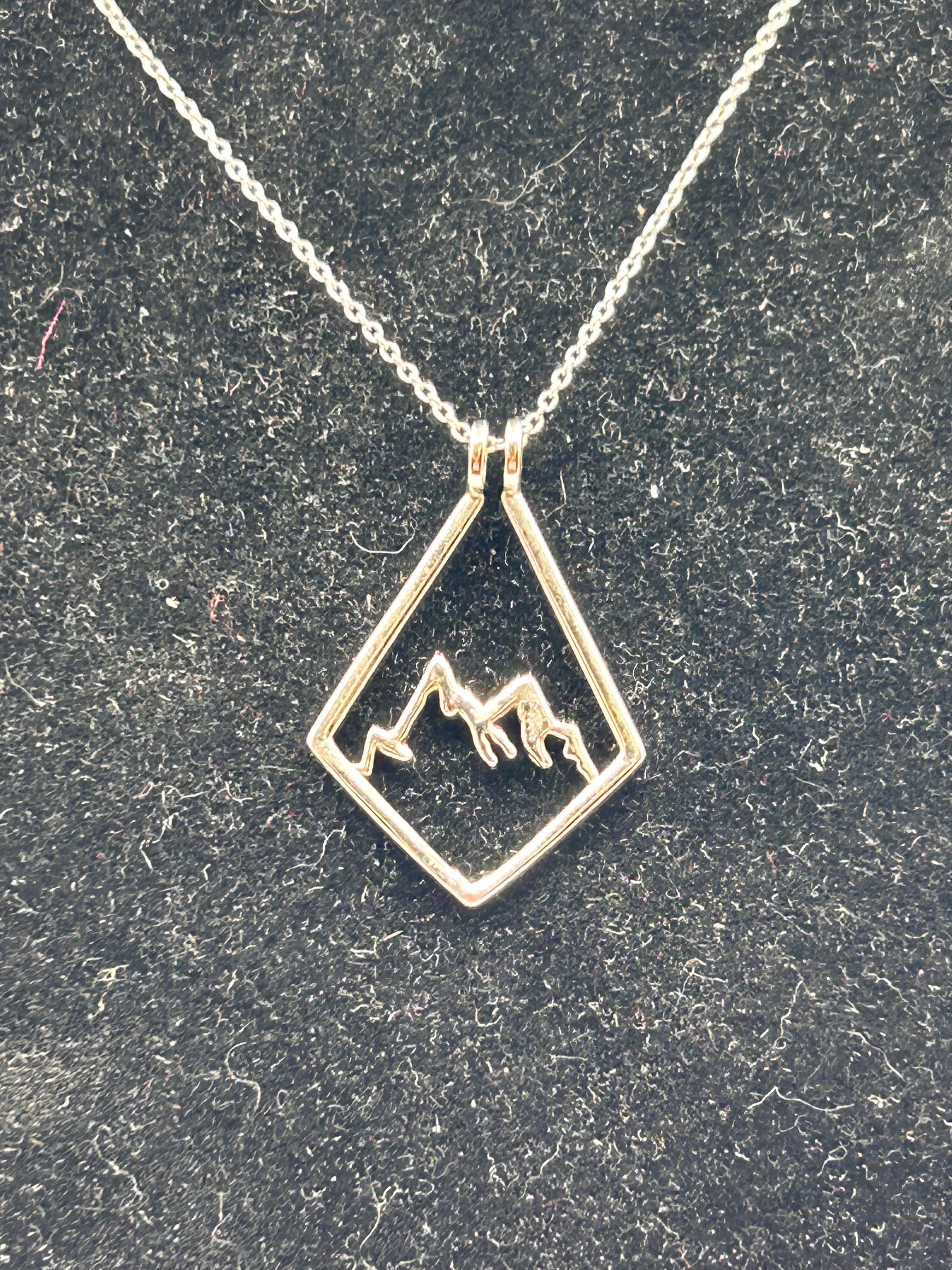An Oidea Silver Mountain Ring Holder Necklace. This contemporary pendant necklace features a delicate link chain suspending an openwork, geometric diamond-shaped pendant. The pendant encompasses an interior silhouette of mountains. The item is crafted from Silver and presents a polished finish.