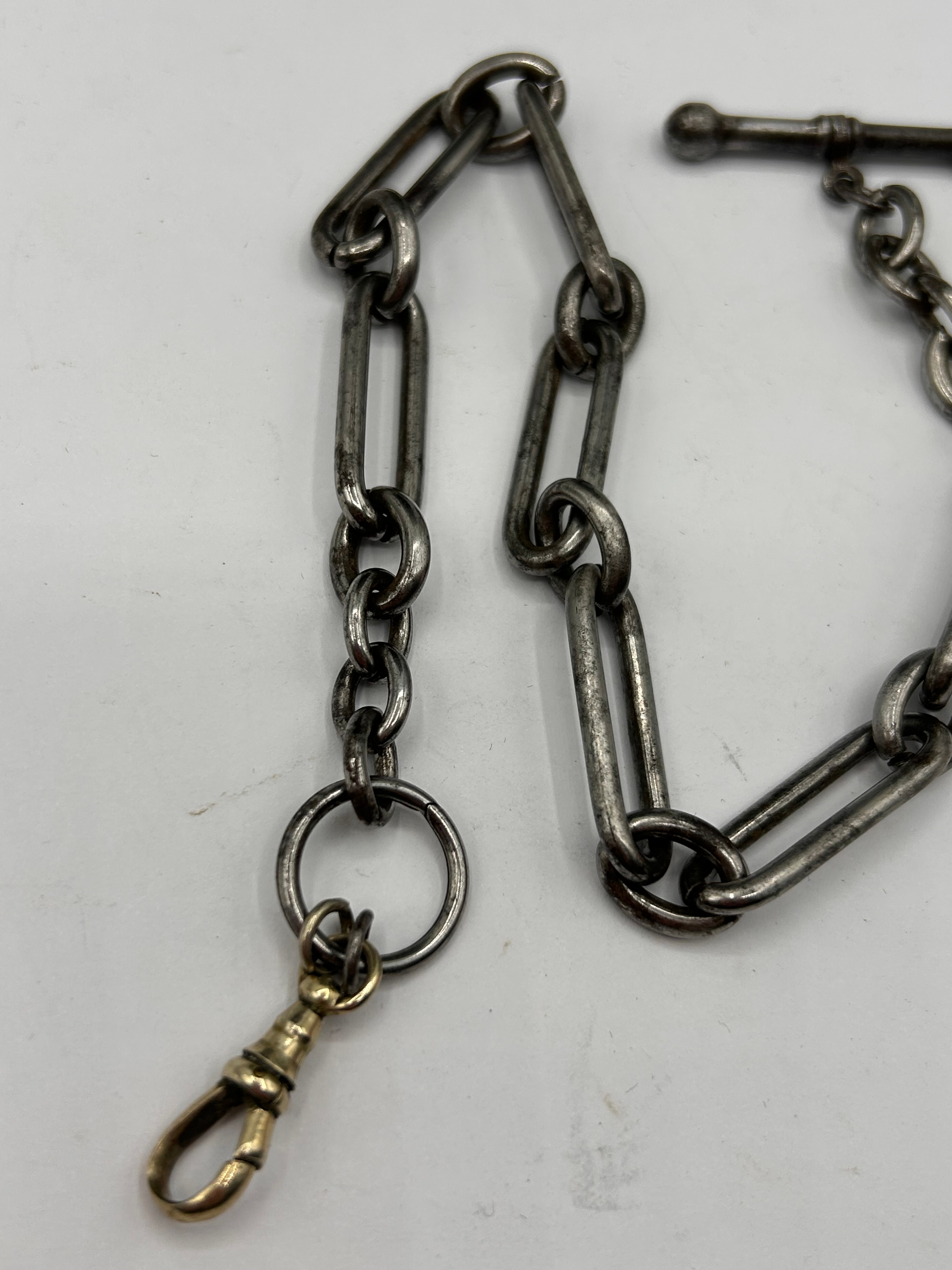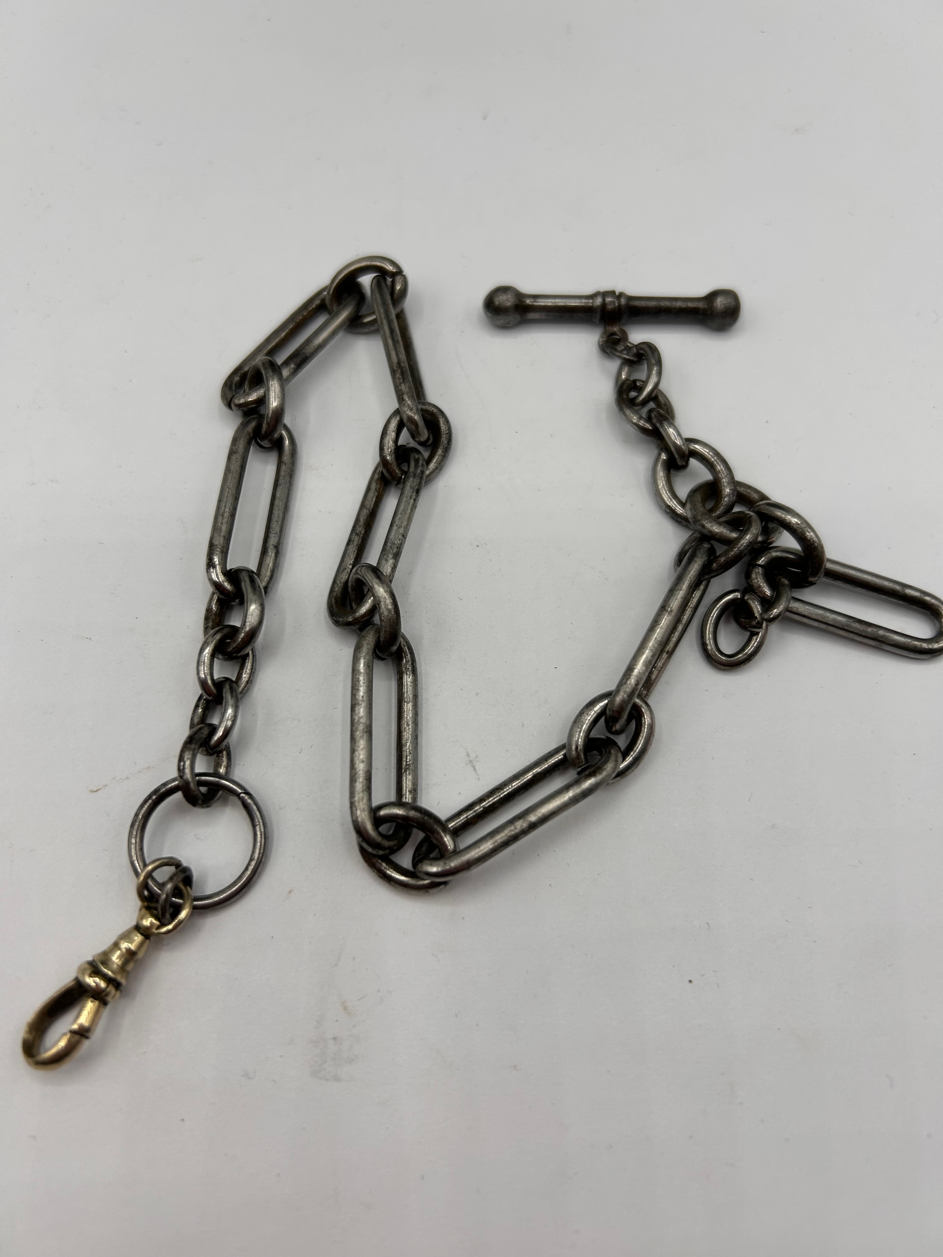 This vintage-style watch chain, consistent with an Albert chain, is constructed from White Metal. It features a series of interlocking, alternating elongated and smaller oval links. One end is fitted with a decorative T-bar, while the other connects to a smaller ring and a swivel dog clip, all components confirmed to be White Metal.