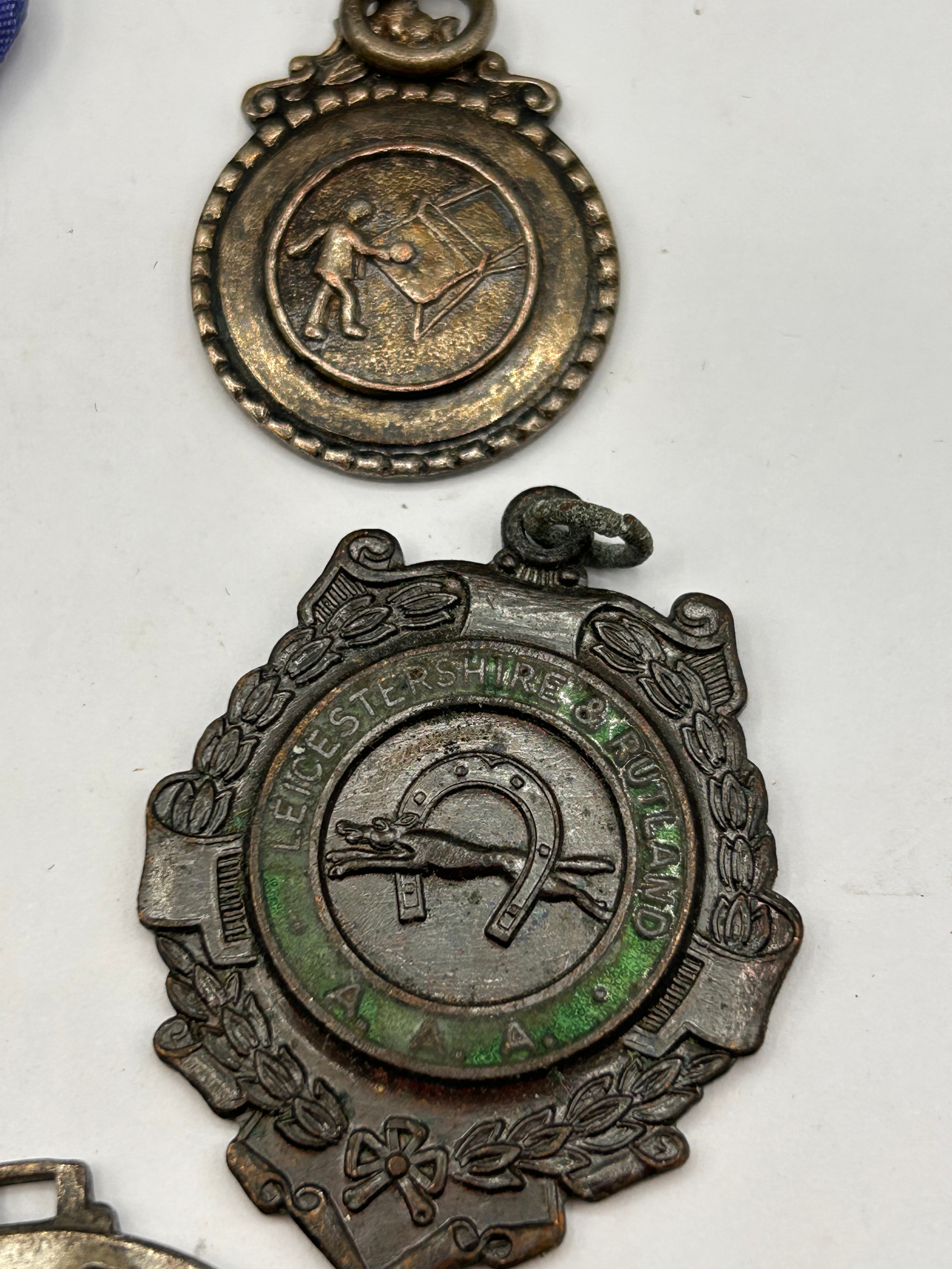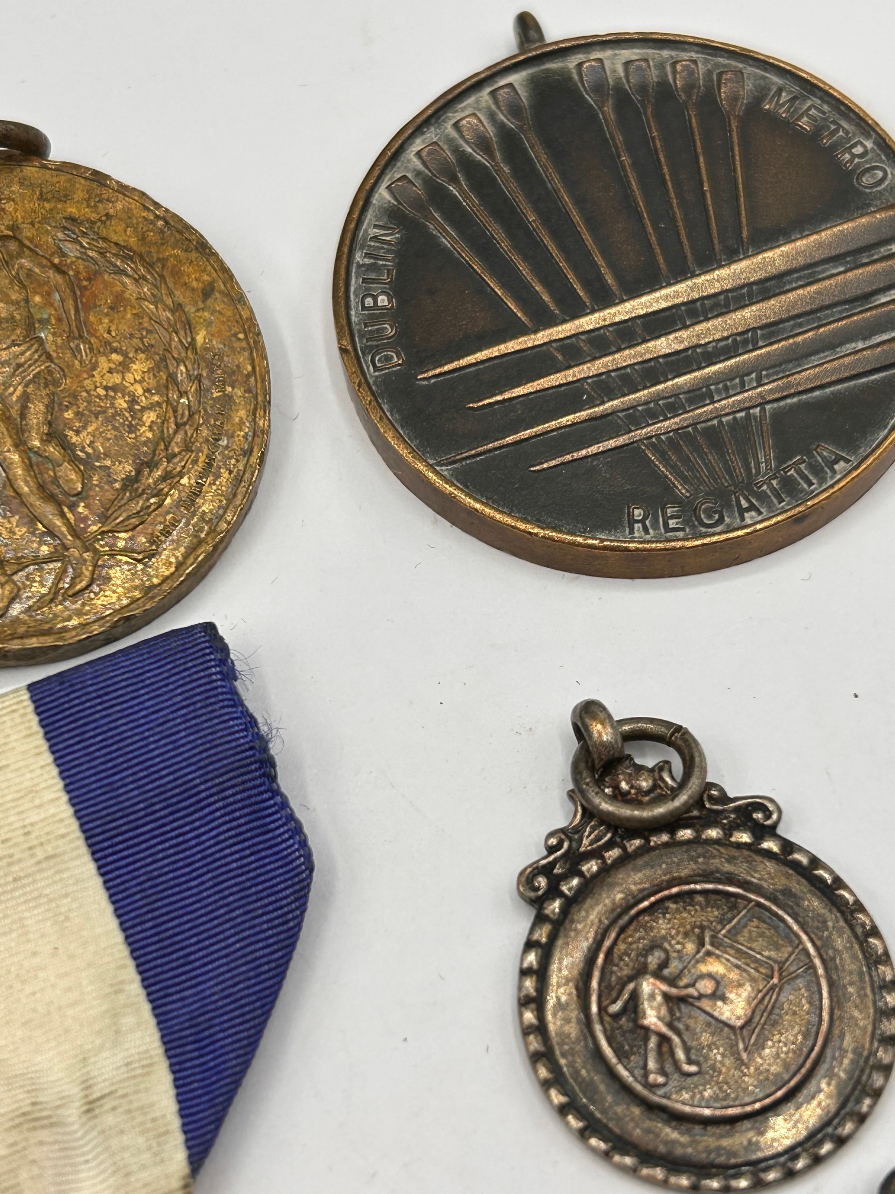 This lot comprises 7 vintage sporting medals and one enamel pin, totaling 8 items. The medals are crafted from mixed metals, including bronze-toned and silver-toned alloys, with some featuring enamel accents. One medal is suspended by a red, white, and blue fabric ribbon. The collection displays a variety of sporting themes, including archery, badminton, rowing, and athletic poses, alongside heraldic or organizational crests. Visible inscriptions include “DUBLIN METRO REGATTA,” “LEICESTERSHIRE & RUTLAND C.L.A.A.,” and “C.L.A.A.” on the enamel pin.