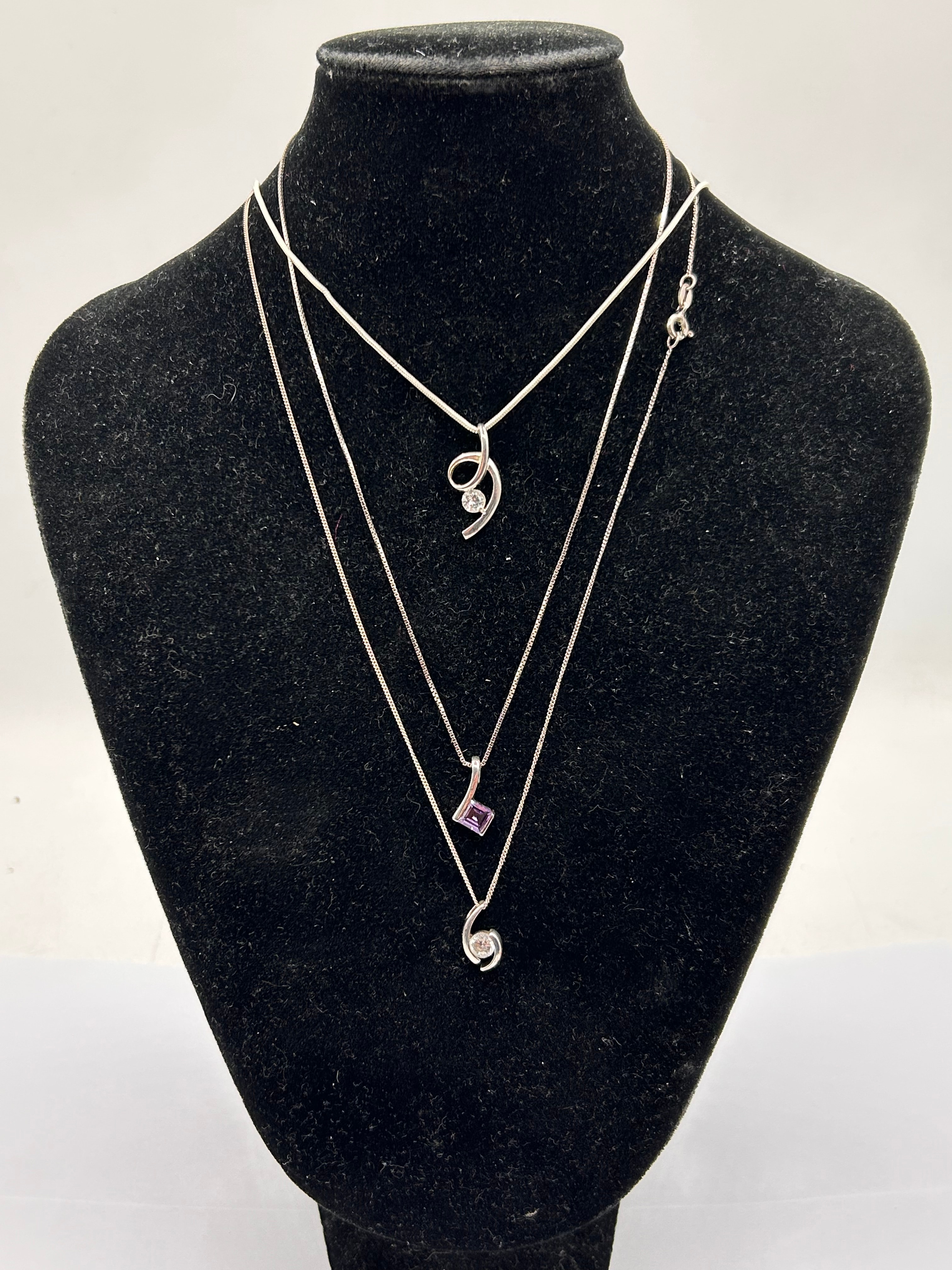 A group of three contemporary necklaces, each crafted from Silver. The shortest necklace features a curvilinear, abstract-style pendant set with a single round, clear stone. The mid-length necklace holds a simple pendant with a square-cut, light purple stone. The longest necklace presents a matching curvilinear, abstract pendant, identical in style to the shortest, also set with a single round, clear stone. The necklaces are displayed on a black velvet jewelry bust.