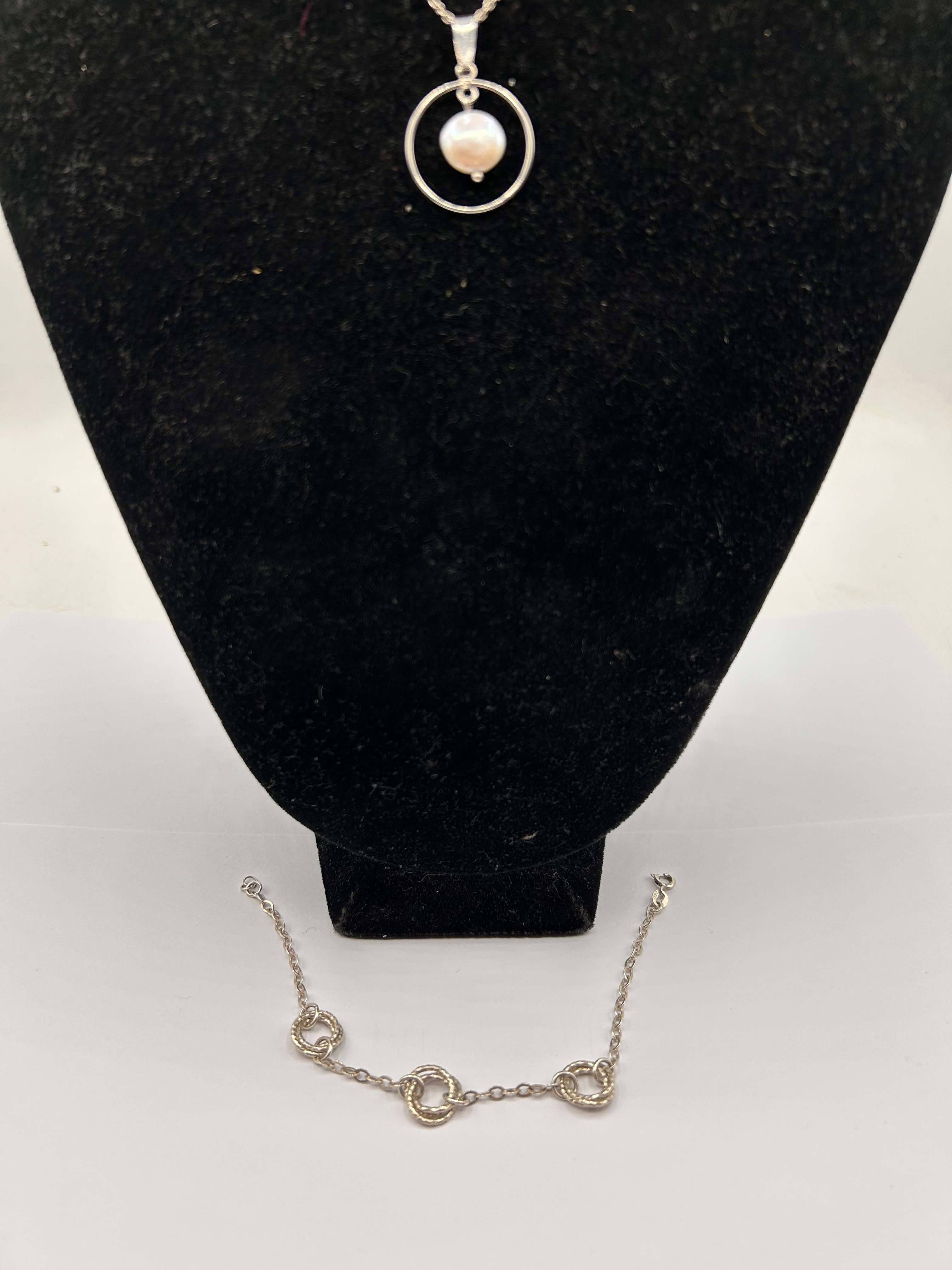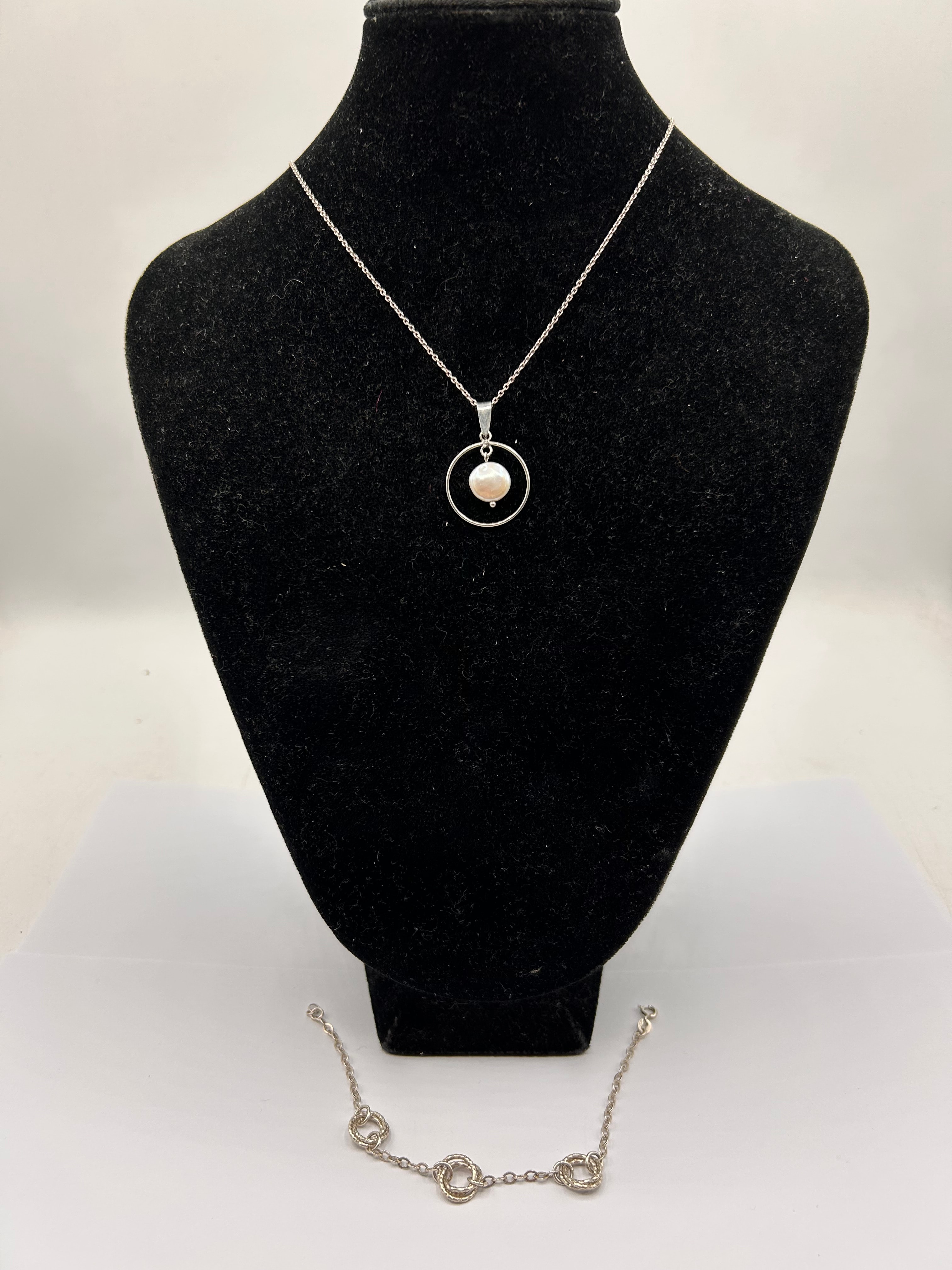 A contemporary silver jewelry set comprising a necklace and a coordinating bracelet. The necklace features a delicate silver chain suspending a pendant with an open circular frame that encloses a single, light pinkish-cream pearl. The bracelet showcases a matching silver chain adorned with three textured, intertwined circular links.
