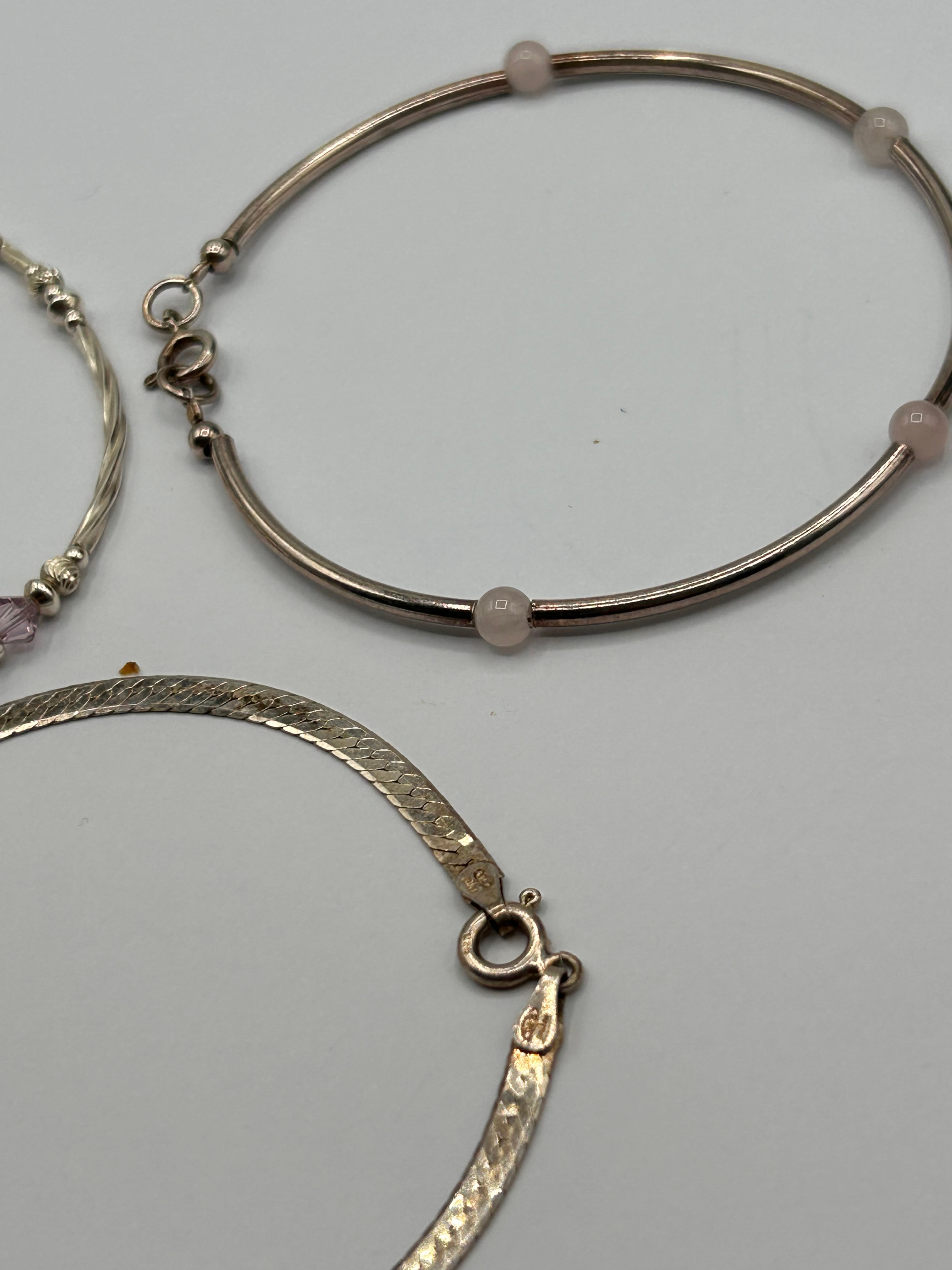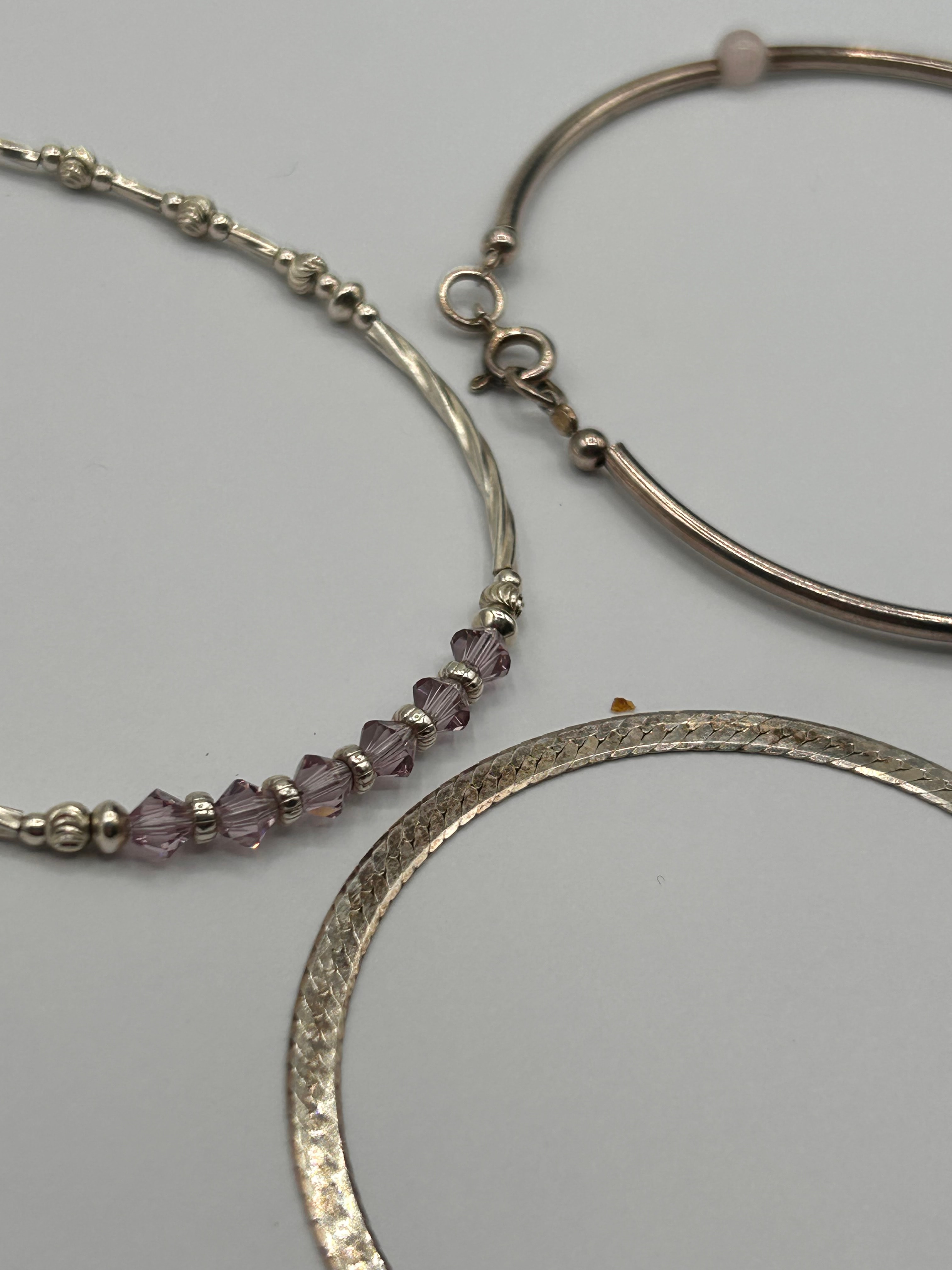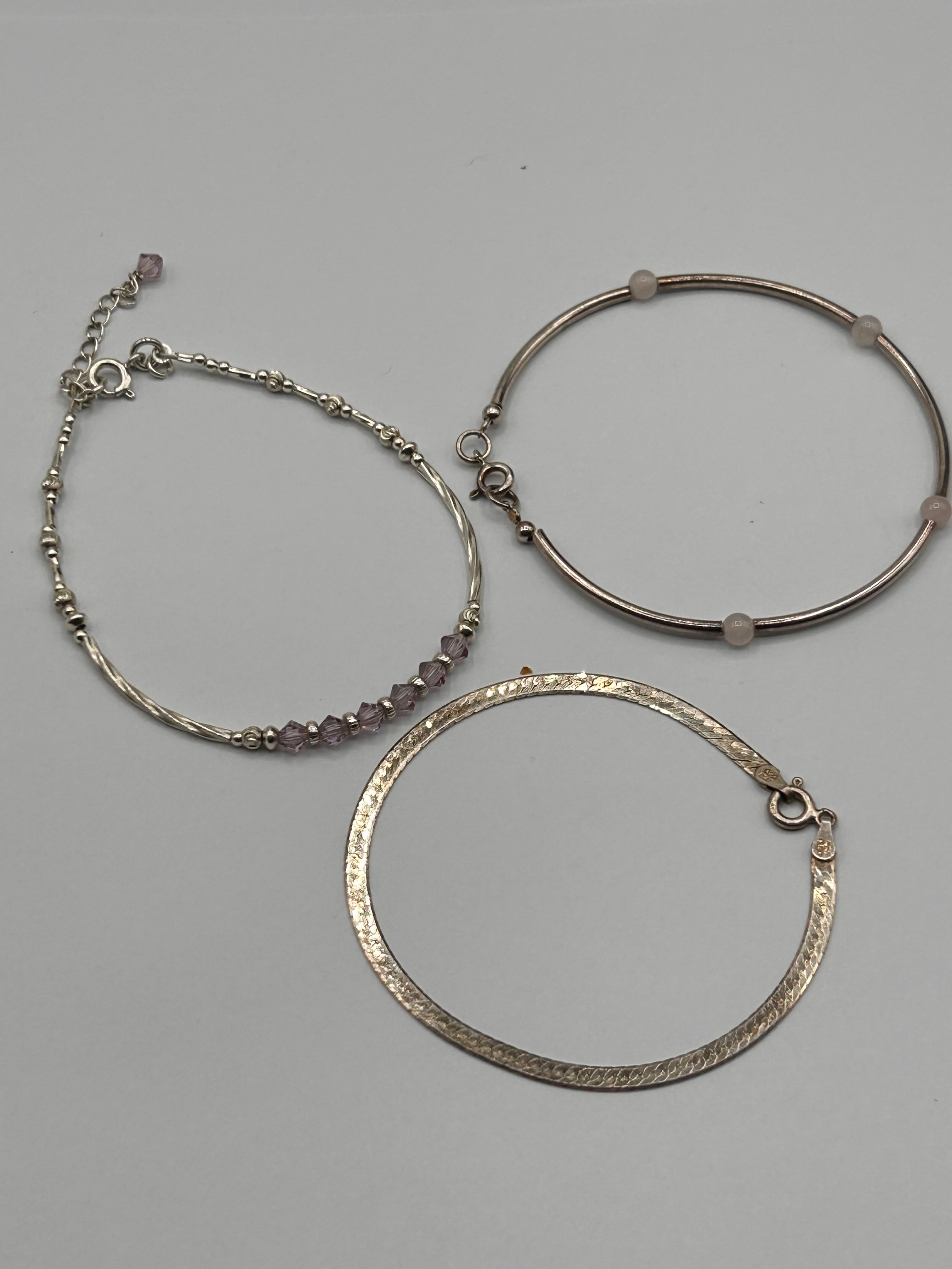 A group of three contemporary-style silver bracelets. Comprising one flexible chain bracelet featuring decorative links, small round beads, and purple faceted bicone beads, secured by a lobster clasp with an extender. The second is a semi-rigid bangle-style bracelet with a smooth, tubular band interspersed with four light pink spherical beads, fastened with a lobster clasp. The third is a flat herringbone-link chain bracelet, bearing a ‘925’ hallmark on its spring ring clasp, indicating sterling silver.