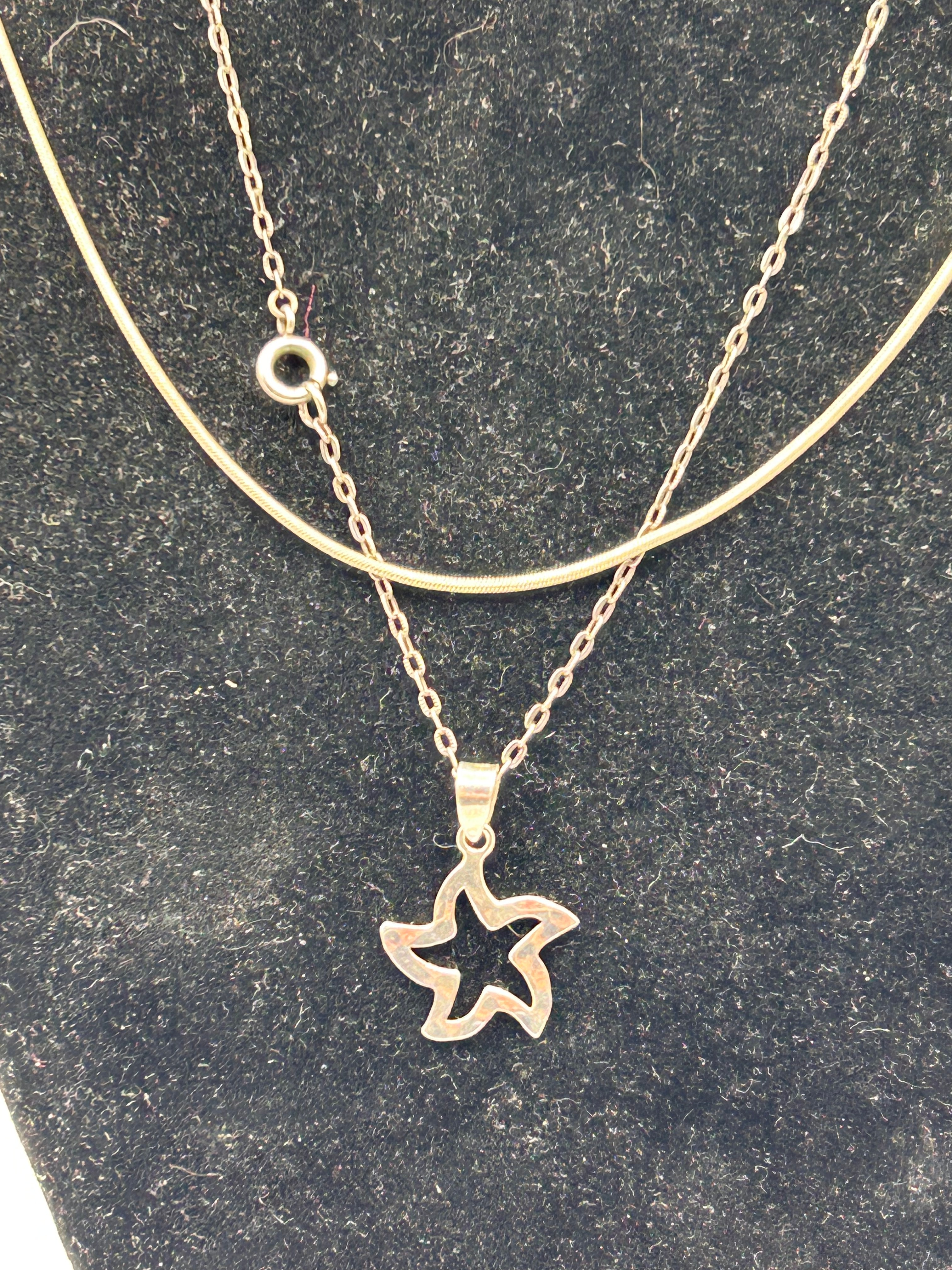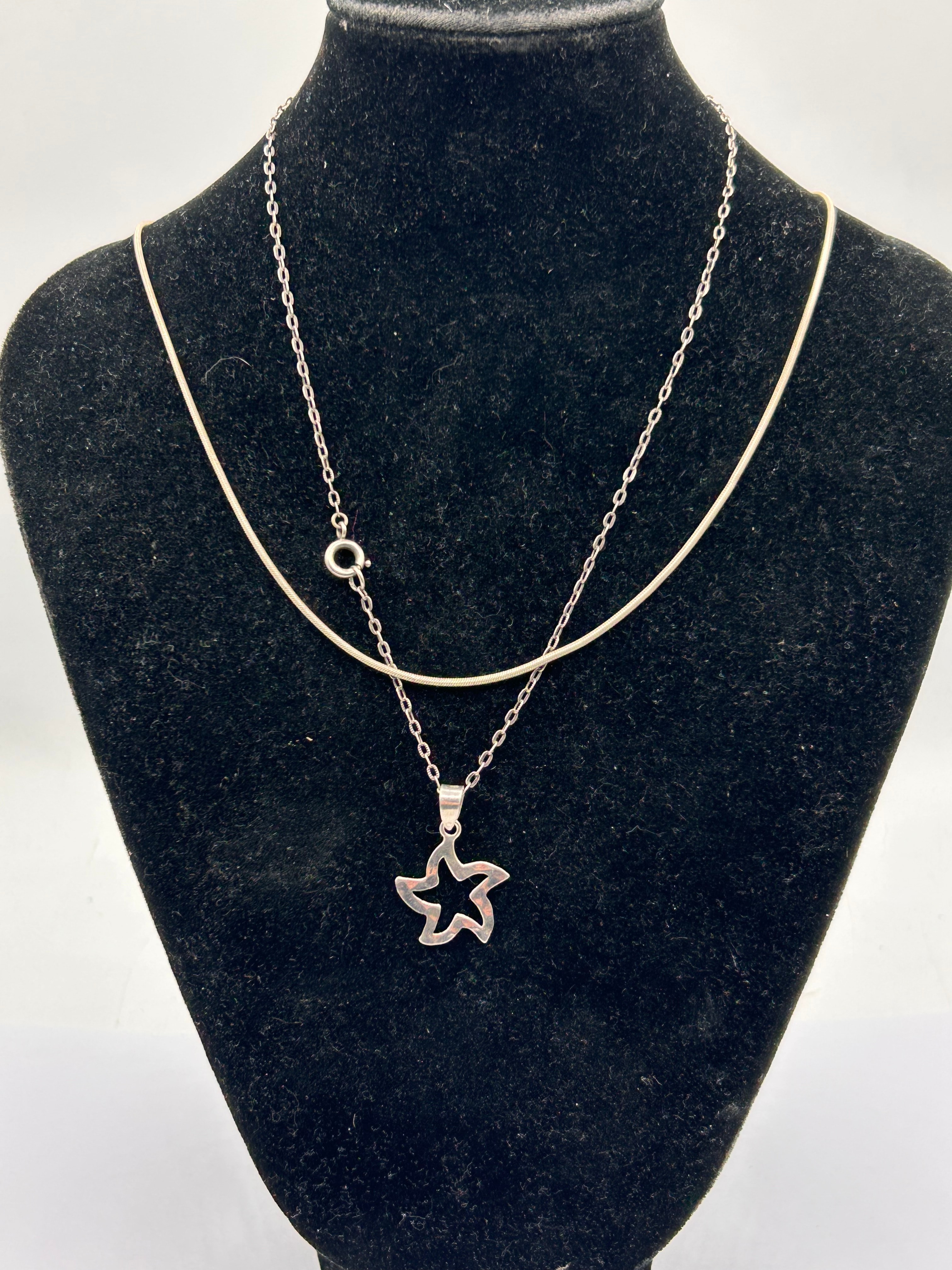 A pair of Y2K style necklaces, crafted from silver. The first necklace features a delicate chain terminating in a spring-ring clasp, suspending an openwork five-point star pendant. The second necklace is a plain snake chain. Both pieces exhibit a modern Y2K aesthetic.