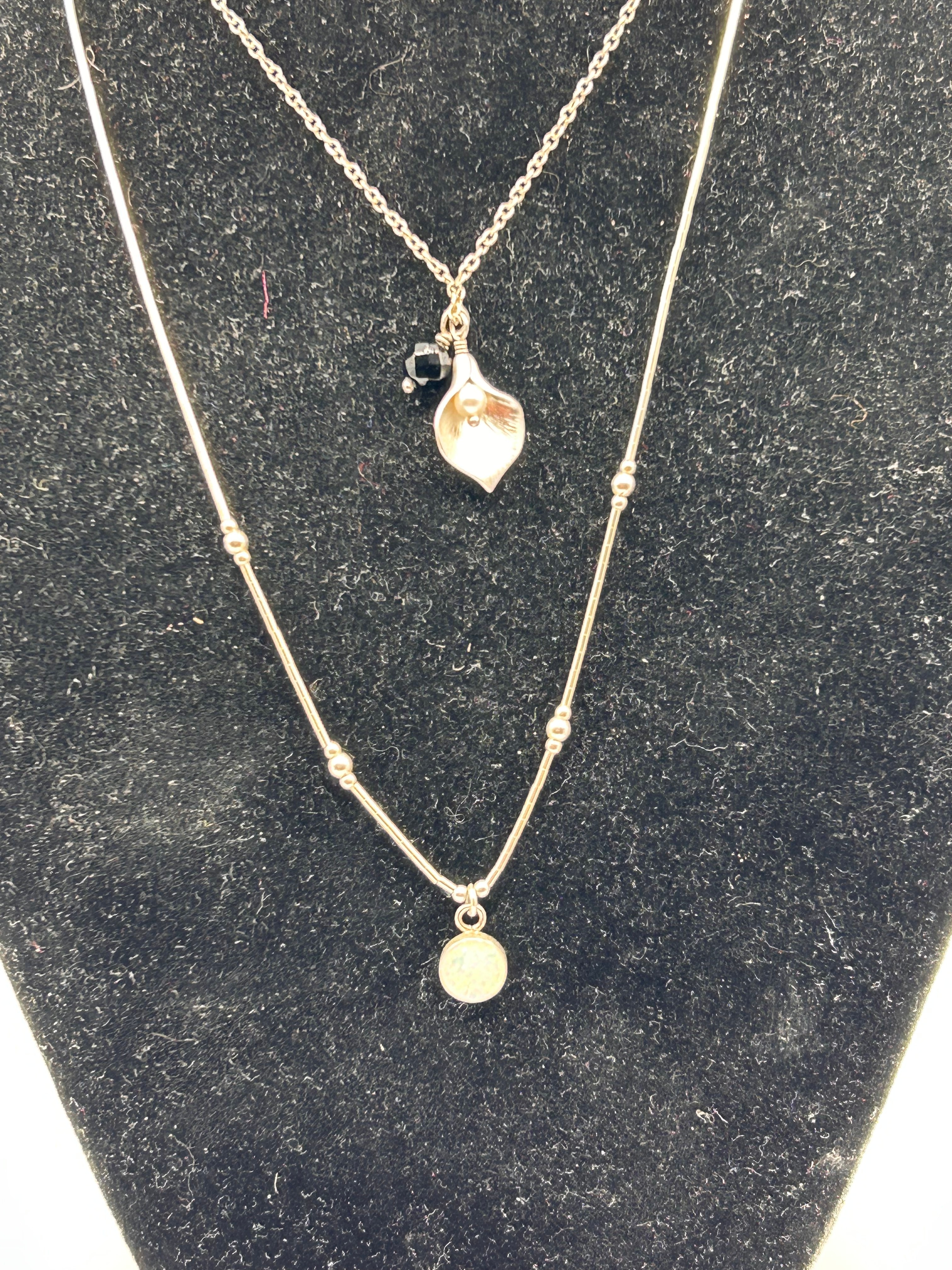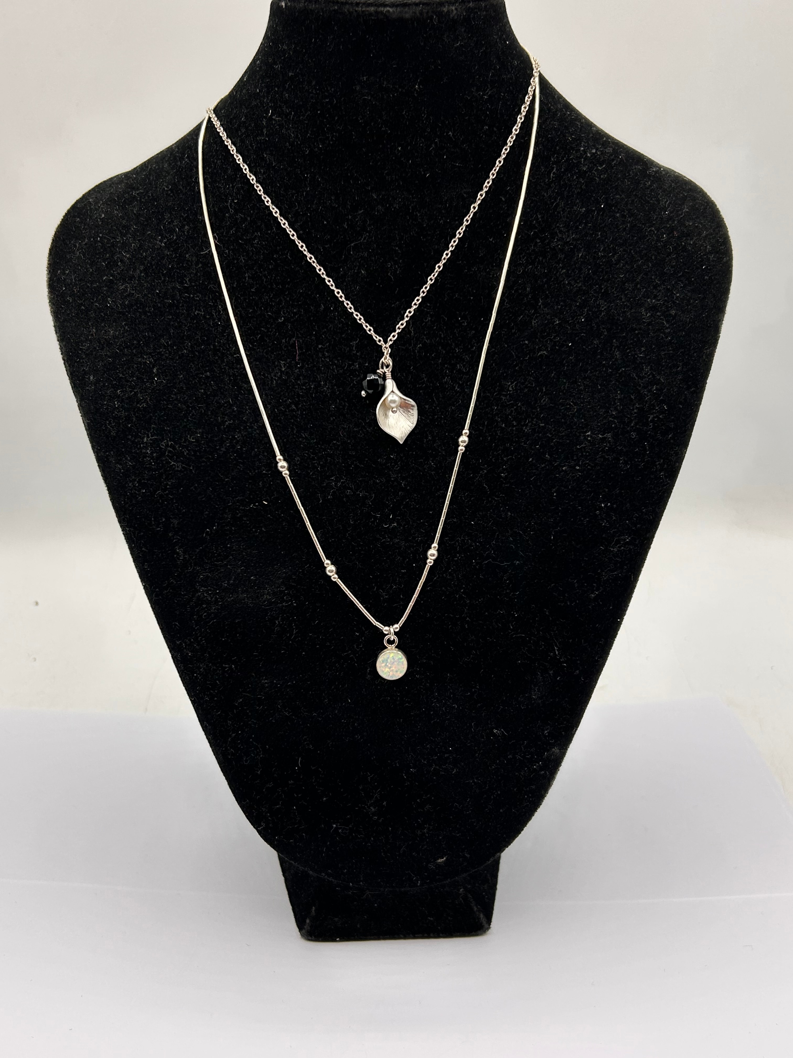 A contemporary silver layered necklace comprising two individual necklaces. The upper necklace features a fine chain suspending a polished, heart-shaped pendant, accented by two small, round black beads. The lower, longer necklace is a delicate chain interspersed with multiple small, round silver beads, culminating in a round, faceted iridescent or clear stone pendant. No visible markings or inscriptions.