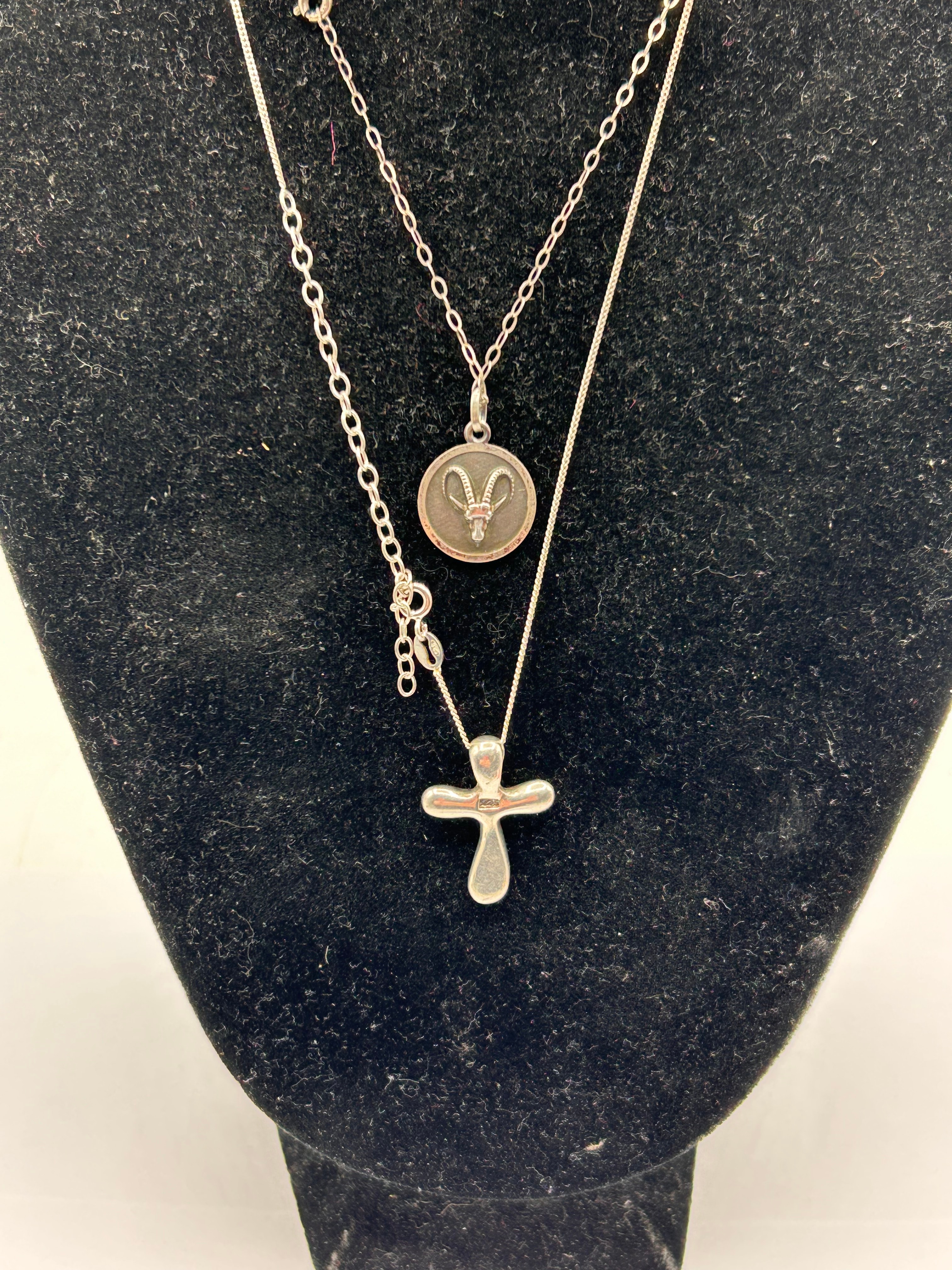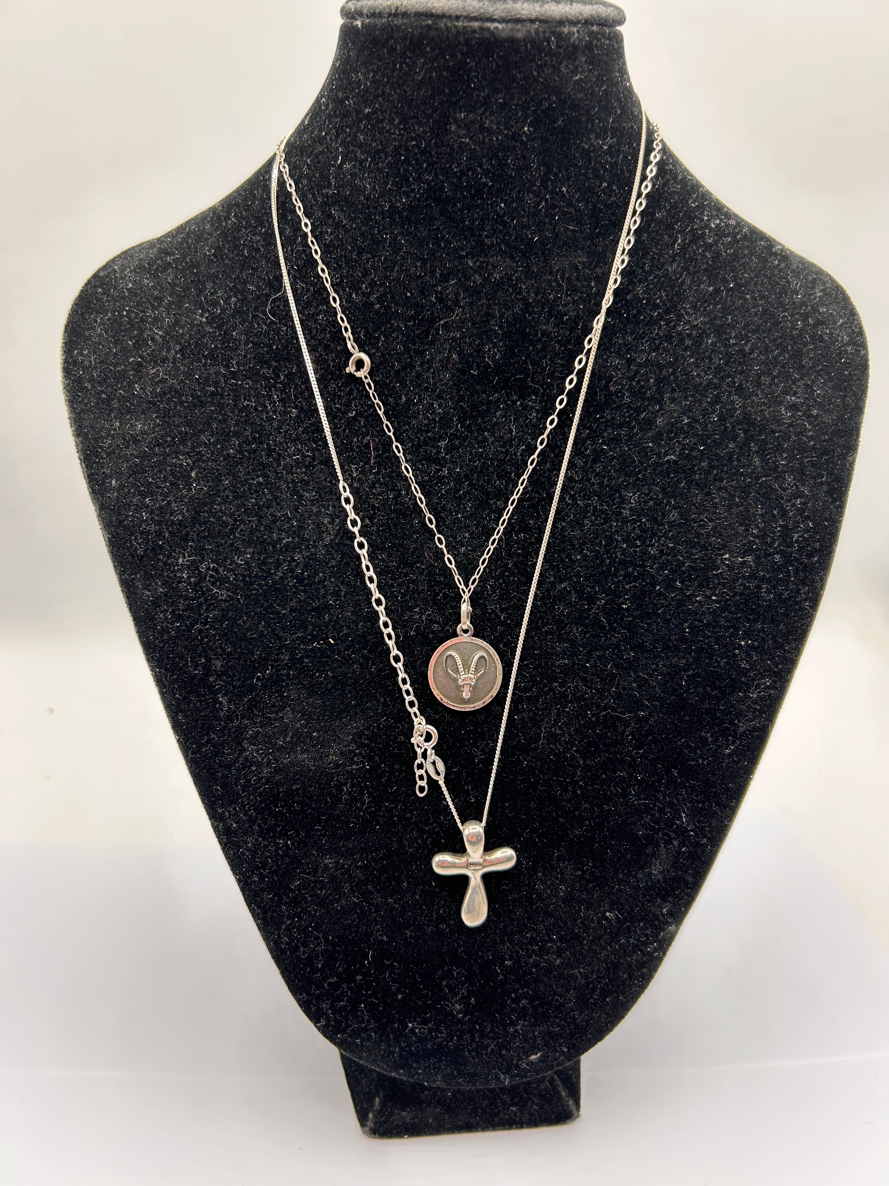 A pair of contemporary layered necklaces, both crafted from Silver. The longer necklace features a simple link chain with an extender and a puffed, stylized cross pendant. The shorter necklace, on a finer chain, displays a circular pendant with a dark central inlay, showcasing a stylized ram’s head or Aries astrological symbol in a reddish-gold tone, all set within a silver bezel.