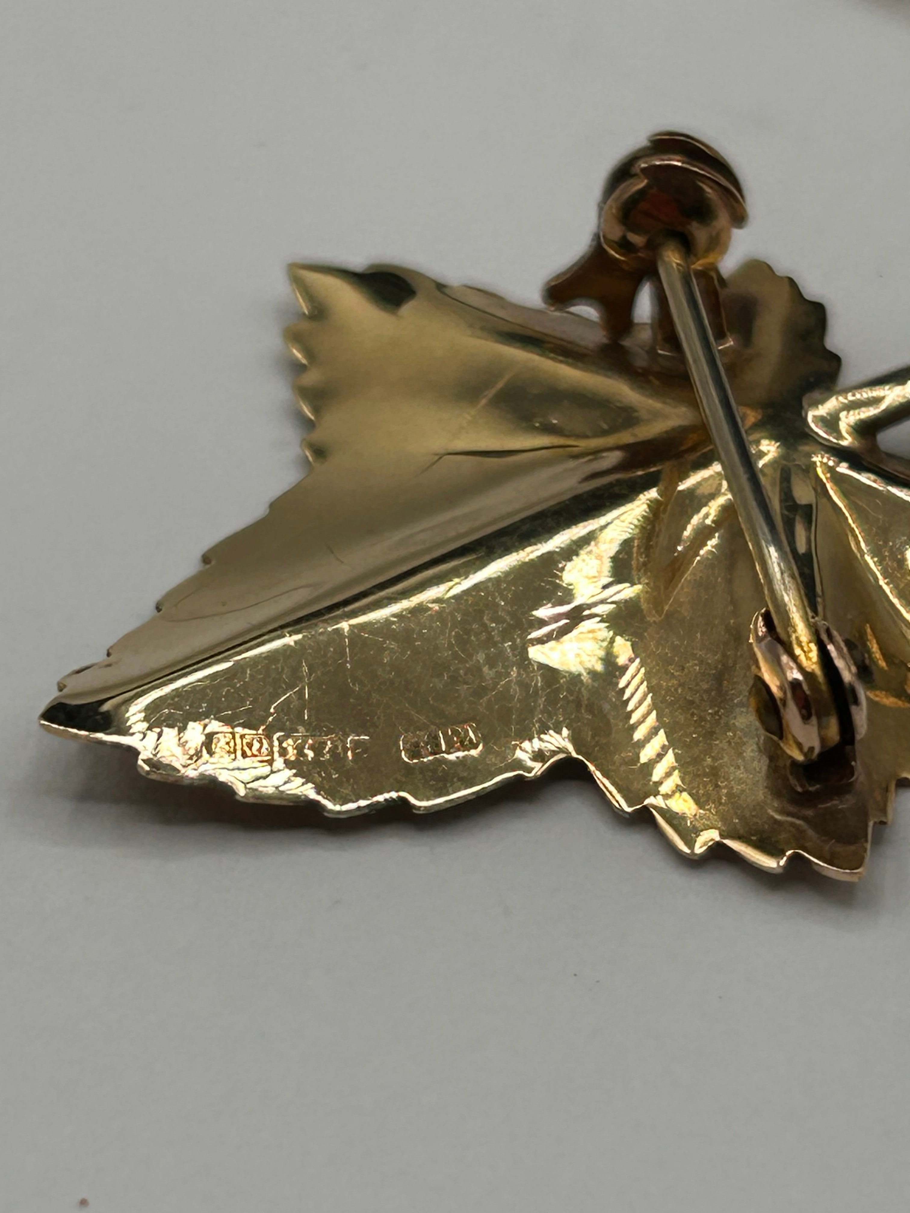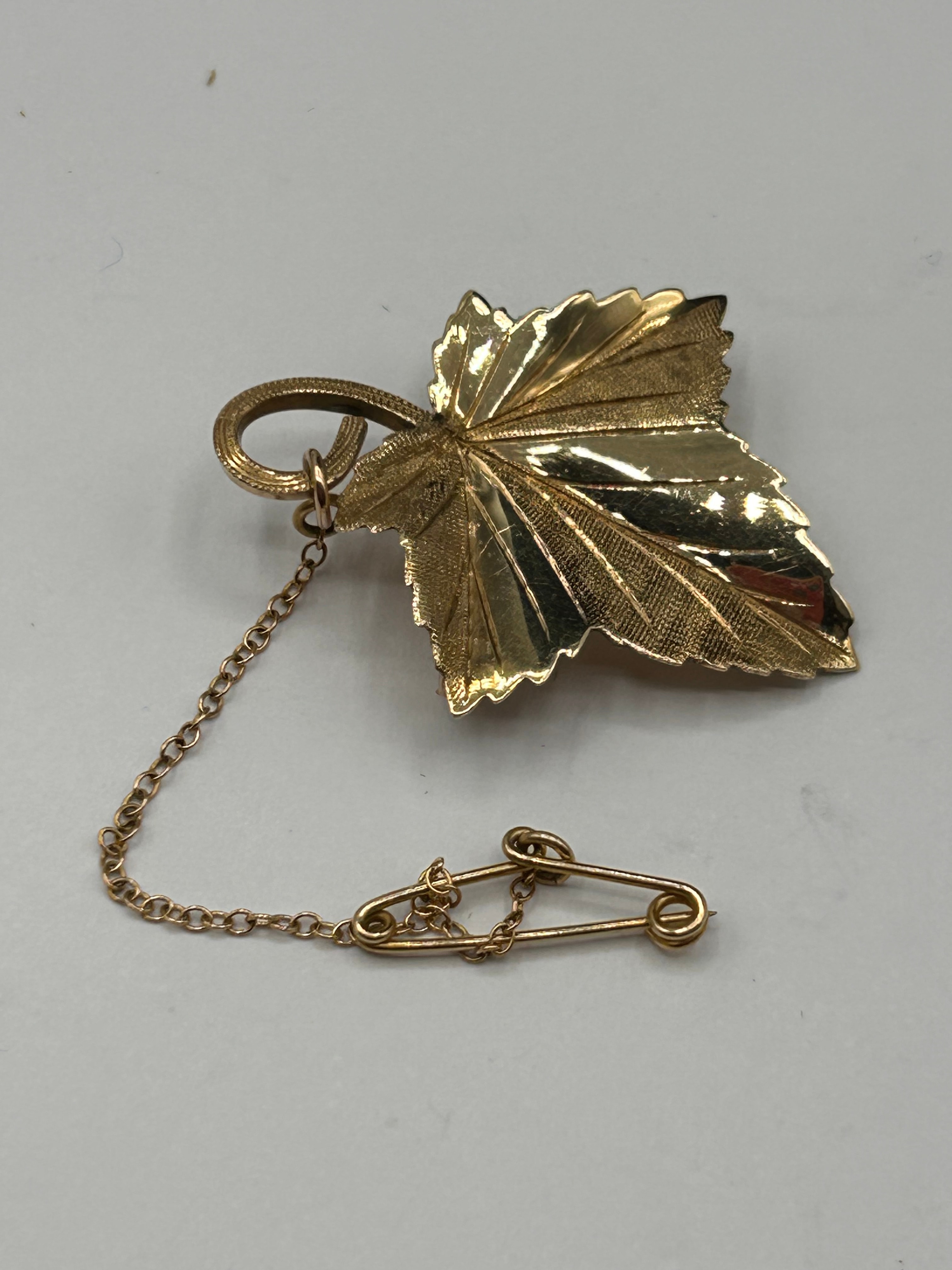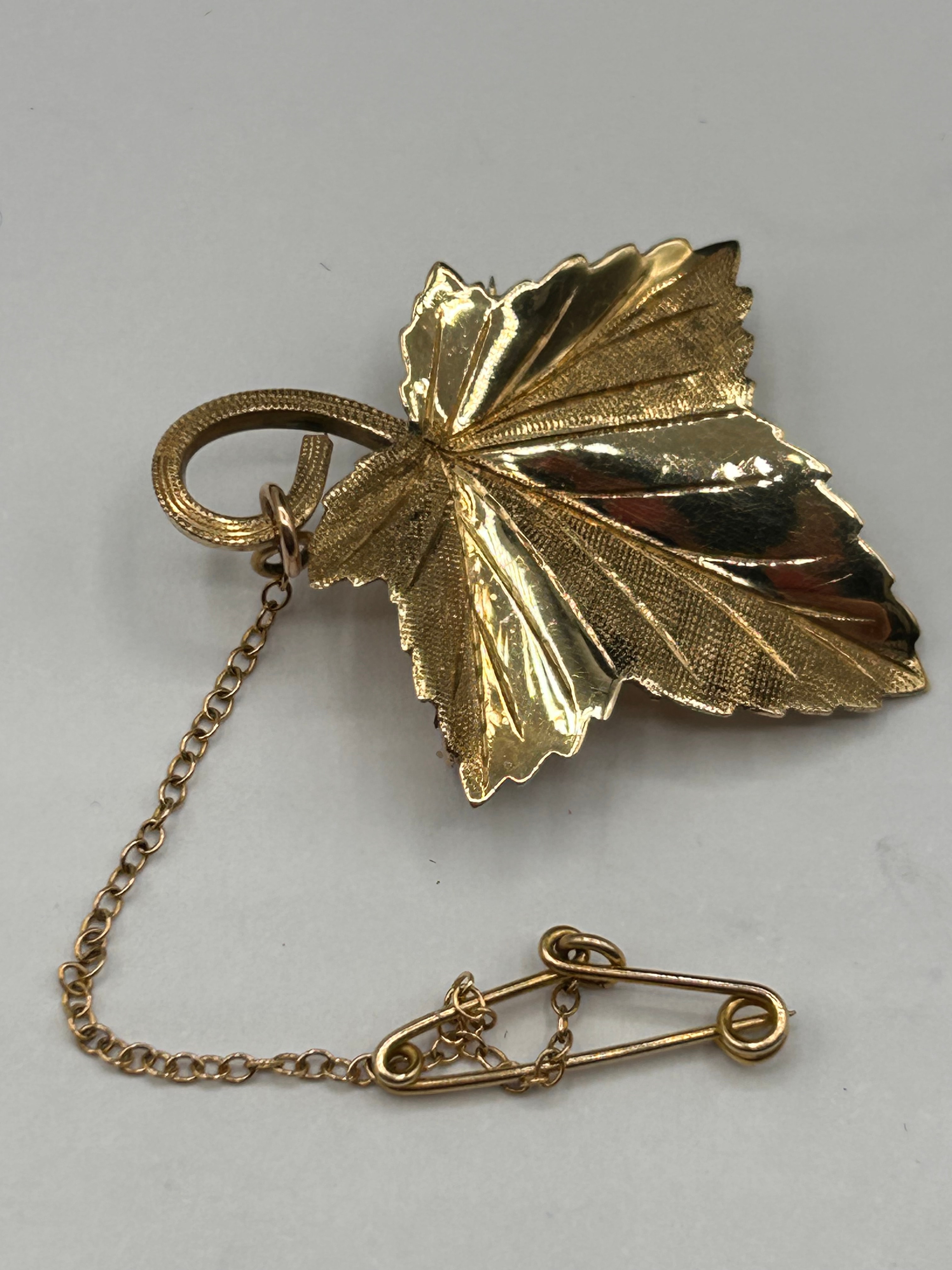 A botanical-style brooch crafted from 9ct gold, depicting a textured and veined serrated leaf. The reverse features a secure pin stem with a roll-over clasp. An attached gold-toned chain leads to a small safety pin, suggesting functionality as a scarf or lapel pin.