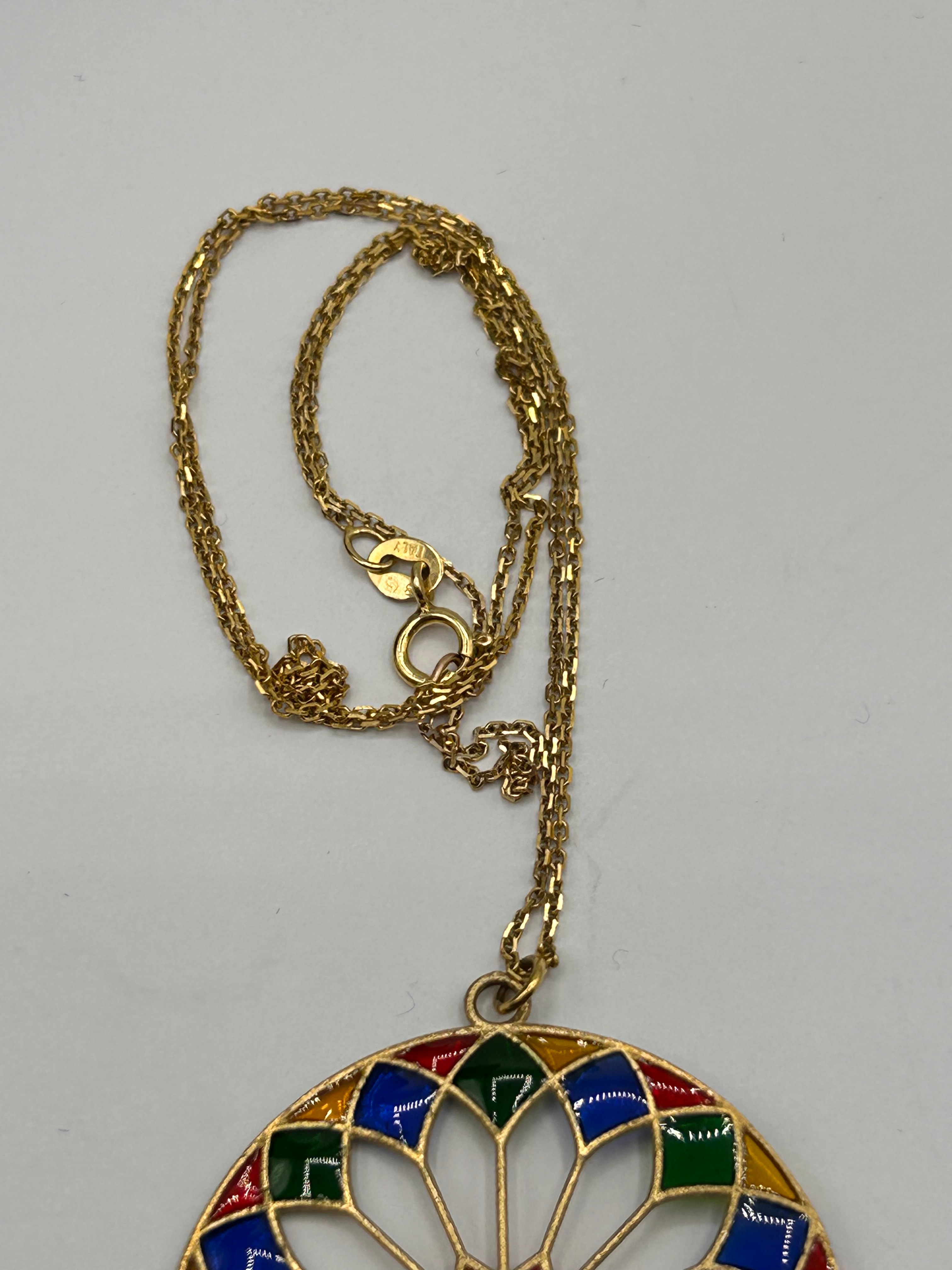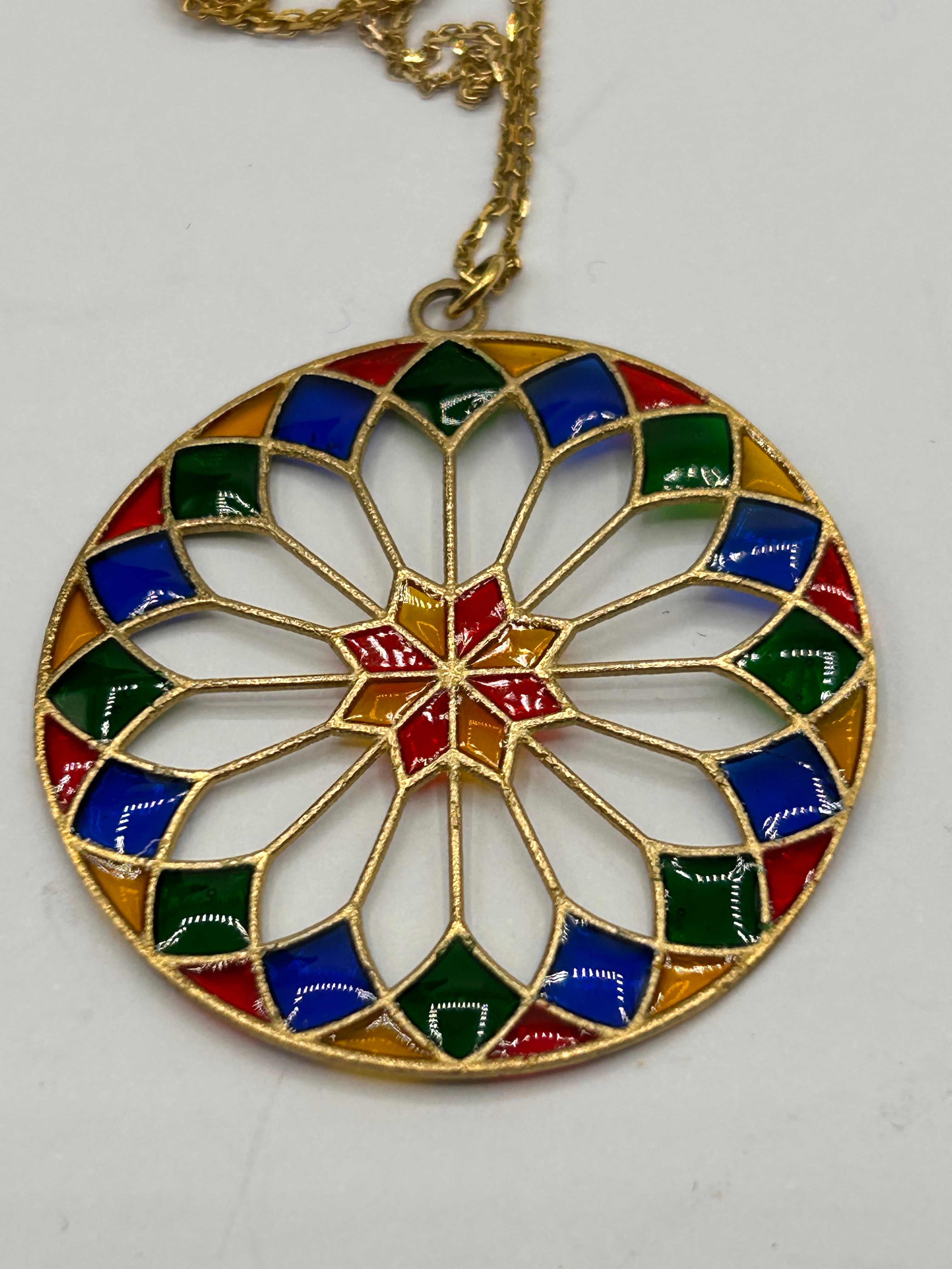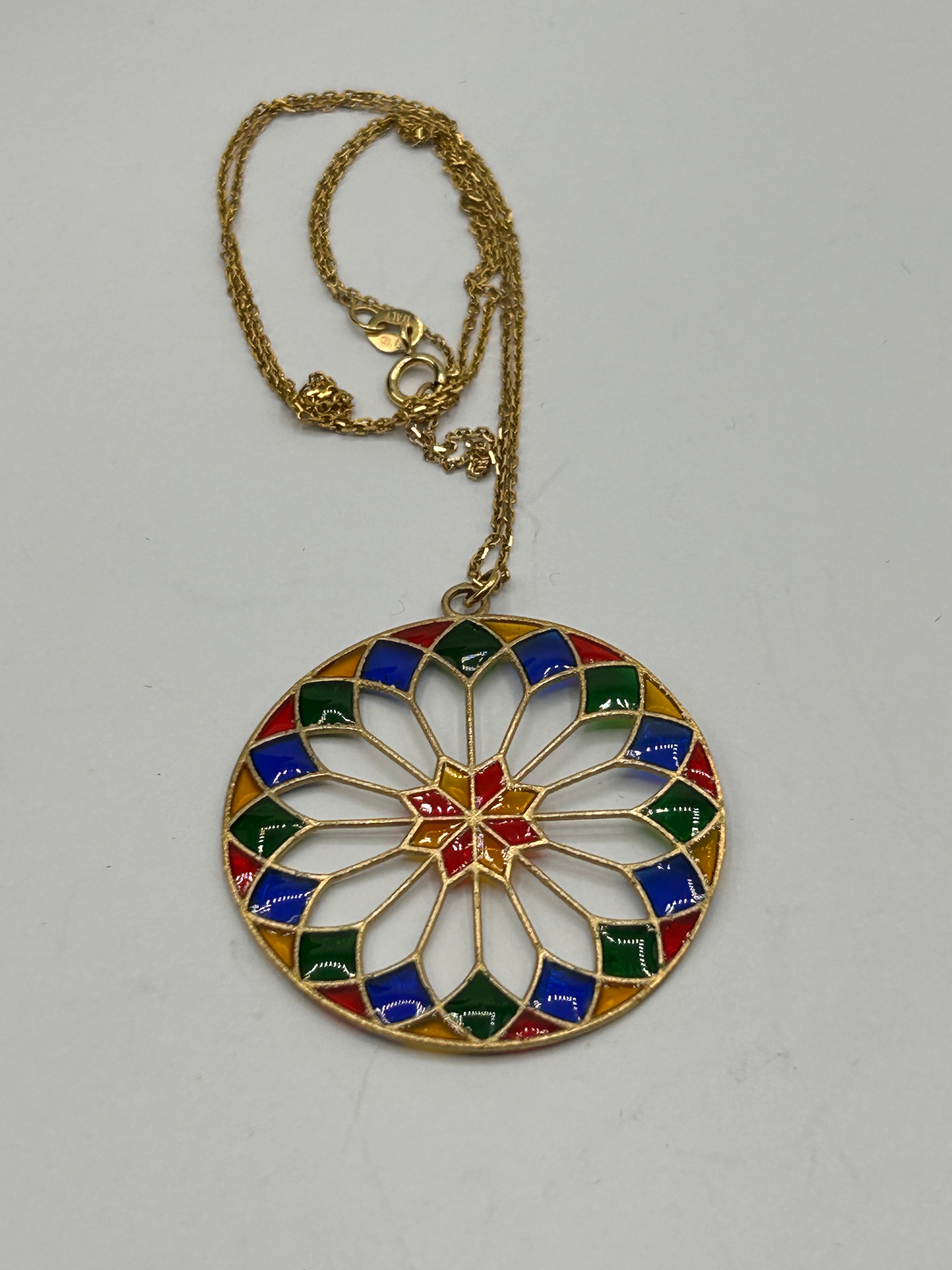 A French Plique-à-Jour Enamel 9 ct Gold Pendant Necklace, featuring a circular pendant with a polychrome enamel design, reminiscent of a rose window or stained-glass motif. The pendant’s gold framework outlines a central starburst surrounded by geometric shapes in red, blue, green, and yellow. It is suspended from a fine gold chain, secured by a lobster clasp.
