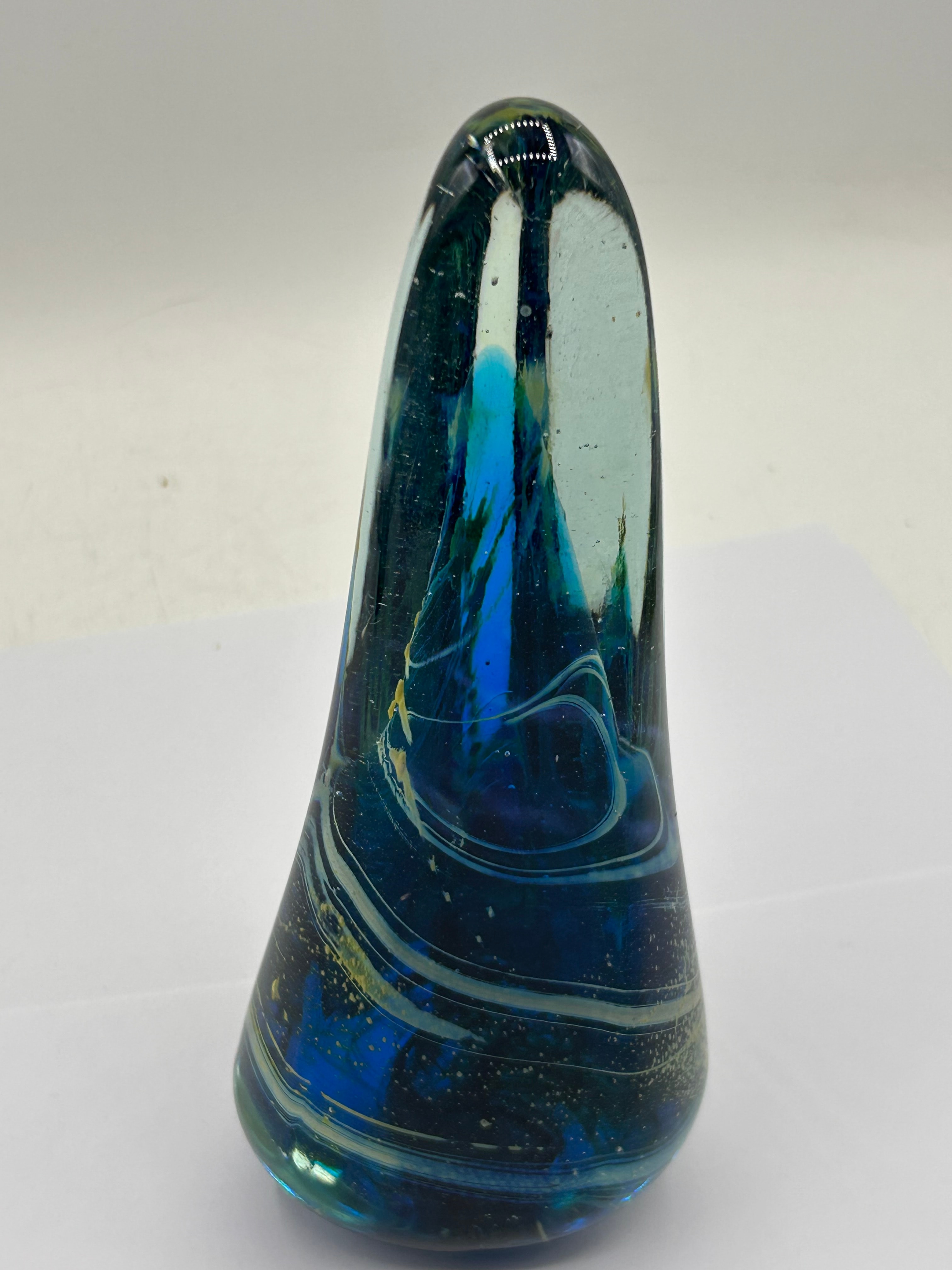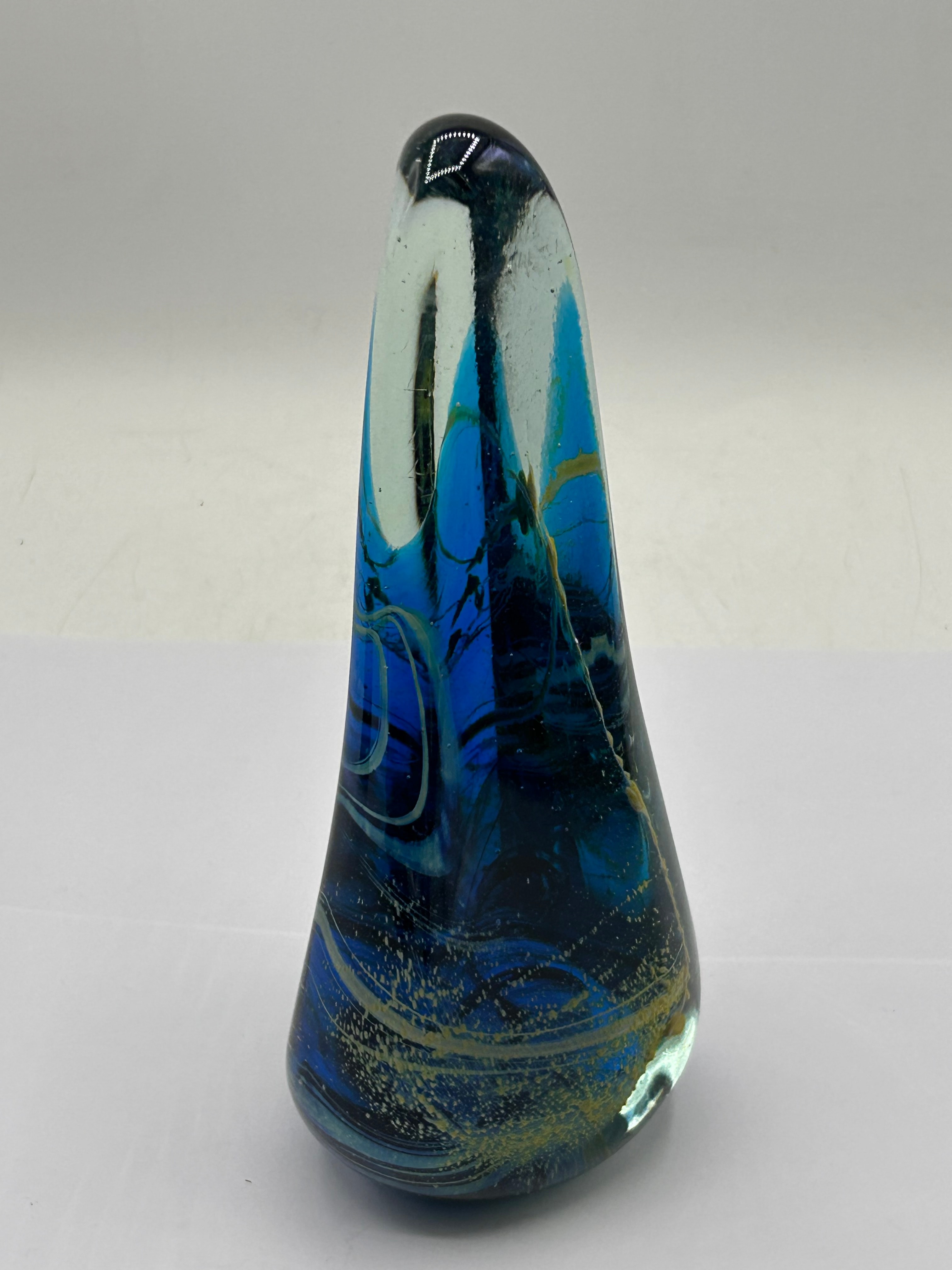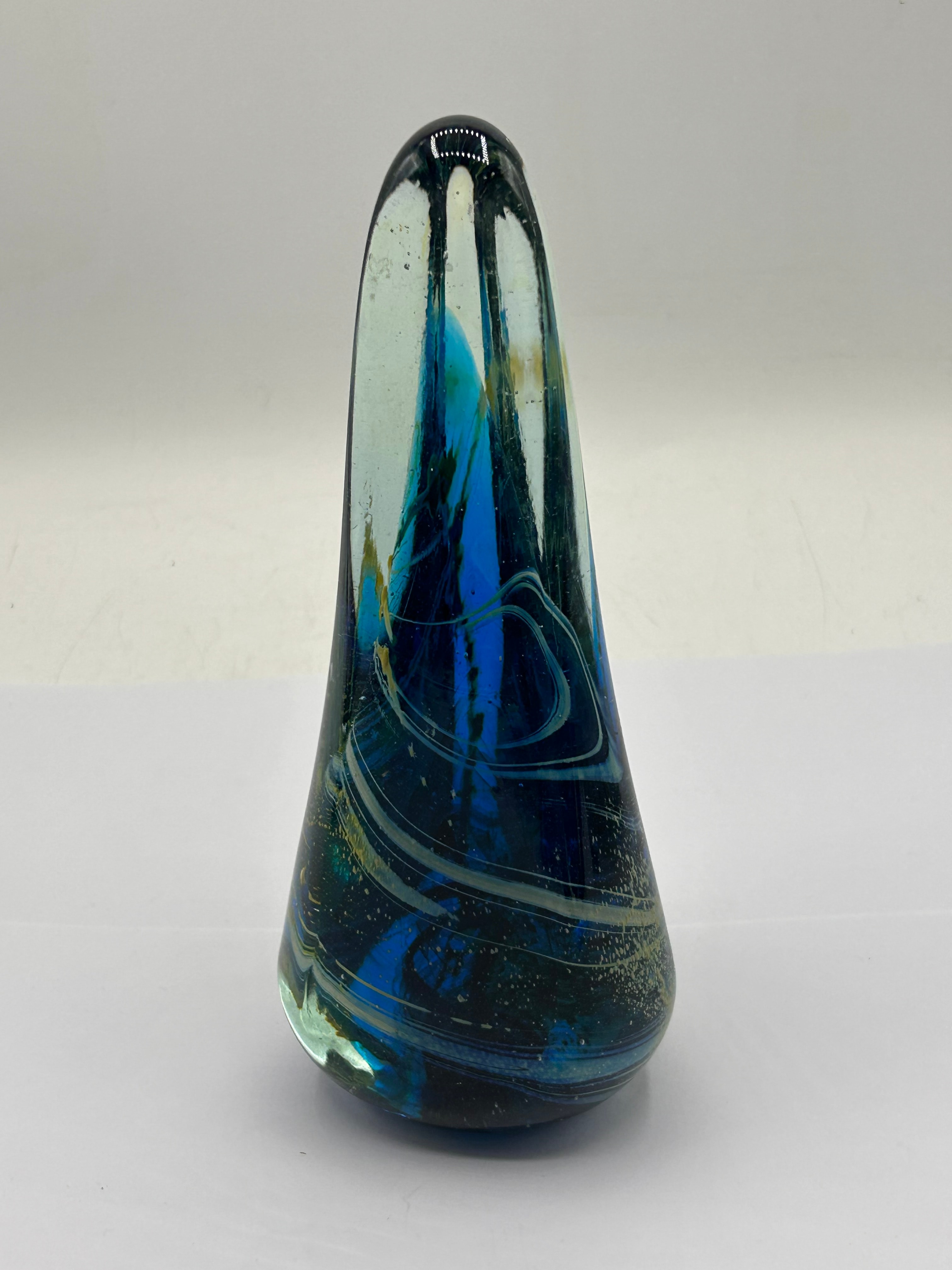 An Mdina Art Glass Obelisk from the Michael Harris Era. This free-form sculpture is crafted from clear glass encasing an intricate internal design. The piece features swirling blues, ceruleans, and blacks, accented with lighter white/gold filaments and small trapped bubbles, evoking an abstract cosmic or deep-sea motif. Its style suggests a Modern or Contemporary period. No visible text, signatures, or maker’s marks are present.