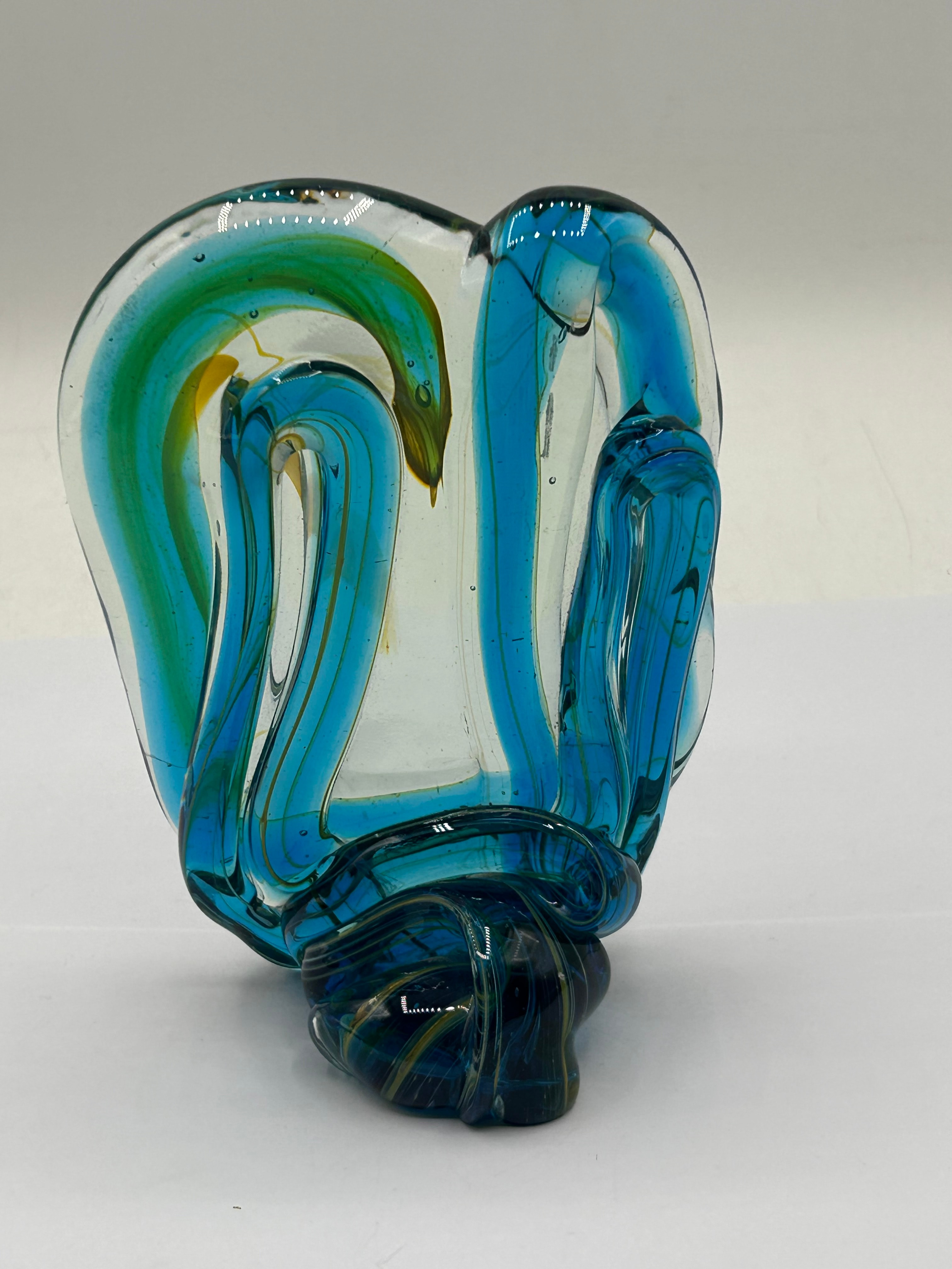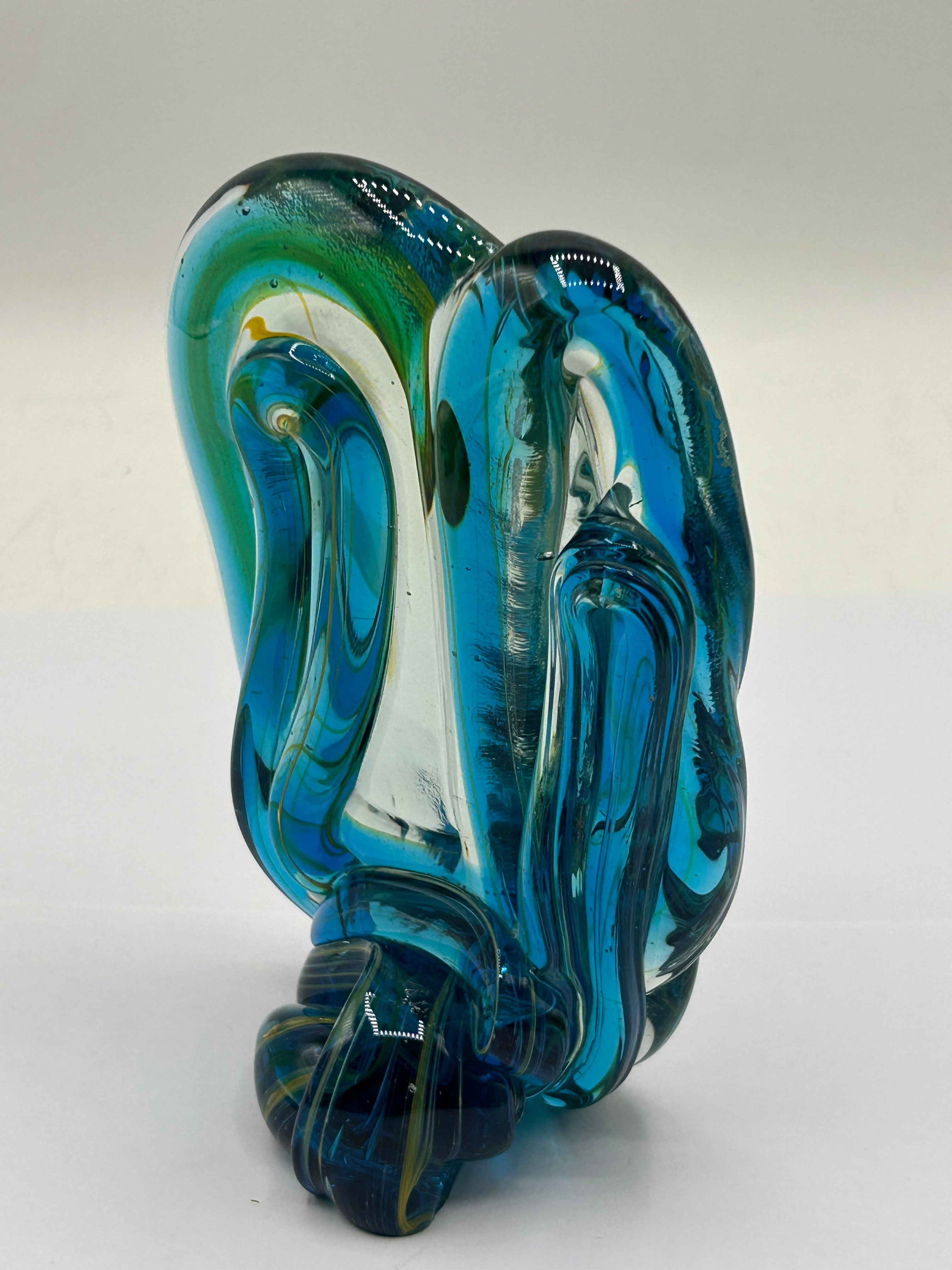 A Luxury Lane hand-blown Sommerso art glass sculpture. This abstract decorative object features an organic, fluid form with internal swirling patterns. Crafted from clear glass, it incorporates vibrant translucent blues, greens, and subtle yellow or gold tones, forming dynamic ribbons that culminate in a denser, multi-colored base. The overall aesthetic suggests a modern or contemporary period. No visible text, signatures, or maker’s marks are present.