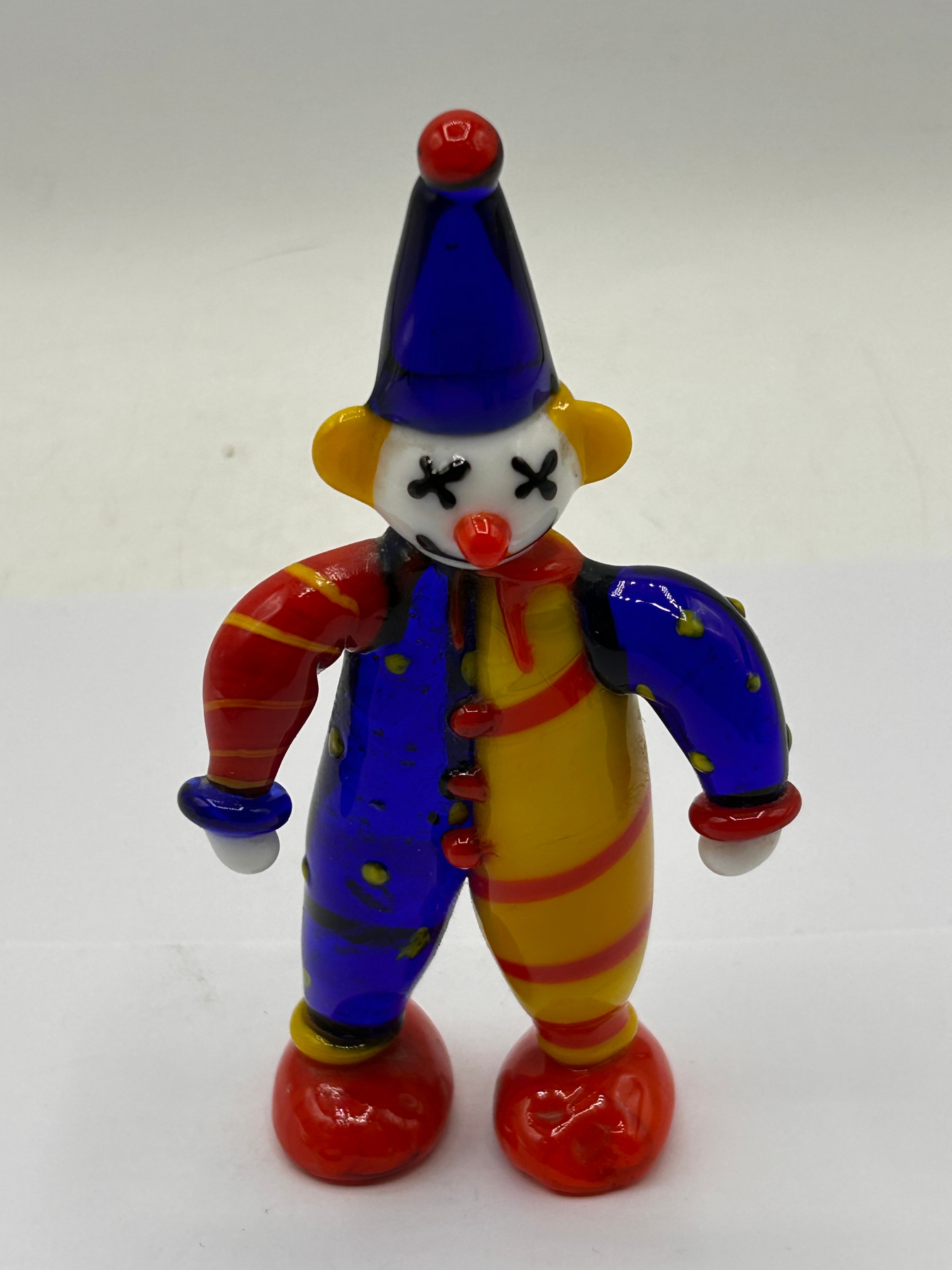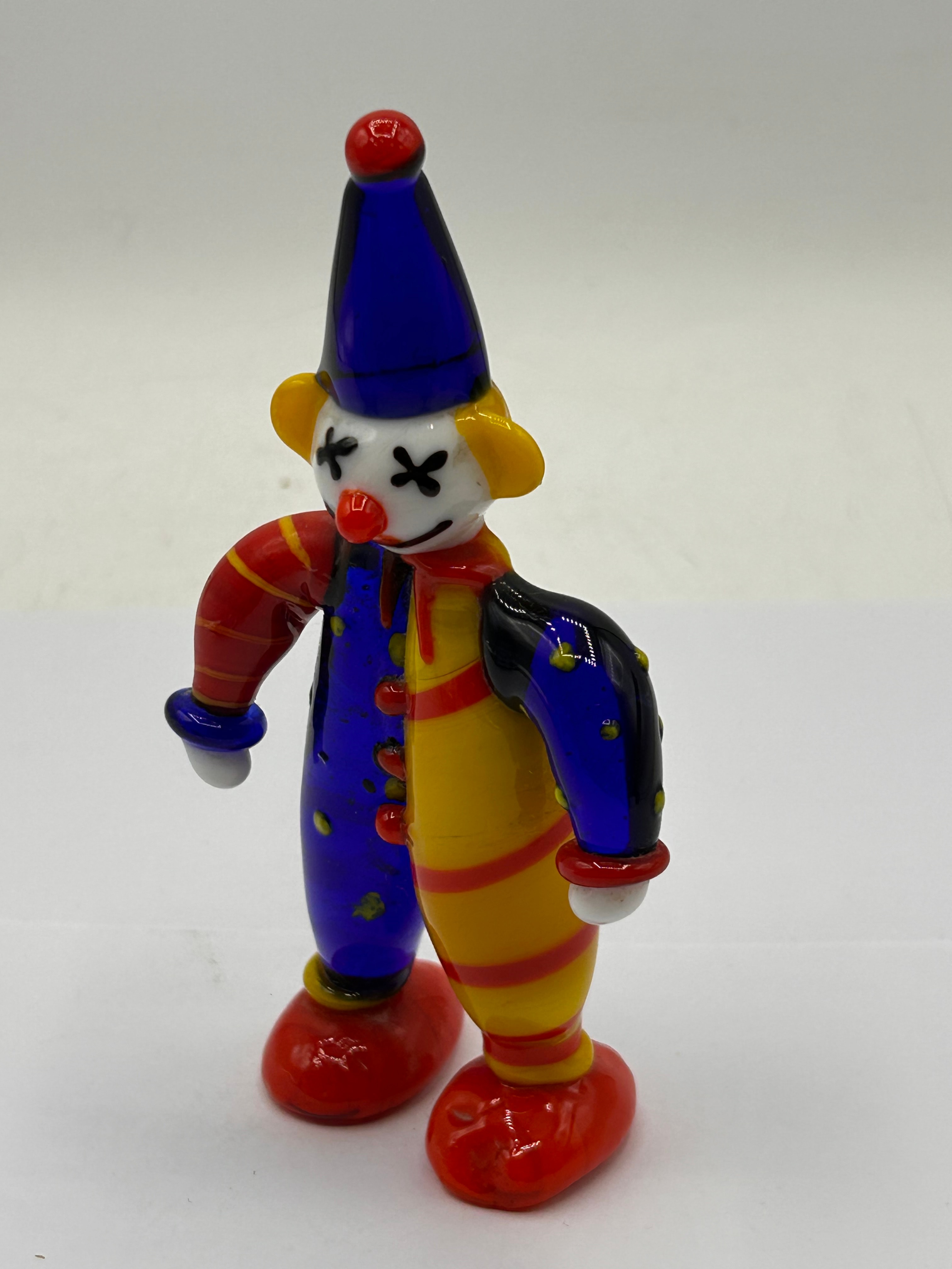 A Murano Glass clown figurine. Crafted from brightly colored blown glass, depicting a stylized clown. The figure wears a blue pointed hat with a red finial, a white face with black X-eyes and a red nose. Its body and arms are designed with contrasting colors: the viewer’s left side is vibrant blue with yellow polka dots, and the right side is yellow with red horizontal stripes, accented by red cuffs and large red shoes.