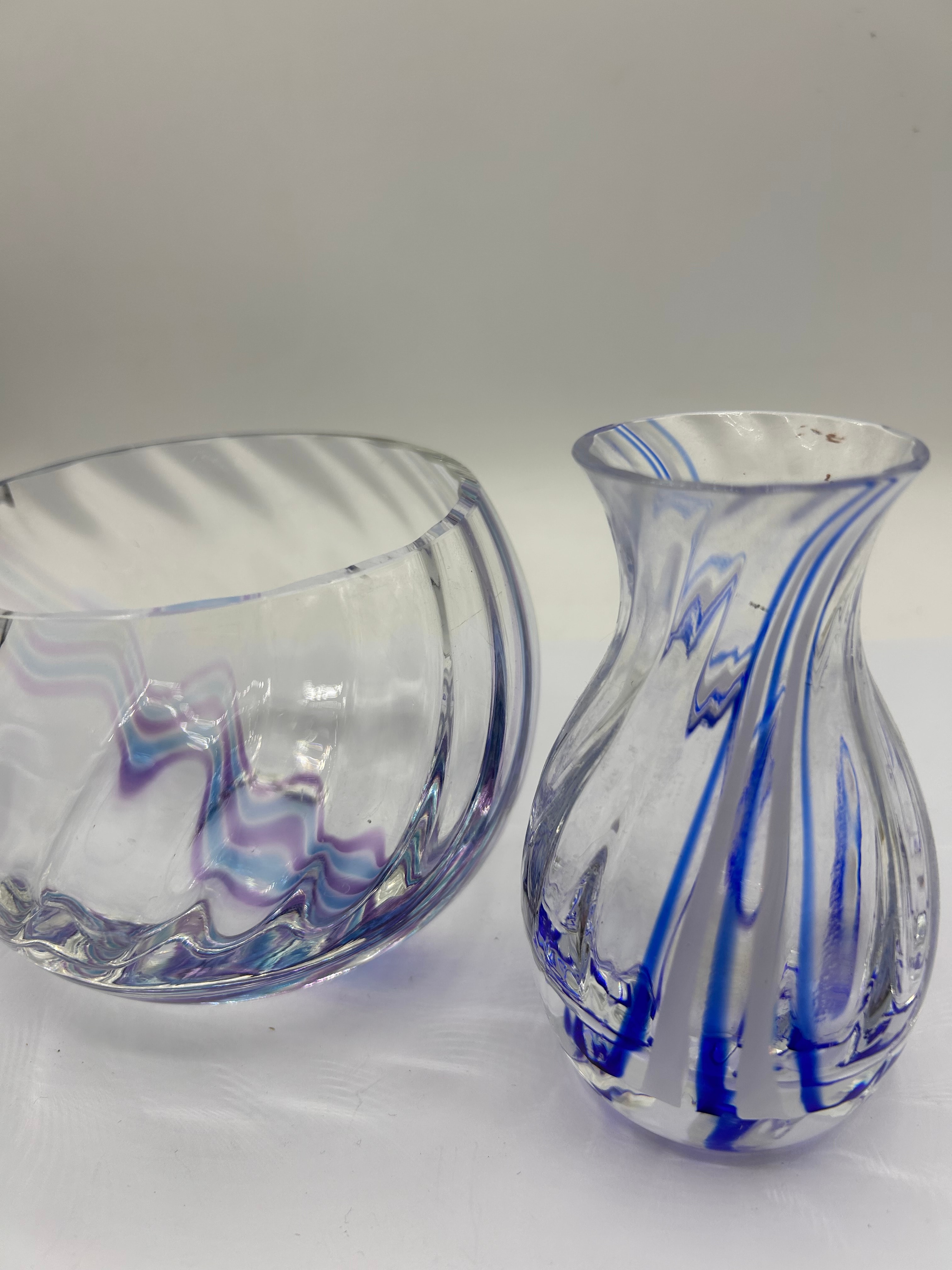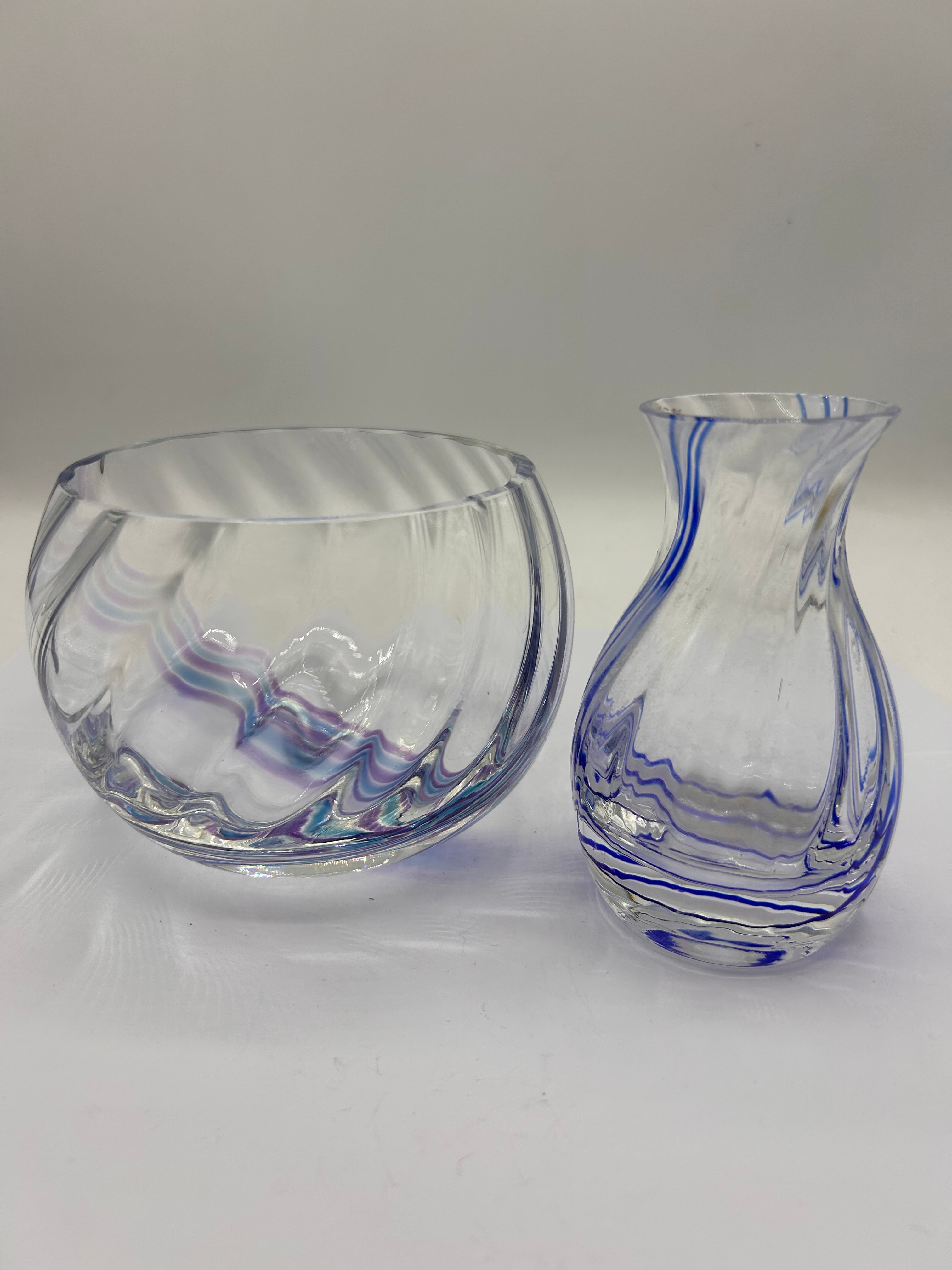 A pair of Caithness art glass vessels. Comprising a rounded bowl of clear glass with internal horizontal waves in shades of purple, light blue, and teal, consistent with the ‘Flamenco’ pattern. The smaller vase features a flared rim and bulbous body, adorned with prominent internal vertical swirls in vivid royal blue and white. Both items are crafted from clear glass and exhibit a modern or contemporary style.