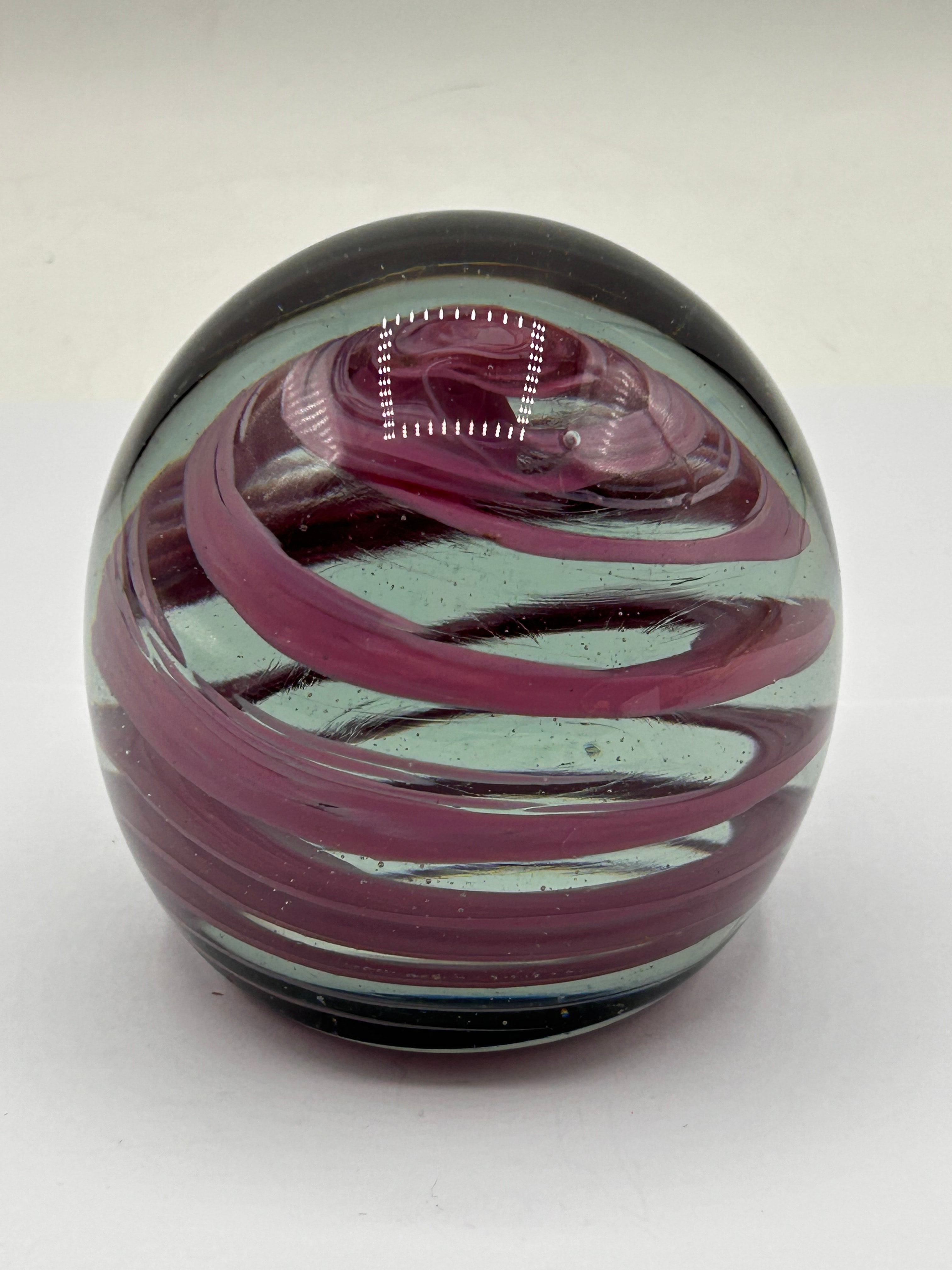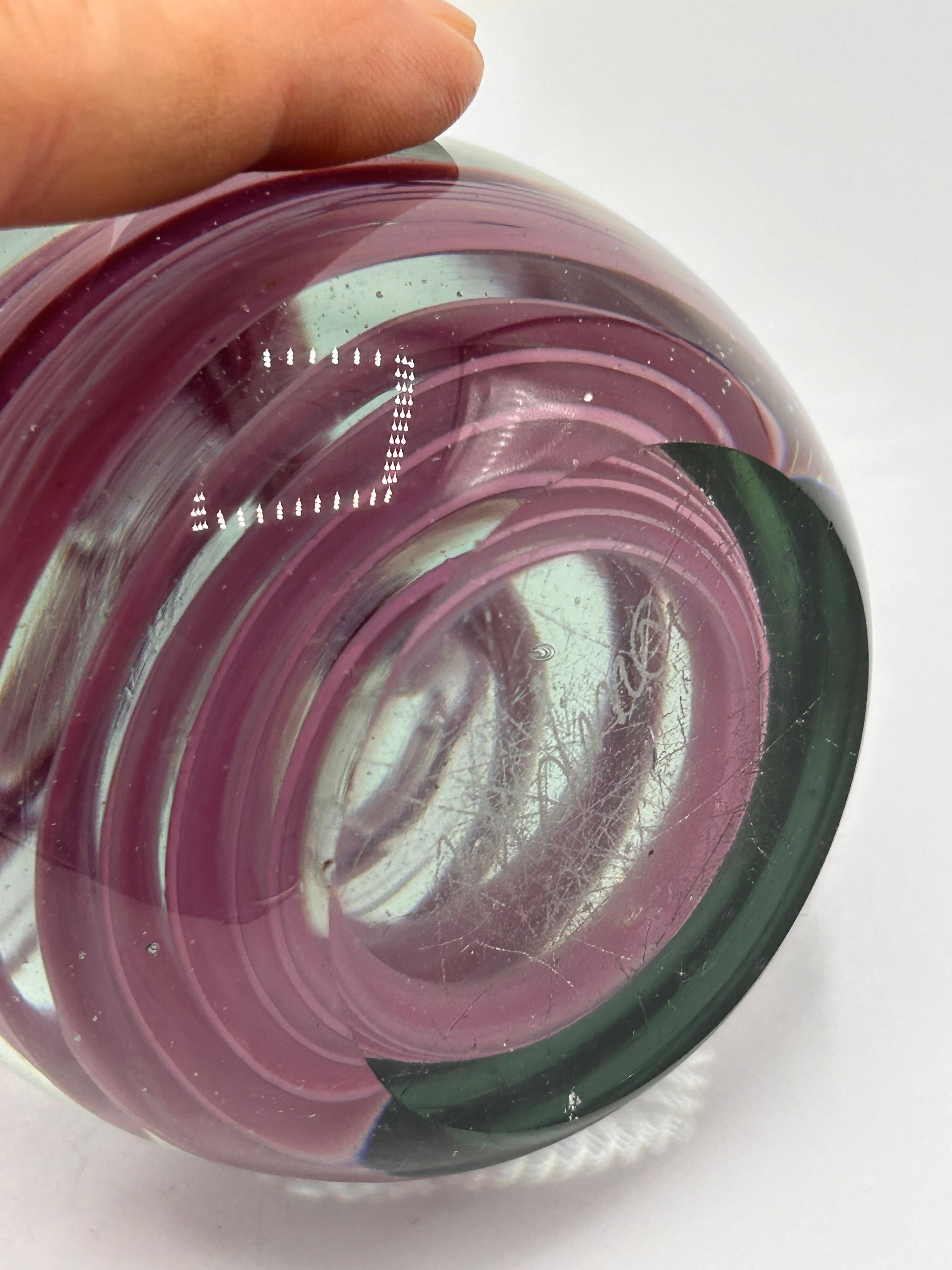 A Mdina iridescent swirl art glass paperweight. This spherical glass paperweight features an internal spiraling design of opaque magenta glass ribbons encased within a clear or very pale aqua transparent glass body. It rests on a solid, darker glass base, which appears dark green or black. The base exhibits an etched signature or marking, partially legible, consistent with the artist’s signed works.