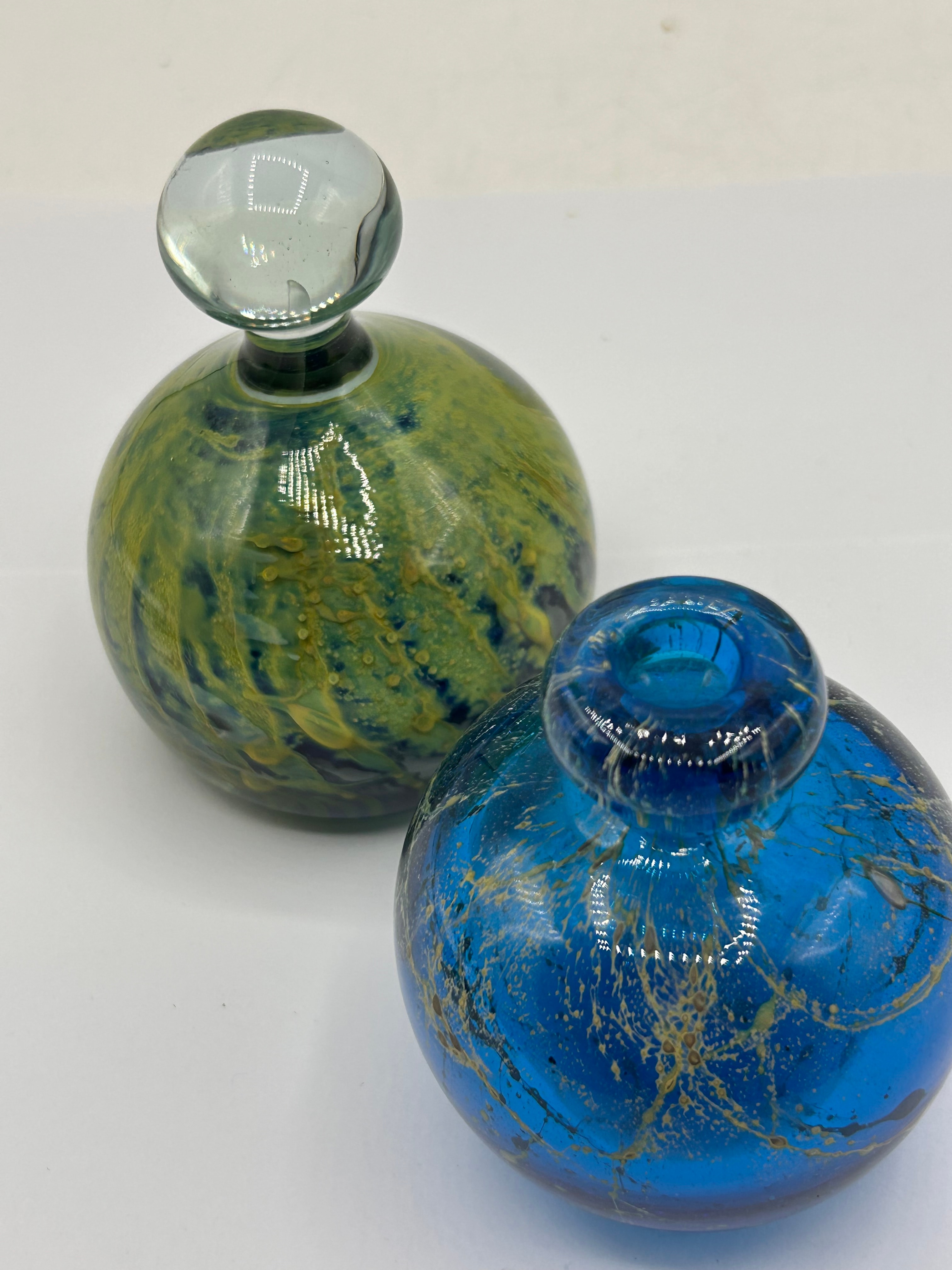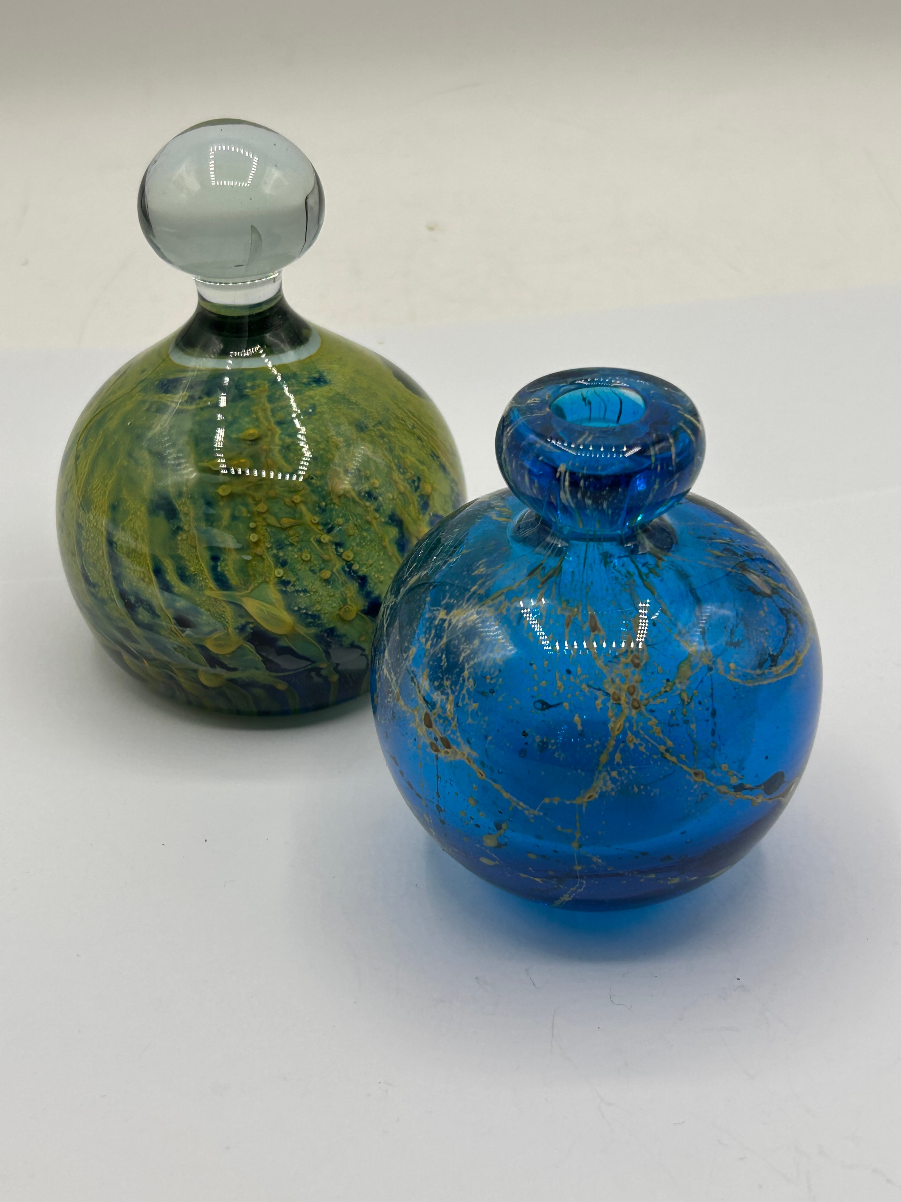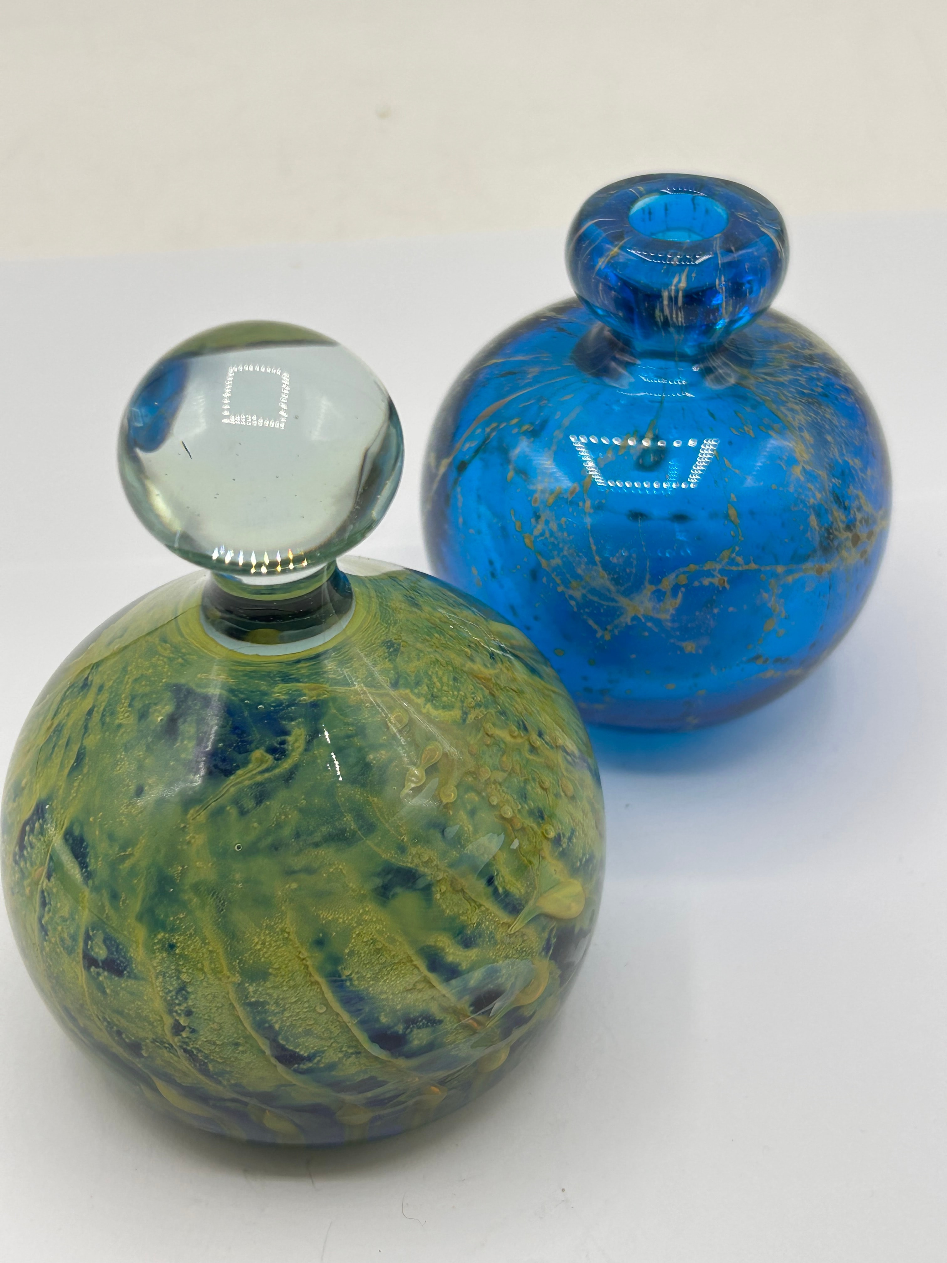 A pair of Mdina Glass art glass vessels from Malta. The taller item is a globular bottle of mottled green, yellow, and dark blue glass, with an integrated stopper featuring a clear, mushroom-shaped glass finial. The second item is a globular bottle of vibrant blue glass, adorned with irregular gold-toned speckles, and has an open, rolled rim. Both pieces appear to be hand-blown.