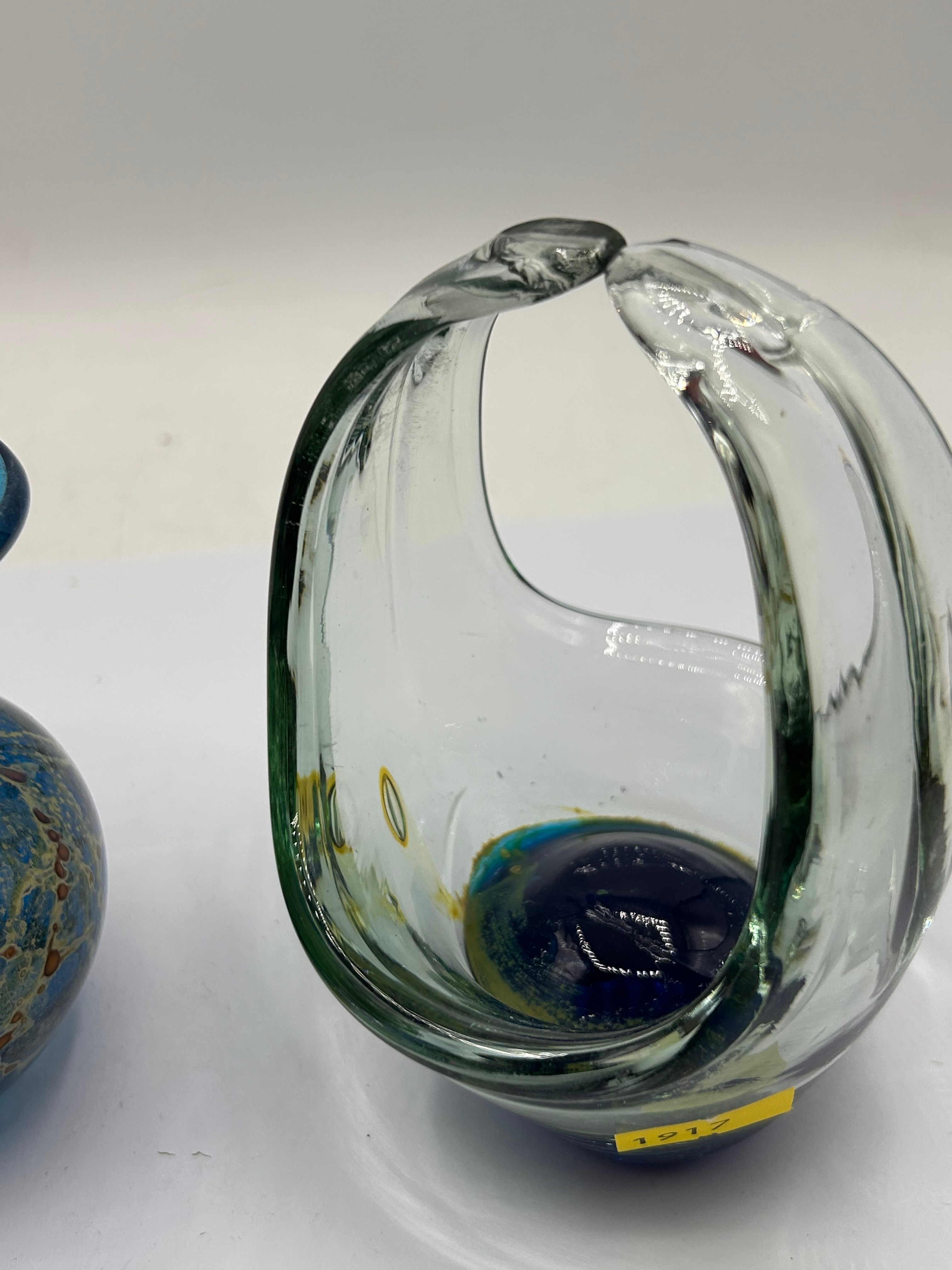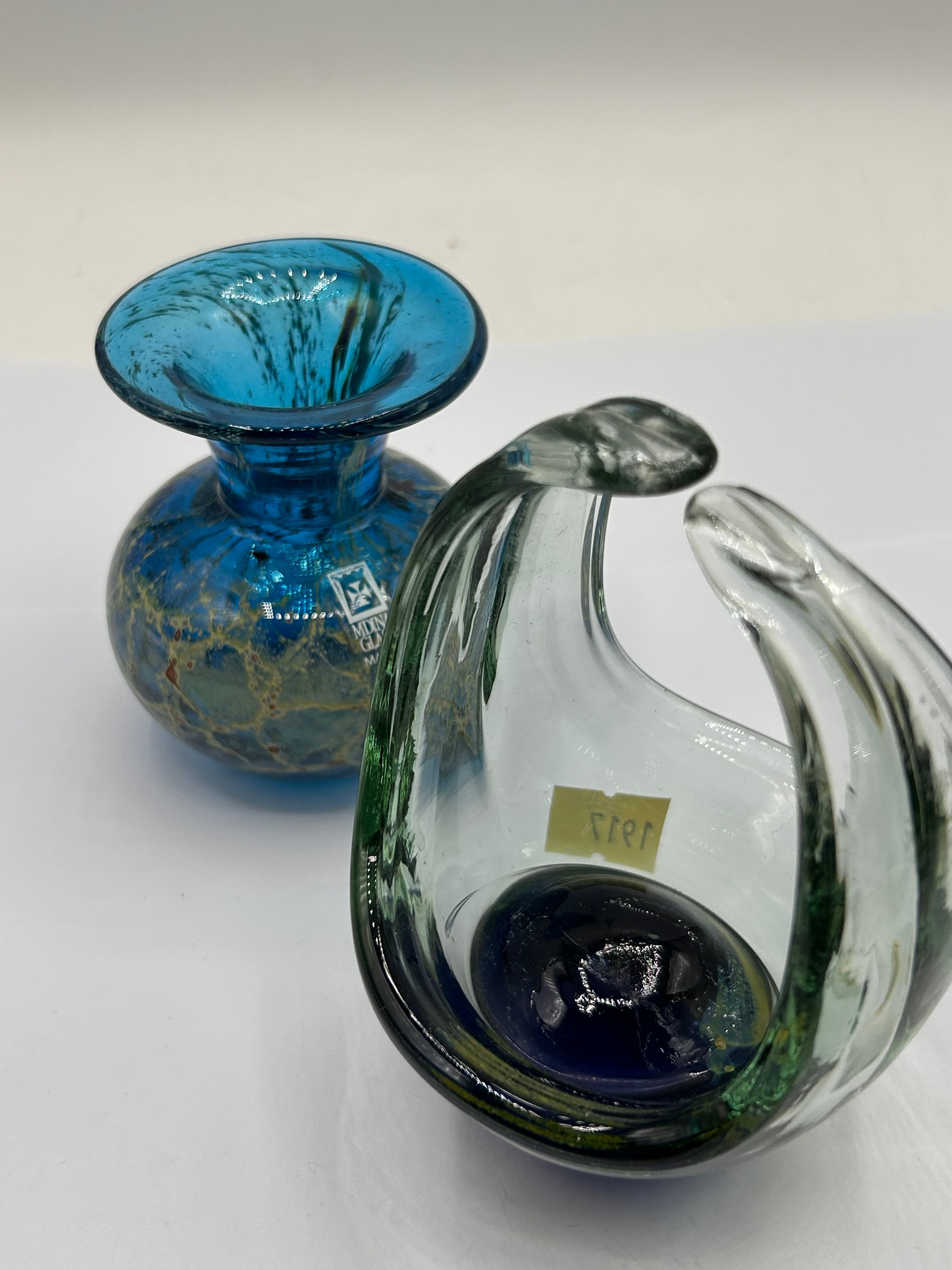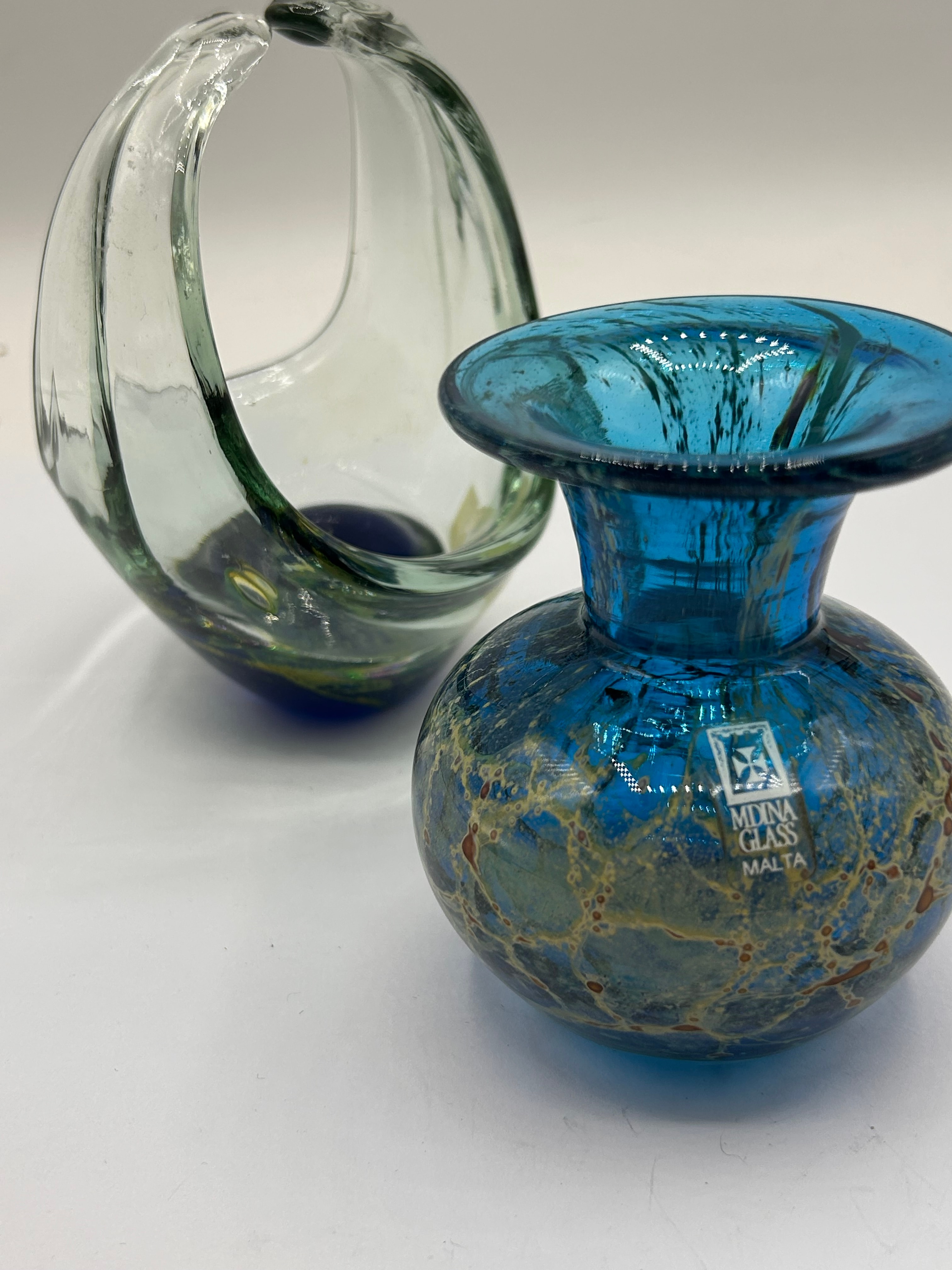 A Mdina Glass ‘Blue Crizzle’ vase, designed by Eric Dobson, of squat, globular form with a flared rim, crafted from vibrant blue blown glass featuring an abstract, mottled pattern in shades of blue, green, and ochre. It bears a white sticker on its side marked with a distinctive cross-like logo and the text ‘MDINA GLASS MALTA’, identifying the maker and origin. The second item is a clear to light green-tinted art glass basket-form object with a thick, rounded handle, featuring an internal dark blue and yellow swirl at its base. A yellow rectangular sticker with an inventory number, possibly ‘583T’ (reversed in some views), is affixed to its base.
