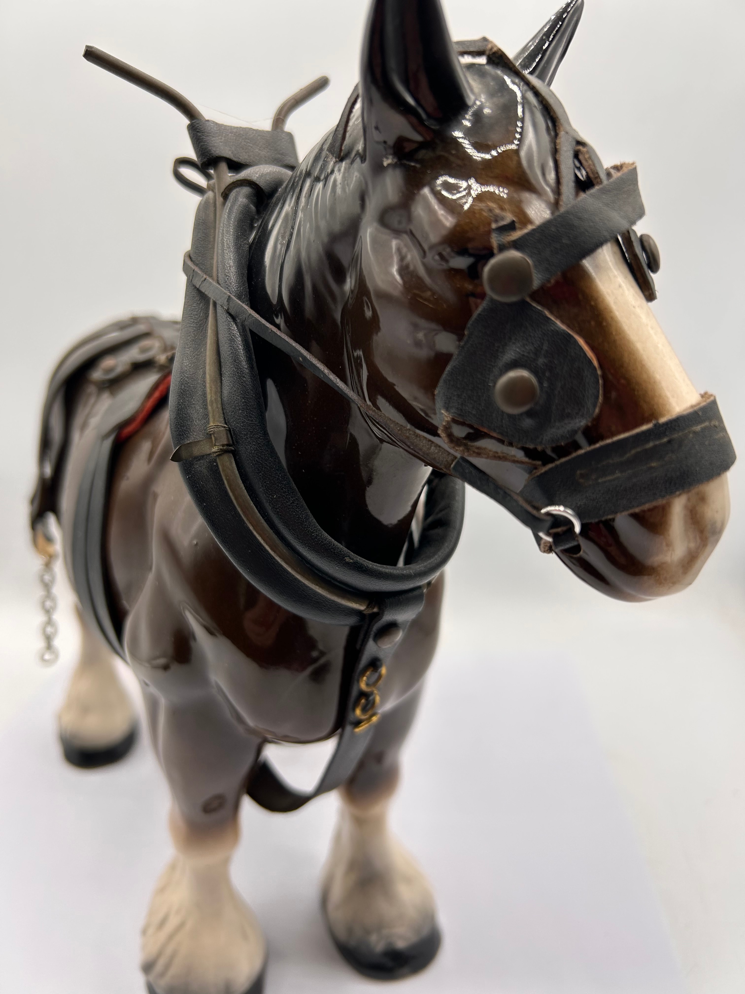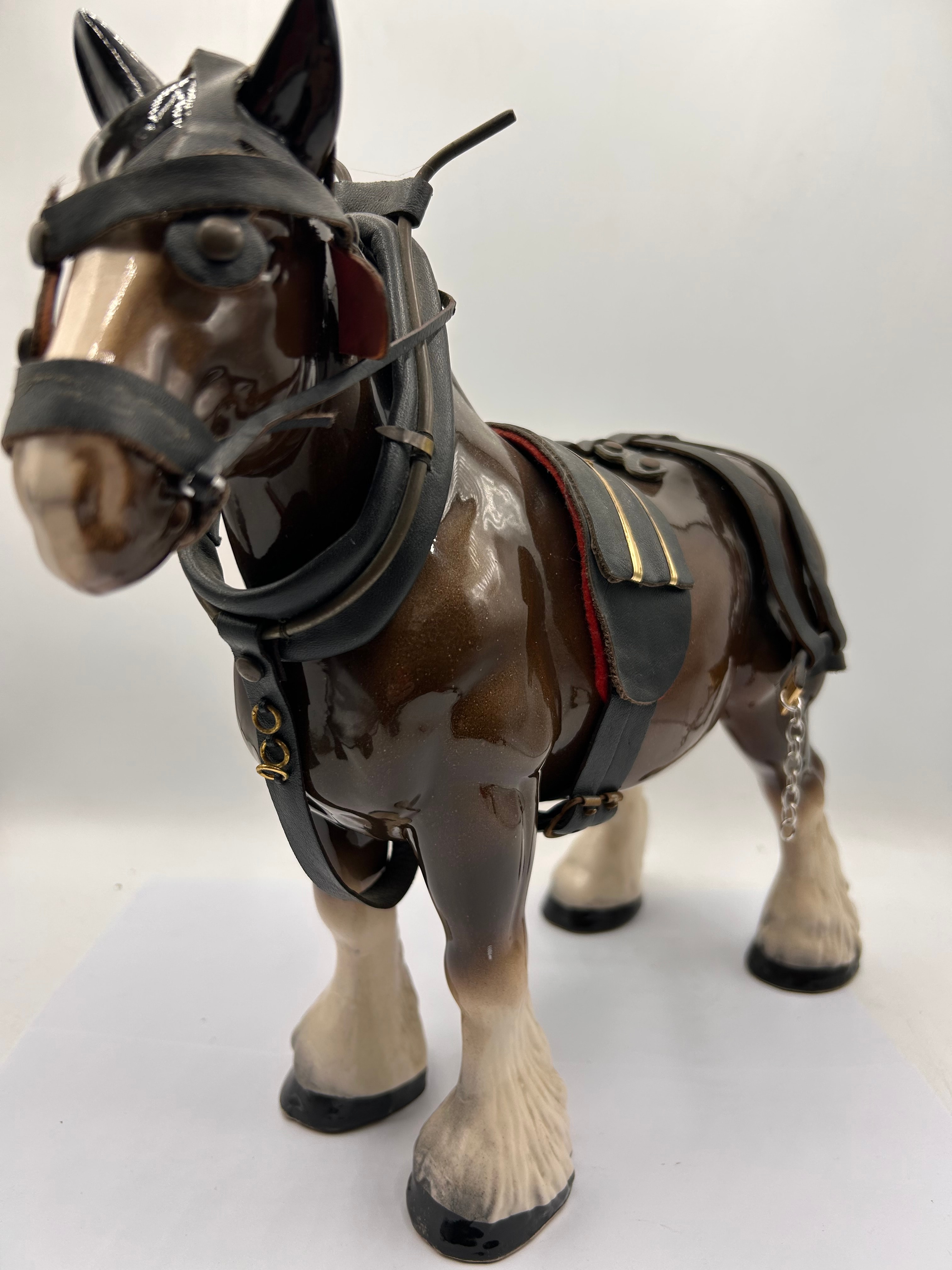 A Melba Ware Shire Horse figurine. This glazed ceramic or porcelain figurine depicts a realistic draft horse with a glossy brown body, cream-colored muzzle, and feathered lower legs. It is adorned with an elaborate, fitted black leather or faux leather harness detailed with gold-tone hardware, red accents, and chains.