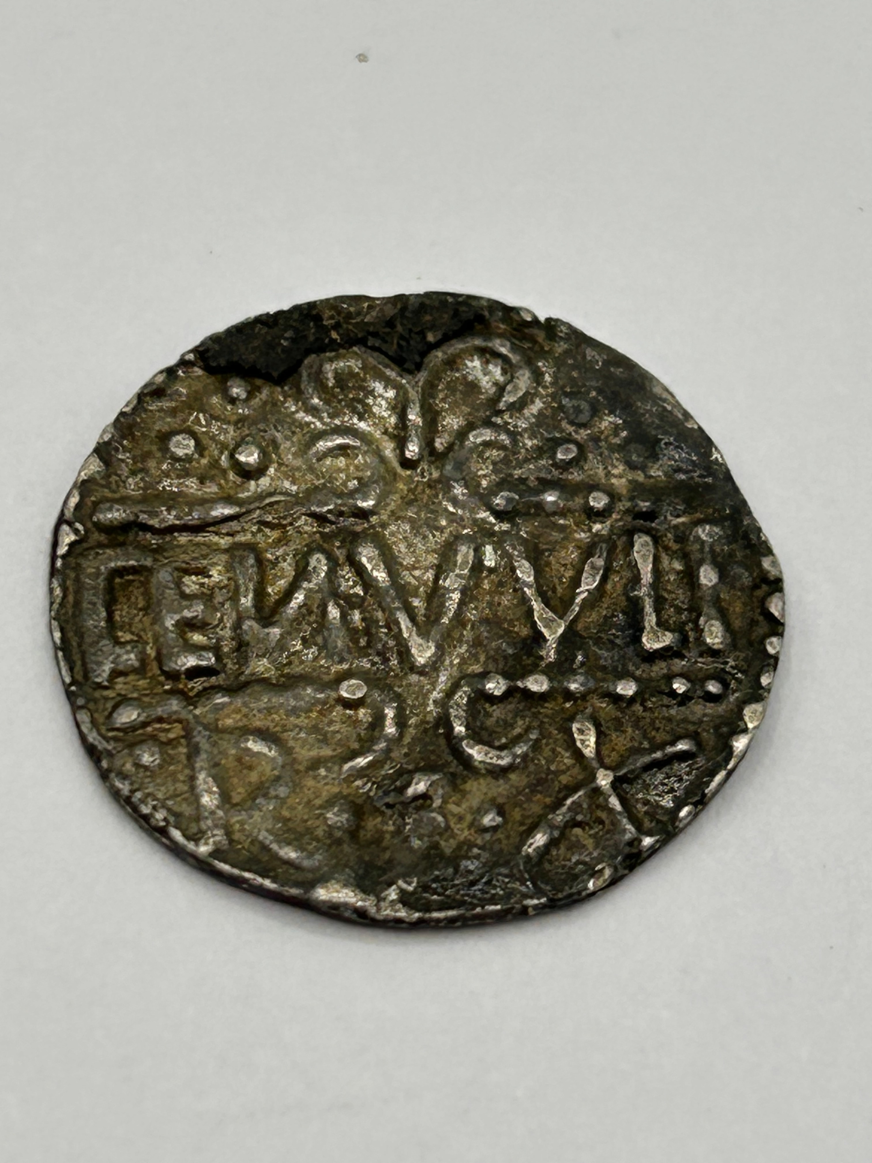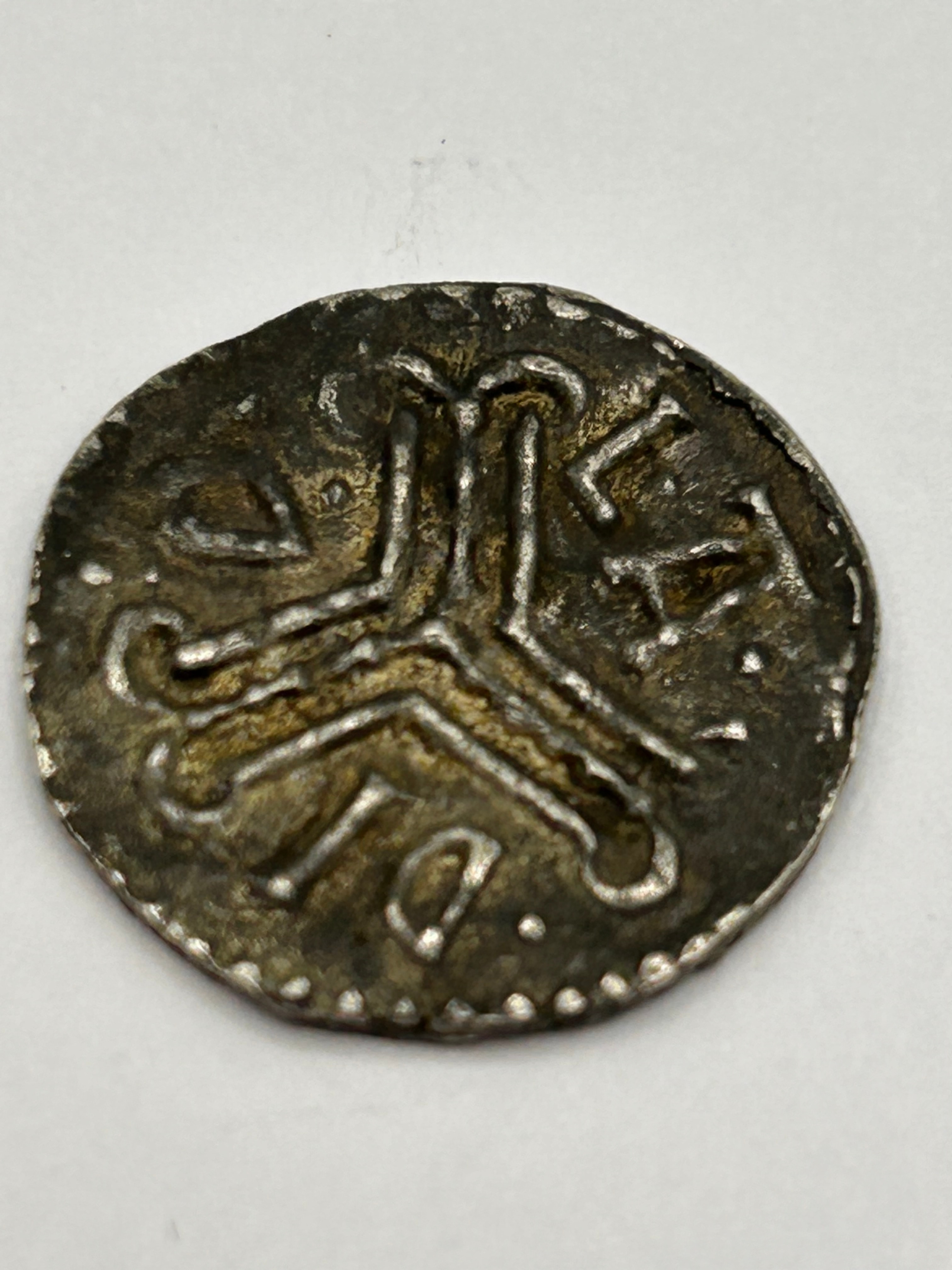 This circular metallic object, likely composed of silver or a silver alloy, is identified as an ancient or medieval coin. It exhibits an irregular flan and a relatively crude strike. The obverse prominently displays the visible inscription ‘ПЄТVИИ’ (phonetically resembling PETVNN or PETUNI), intermingled with additional indistinct characters, decorative dots, and abstract elements. The reverse features a central stylized three-legged or triskelion-like motif, encircled by a border of dots and minor, largely illegible characters. Web intelligence suggests a possible attribution to a medieval Balkan state such as the Principality of Zeta.
