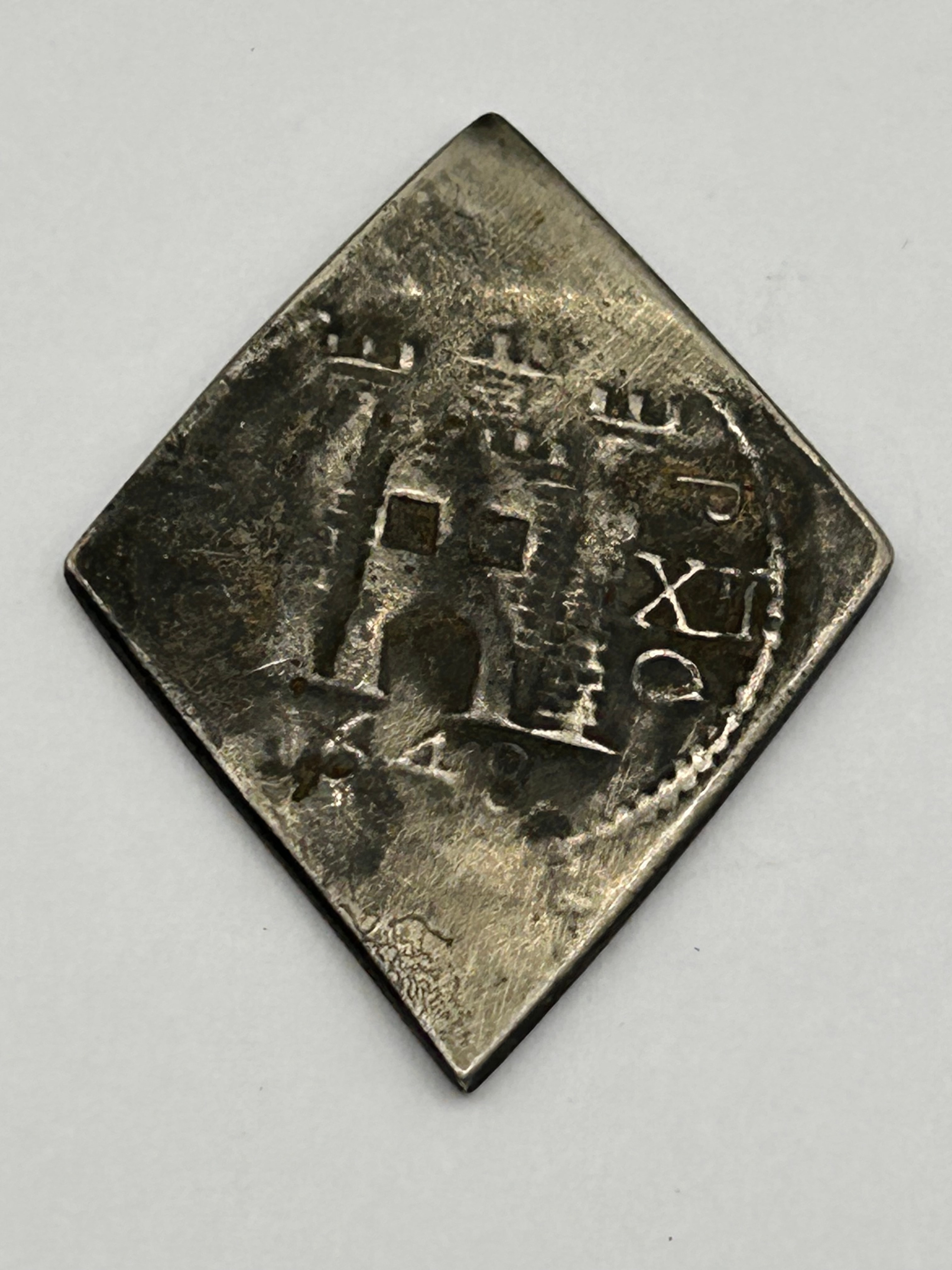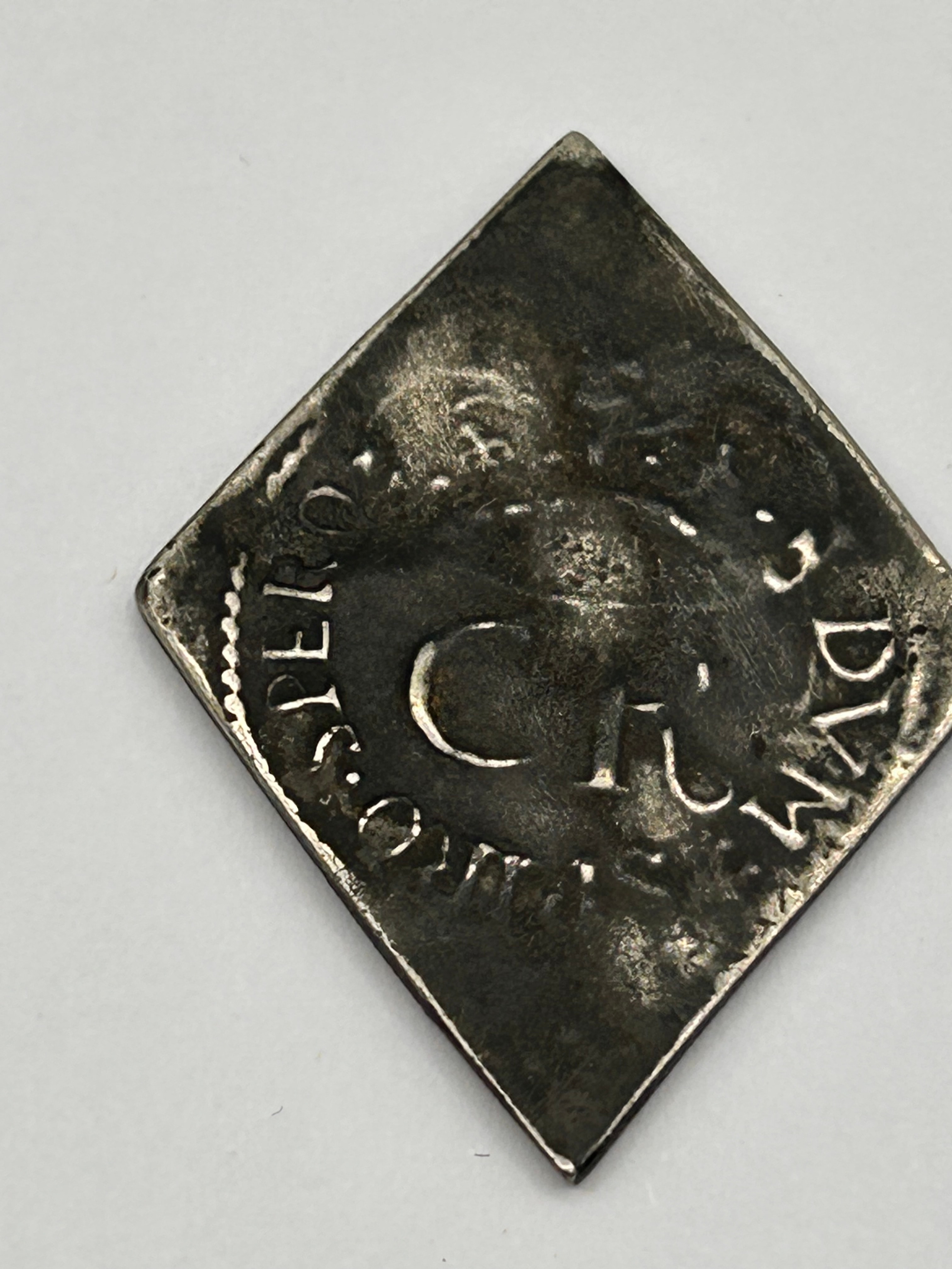 A Charles I Pontefract Besieged Silver Shilling, dated 1648, fashioned from silver-toned metal in a diamond-shaped (lozenge) planchet. The obverse features a stylized three-towered castle design, with the Roman numerals “XII” visible to the right and Arabic numerals “40” below; other faint, illegible characters are also present. The reverse displays a large, ornate “C” with a smaller “R” adjacent or within it, surrounded by partial Latin-script lettering along the rim, notably “P.TER.O” and “DVM”.