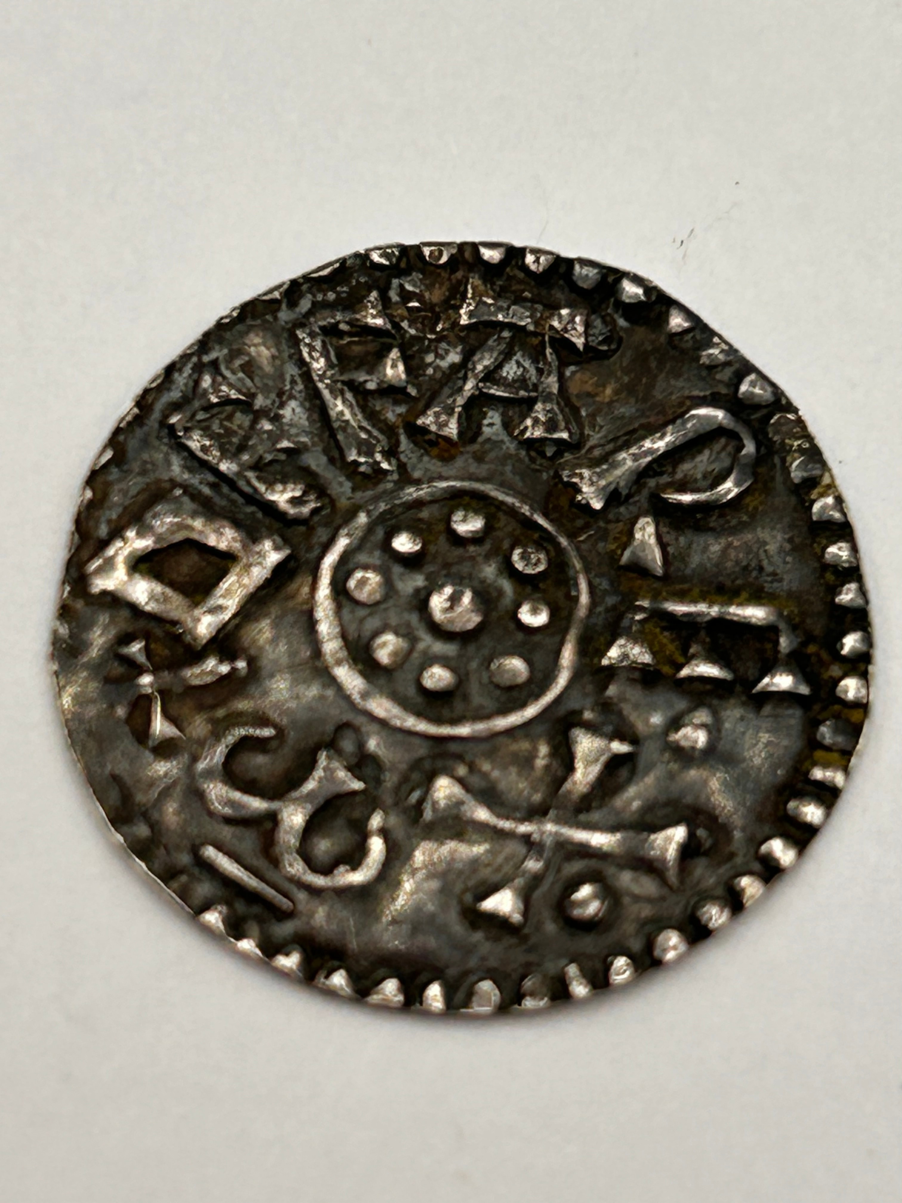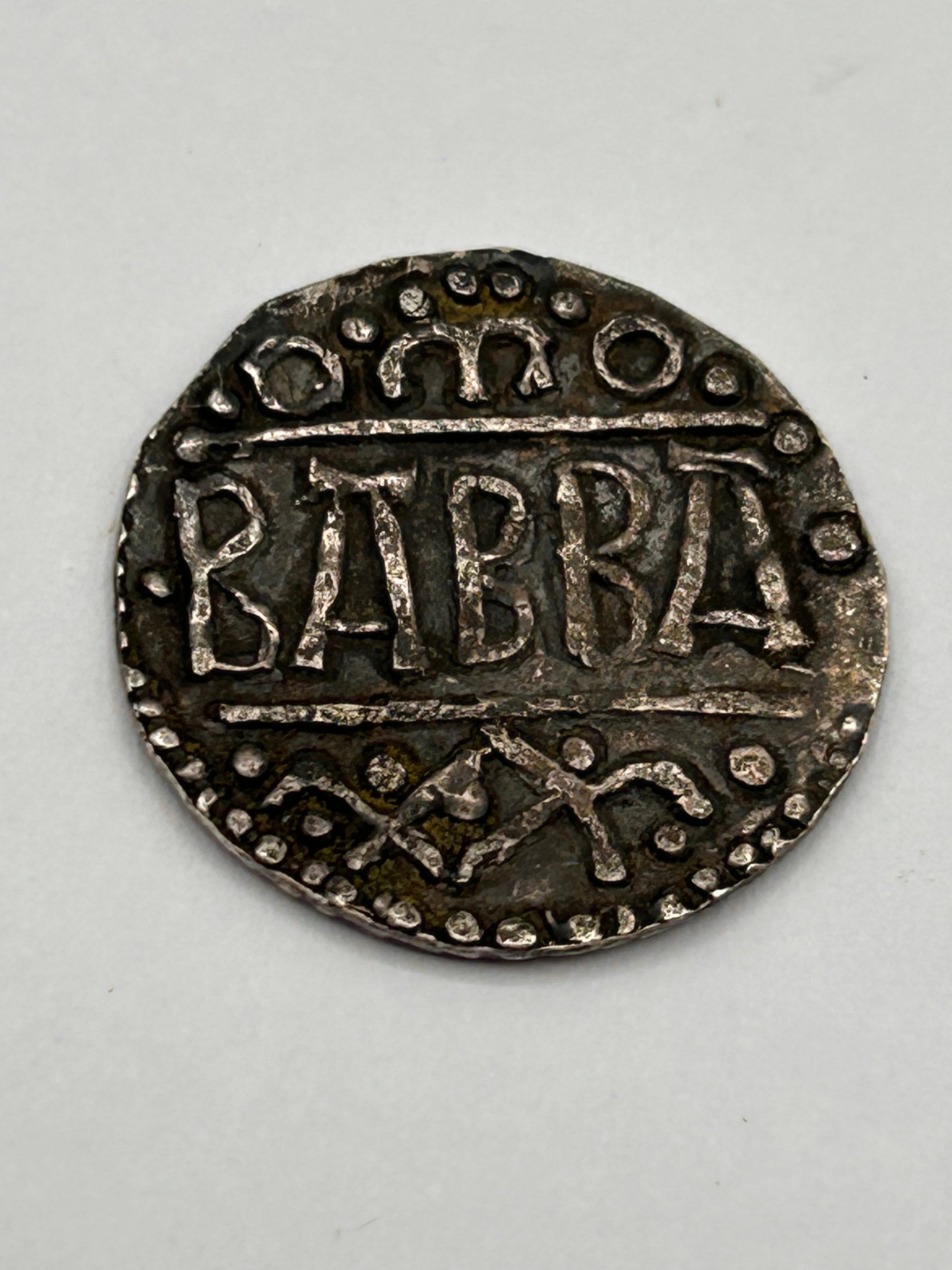 An Anglo-Saxon AR Penny, identified as heavy coinage from the Kingdom of Mercia, issued under King Offa (757-796). This coin was struck at the Canterbury mint by the moneyer Babba, circa 792/3-796. The irregularly shaped, roughly circular coin is composed of silver or a silver alloy. The obverse prominently features the text “RABBA” in capital letters horizontally across its center, flanked above and below by stylized linear decorations and bordered by a dotted rim. The reverse displays a central circular motif composed of raised dots, surrounded by various abstract or geometric symbols, and similarly encircled by a dotted rim.