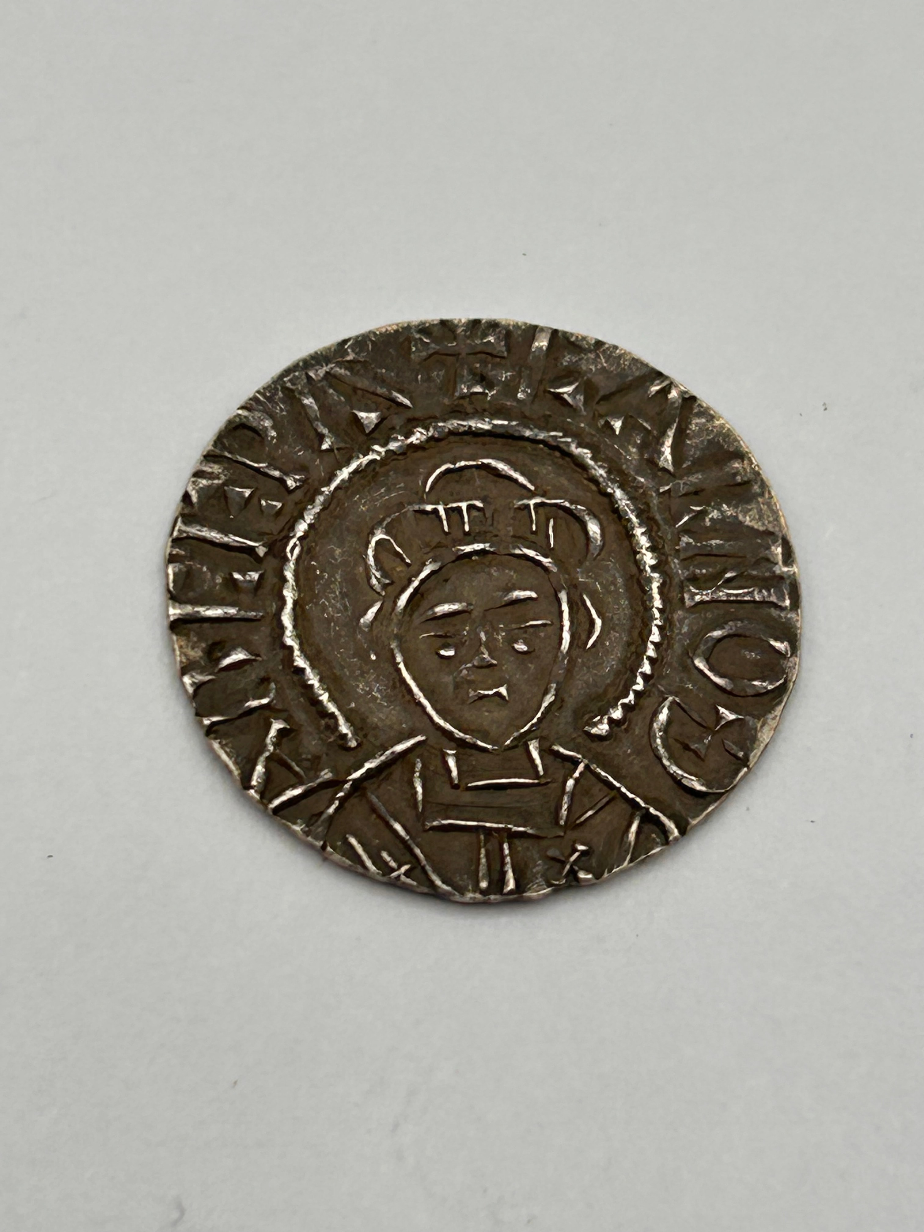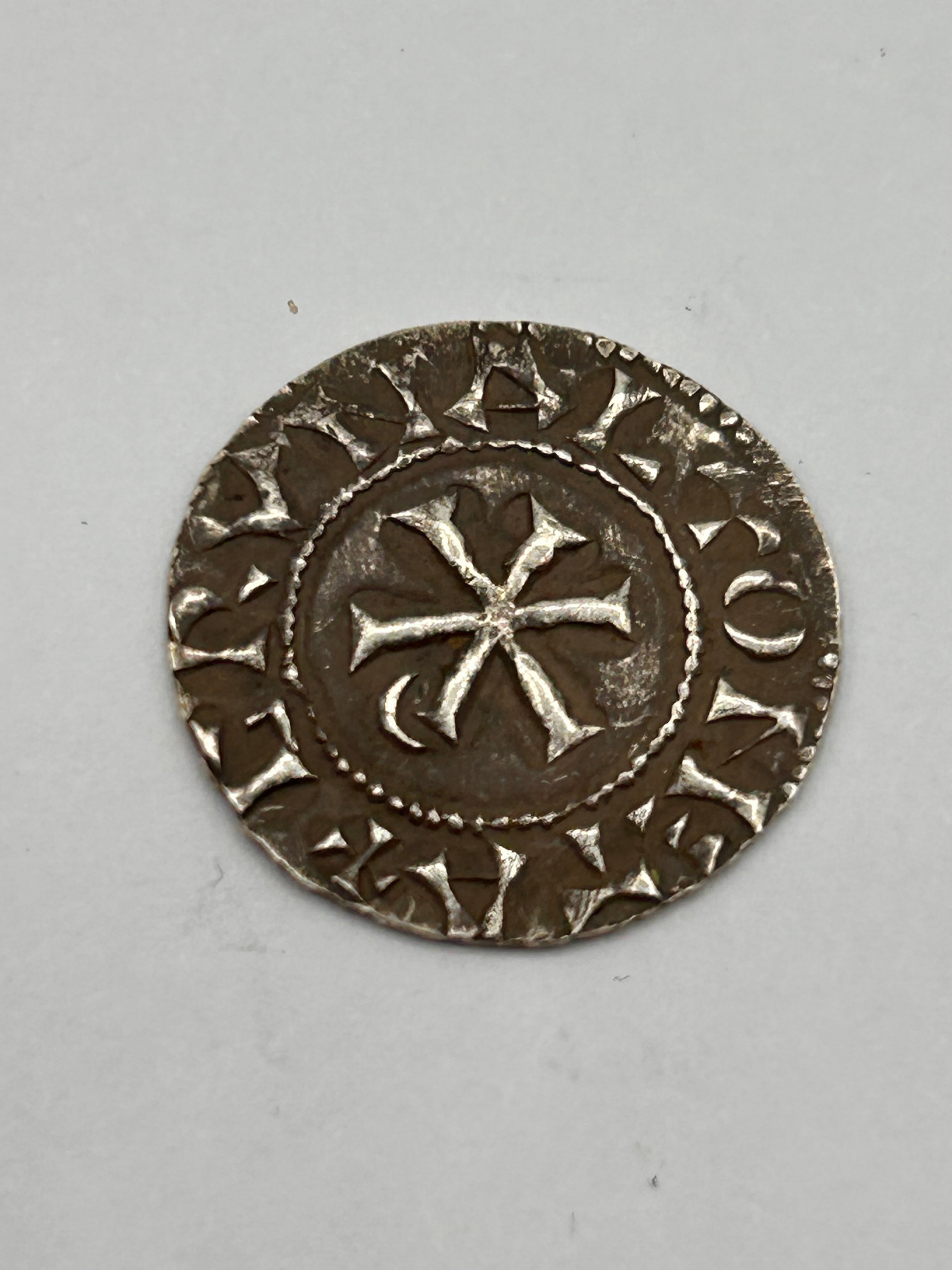 A Carolingian Denier of Charles, Emperor. This hammered silver-colored coin features on its obverse a stylized, front-facing bust wearing a crown or headgear and robes, encircled by a beaded inner border. The legible Latin inscription reads “KAROLVS IMP AVG” (Charles, Emperor, Augustus). The reverse displays a central cross-like design, possibly a cross potent or monogram, with curved terminals, also within a beaded inner circle and an outer, less distinct legend. The style and imagery are consistent with medieval European coinage.