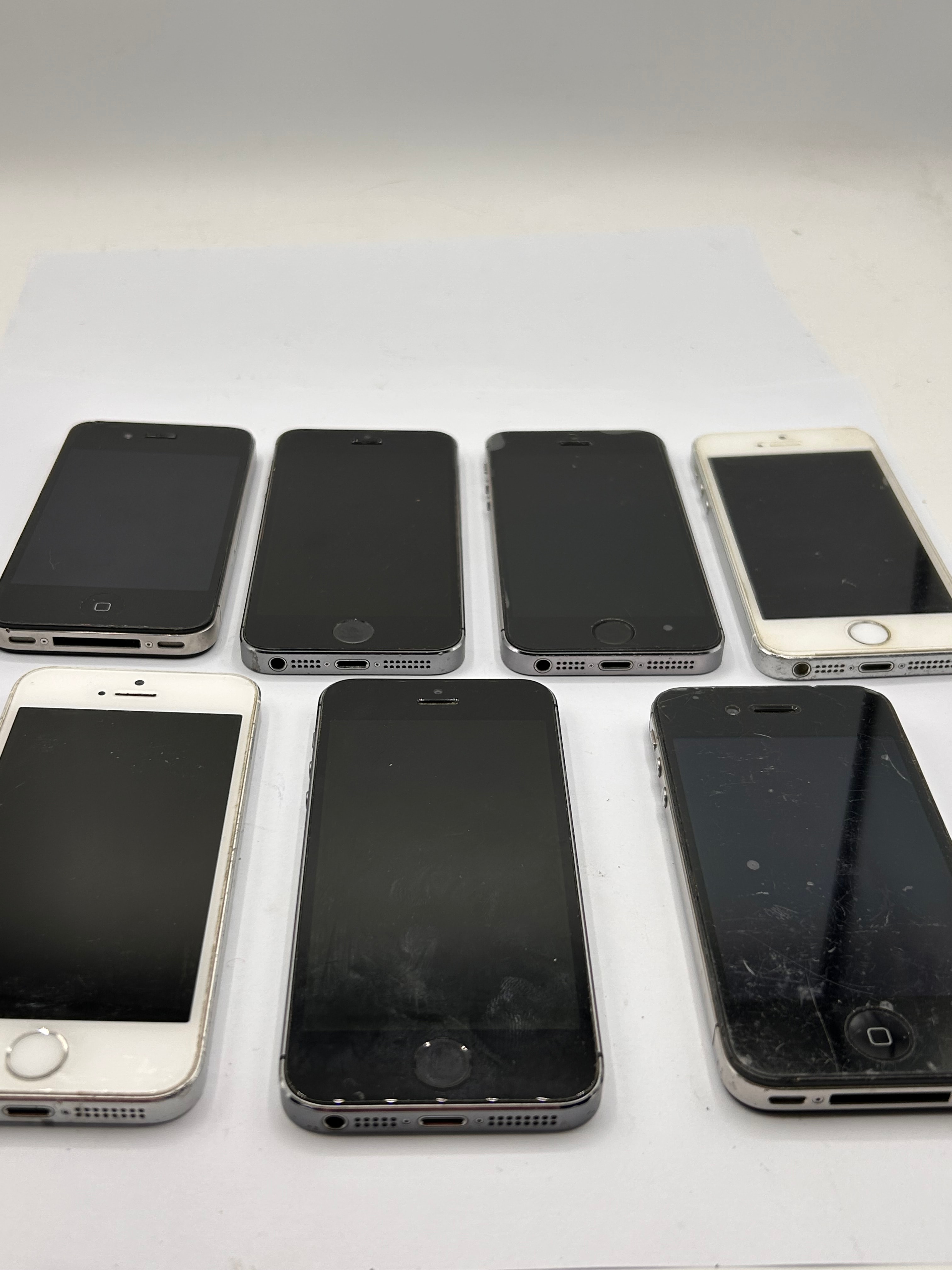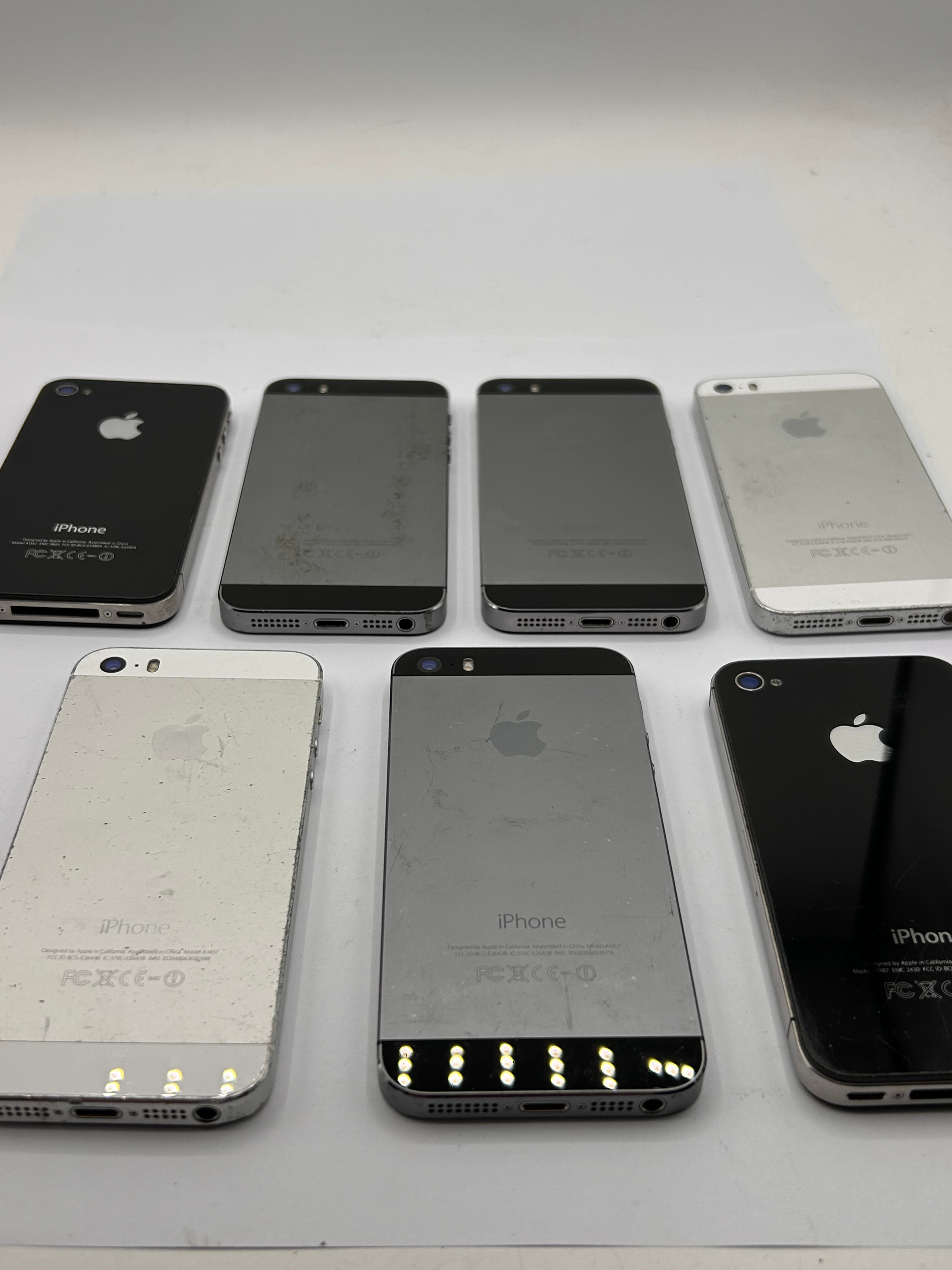 A lot of seven Apple iPhones, primarily identified as iPhone 5S models, with other units appearing to be a mix of iPhone 4/4S and iPhone 5/5S/SE (1st Gen) models. These smartphones feature physical home buttons and characteristic port configurations. The lot includes units in both black and white/silver color schemes, constructed from glass and aluminum/stainless steel. Visible markings include the Apple logo, “iPhone” branding, and regulatory text such as “Designed by Apple in California Assembled in China” and “FC CE-0700”.