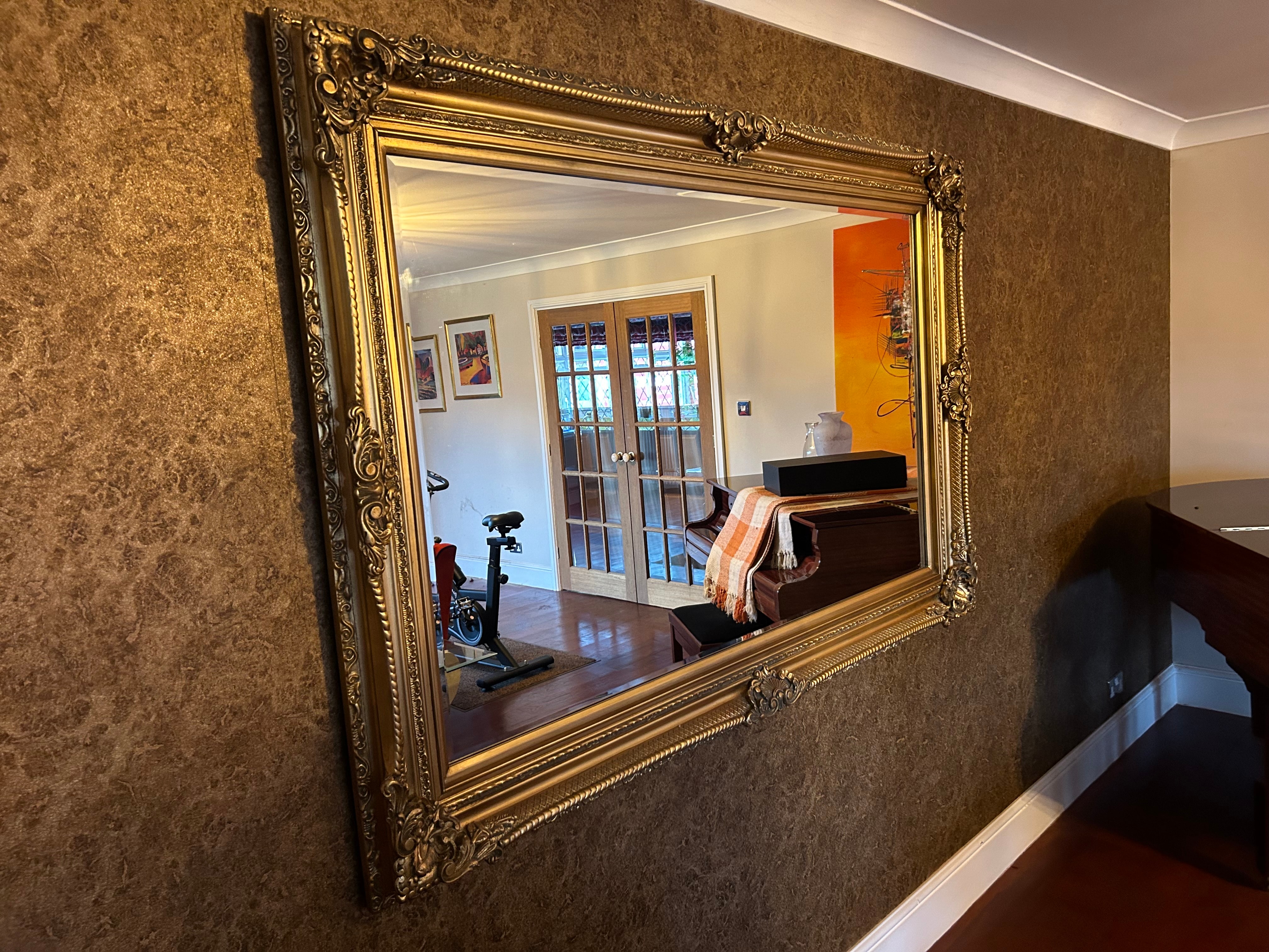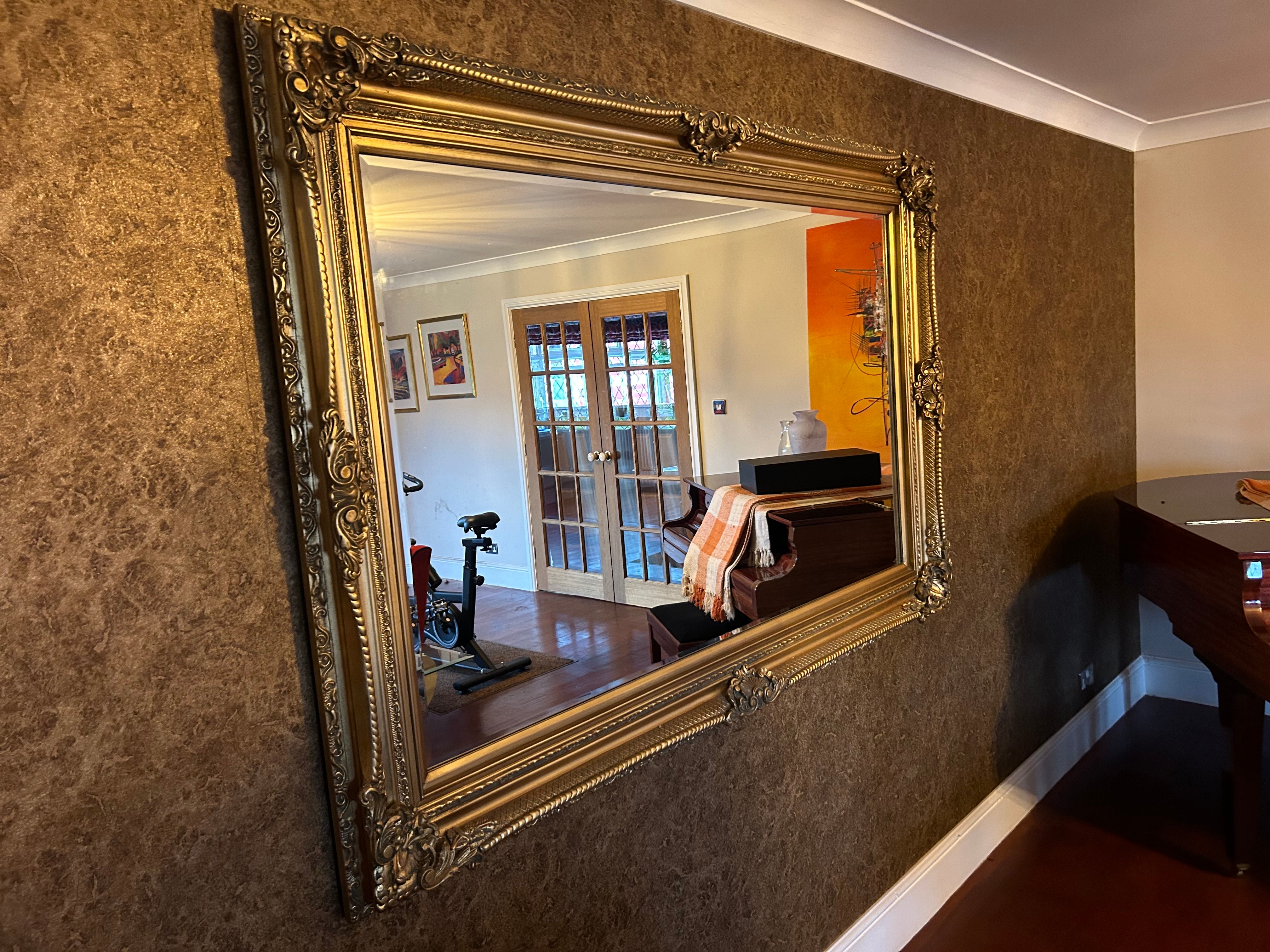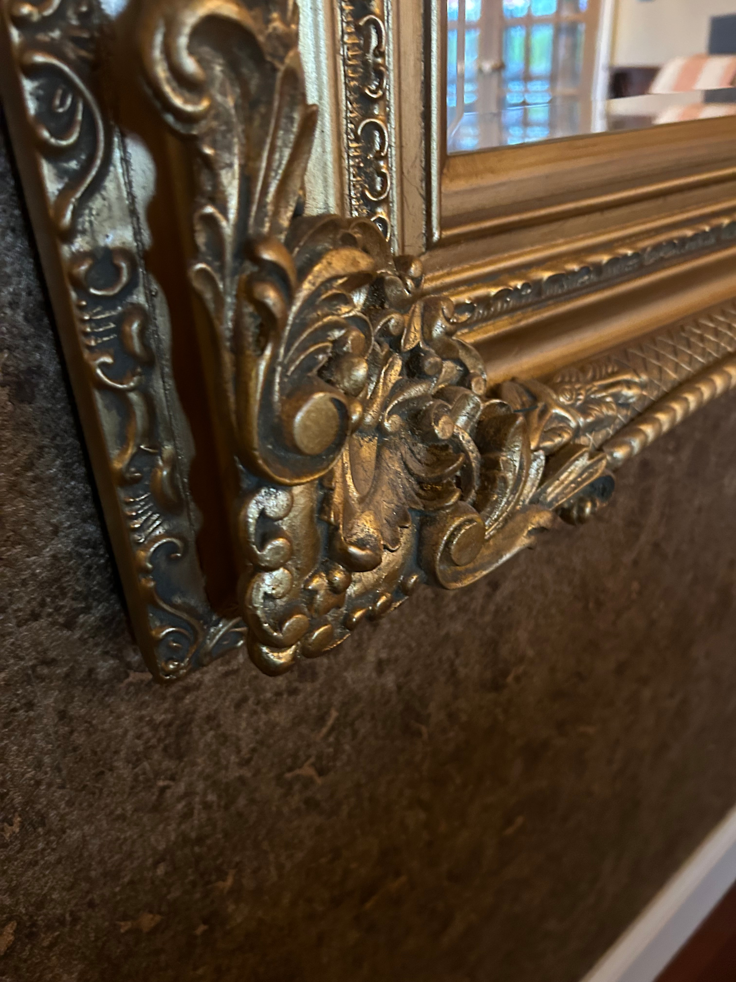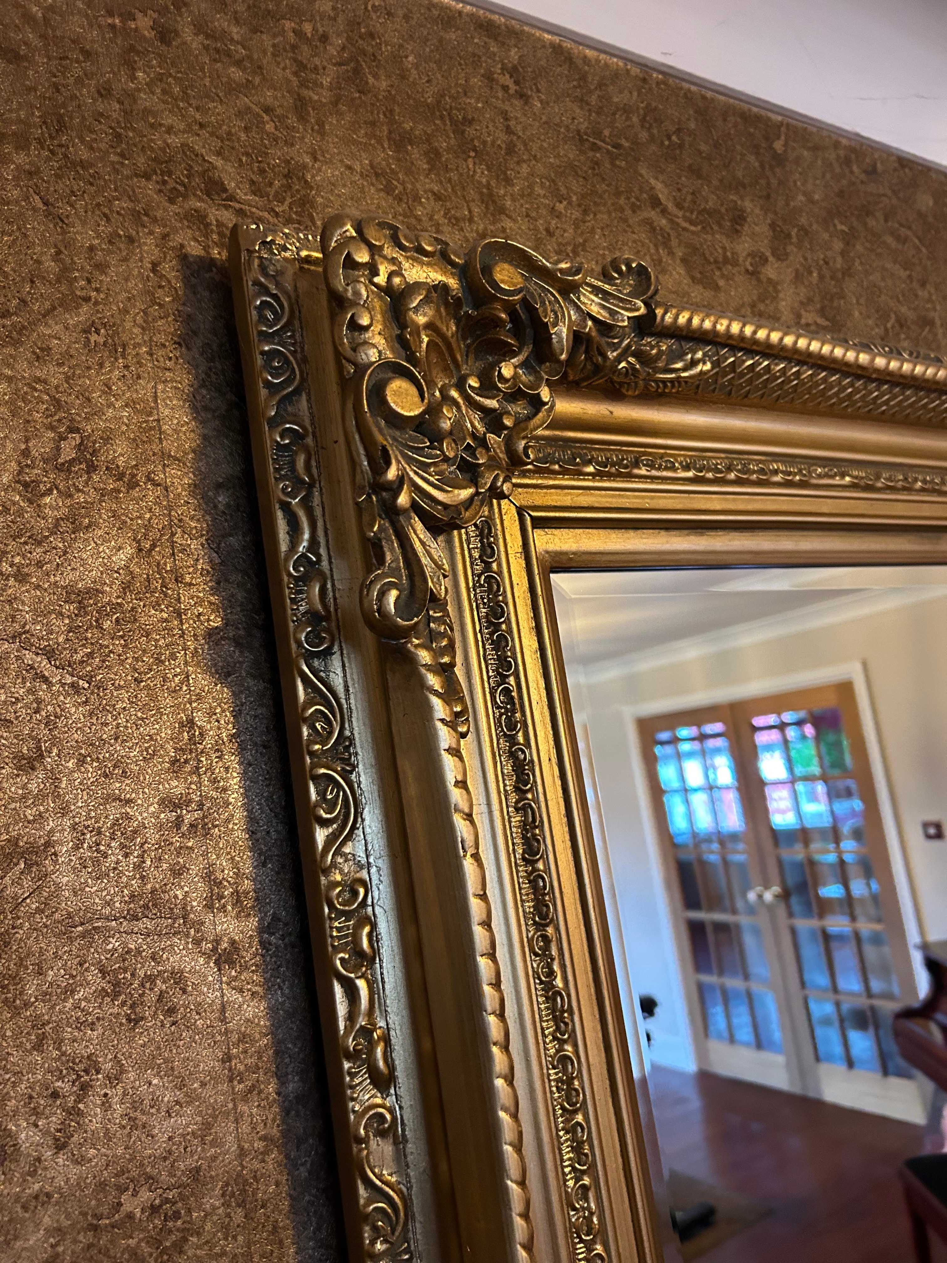 A large, rectangular wall mirror framed in a Baroque or Rococo revival style. The frame is characterized by elaborate gilded ornamentation including scrolled acanthus leaves and C-scroll motifs prominently featured at the corners and along the frame’s perimeter. The frame appears to be crafted from wood, finished with a gold-colored gesso and gilding or metallic paint. The reflective surface is glass. No discernible text or maker’s marks are visible.