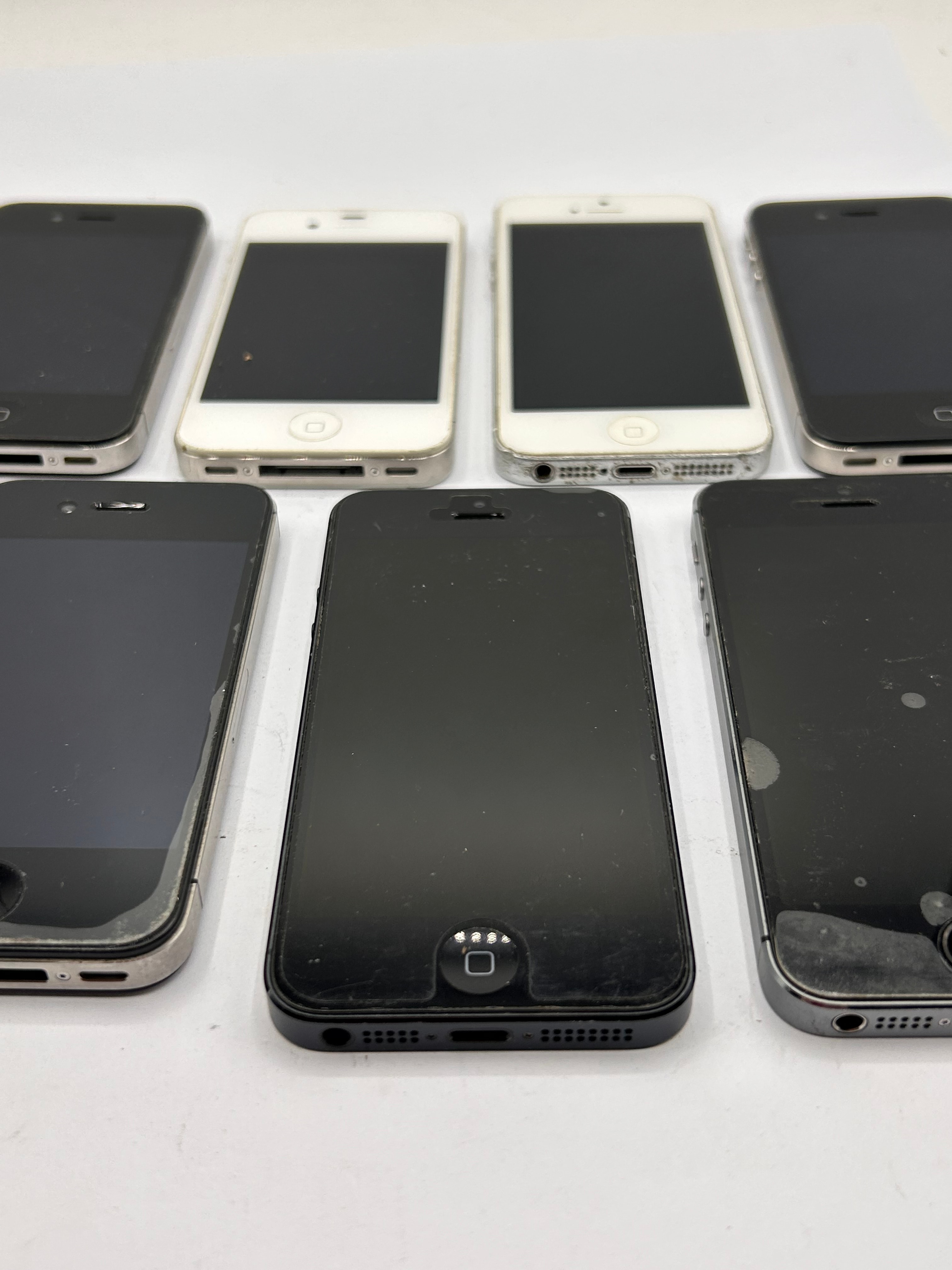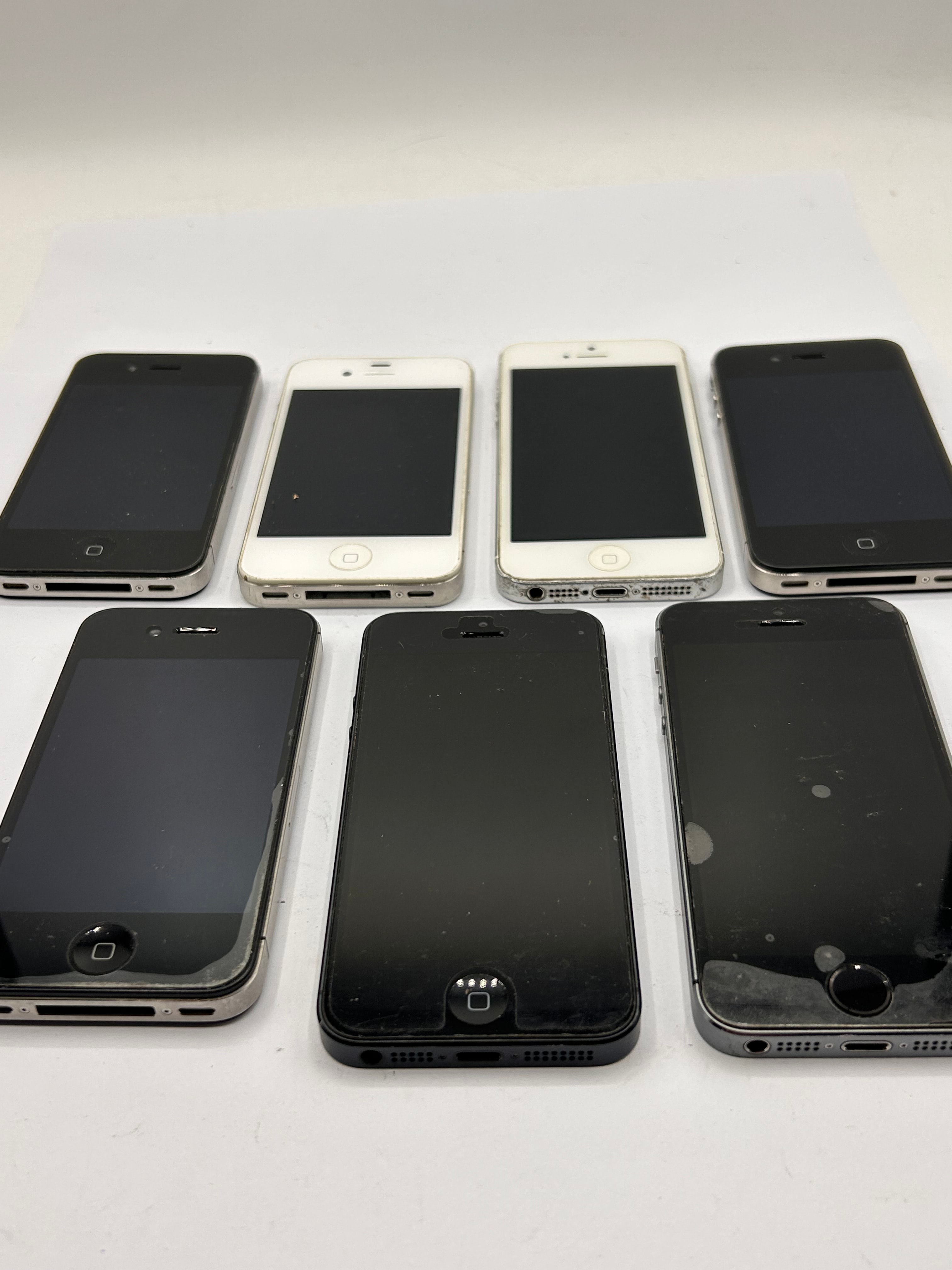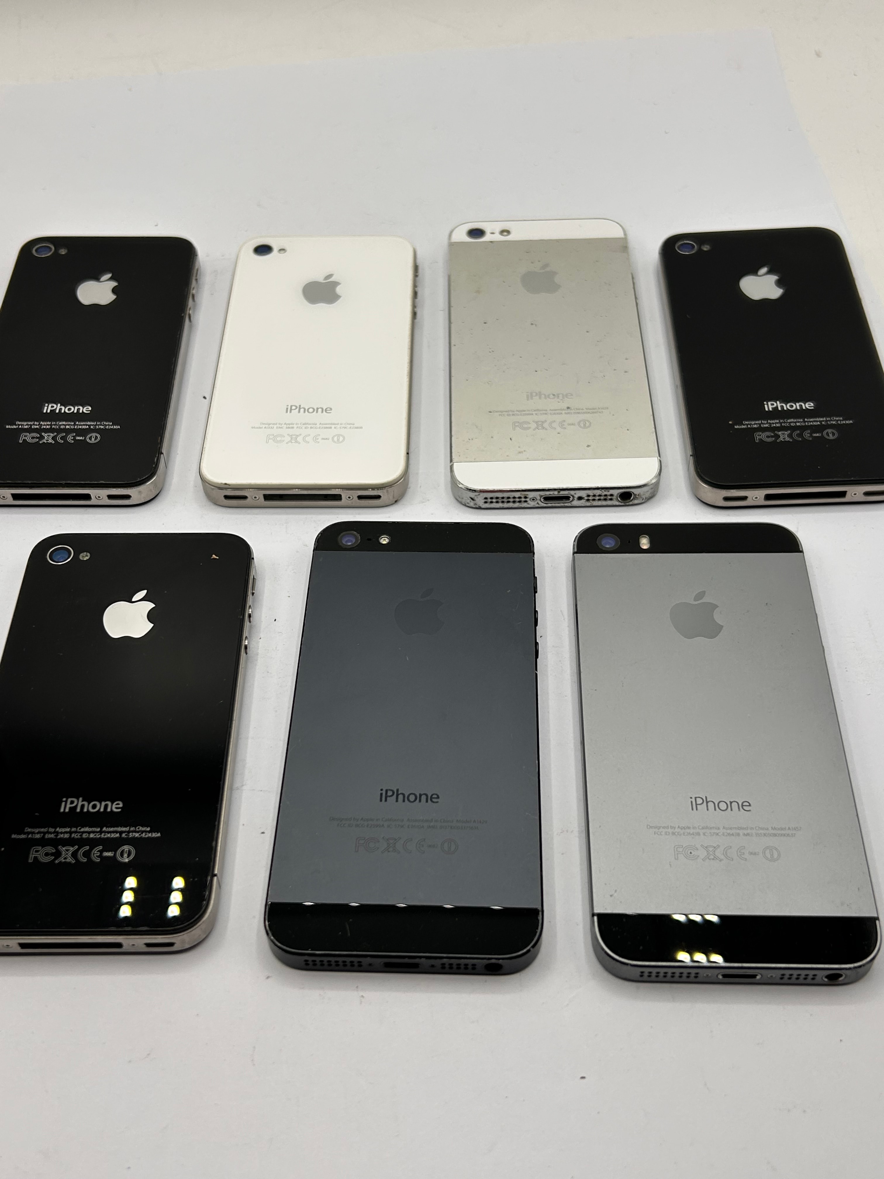 A group of seven Apple iPhone smartphones, comprising early-to-mid 2010s models. The lot includes four iPhone 4/4S units (three black, one white) and three iPhone 5/5S/SE (1st Generation) units (two black/space gray, one white/silver). Each device is constructed from glass and metal, featuring the “iPhone” brand name and the Apple logo prominently on its rear, along with visible regulatory text and model identifiers on the lower back panels.