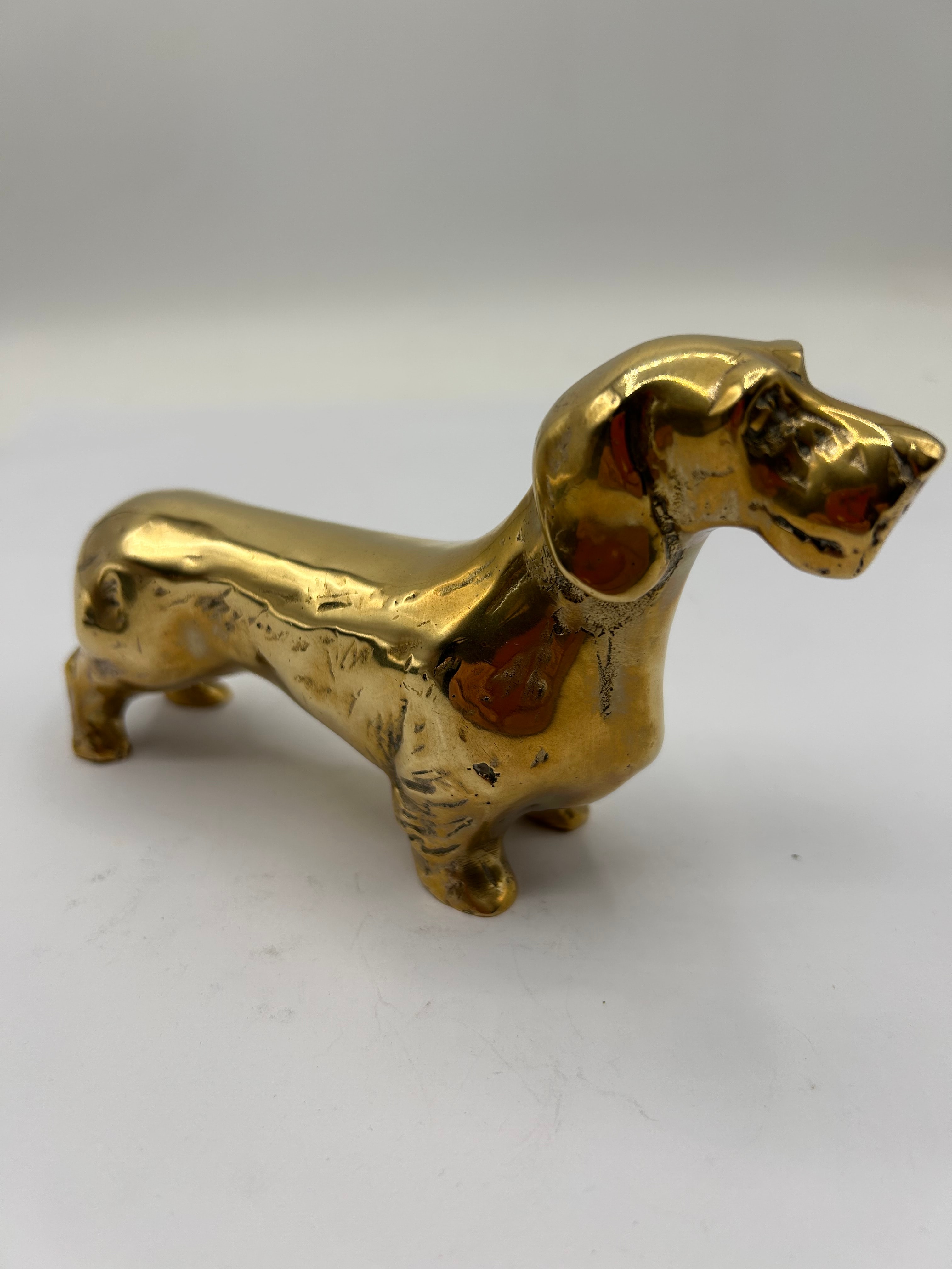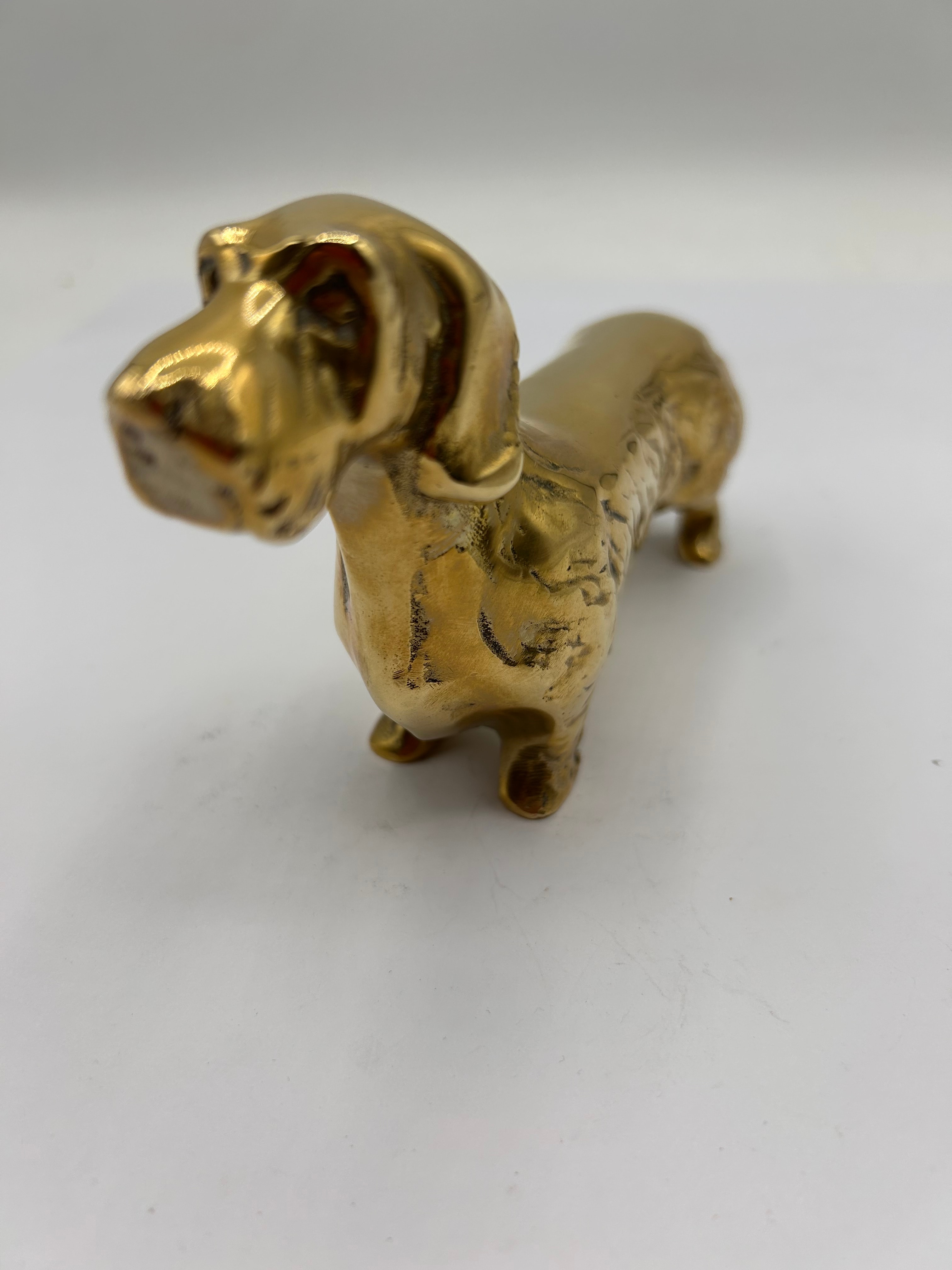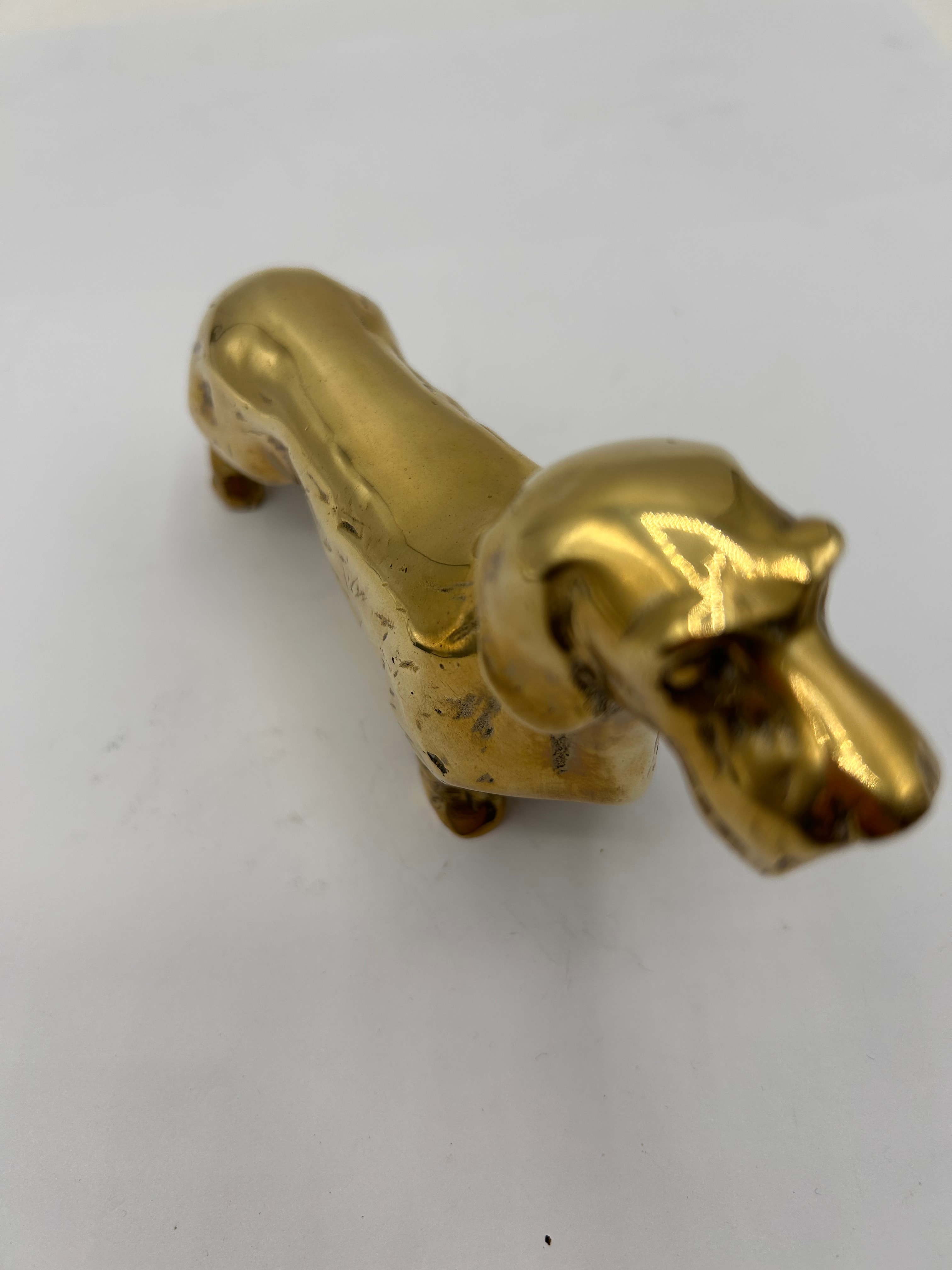 A golden-toned metallic figurine depicting a stylized dachshund-type dog. Fashioned from brass, the piece exhibits a polished finish. No discernible text, maker’s marks, or specific period indicators are visible.