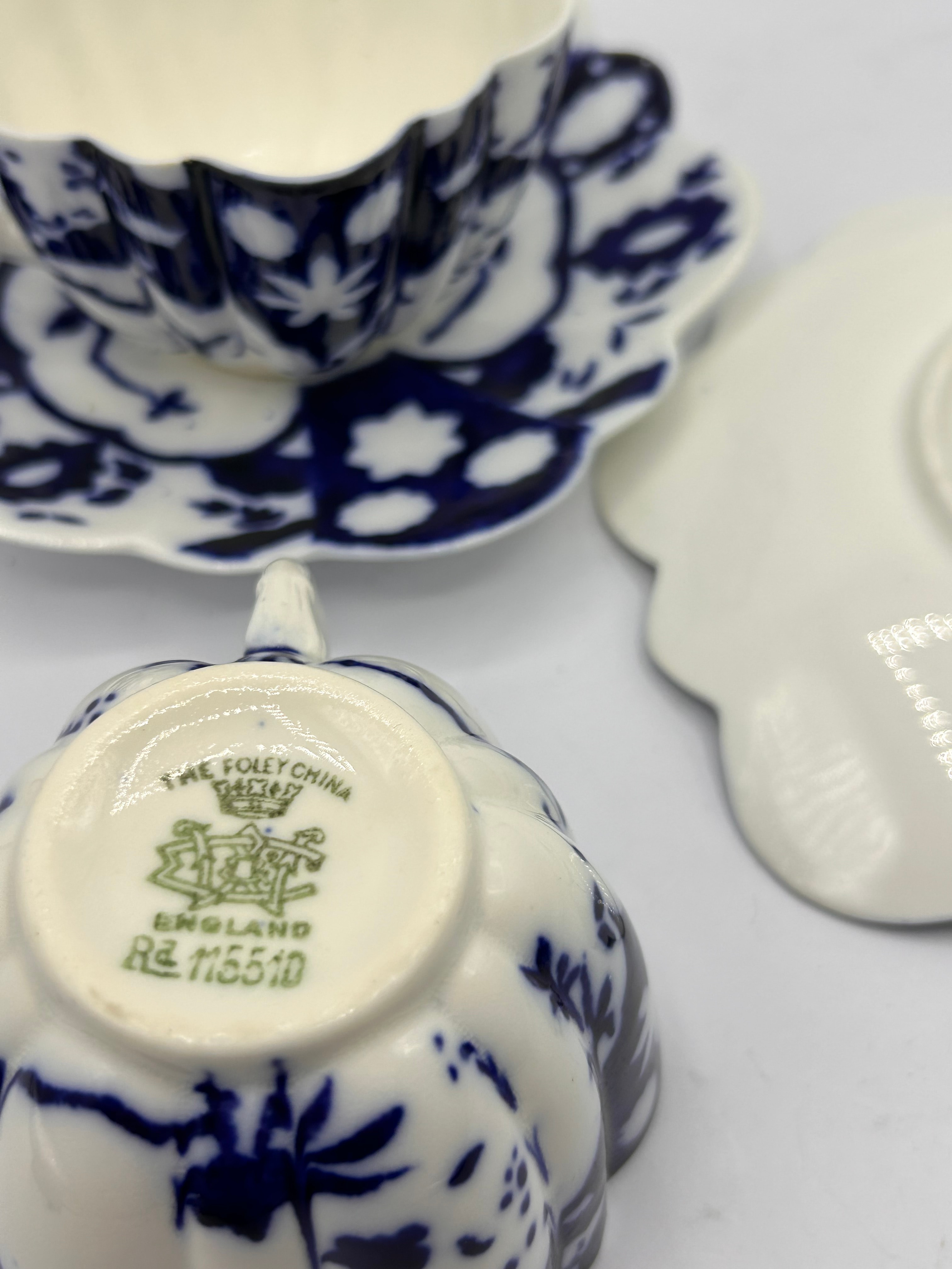 A pair of late 19th Century Foley China ‘Normandy’ Flow Blue porcelain teacups and matching scalloped saucers. Each piece features a fluted cup body and a scalloped saucer. The decoration consists of an all-over dark blue floral and foliate pattern on a white ground, likely applied via transfer printing, characteristic of the ‘Flow Blue’ style. The underside of one cup is marked with ‘THE FOLEY CHINA,’ a ‘FOLEY’ crown emblem, ‘ENGLAND,’ and the registered design number ‘Rd No 115510.’