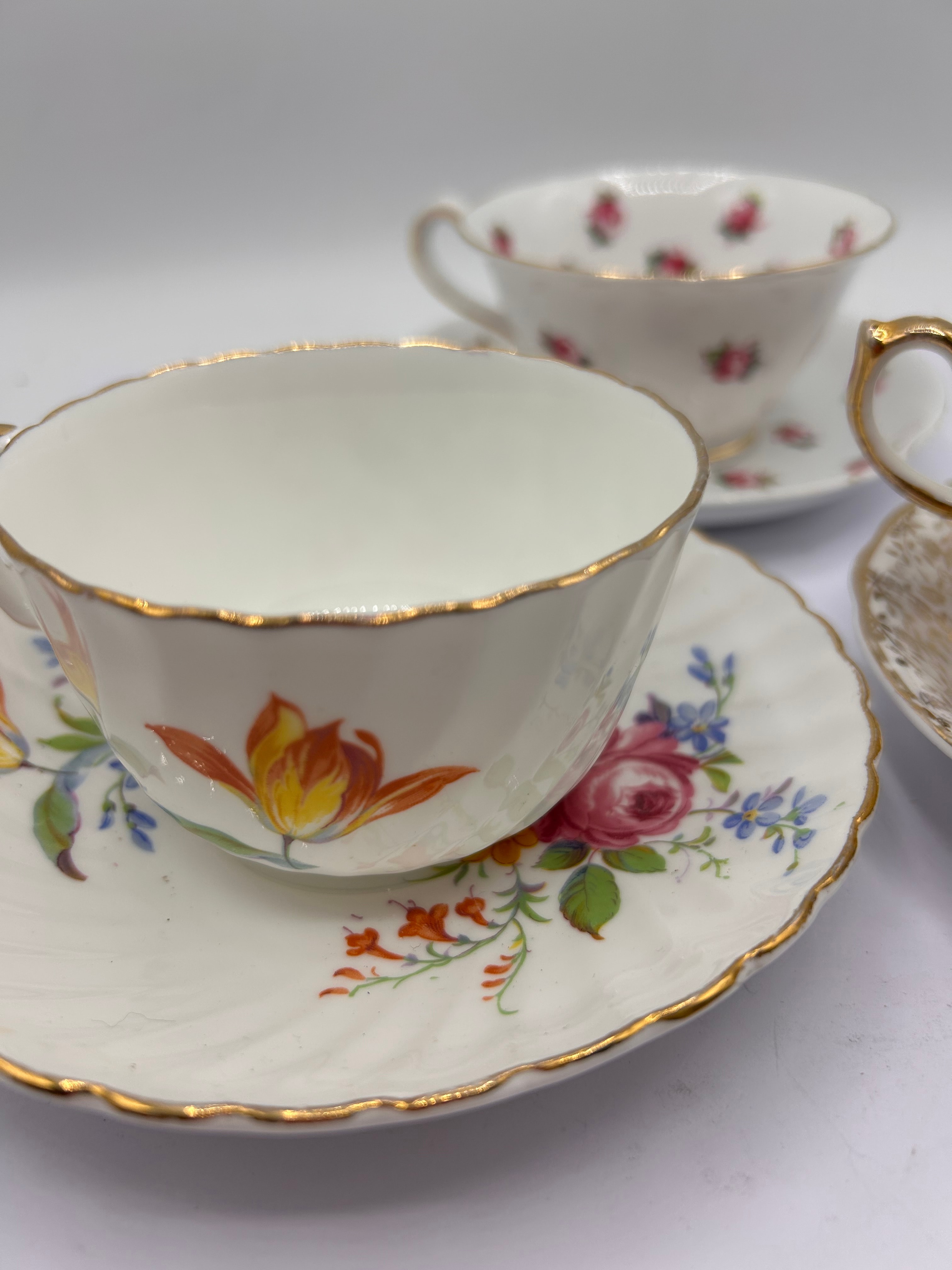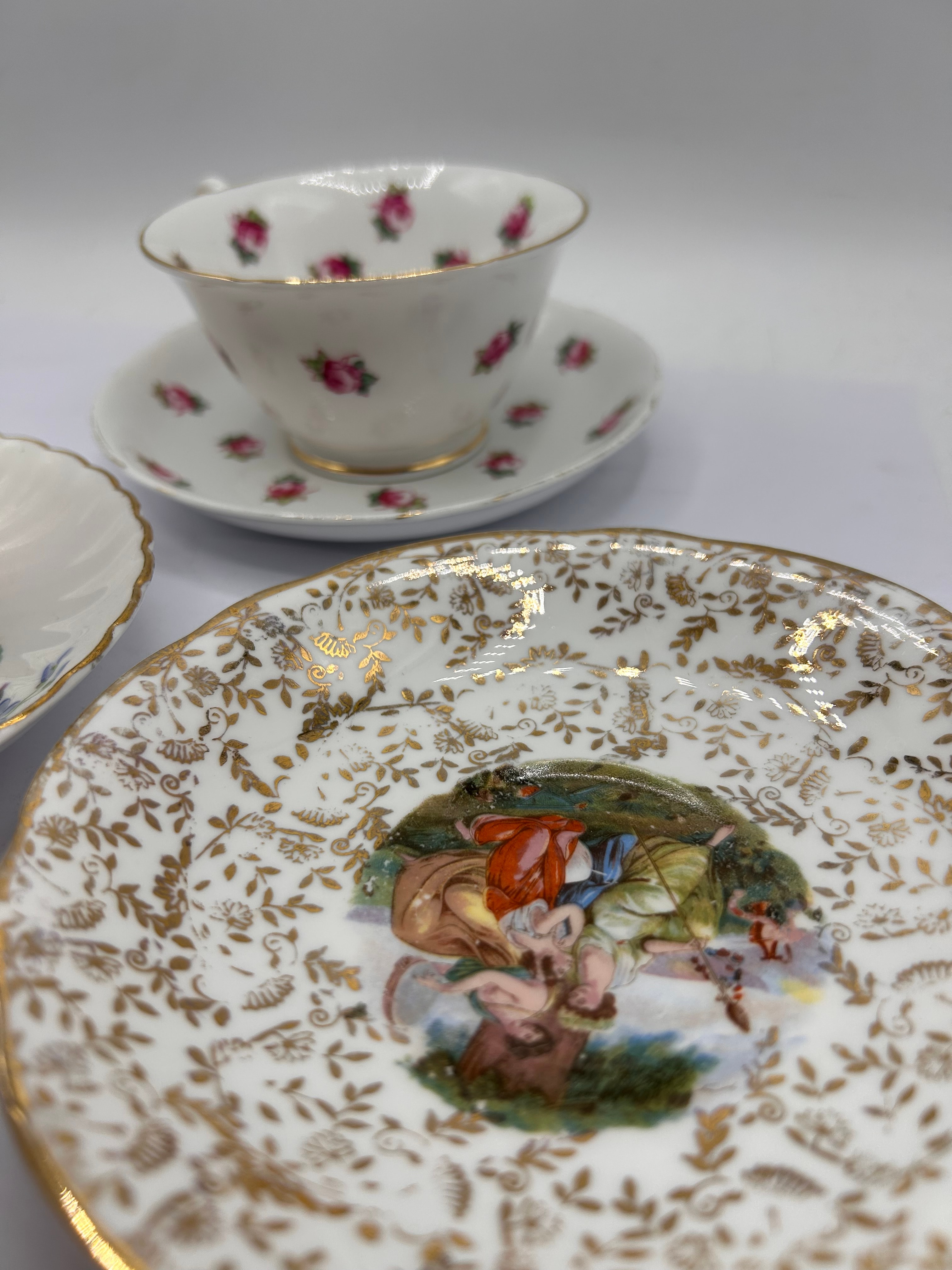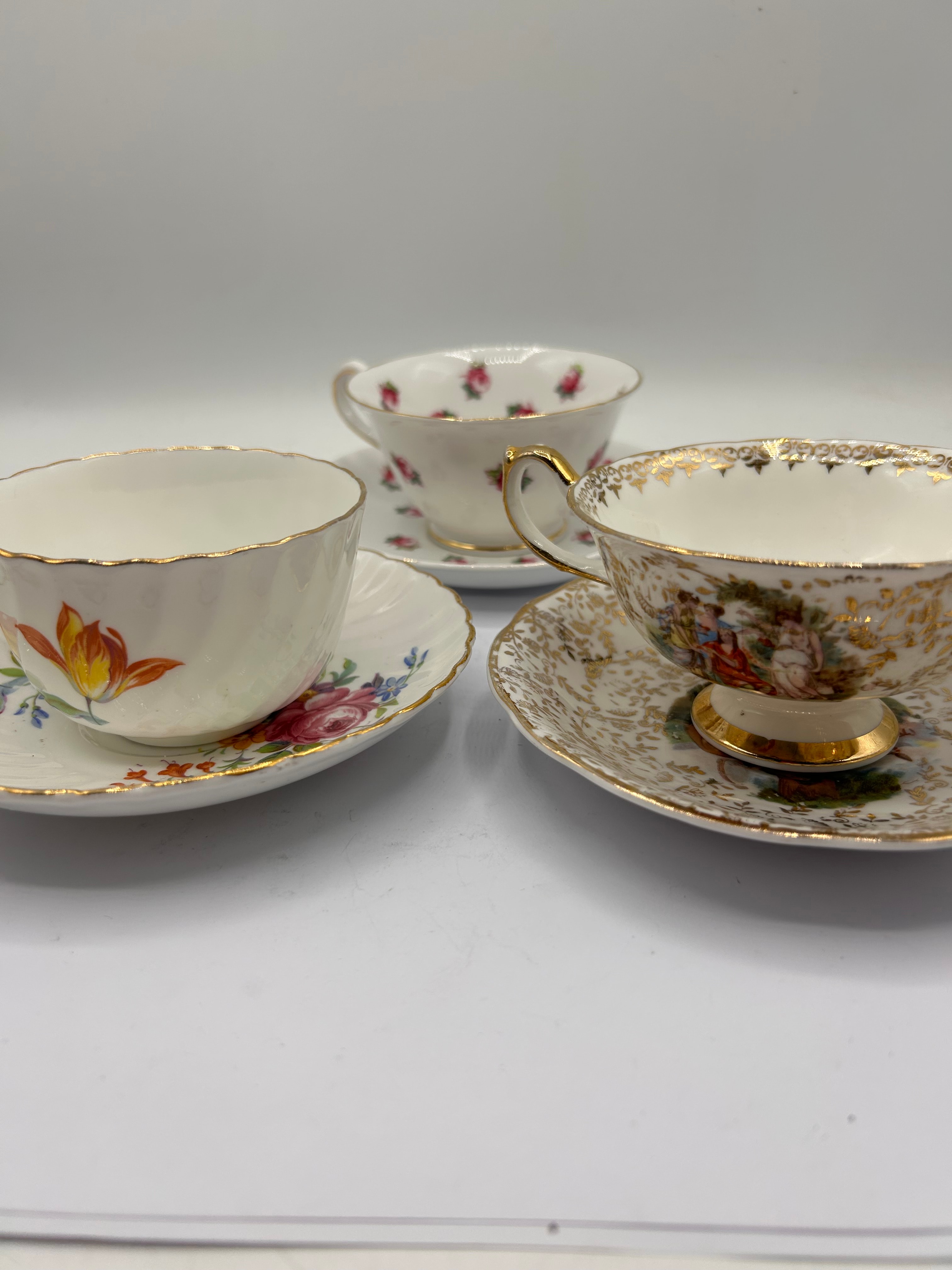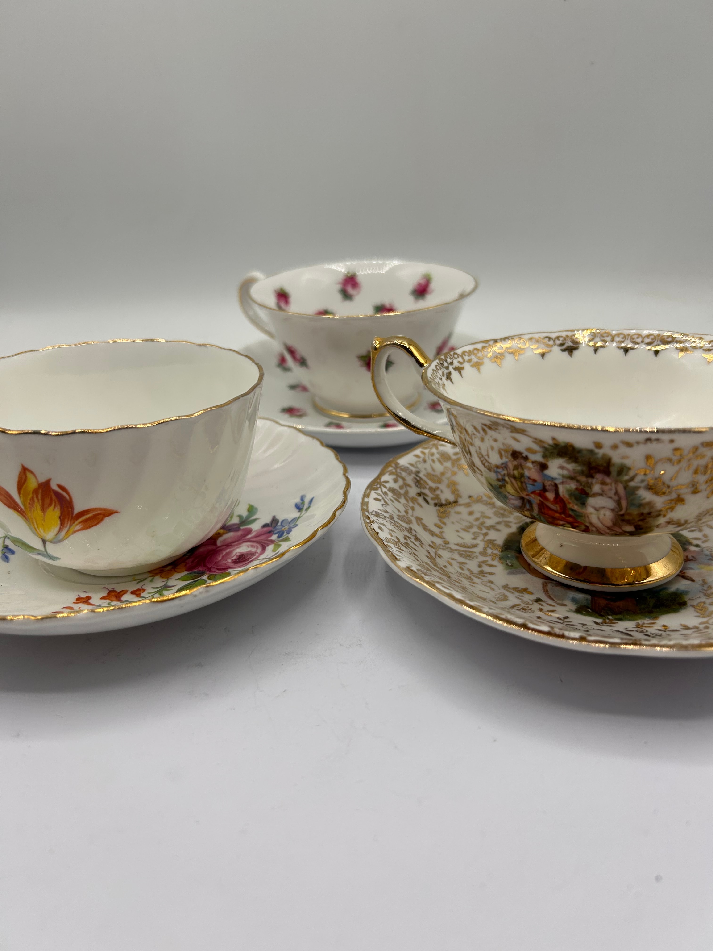 This lot comprises three ornate teacup and saucer sets, likely crafted from porcelain or bone china, each displaying distinct decorative styles. The prominent left set features a fluted cup and saucer adorned with vibrant floral motifs including an orange tulip, pink roses, and blue accent flowers, all finished with gold trim. The prominent right set showcases an elaborate design with extensive gold scrollwork, a shaped foot, and central figural vignettes depicting pastoral scenes on both the cup and saucer. The third set, visible in the background, presents a classic scattered pink rosebud pattern with gold accents. No manufacturer’s marks or inscriptions are apparent from the images.