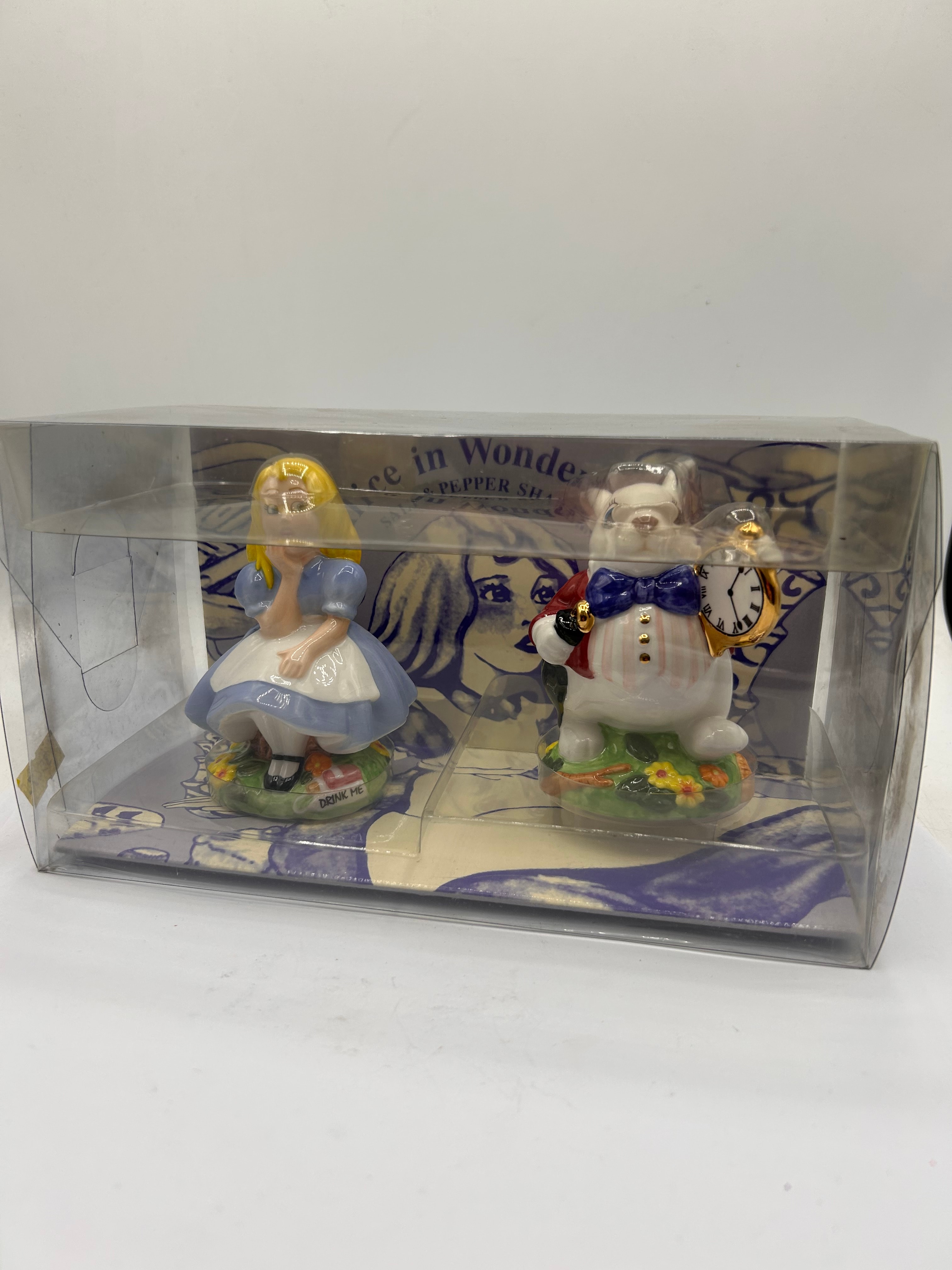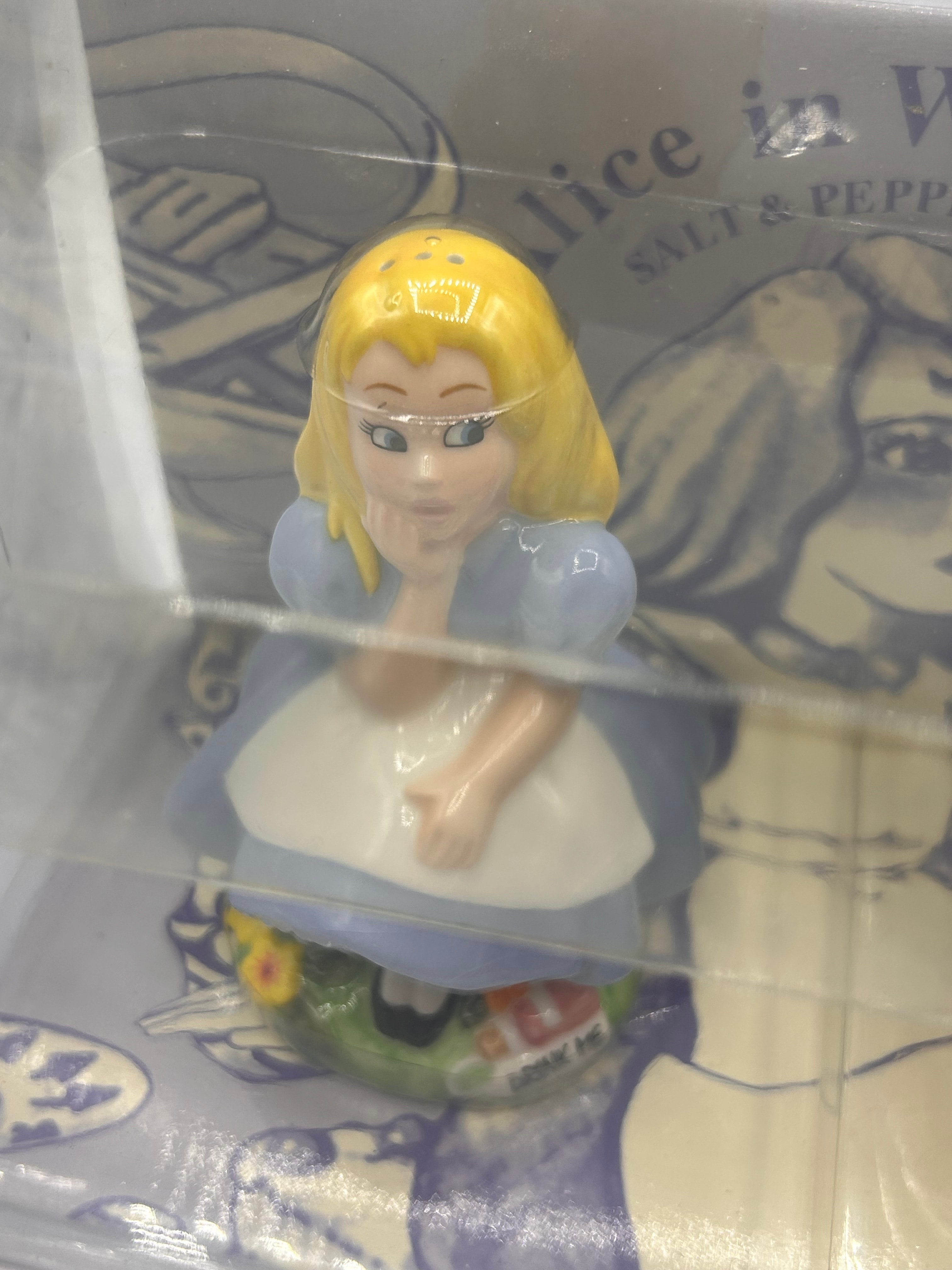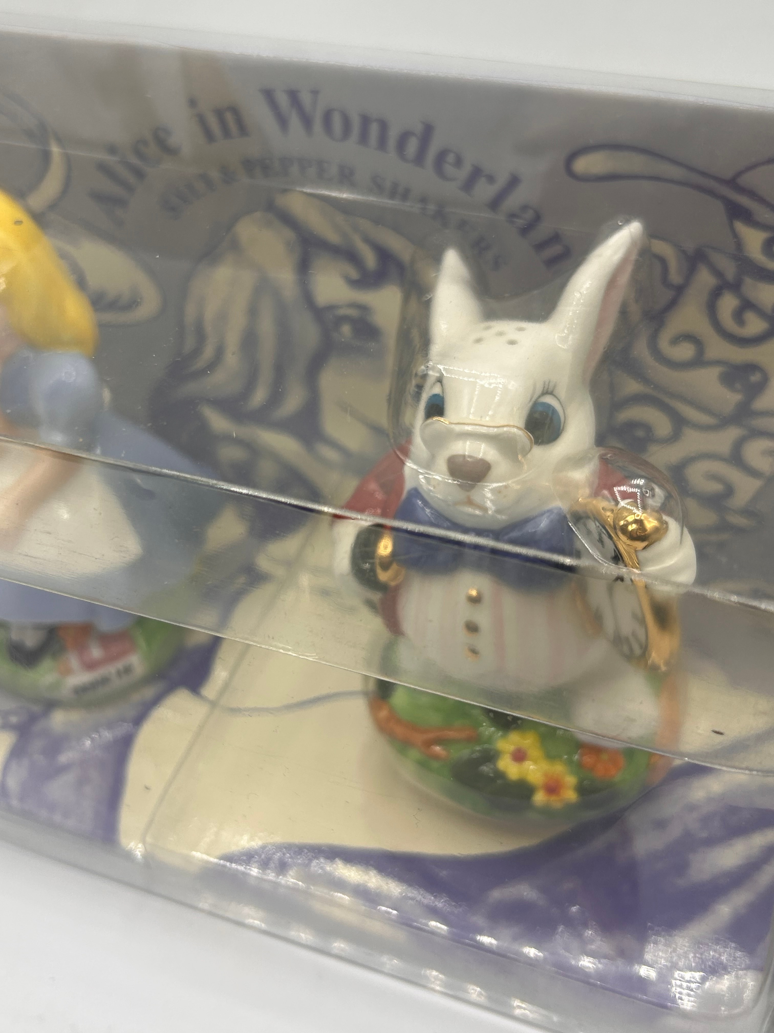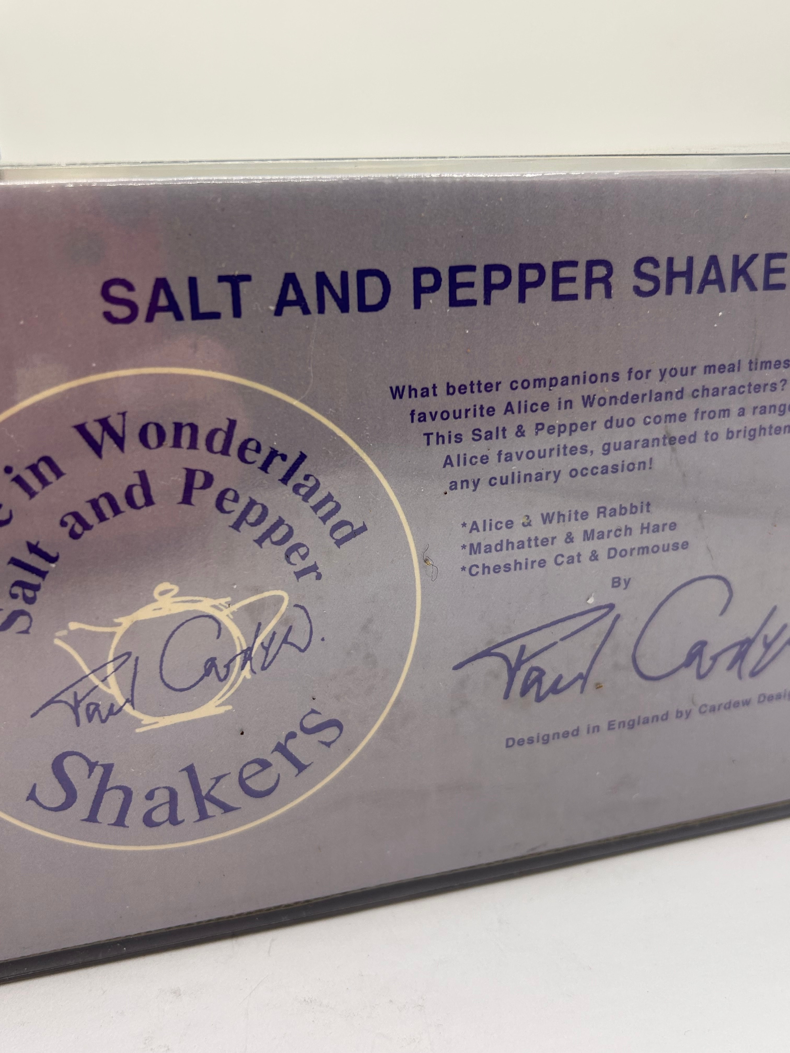 A pair of ceramic salt and pepper shakers by Paul Cardew, depicting Alice and the White Rabbit from “Alice in Wonderland.” The set is presented new in its original clear plastic and cardboard packaging. The packaging identifies them as “Alice in Wonderland Salt & Pepper Shakers” and notes they are “Designed in England by Cardew Design” and “By Paul Cardew.” The base of the Alice figure features the legible text “DRINK ME.” Both figures are brightly painted, with the White Rabbit holding a pocket watch and Alice posed contemplatively. Consistent with a contemporary, likely late 20th or early 21st-century production.