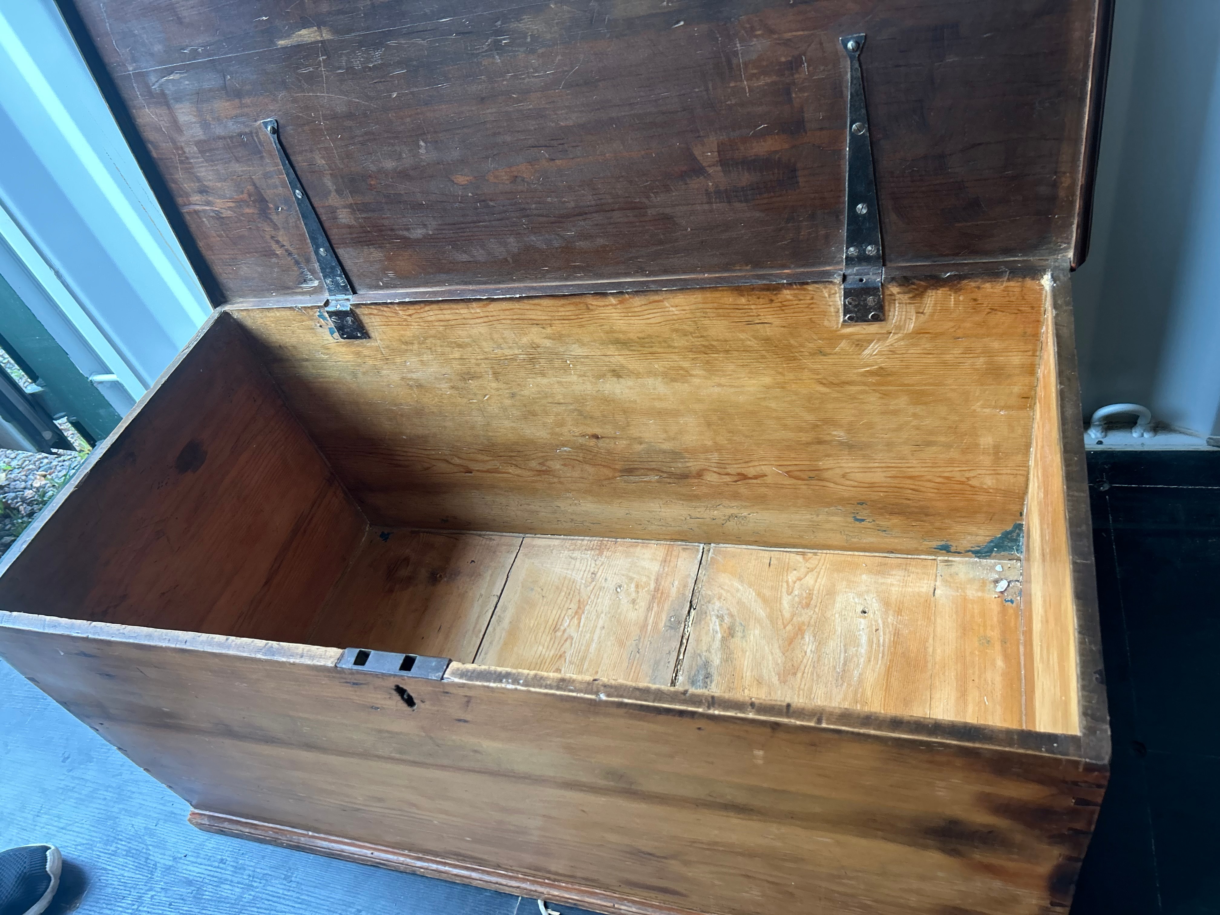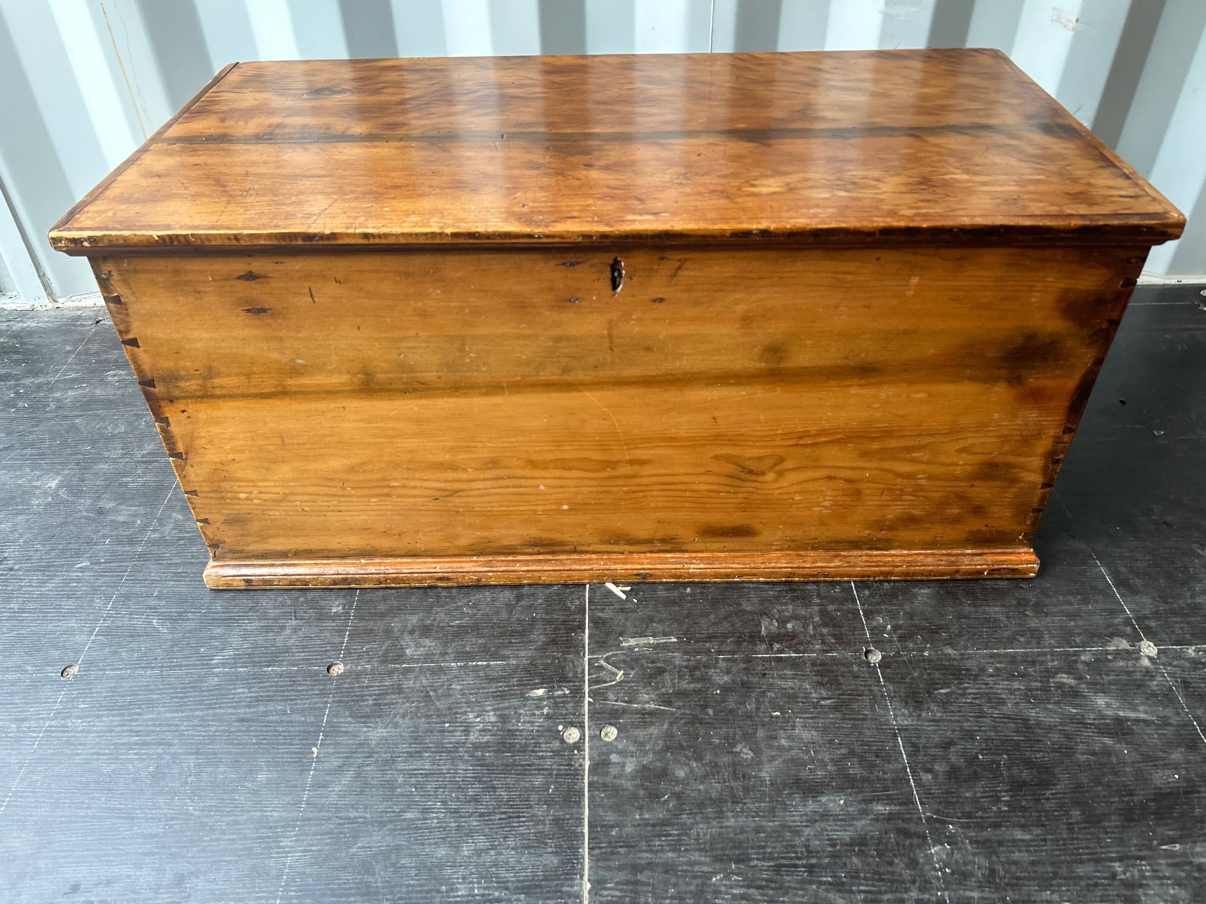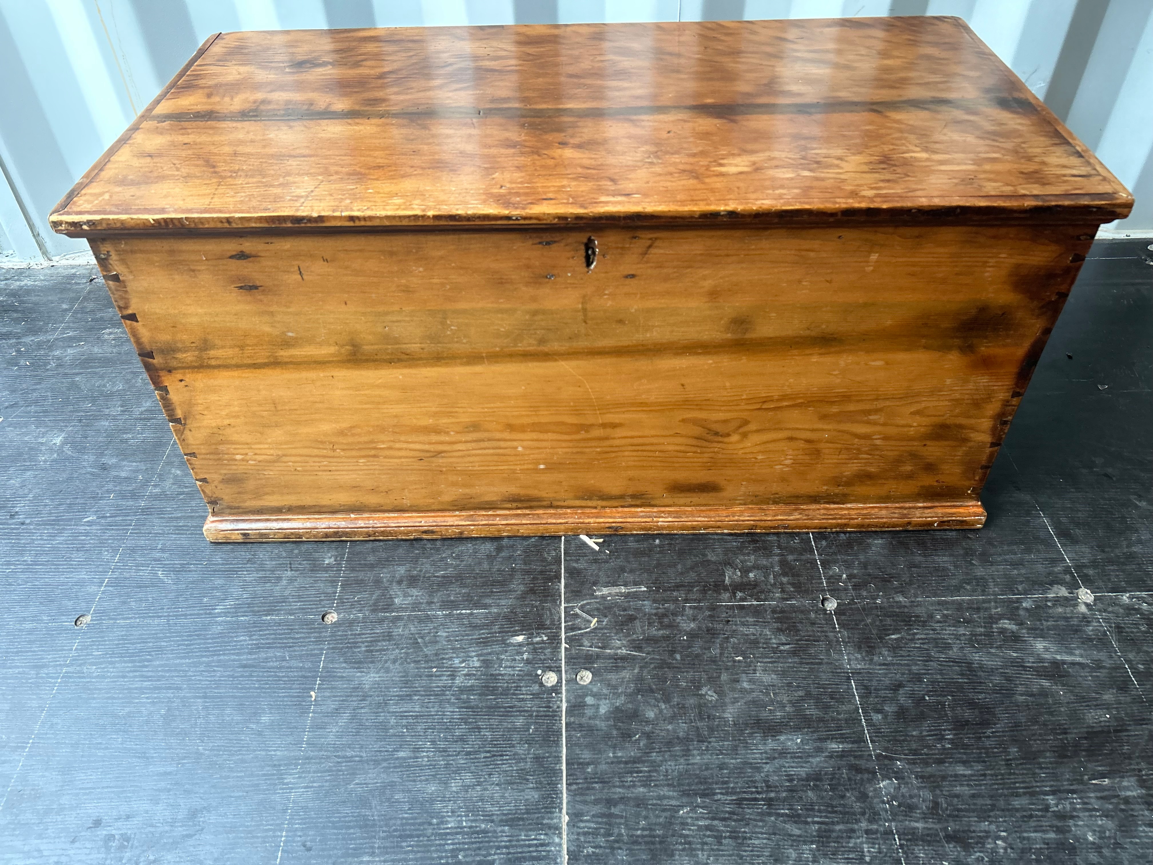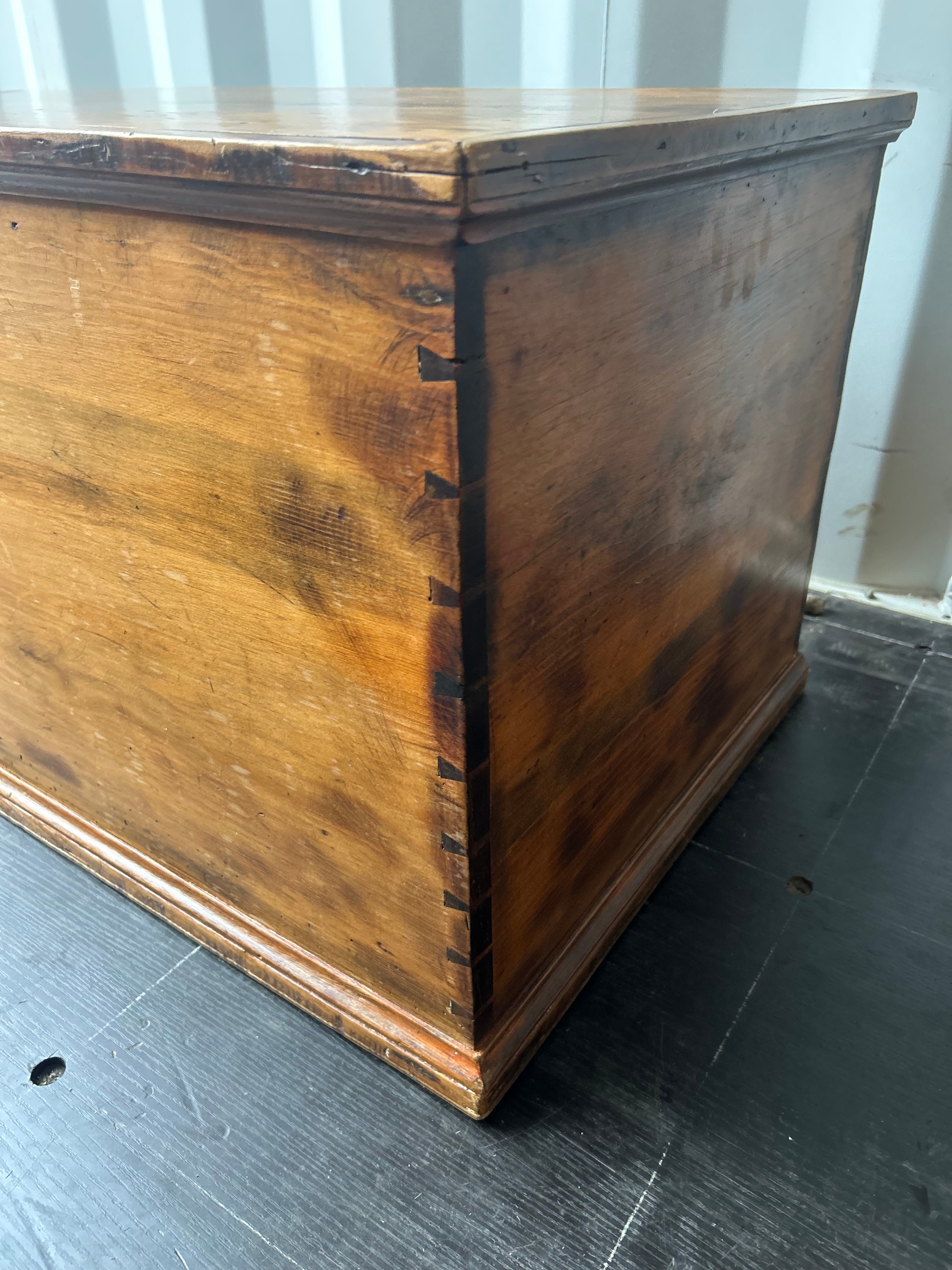 A rectangular wooden storage chest, likely a blanket chest or trunk, crafted from pine, identifiable by its visible grain and knots. The construction features prominent, hand-cut through-dovetail joinery at the corners, indicating an older, possibly provincial or country style. The exterior displays an aged, warm amber-toned finish with a central keyhole on the front. The interior is unfinished, revealing simple plank construction with two rustic iron strap hinges supporting the lid. No discernible text, maker’s marks, or other specific identifiers are visible.