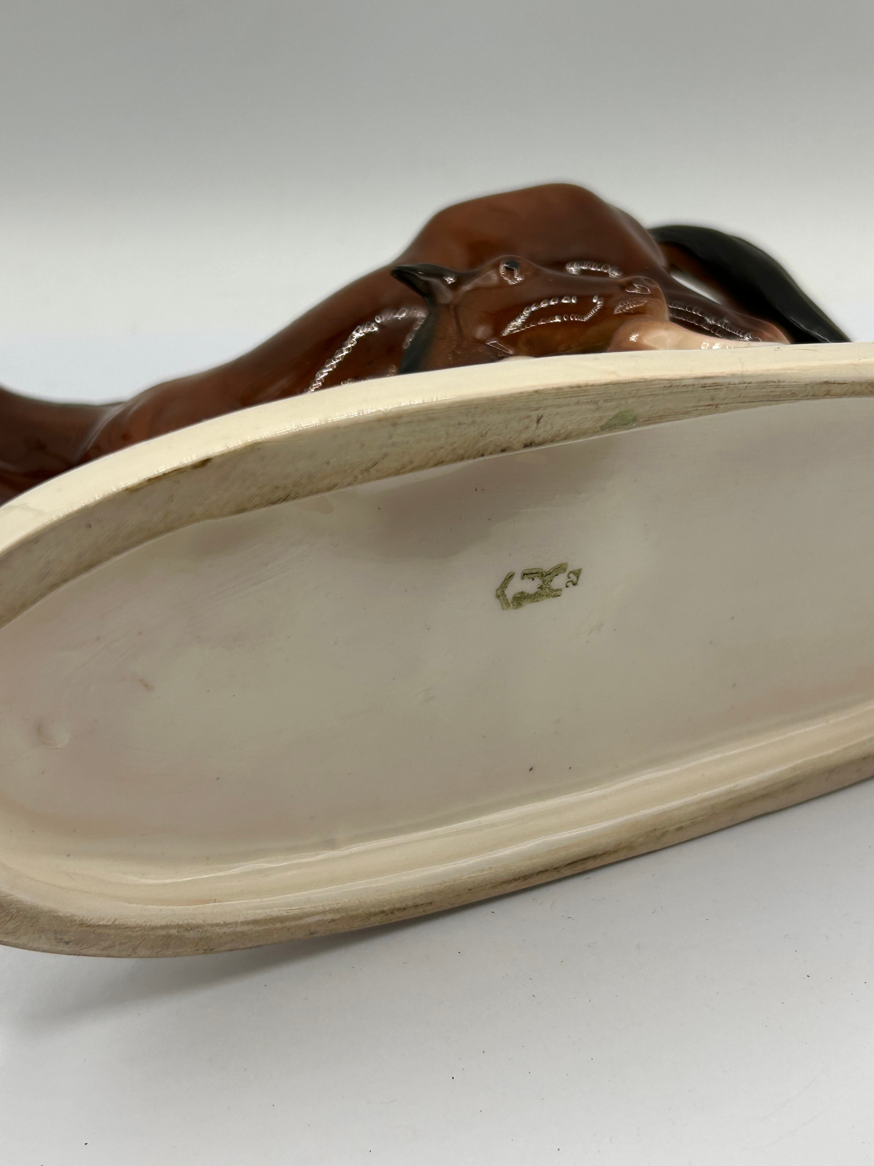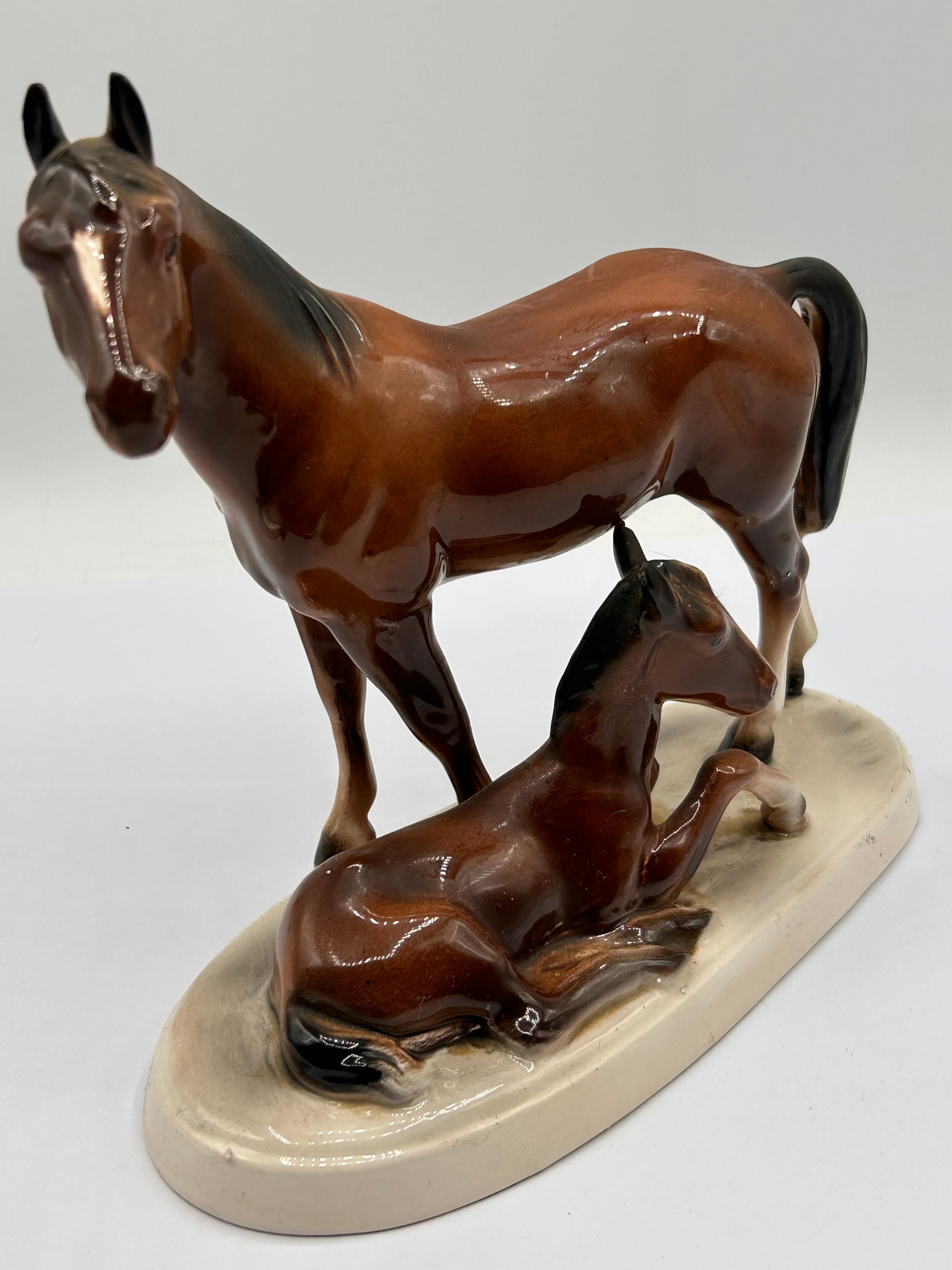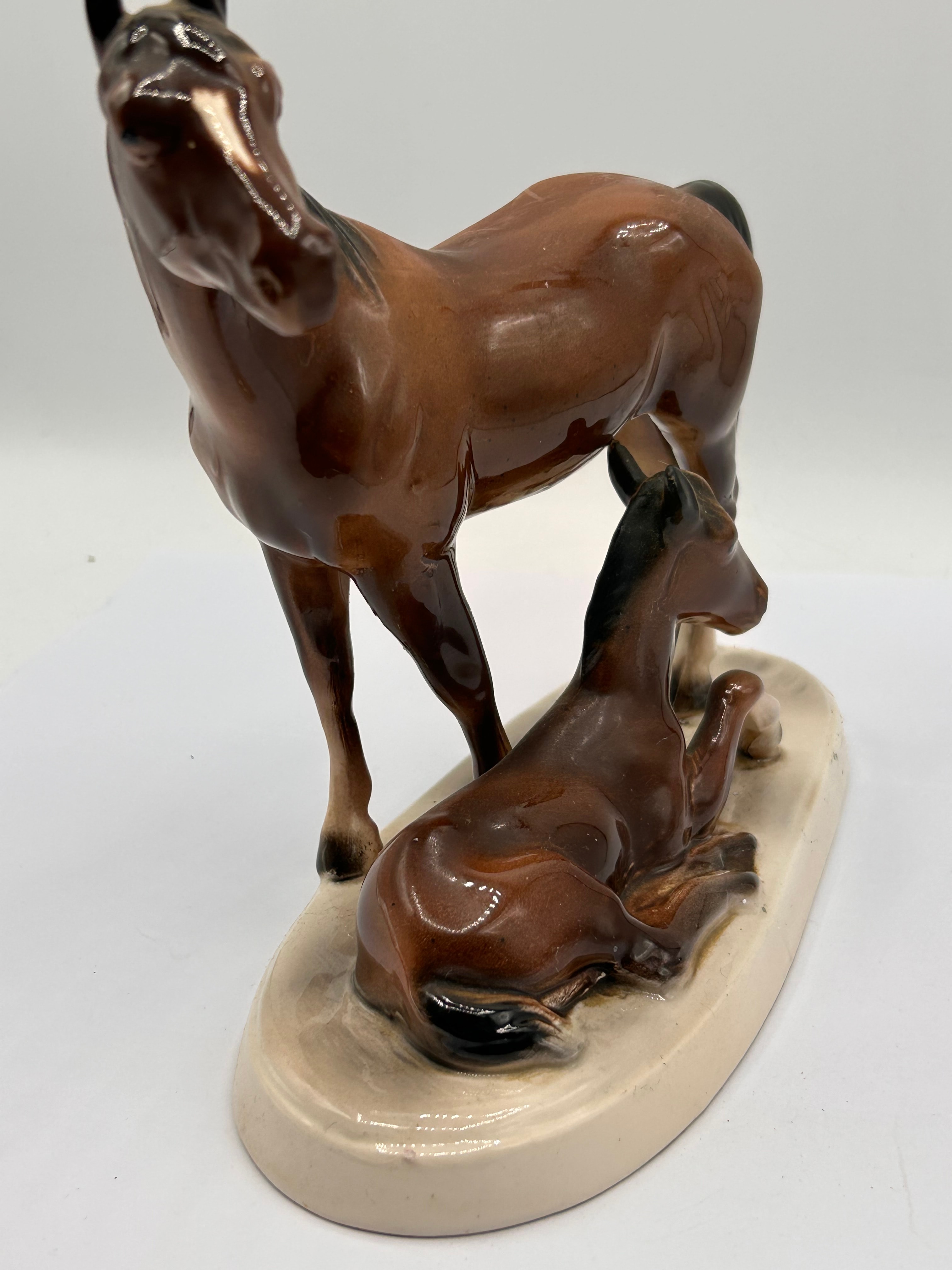 A vintage Hertwig German ceramic figurine depicting a mare and foal. The glazed ceramic figurine features a brown mare standing over a reclining brown foal, presented in a naturalistic style on an unglazed, oval cream-colored base. The figures exhibit realistic brown and black coloration with white facial markings on the mare, finished with a high-gloss glaze. The underside of the base features a gold-colored maker’s mark, comprising a stylized letter (possibly ‘K’ or ‘R’) topped by a small crown or flourish, with an additional character (perhaps ‘2’ or ‘S’) below. Its period is consistent with mid to late 20th-century decorative ceramics.