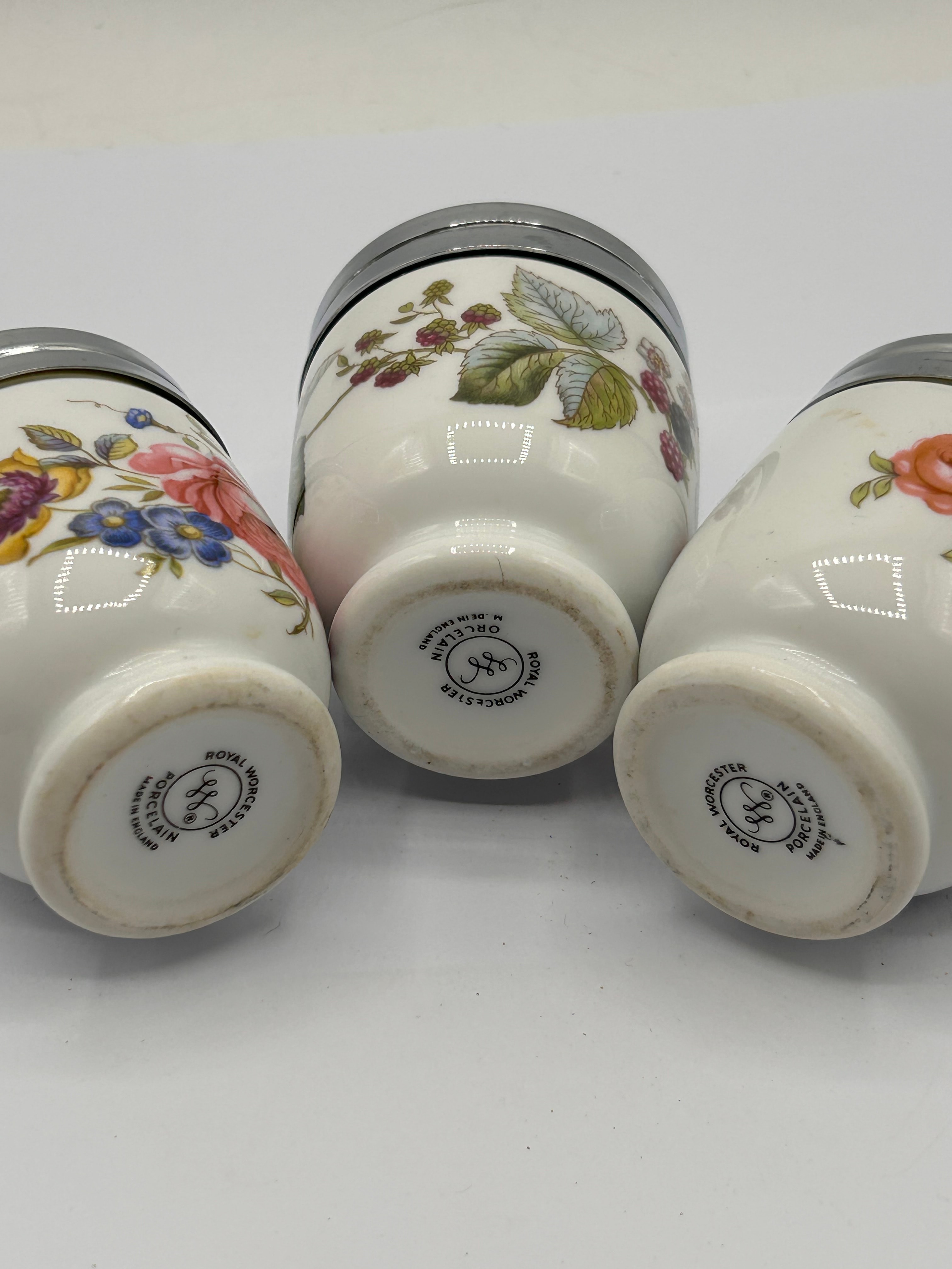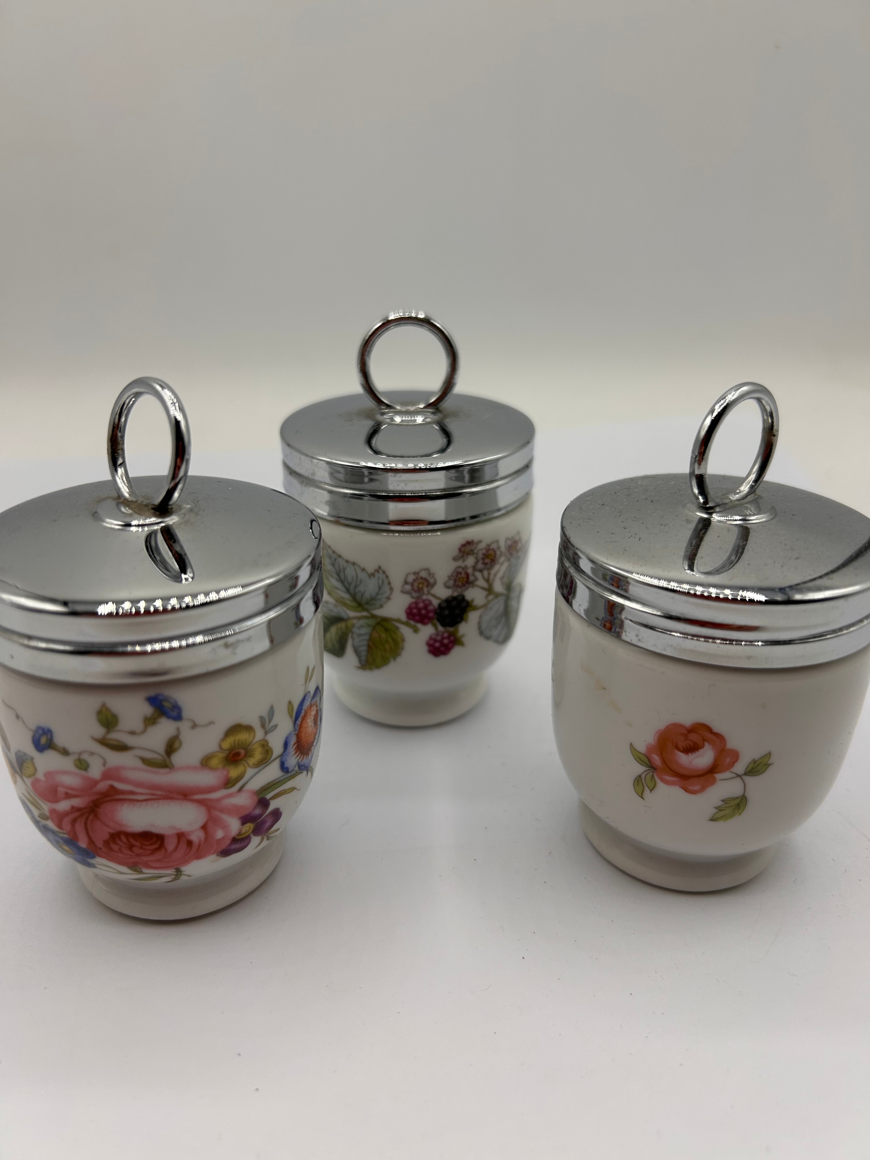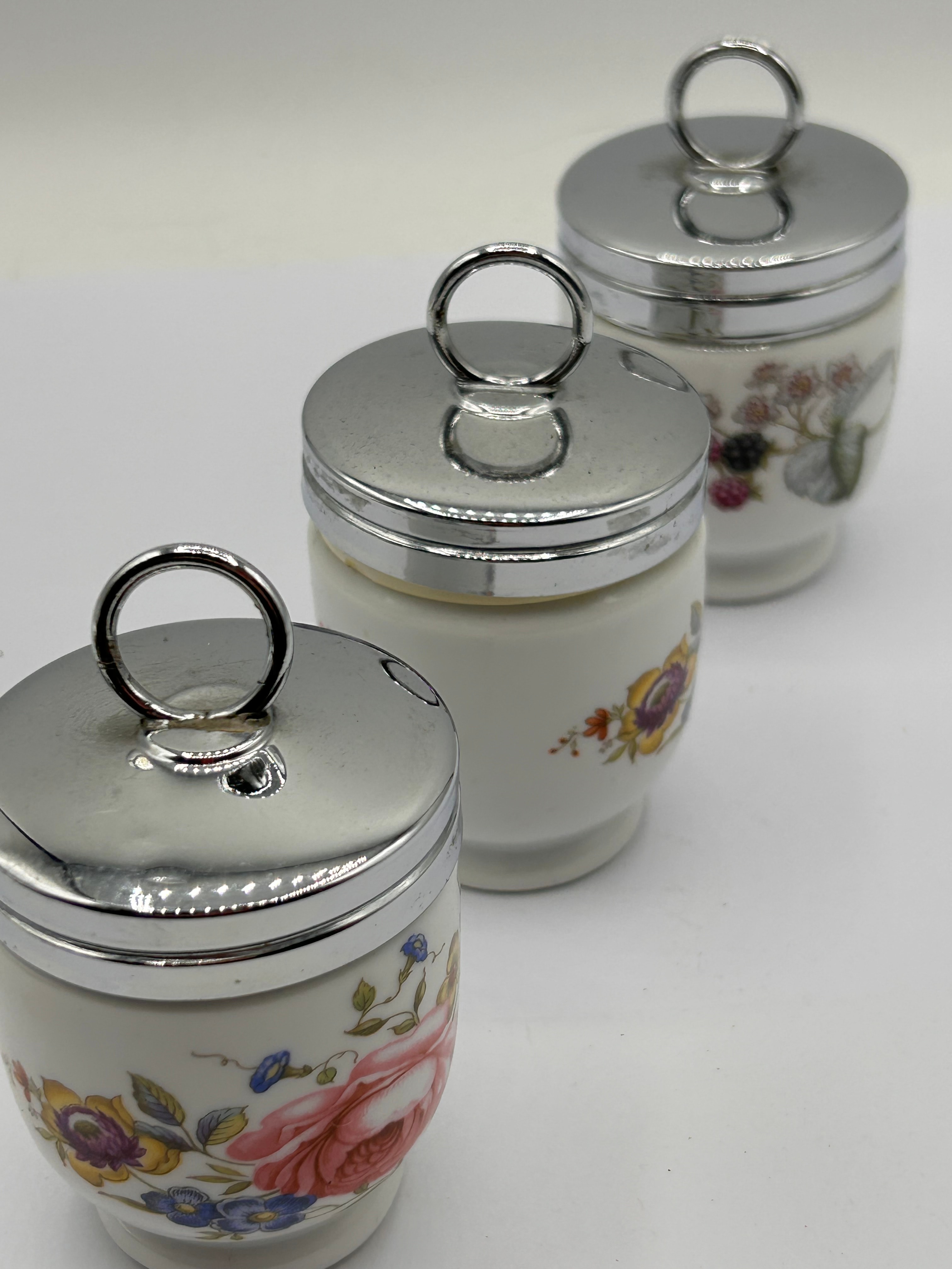 A set of three vintage Royal Worcester vitreous porcelain lidded egg coddlers. Each coddler features a white porcelain body with a silver-toned metal lid and a ring handle. The porcelain bodies are individually decorated with distinct floral patterns: one depicting large pink and blue roses, another with strawberries and foliage (consistent with the ‘Lavinia Blackberry’ pattern), and the third with a single orange rose. The bases of each are marked ‘ROYAL WORCESTER,’ ‘VITREOUS PORCELAIN,’ and ‘MADE IN ENGLAND.’