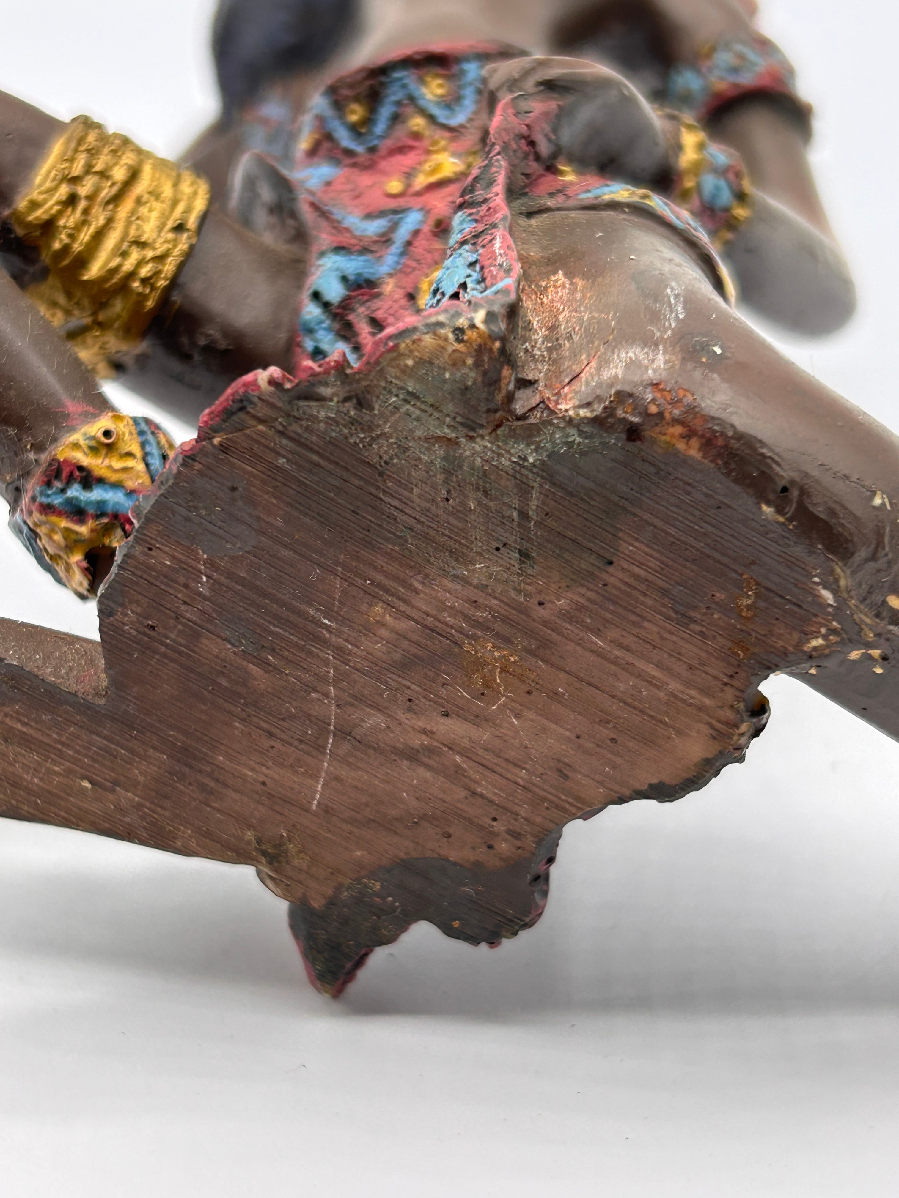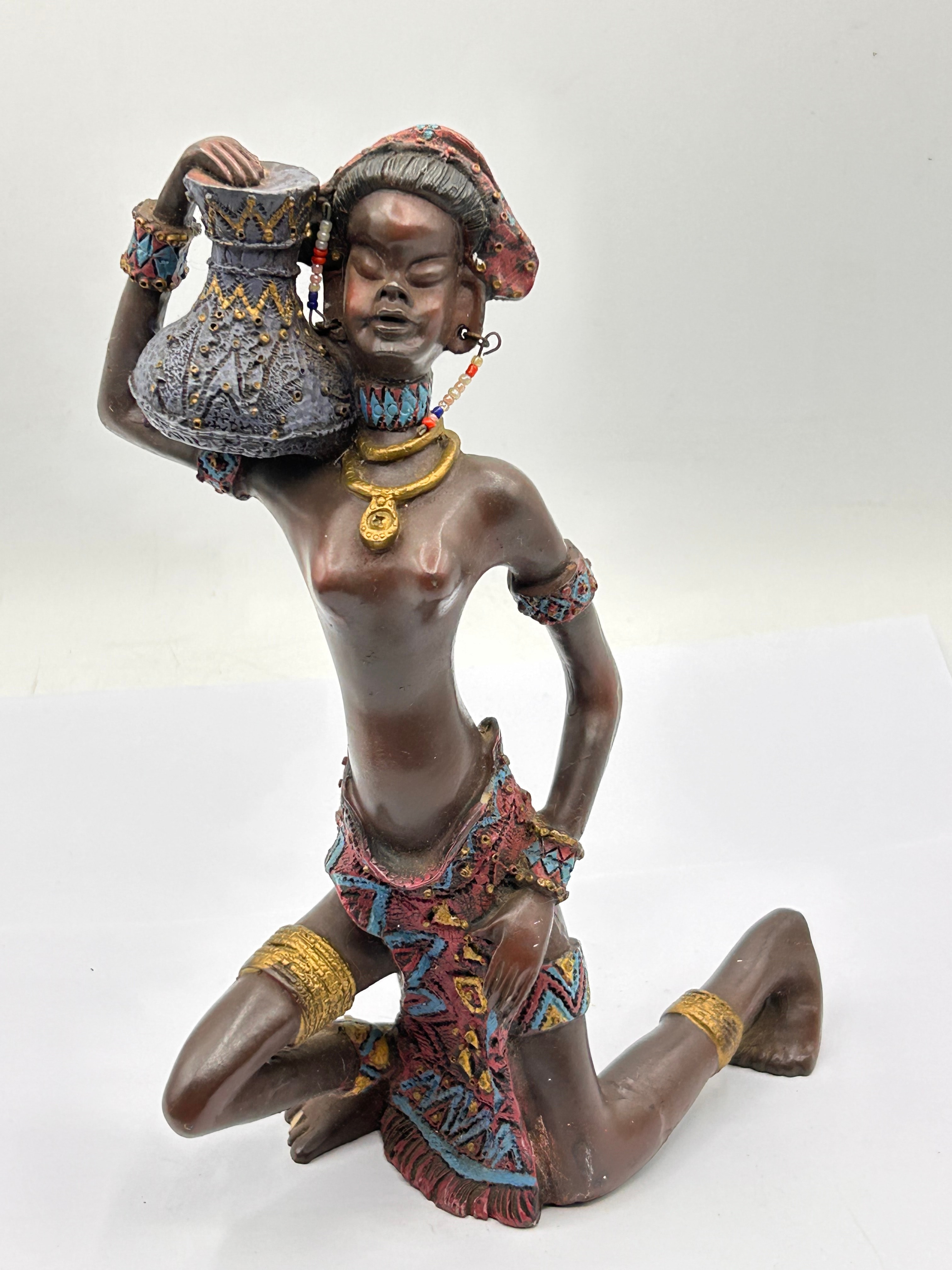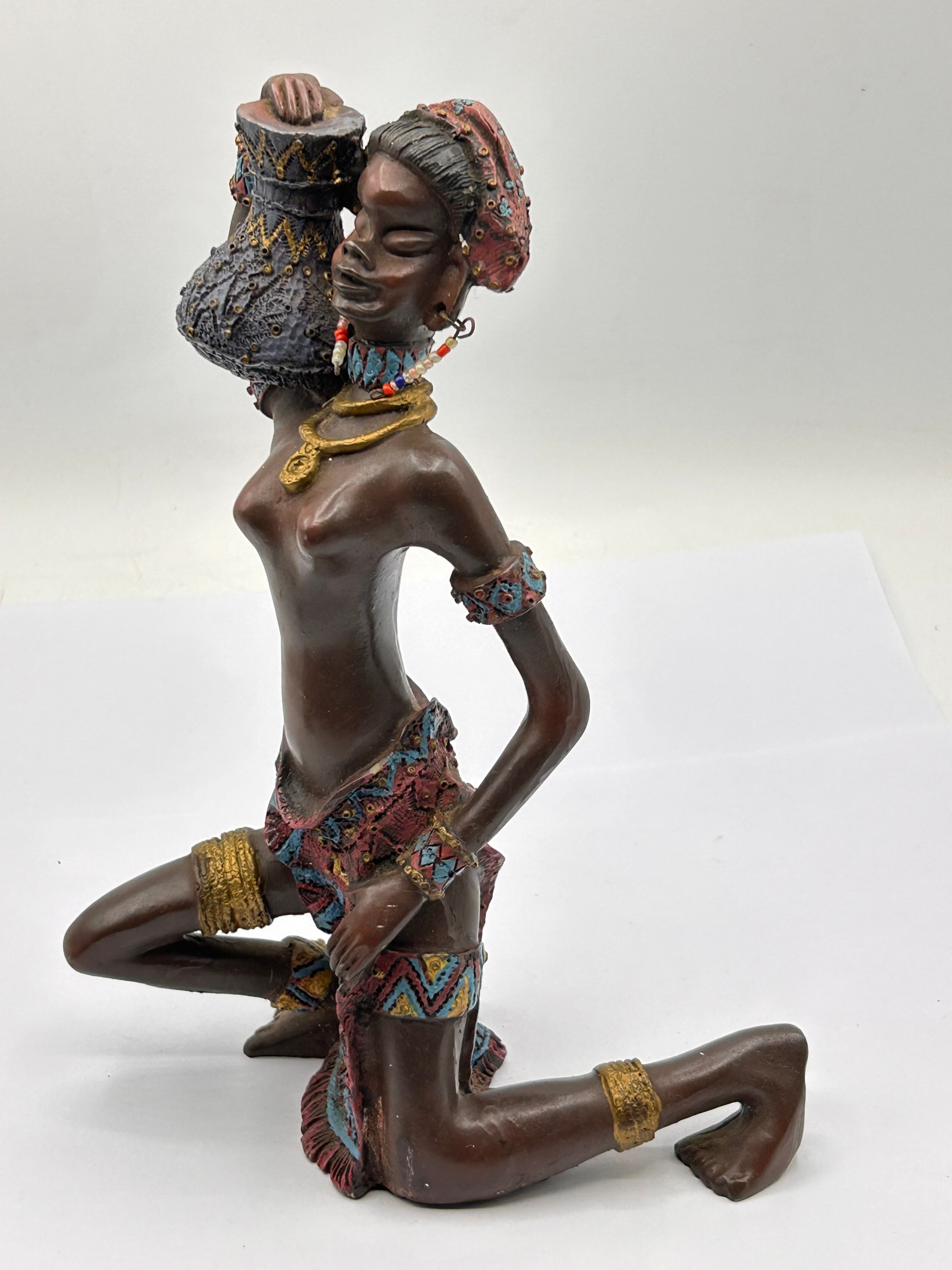 A decorative figurine, identified in the market as ‘AFRICAN WOMAN 9’, crafted from polymer resin. The piece depicts a kneeling female figure in an ethnic or tribal style, holding an ornate pot on her left shoulder. The figurine is finished with painted details, including a patterned skirt, headwrap, earrings, a beaded necklace with a circular pendant, bracelets, and anklets, in vibrant blues, reds, gold, and white. No manufacturer’s marks or text are visible.