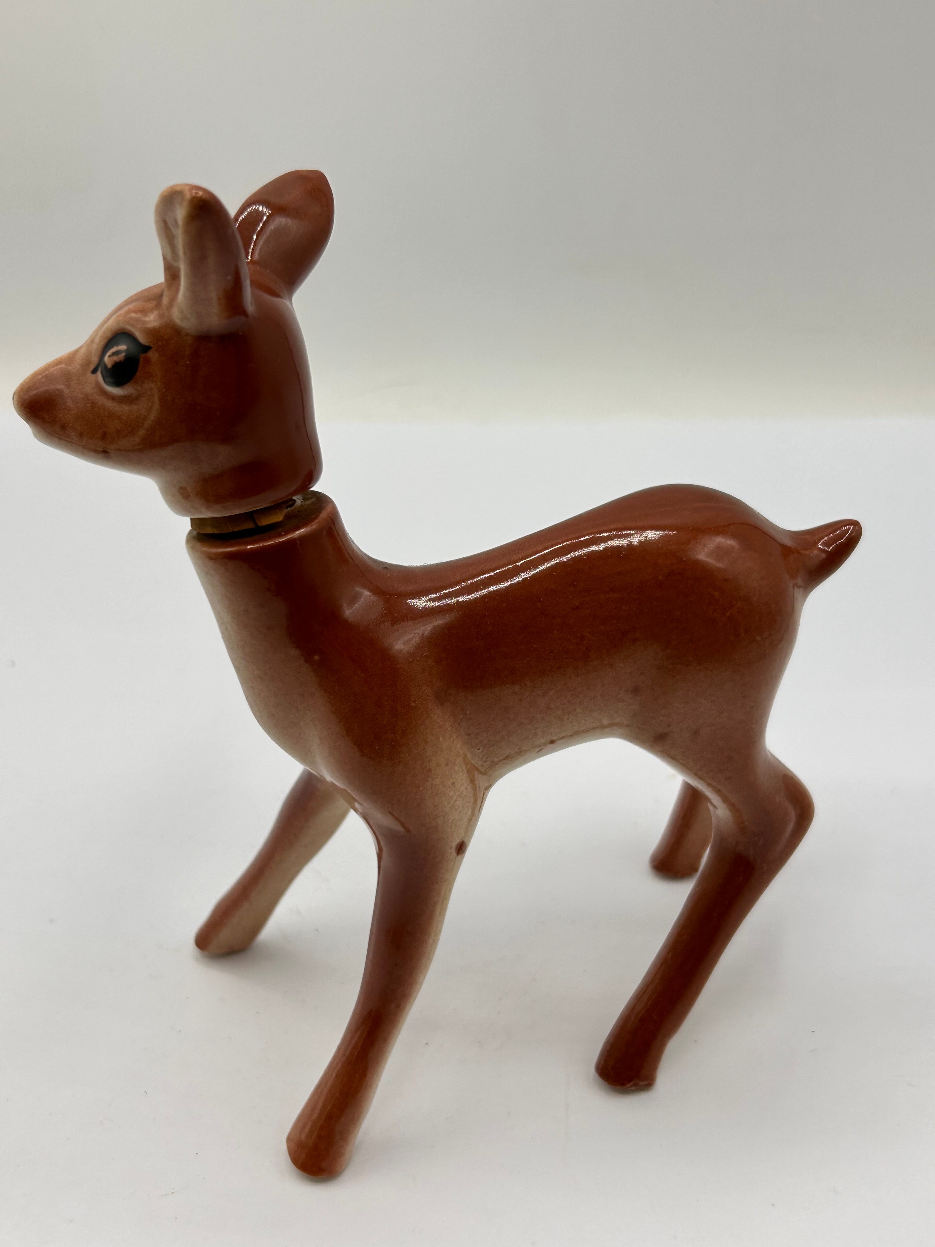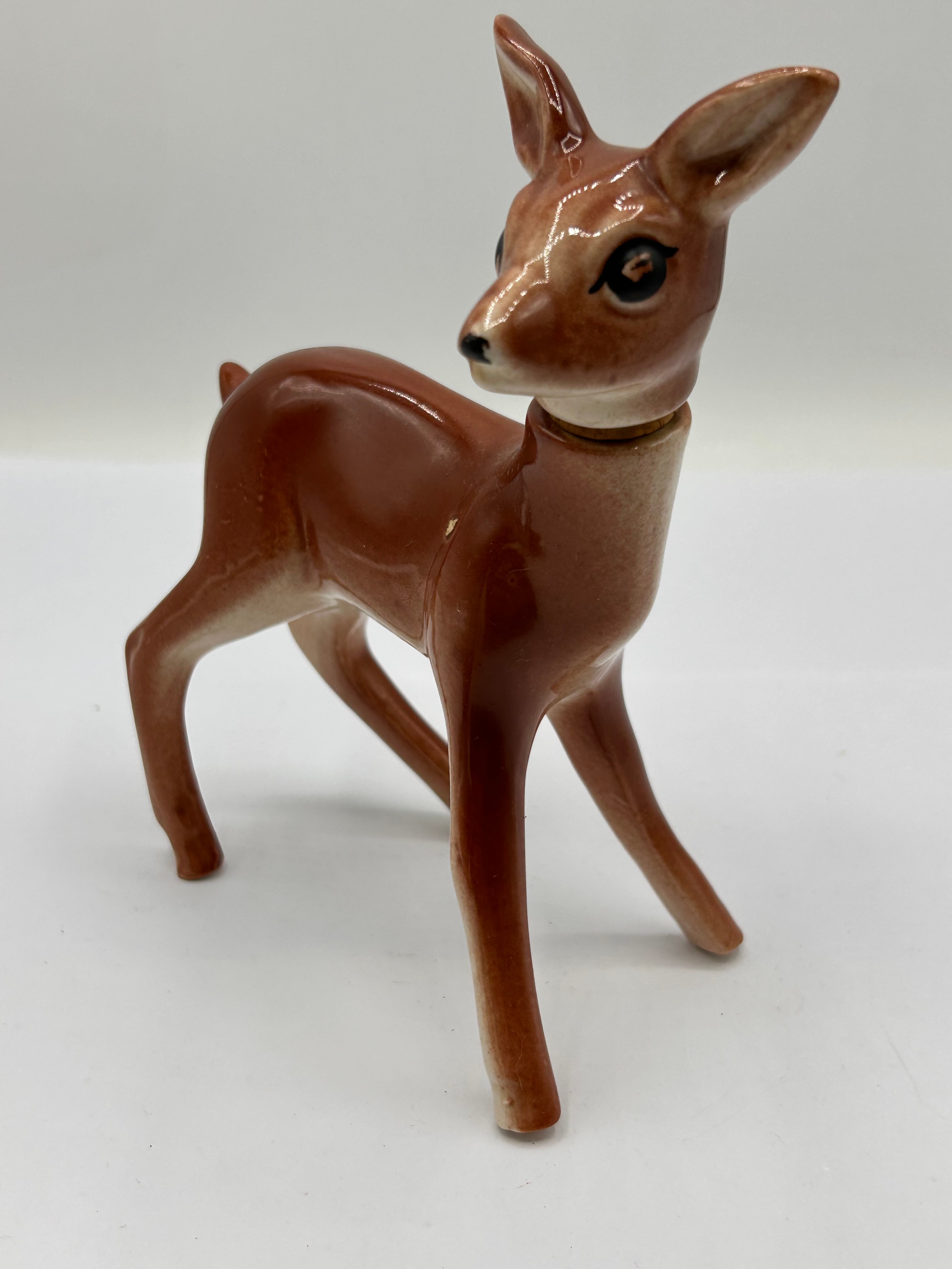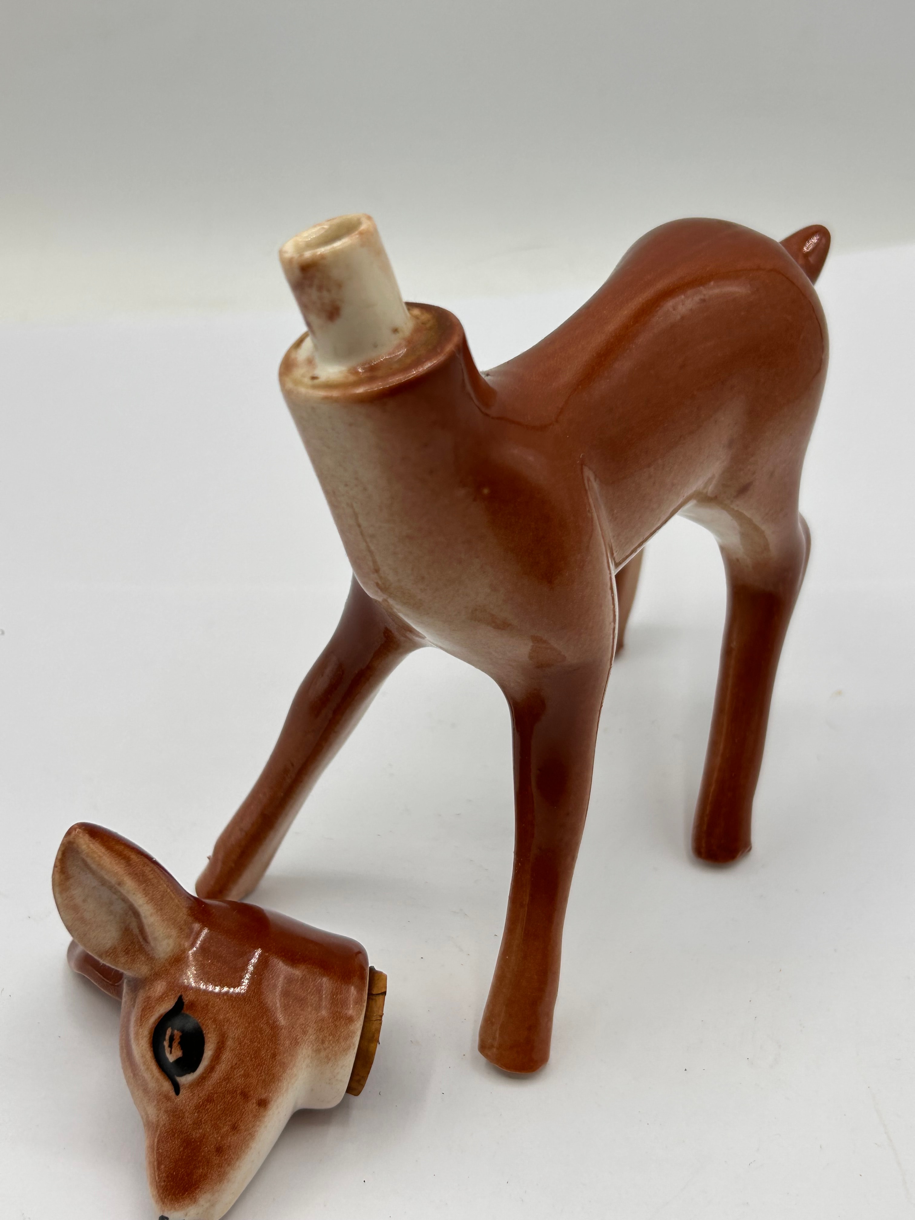 A Rynbende Cherry Brandy ceramic decanter, depicting a stylized fawn or deer. The piece is rendered in brown and cream tones with a glossy finish, characteristic of mid-20th century design. It features a two-piece construction, with the head designed to connect to the body via a peg-and-socket joint at the neck. No other visible text or identifying markings are present.