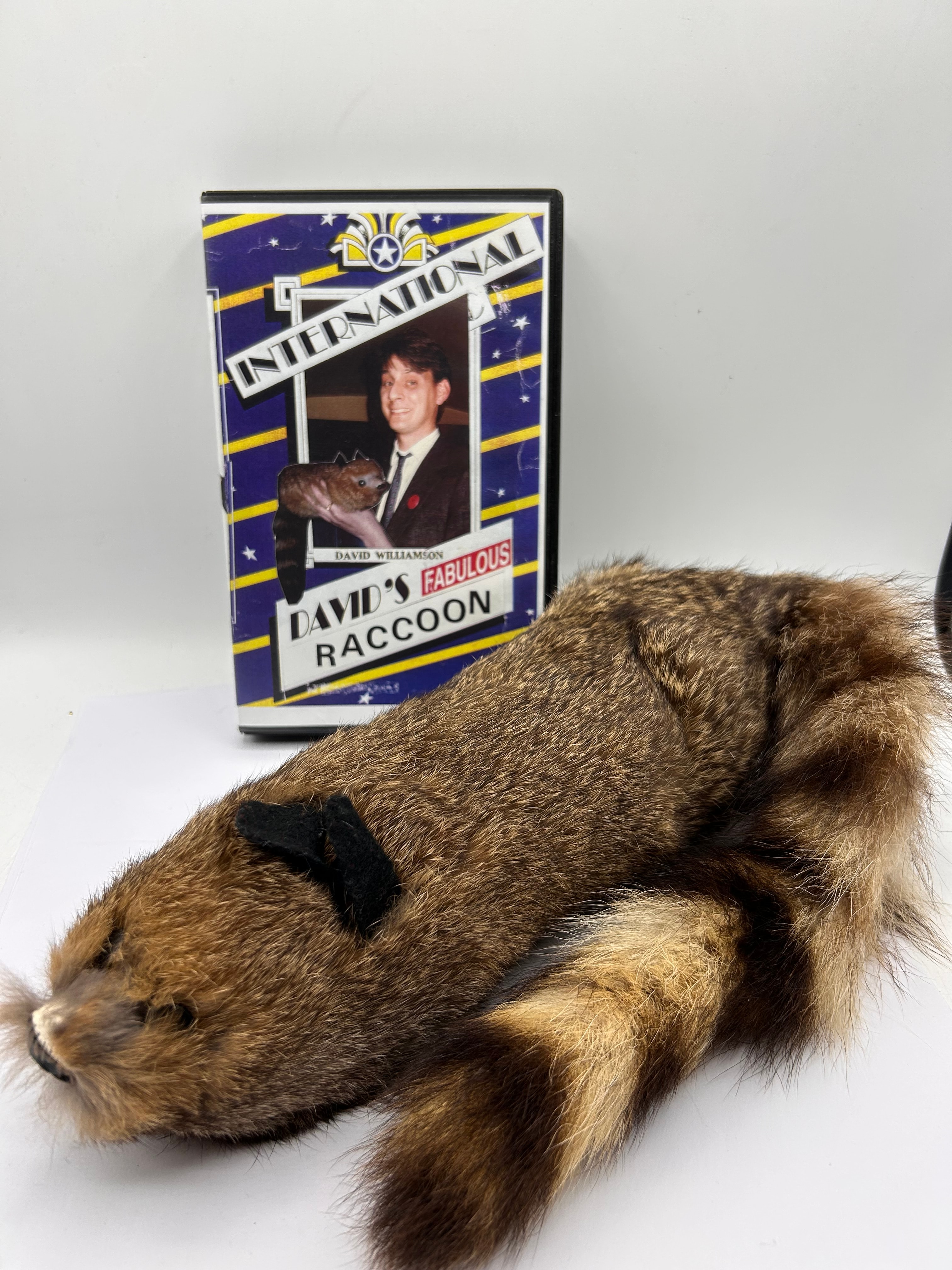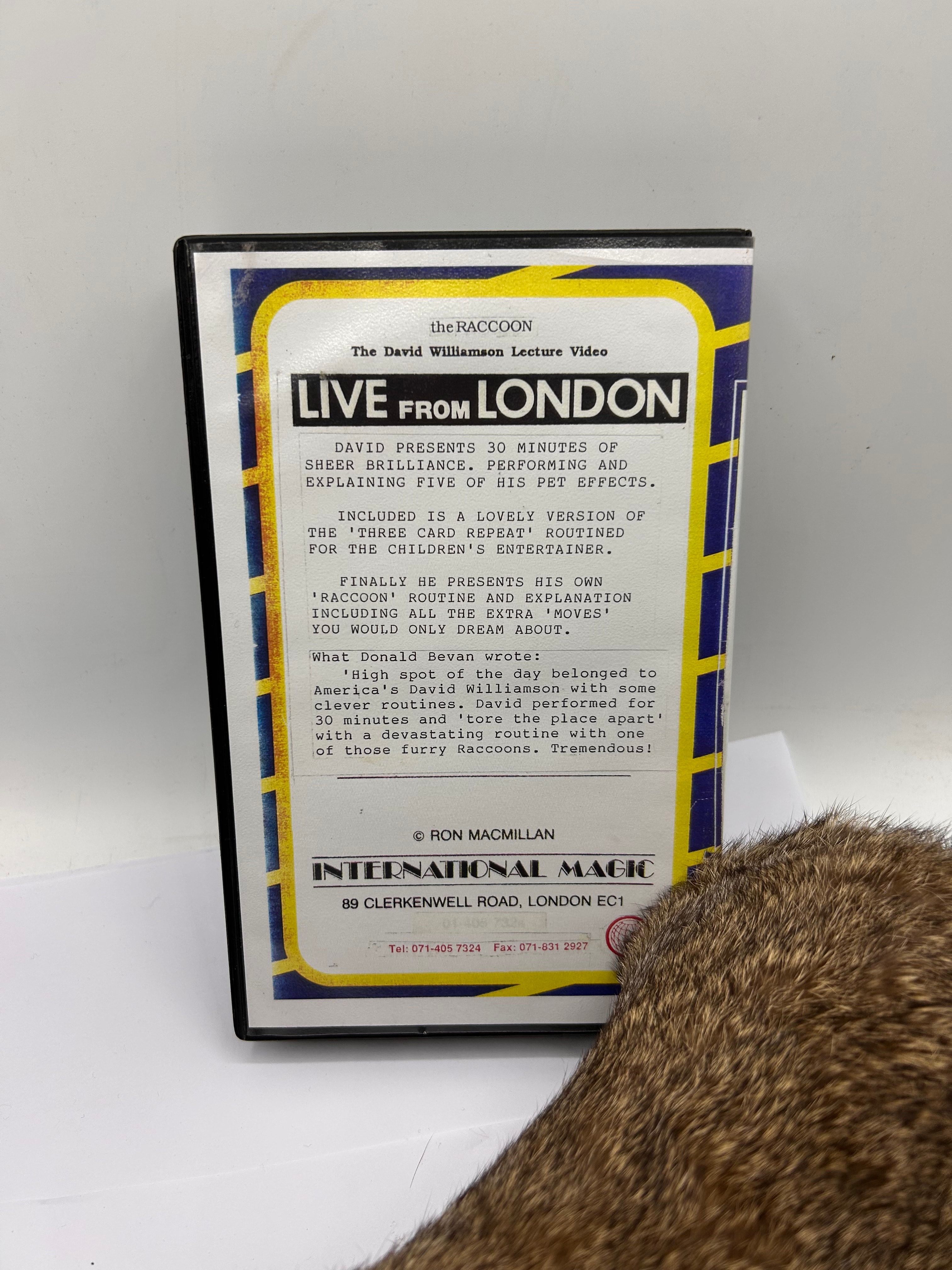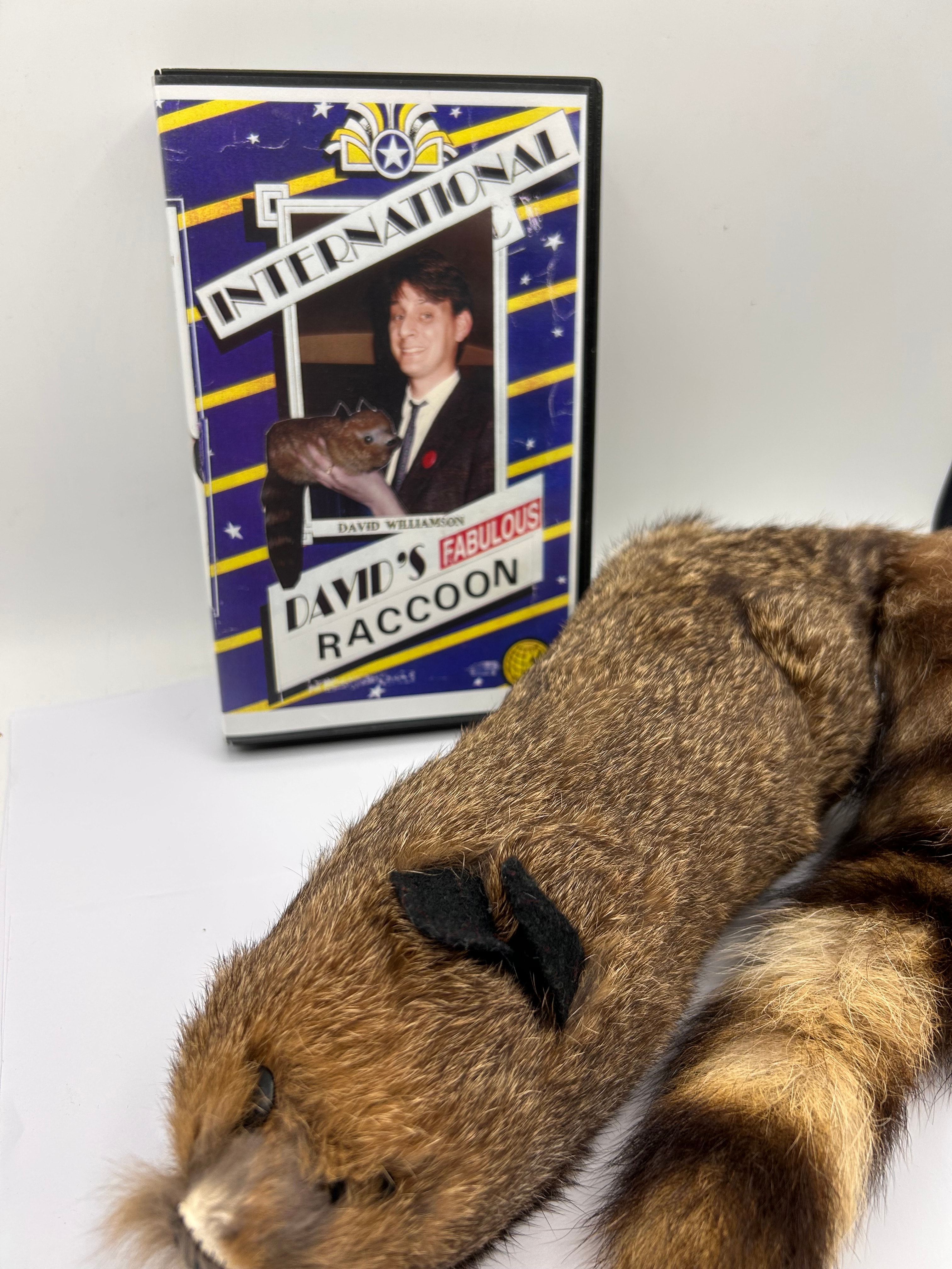 A David Williamson ‘Rocky Raccoon’ magic prop, accompanied by ‘The David Williamson Lecture Video Live from London’ VHS tape, titled ‘DAVID’S FABULOUS RACCOON’. The prop is an elongated item crafted from brown and black striped synthetic fur, designed to mimic a raccoon, complete with a distinct striped tail, consistent with ‘Rocky Raccoon’ type spring animal puppets. The VHS tape, presented by ‘INTERNATIONAL MAGIC’, features an image of David Williamson holding a similar furry prop on its cover. The reverse of the tape details content including a ‘raccoon routine’ and lists contact information for ’89 CLERKENWELL ROAD, LONDON EC1′ with a ‘071’ telephone prefix, indicating a late 20th-century production.