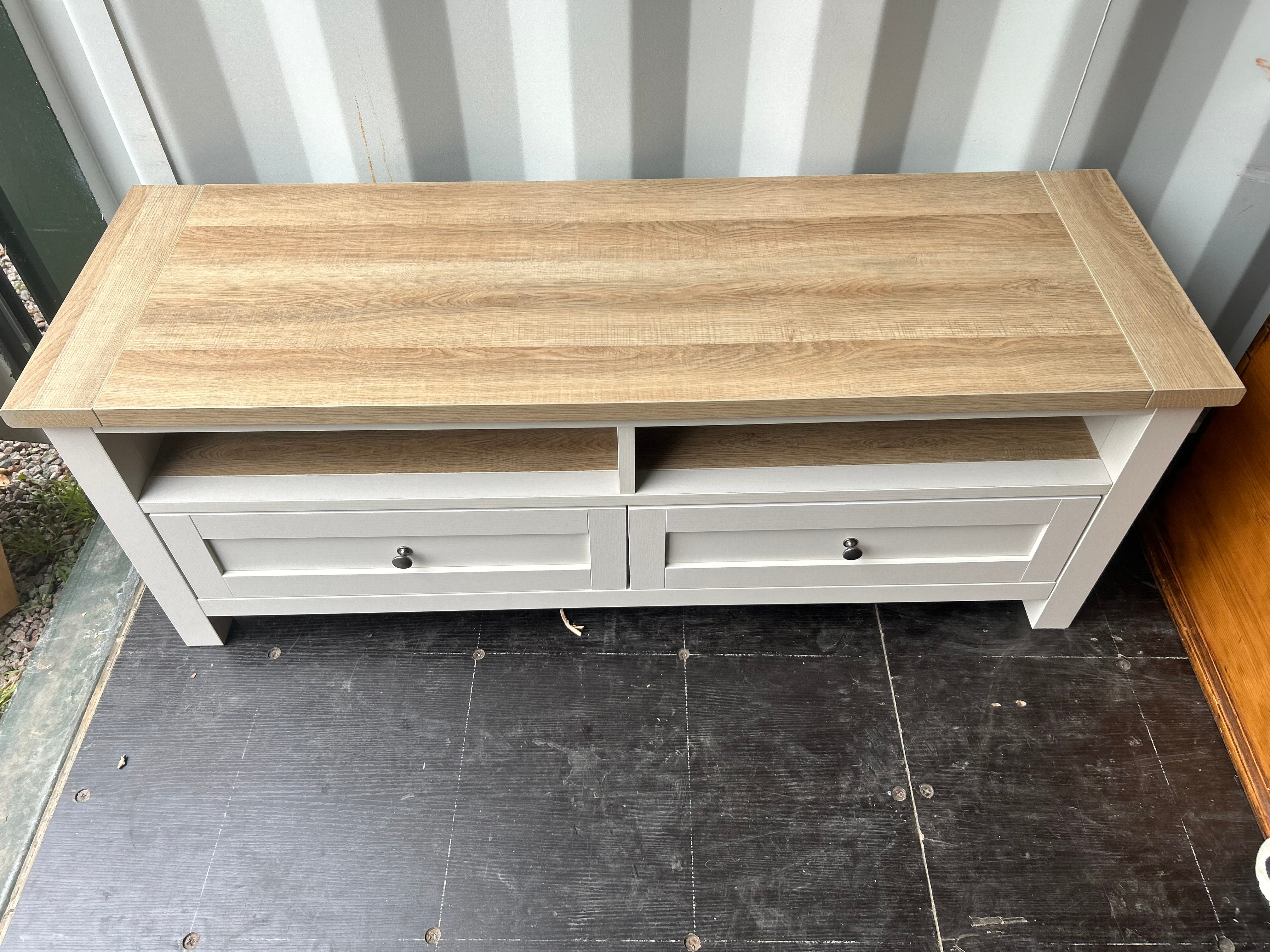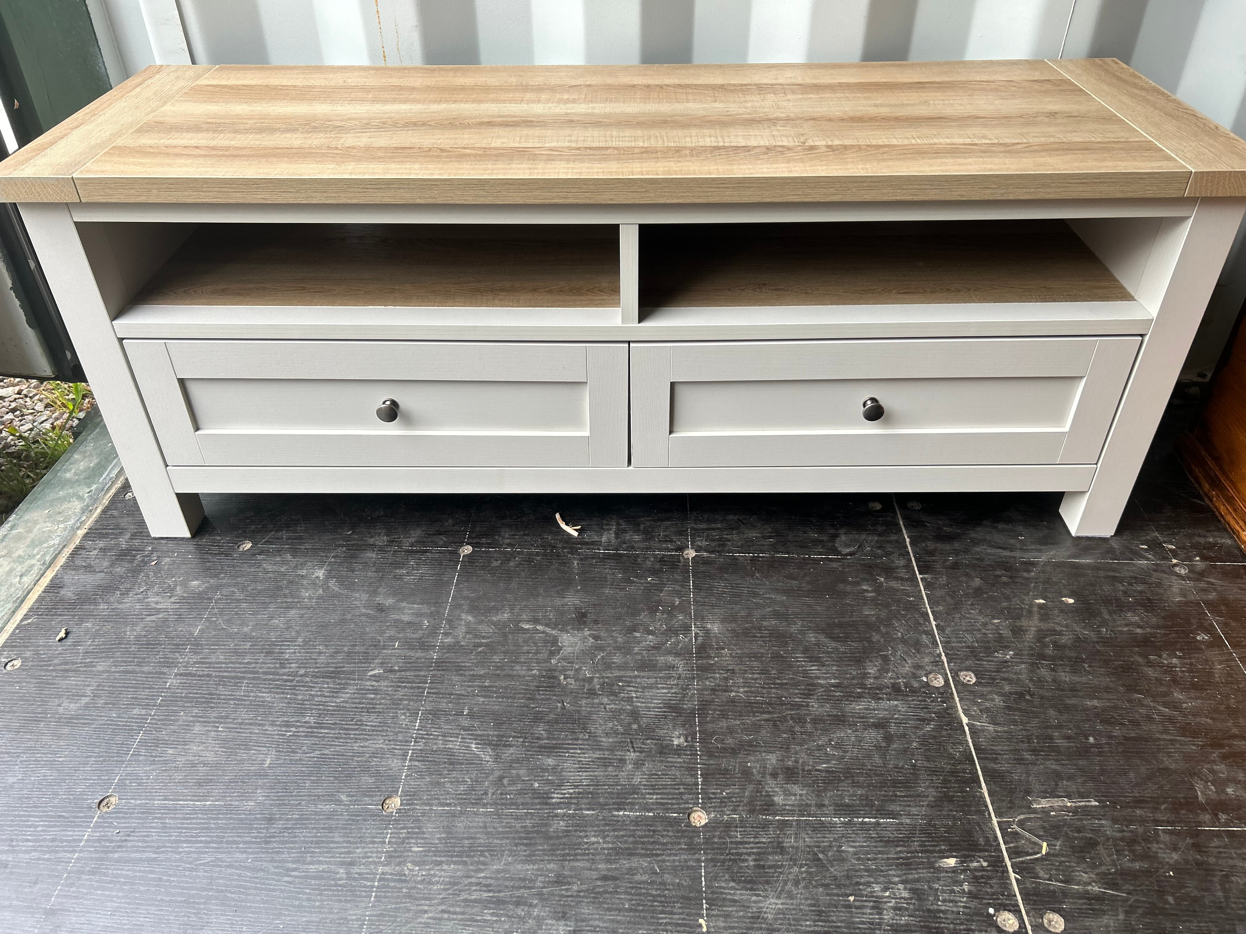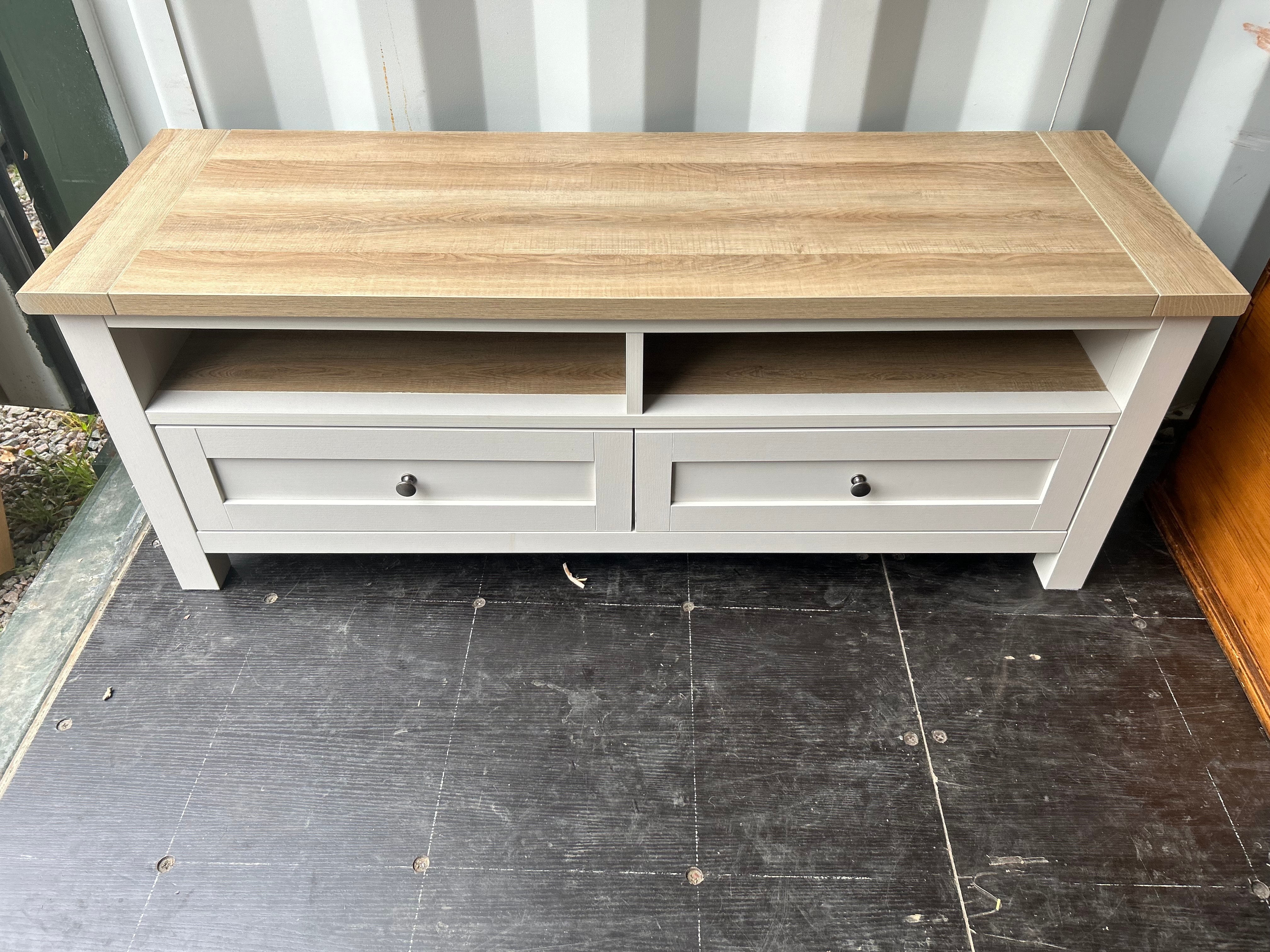 This contemporary media unit, likely of 21st-century manufacture, features a two-tone design. It presents a light oak-effect laminate top with a slightly distressed or rustic finish. The base is painted in a light grey or off-white hue. The unit is designed with two open-front shelves positioned above two functional drawers, each fitted with a dark, possibly metallic, round pull. Construction appears to be of mixed materials, likely engineered wood or MDF with a laminate top. This unit is similar in style and design to items listed online as “Olney TV Unit.”