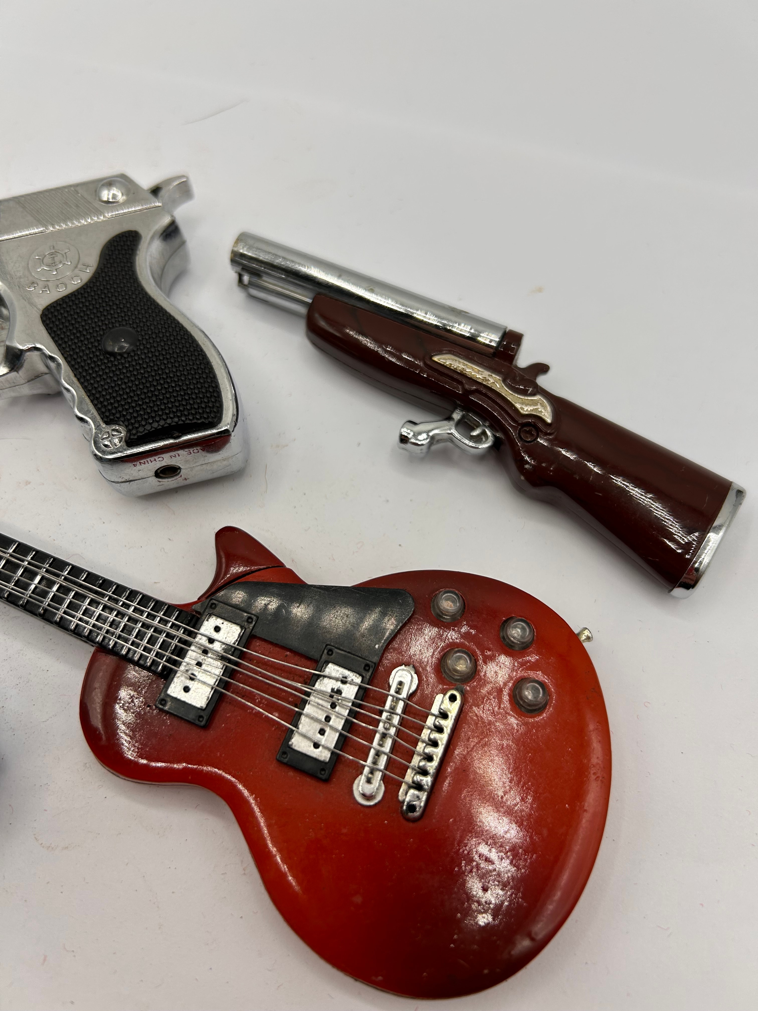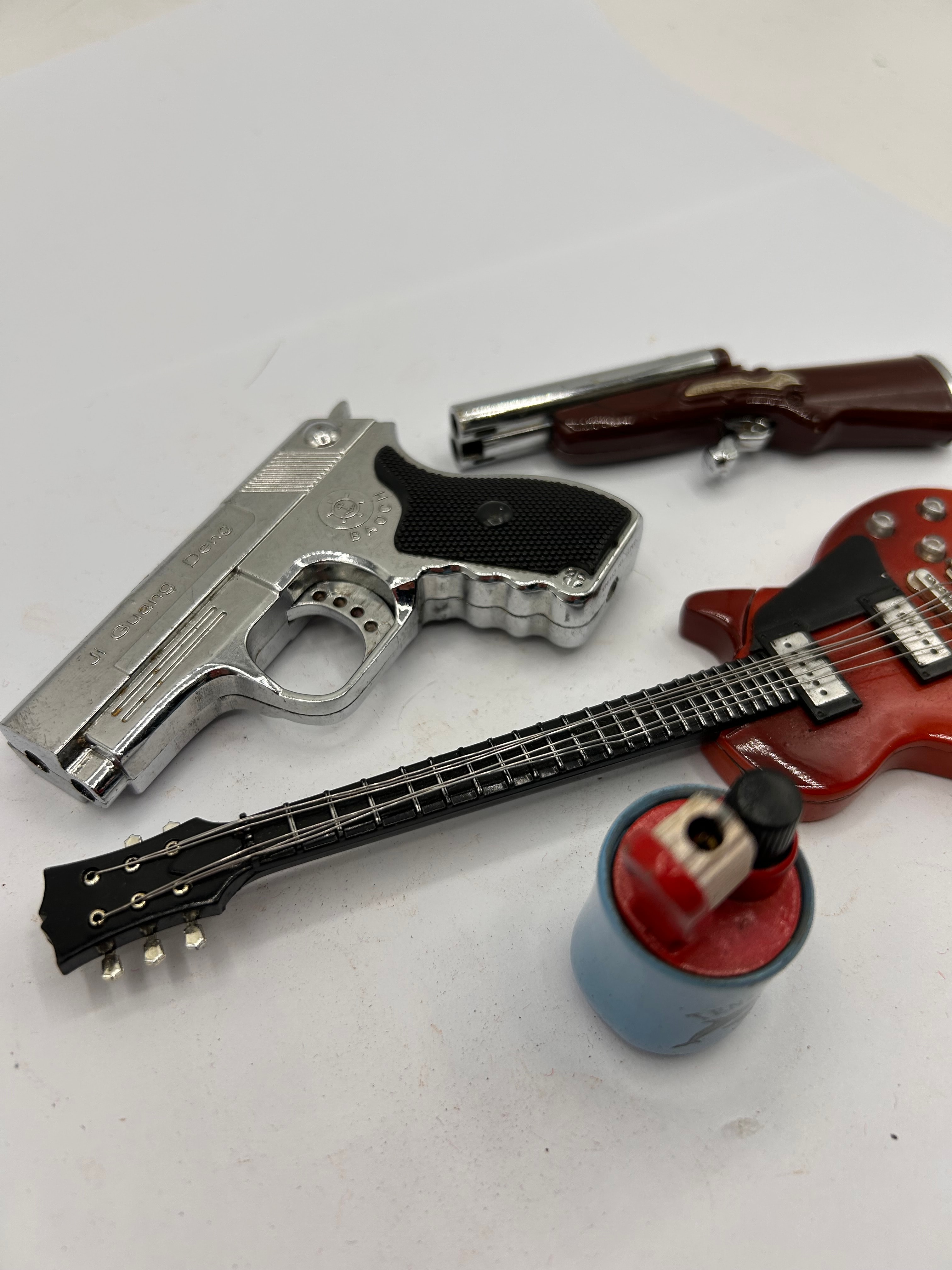 A group of four novelty butane lighters, likely dating from the late 20th century, crafted from a combination of chrome-plated base metal and molded plastic, with some painted details. The collection includes a silver-toned semi-automatic pistol replica lighter, bearing the visible markings “M.G. JAPAN” and “9 mm” on its left side, and “MADE IN CHINA” on the grip base; a brown and silver break-action rifle or shotgun replica lighter; a red electric guitar replica lighter, styled like a Les Paul; and a small, blue and red figural lighter.